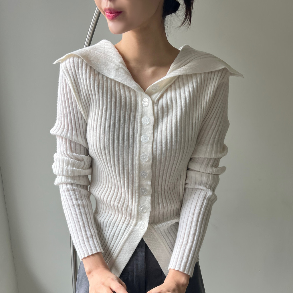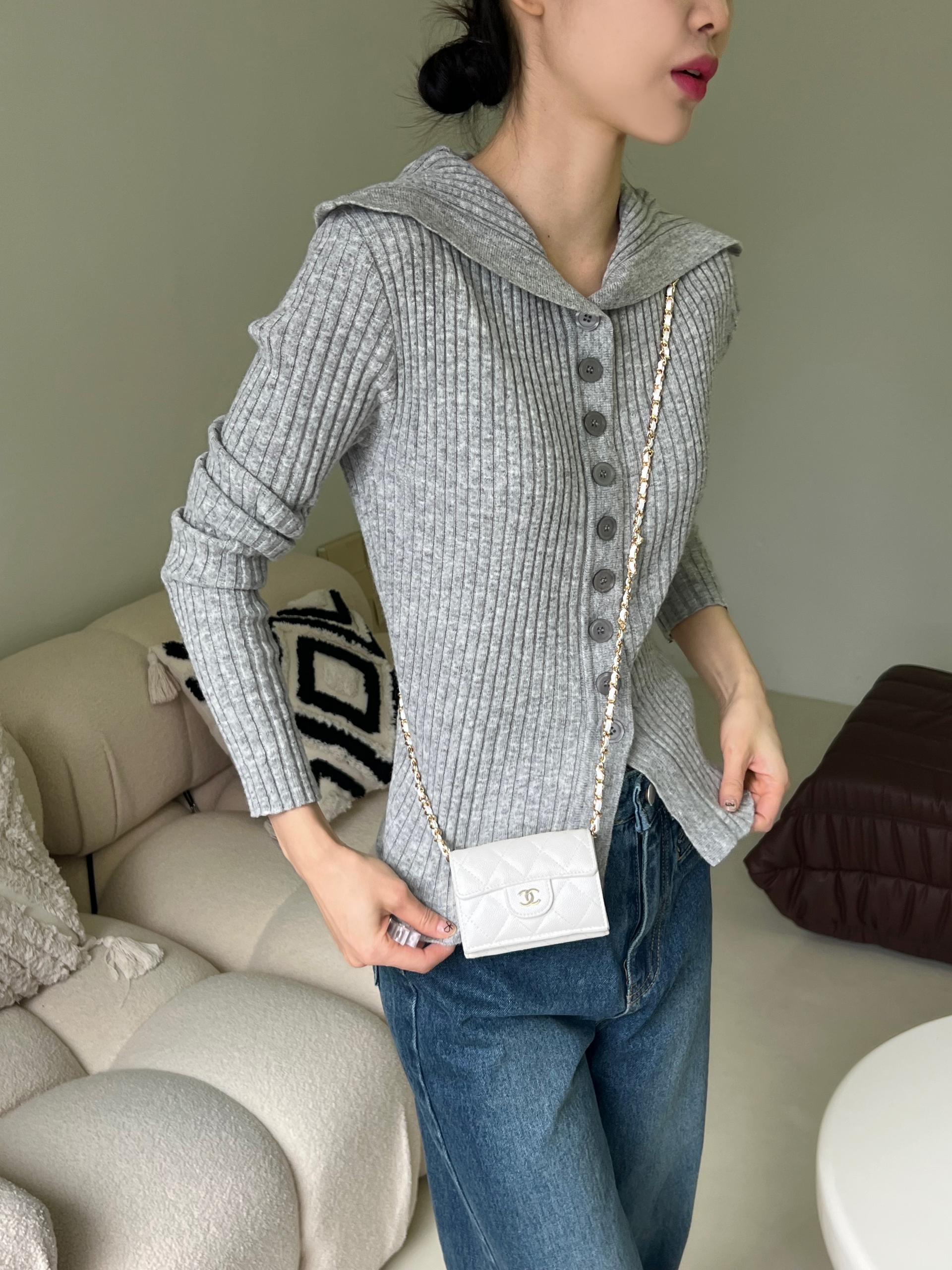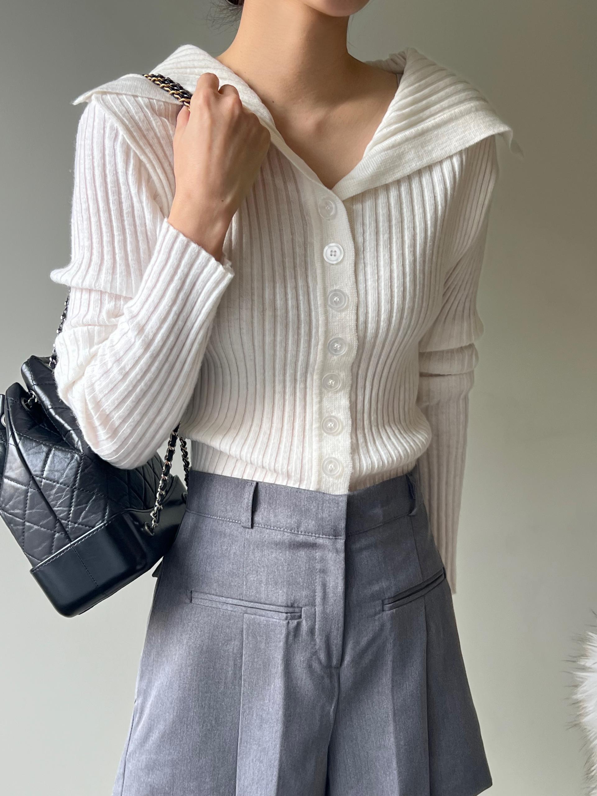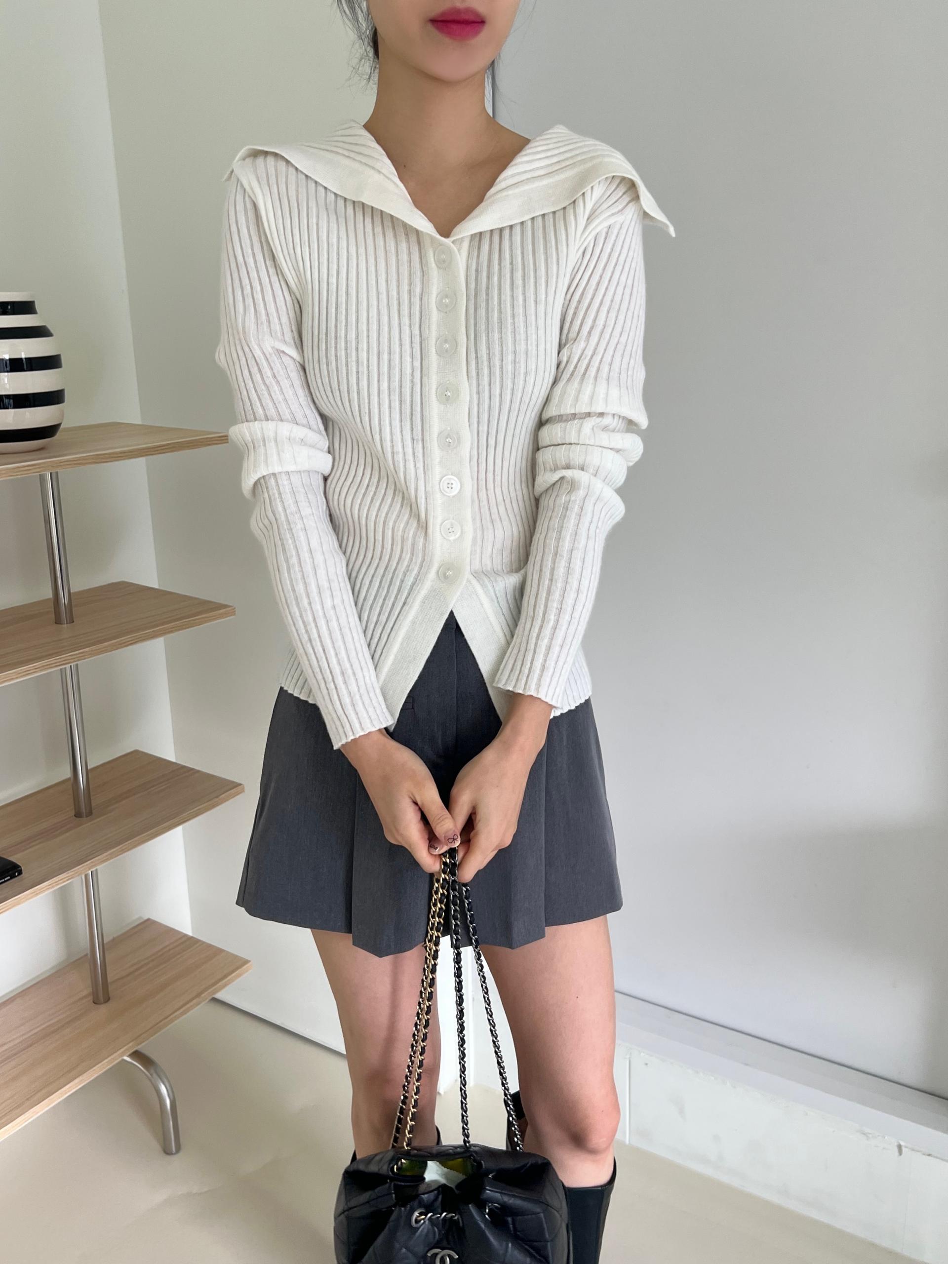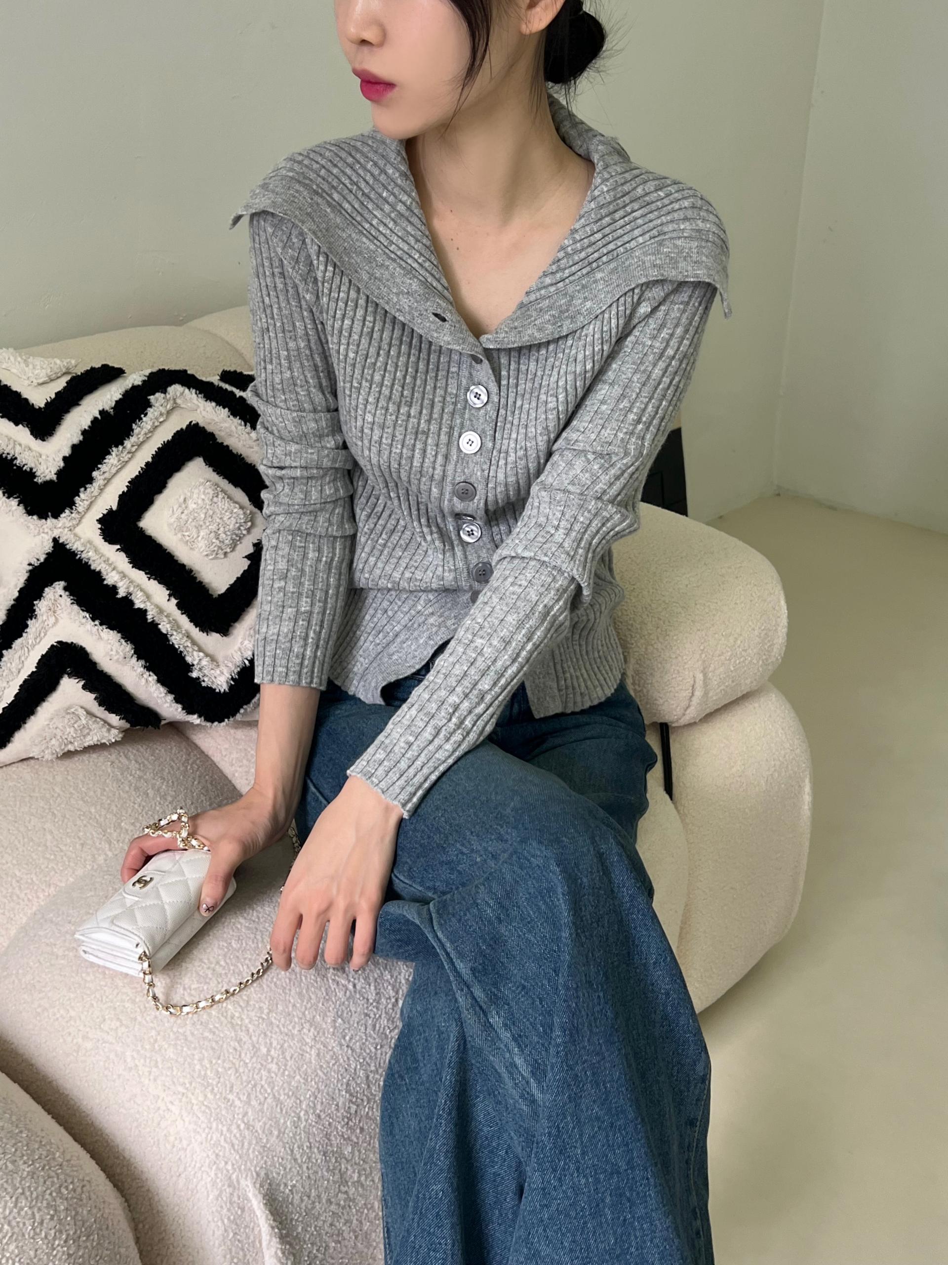 세로 골지 가공으로 슬림해 보이면서 지나치게 붙는 핏이 아니라 체형 커버에도 좋으며 데일리하게 착용하기 좋습니다. 적당한 깊이감의 브이넥 라인으로 여리한 느낌이 더 강조되며, 단추를 한두 개 정도 풀어 어깨선이 보이도록 착용하시는 것도 좋아요.