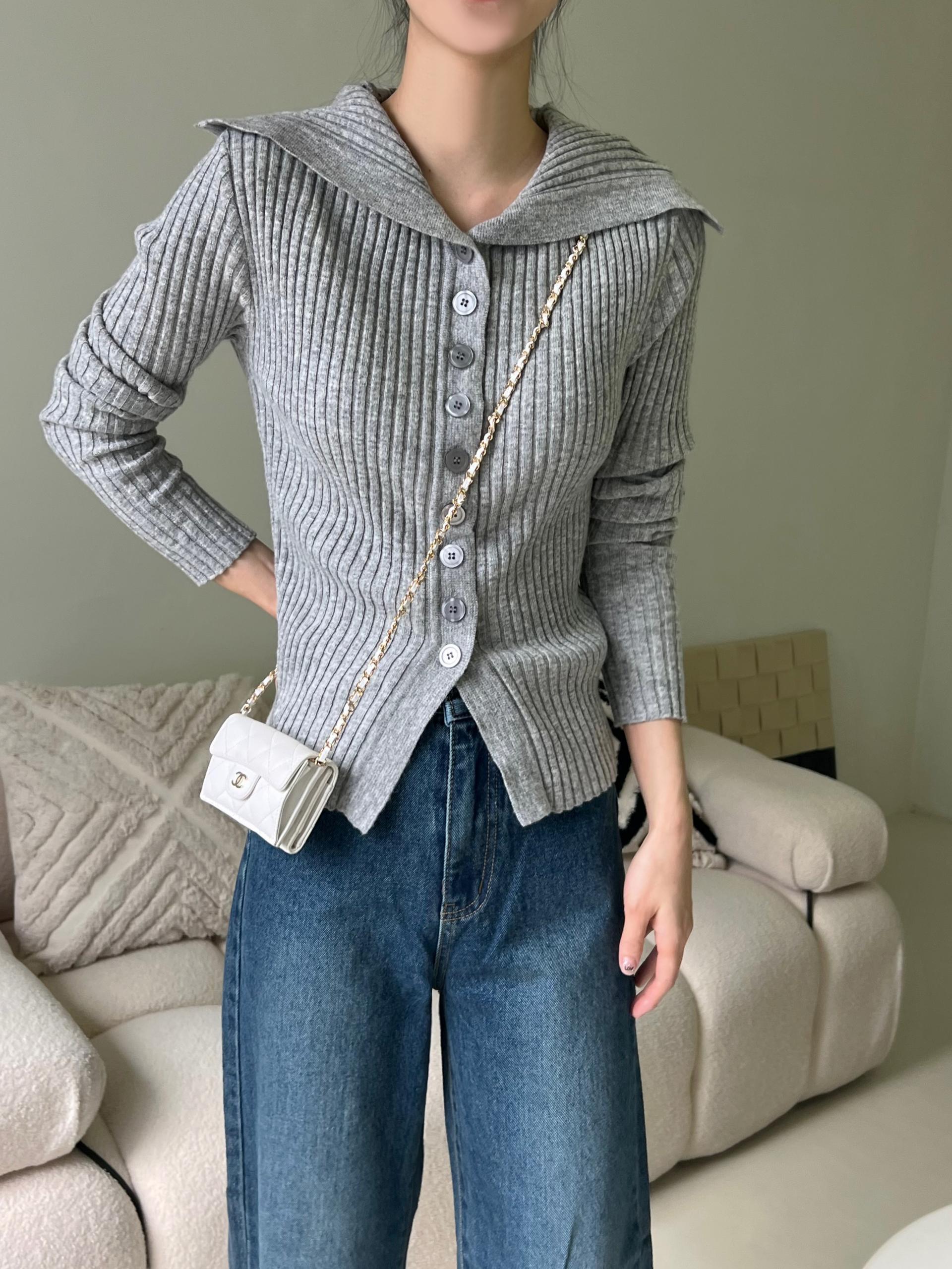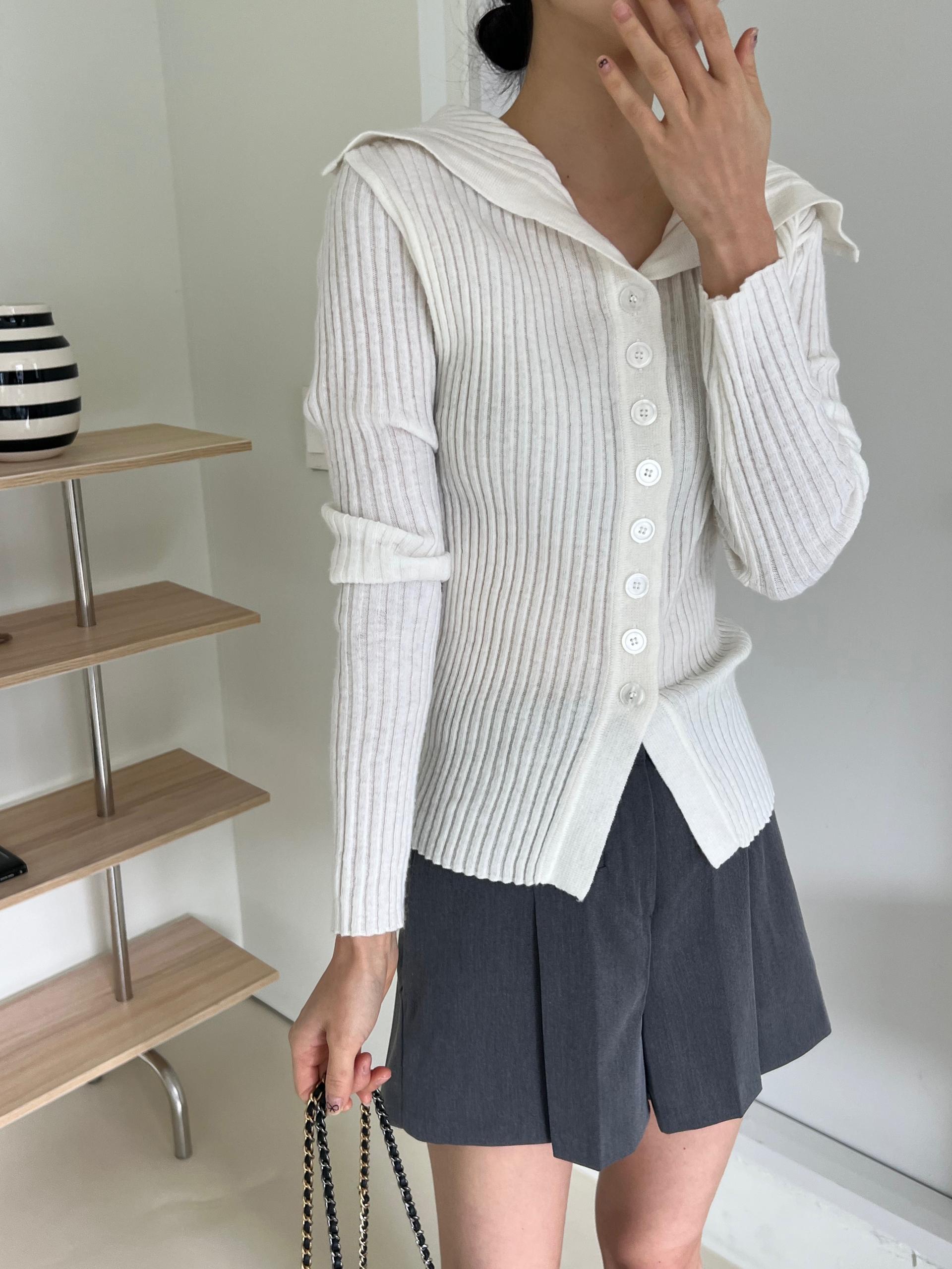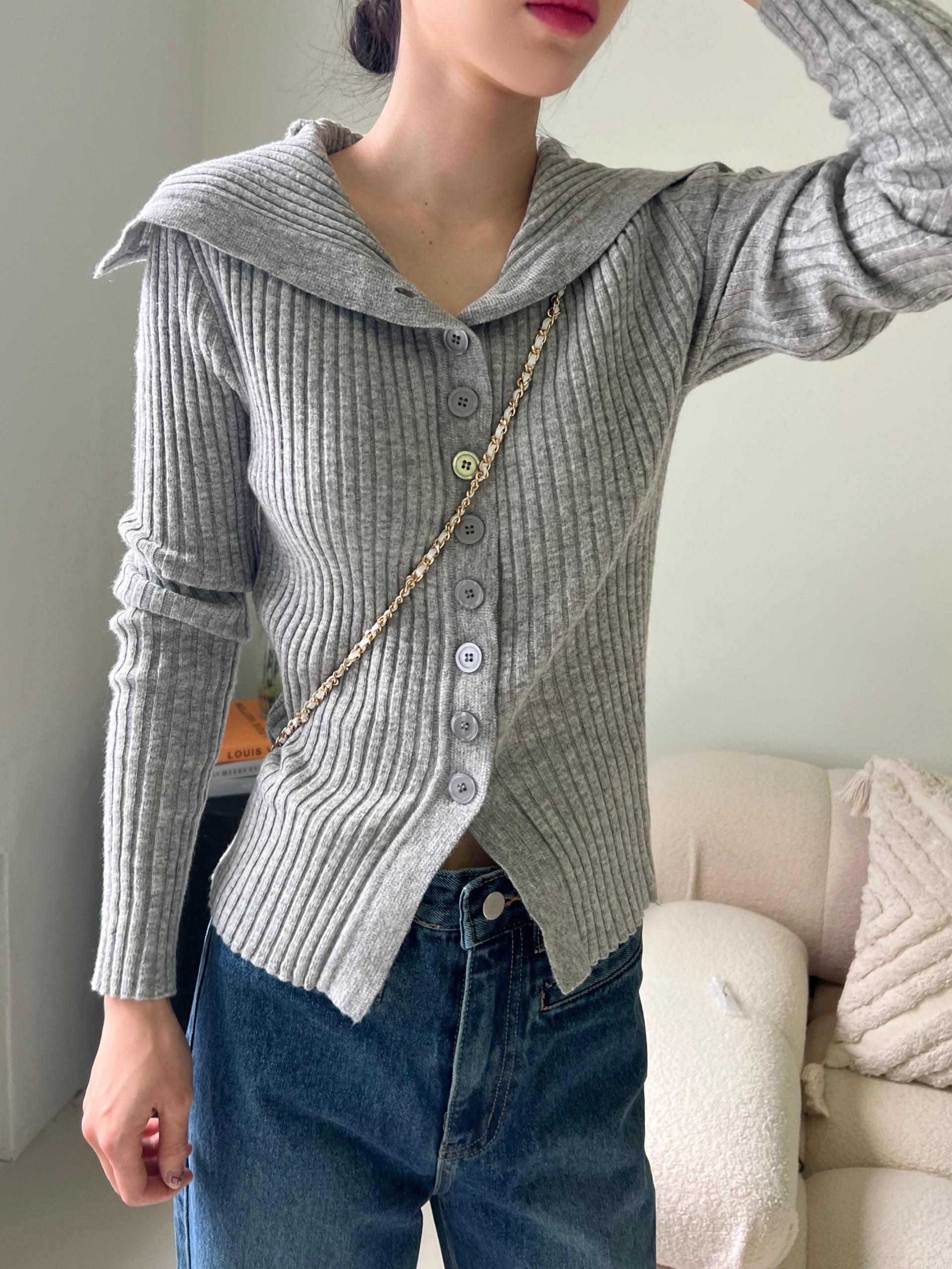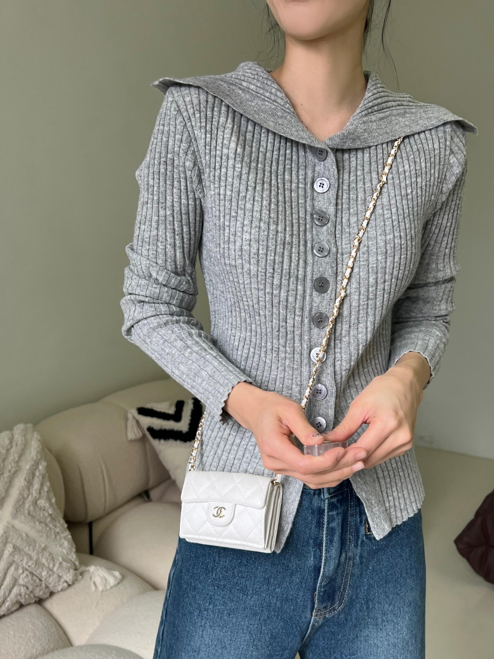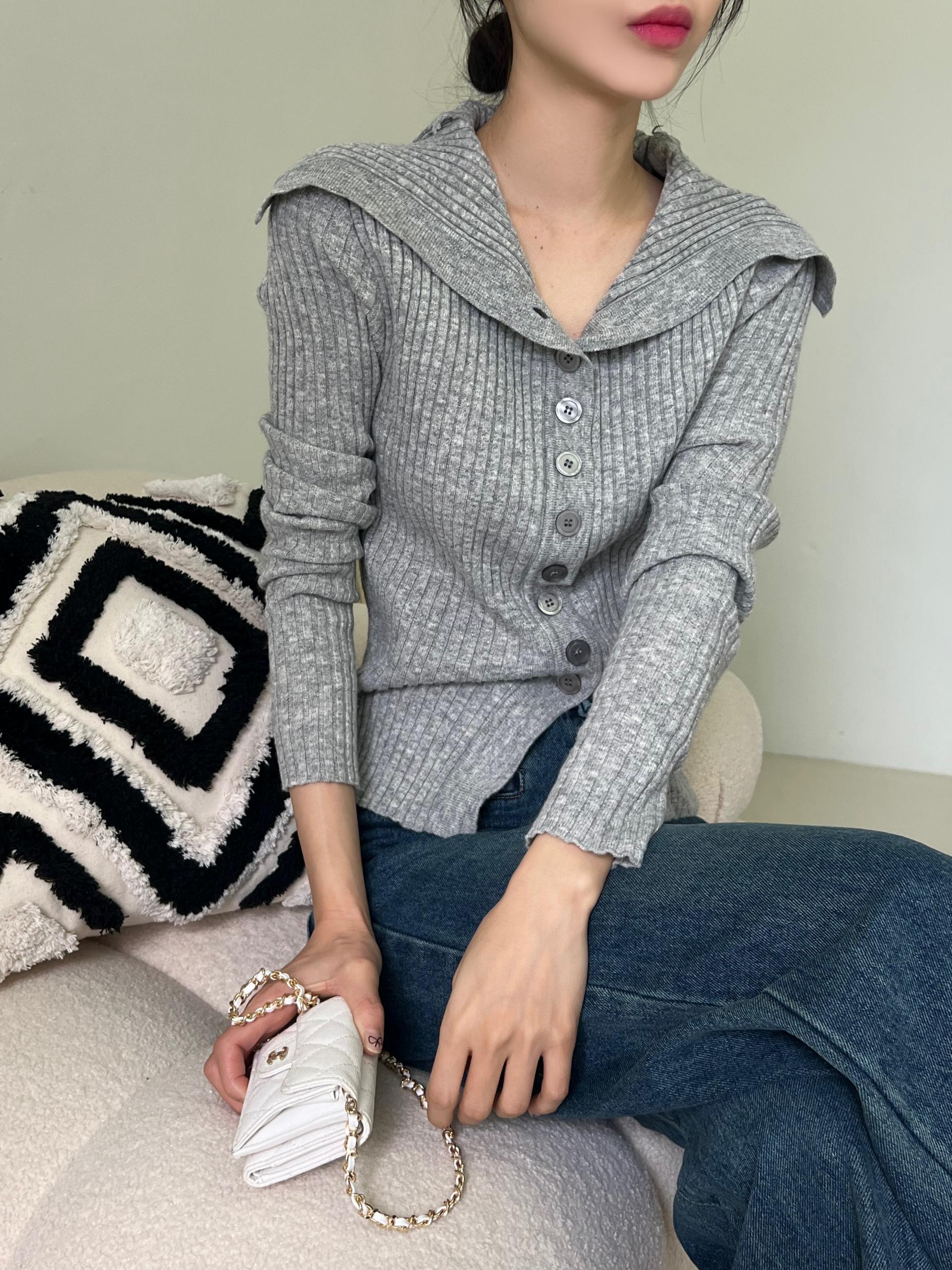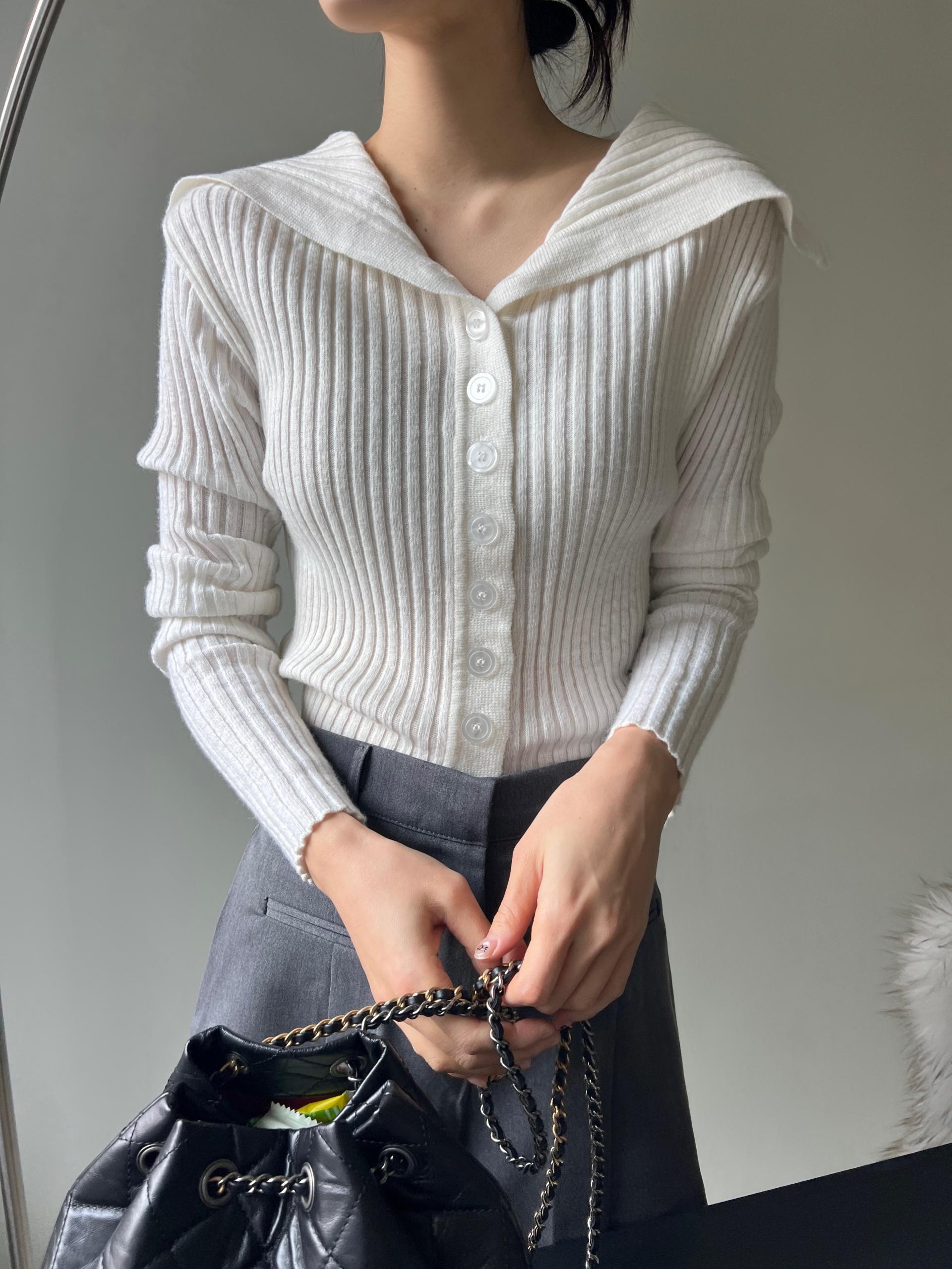 세로 골지 가공으로 슬림해 보이면서 지나치게 붙는 핏이 아니라 체형 커버에도 좋으며 데일리하게 착용하기 좋습니다. 적당한 깊이감의 브이넥 라인으로 여리한 느낌이 더 강조되며, 단추를 한두 개 정도 풀어 어깨선이 보이도록 착용하시는 것도 좋아요.