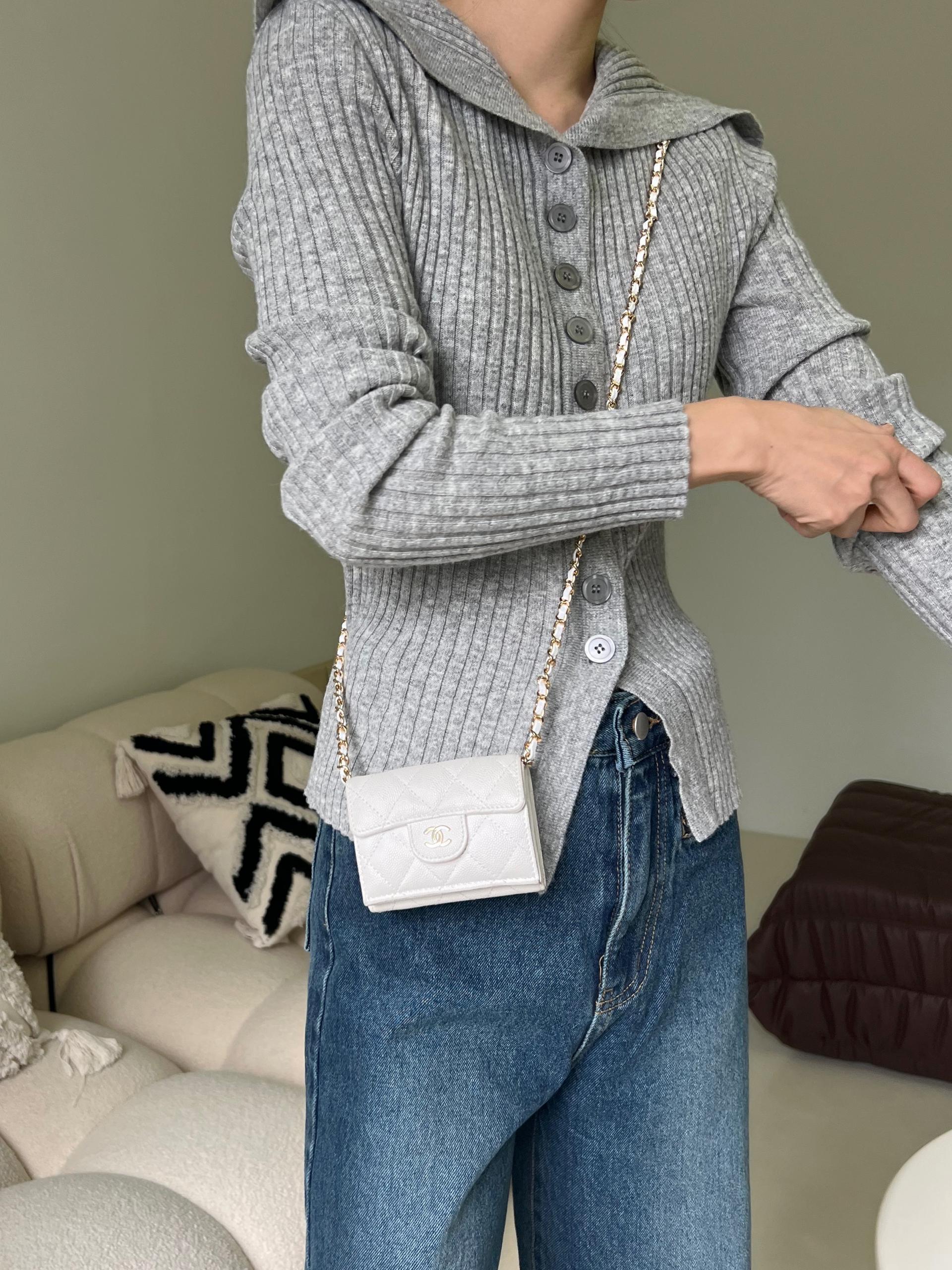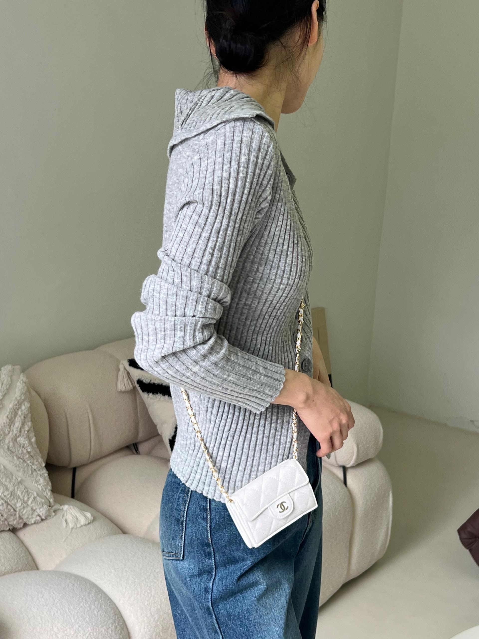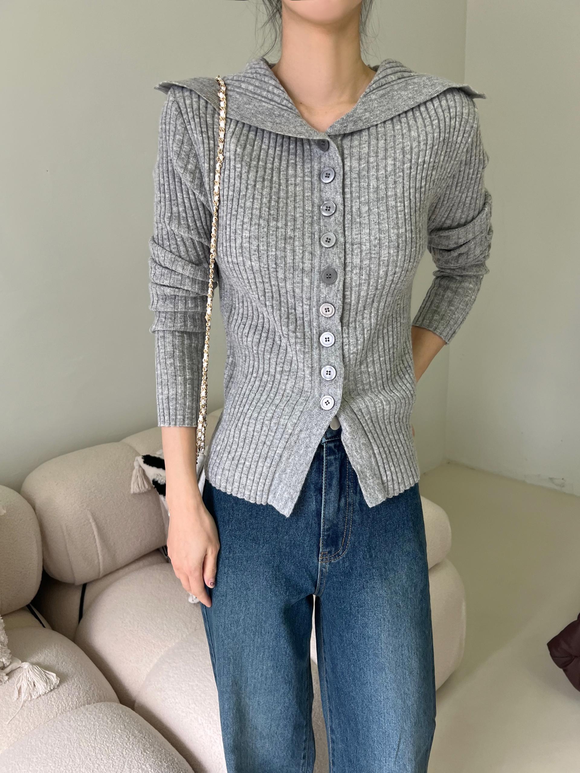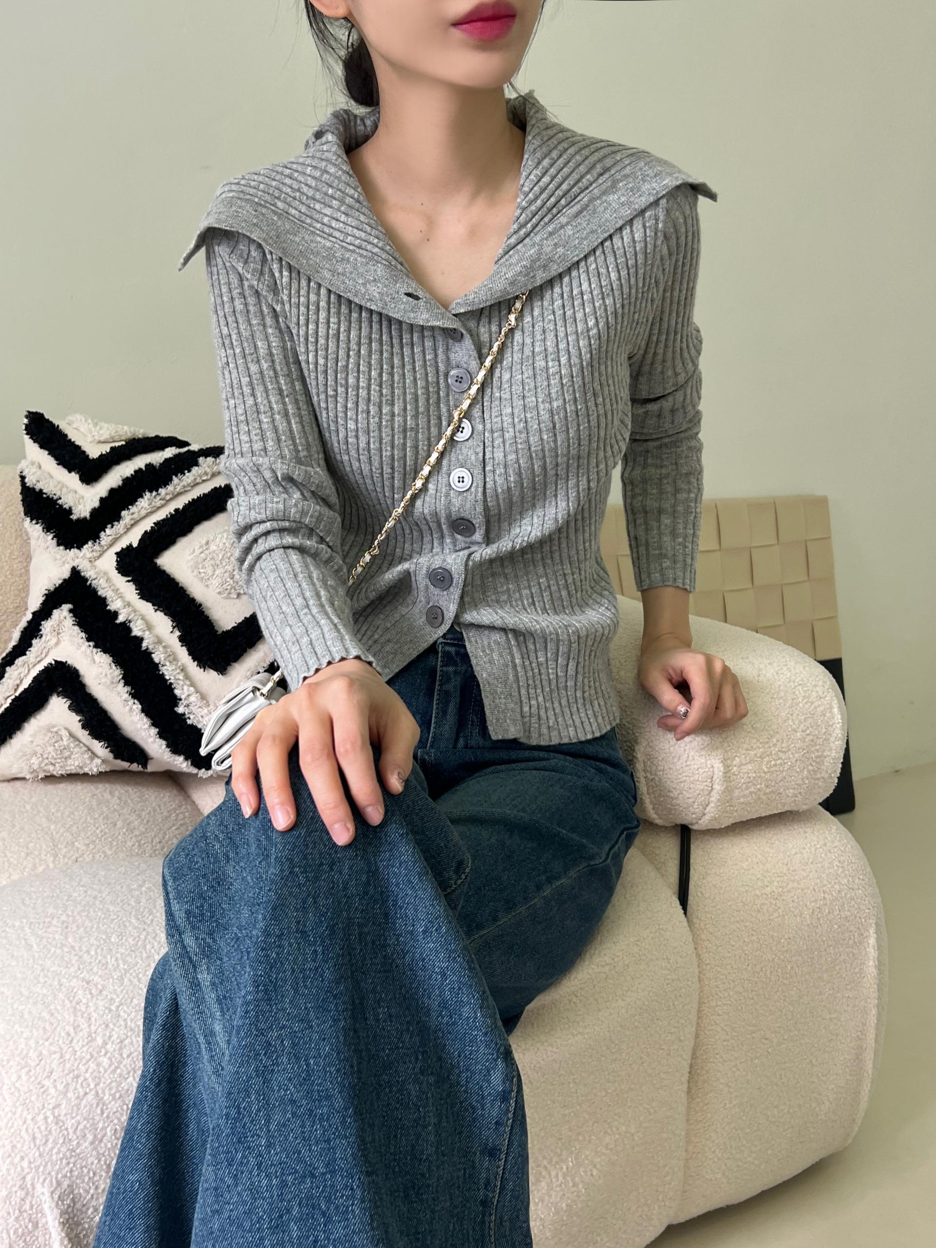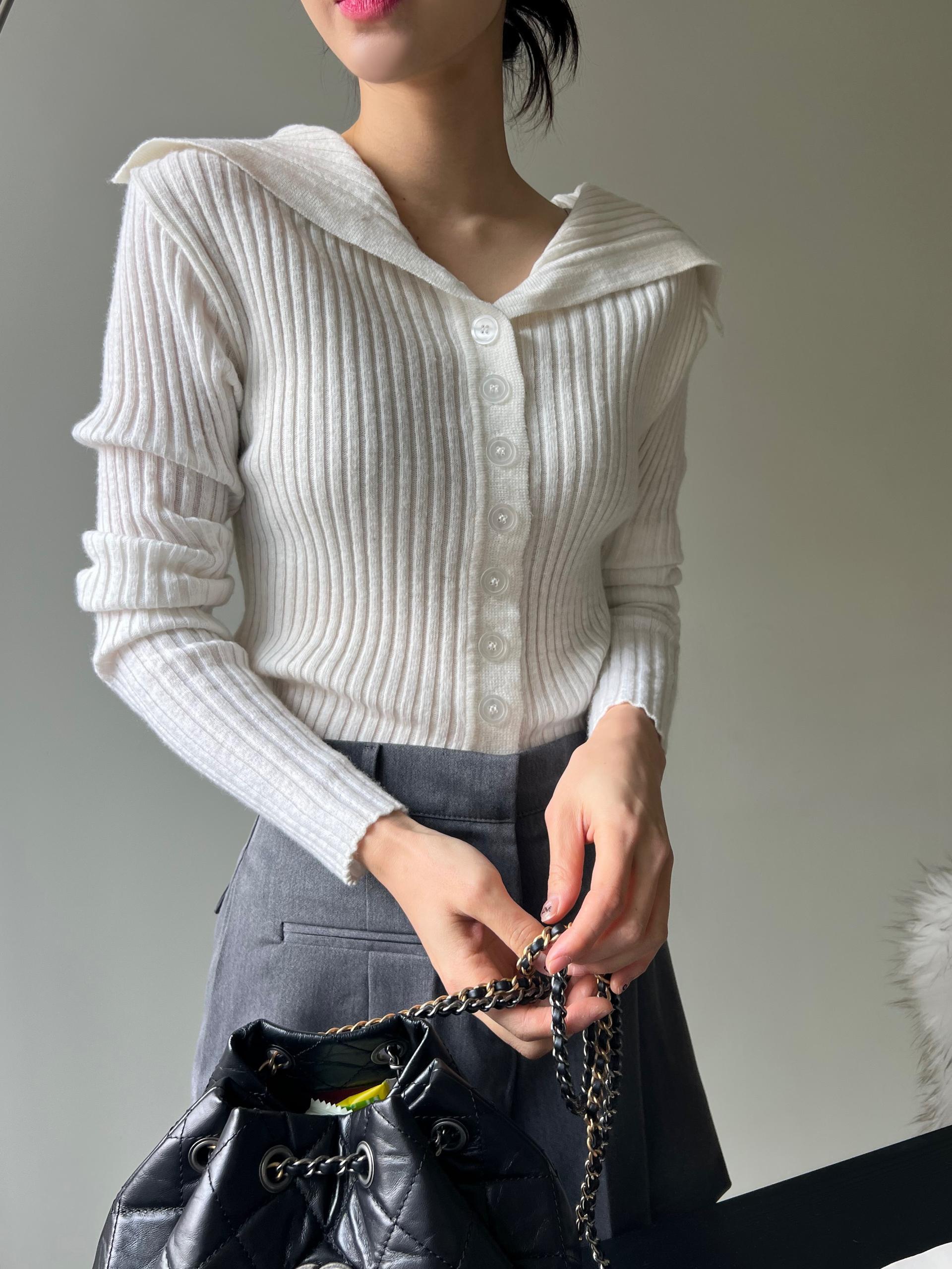 세로 골지 가공으로 슬림해 보이면서 지나치게 붙는 핏이 아니라 체형 커버에도 좋으며 데일리하게 착용하기 좋습니다. 적당한 깊이감의 브이넥 라인으로 여리한 느낌이 더 강조되며, 단추를 한두 개 정도 풀어 어깨선이 보이도록 착용하시는 것도 좋아요.