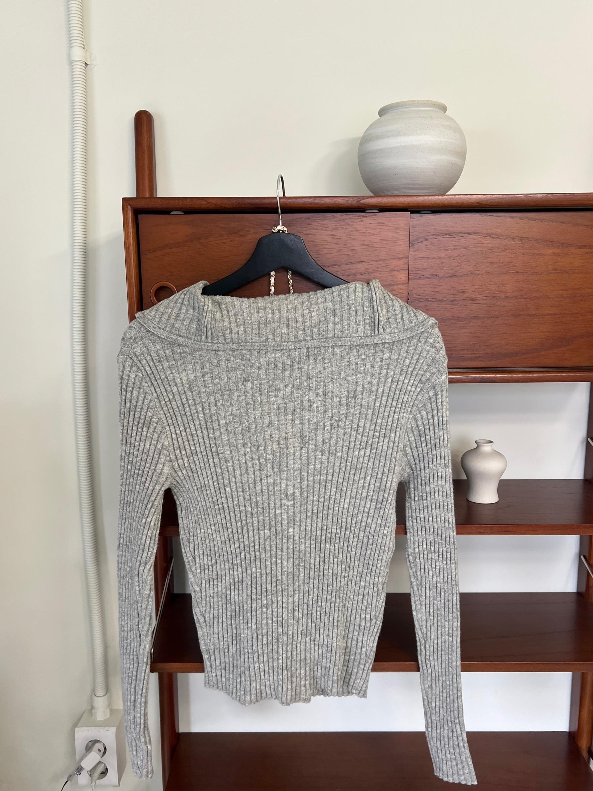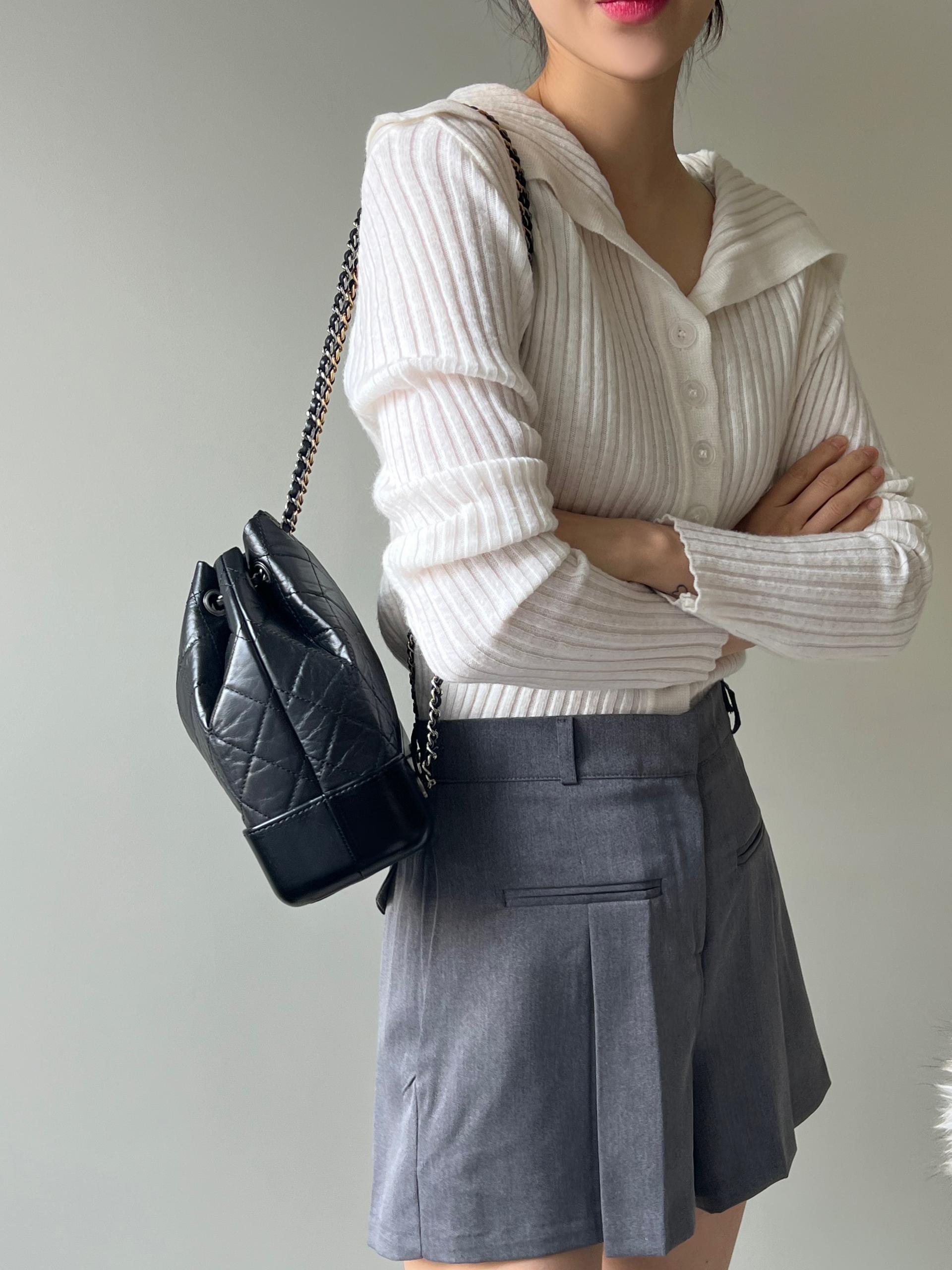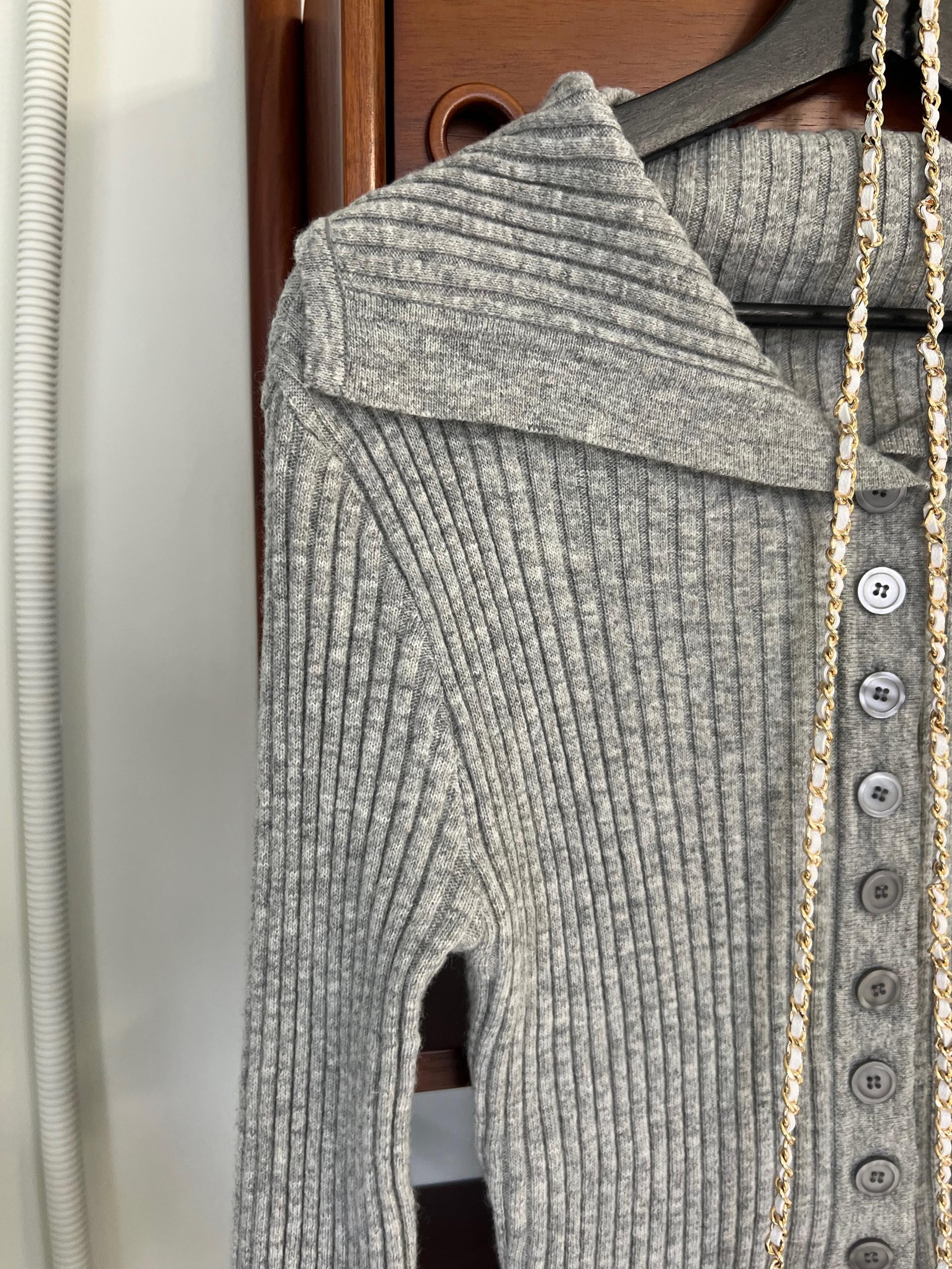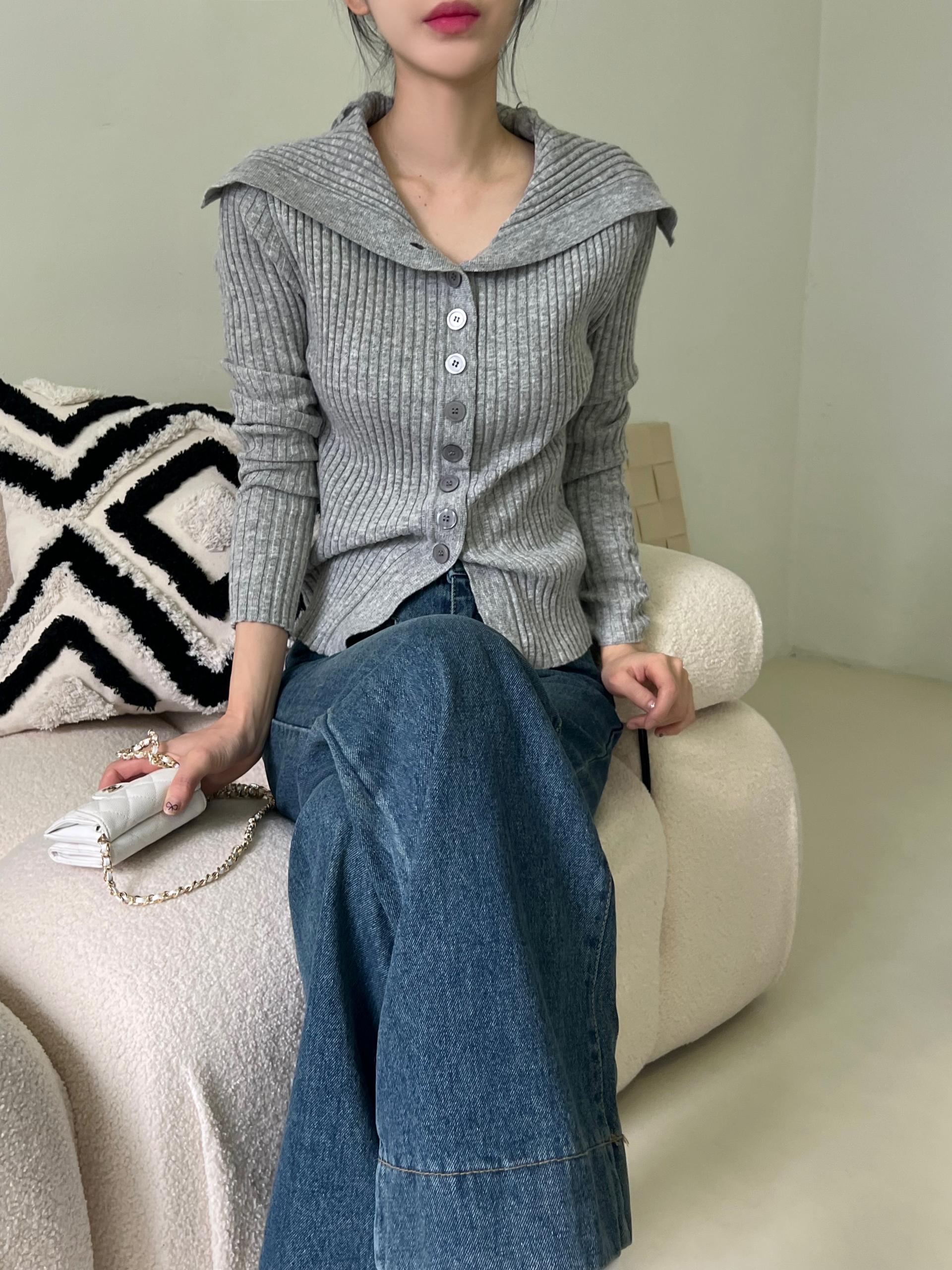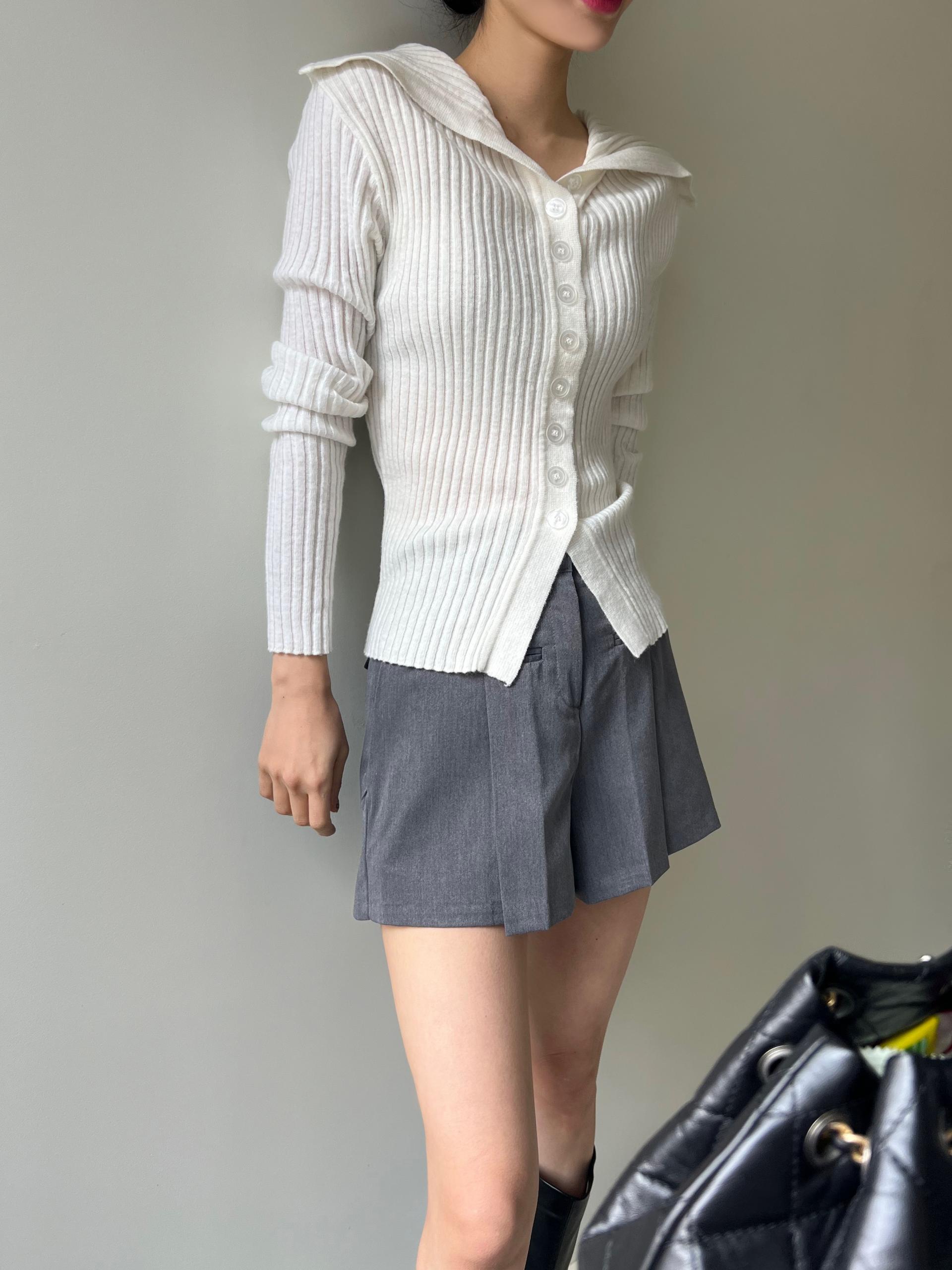 세로 골지 가공으로 슬림해 보이면서 지나치게 붙는 핏이 아니라 체형 커버에도 좋으며 데일리하게 착용하기 좋습니다. 적당한 깊이감의 브이넥 라인으로 여리한 느낌이 더 강조되며, 단추를 한두 개 정도 풀어 어깨선이 보이도록 착용하시는 것도 좋아요.