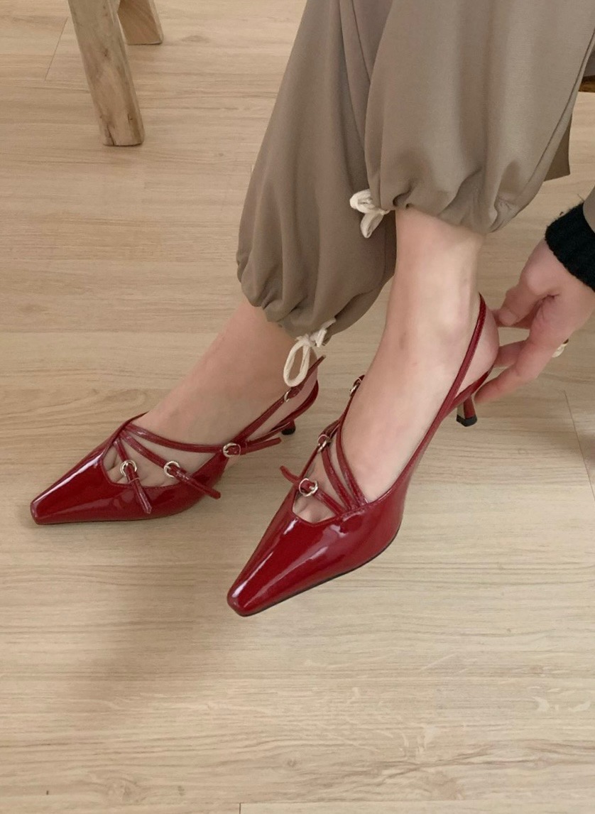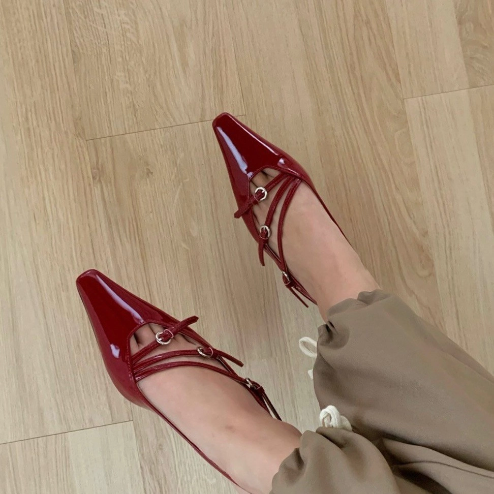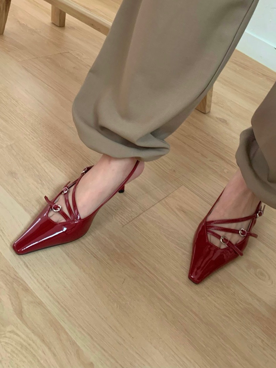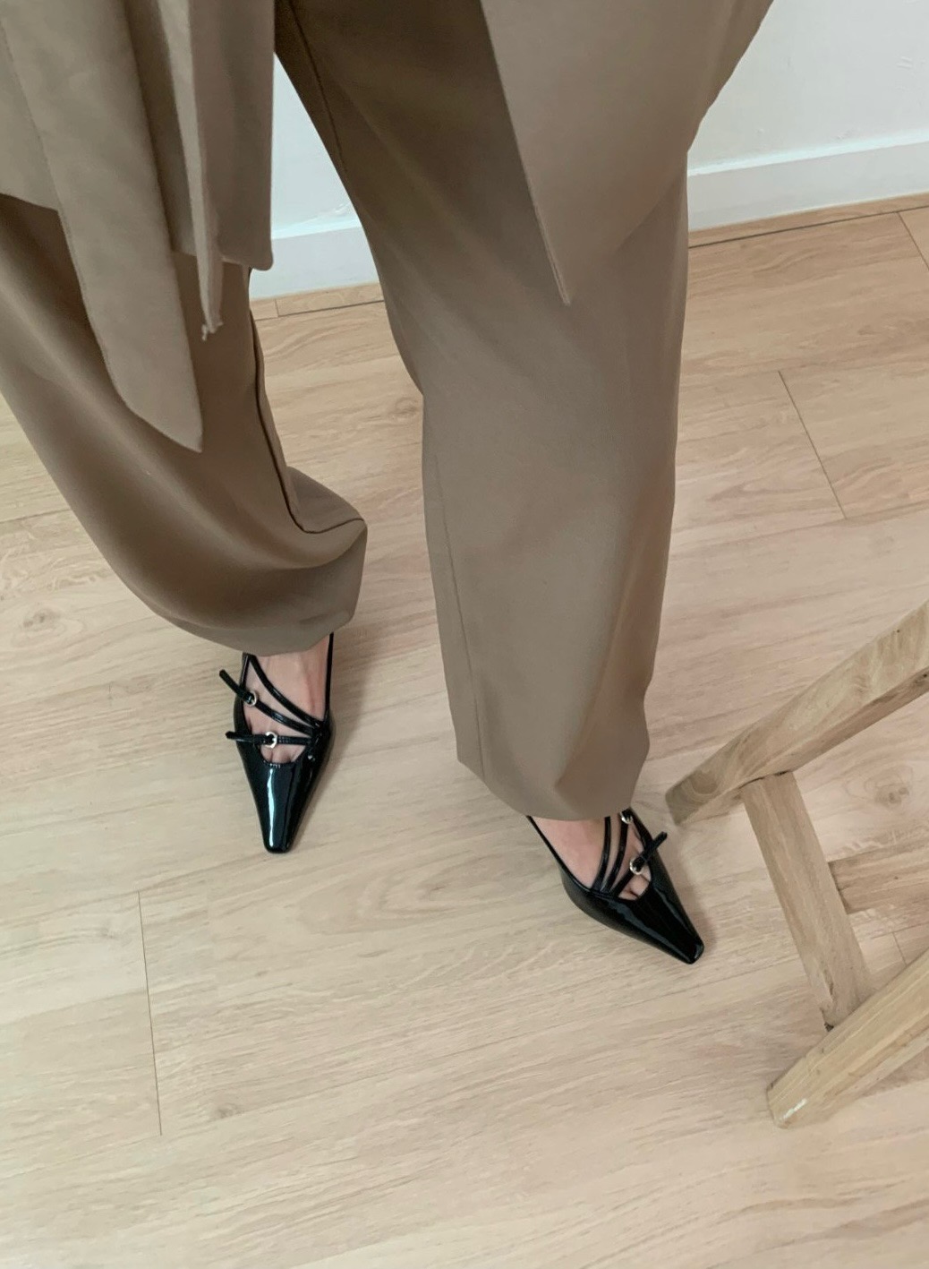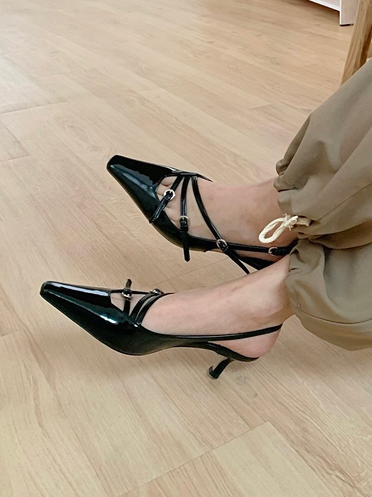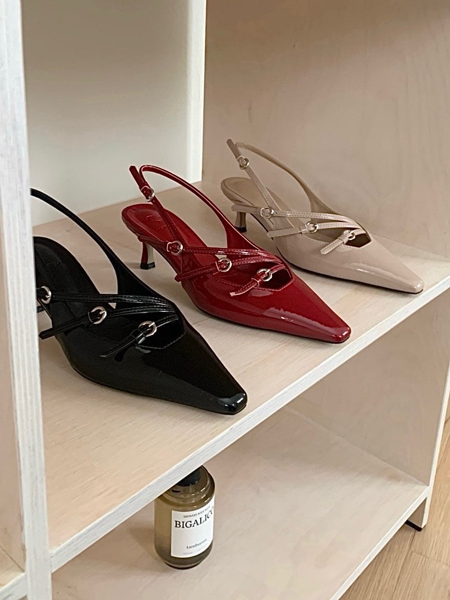 발등의 벨트 디자인이 포인트도 되어주면서 발등을 안정적으로 잡아줍니다. 샤프하게 떨어지는 포인트 토가 다리를 더 길어 보이게 하는 구두에요.