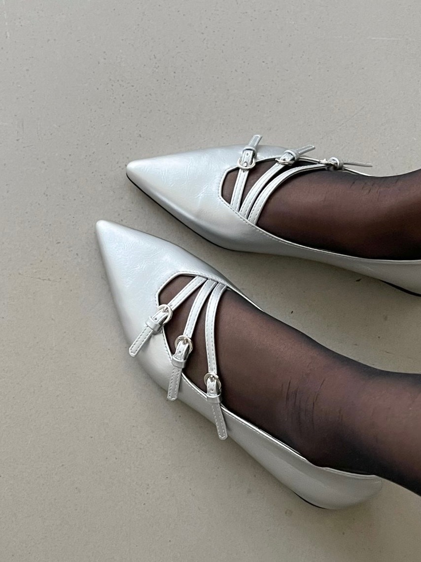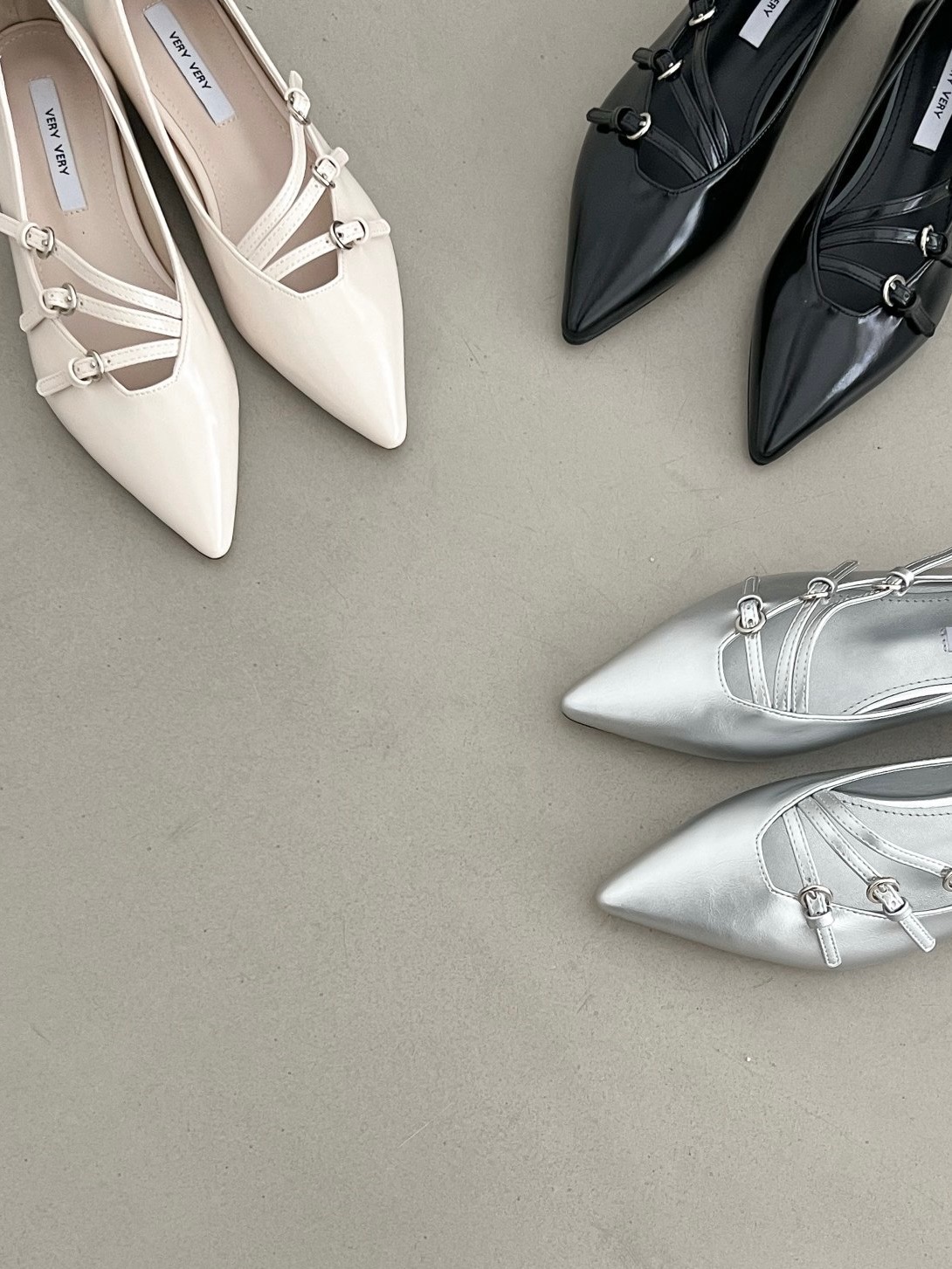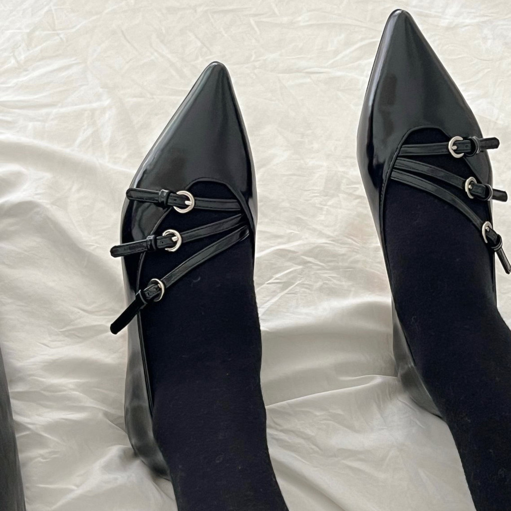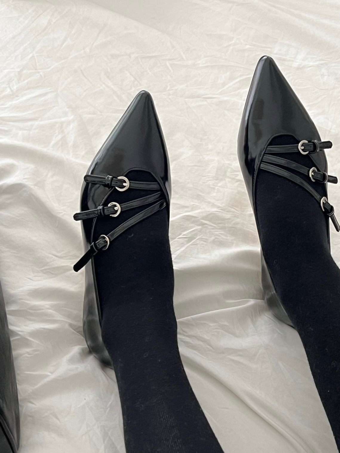 발등의 벨트 디자인이 포인트도 되어주면서 발등을 안정적으로 잡아줍니다. 샤프하게 떨어지는 포인트 토가 다리를 더 길어 보이게 해요.