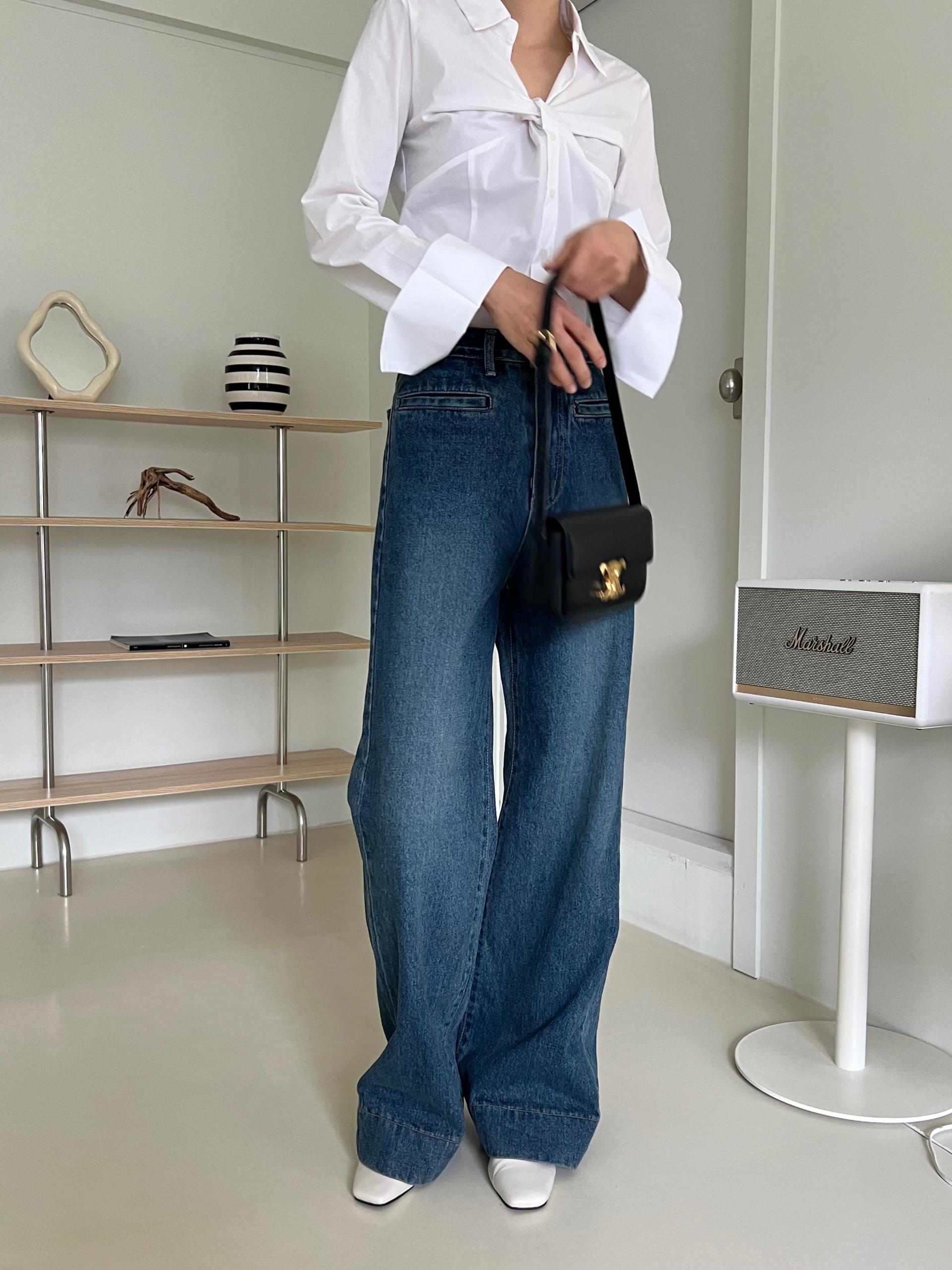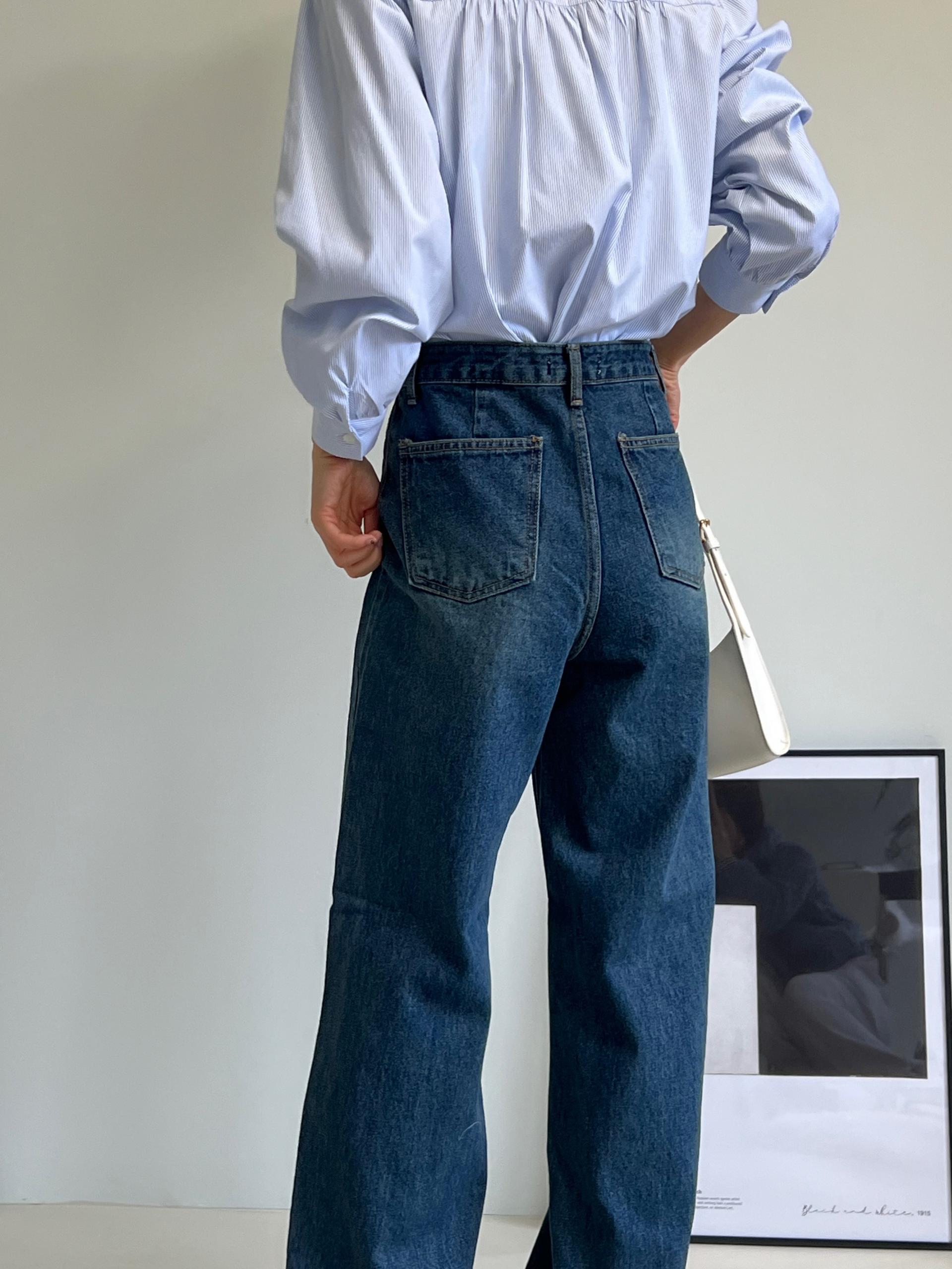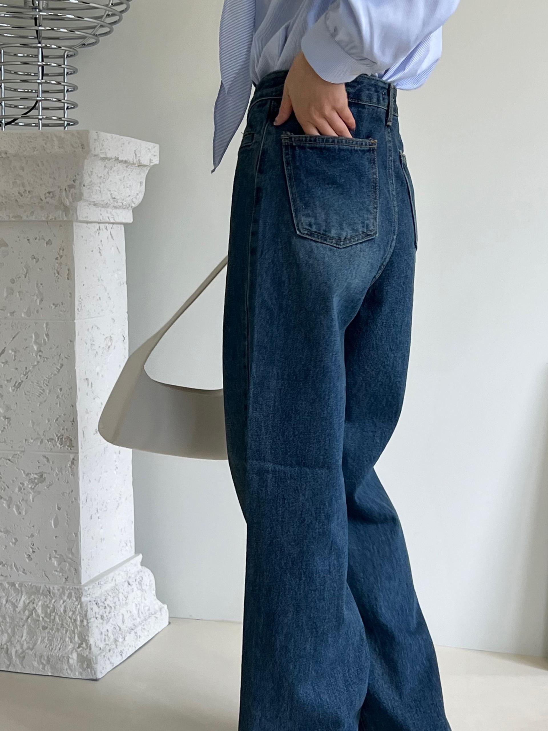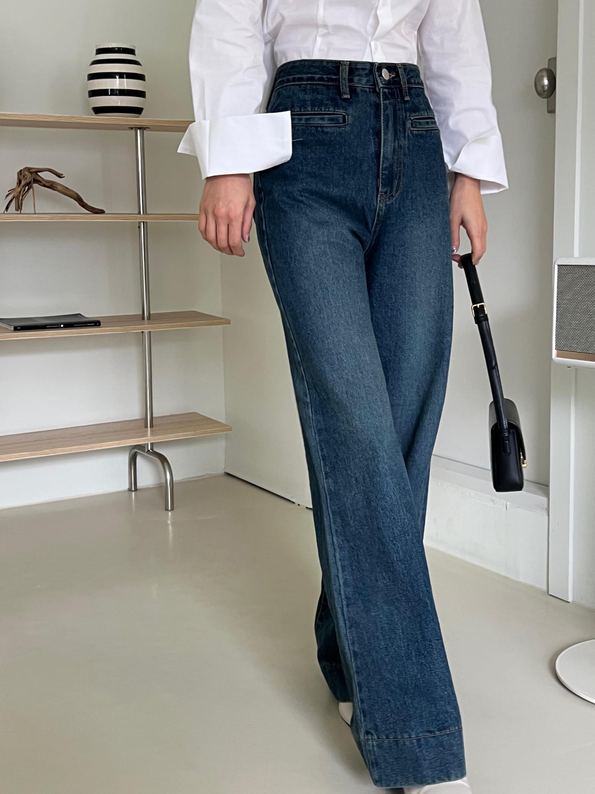 과하지 않은 일자, 세미 와이드 핏으로 체형을 커버하면서 날씬하게 떨어지는 실루엣이에요. 짙은 진청 컬러로 코디하기도 쉽고, 하이웨스트 밑위에 롱 기장으로 캐주얼룩부터 페미닌한 룩, 포멀 룩까지 모든 코디에 매치하기 좋습니다.