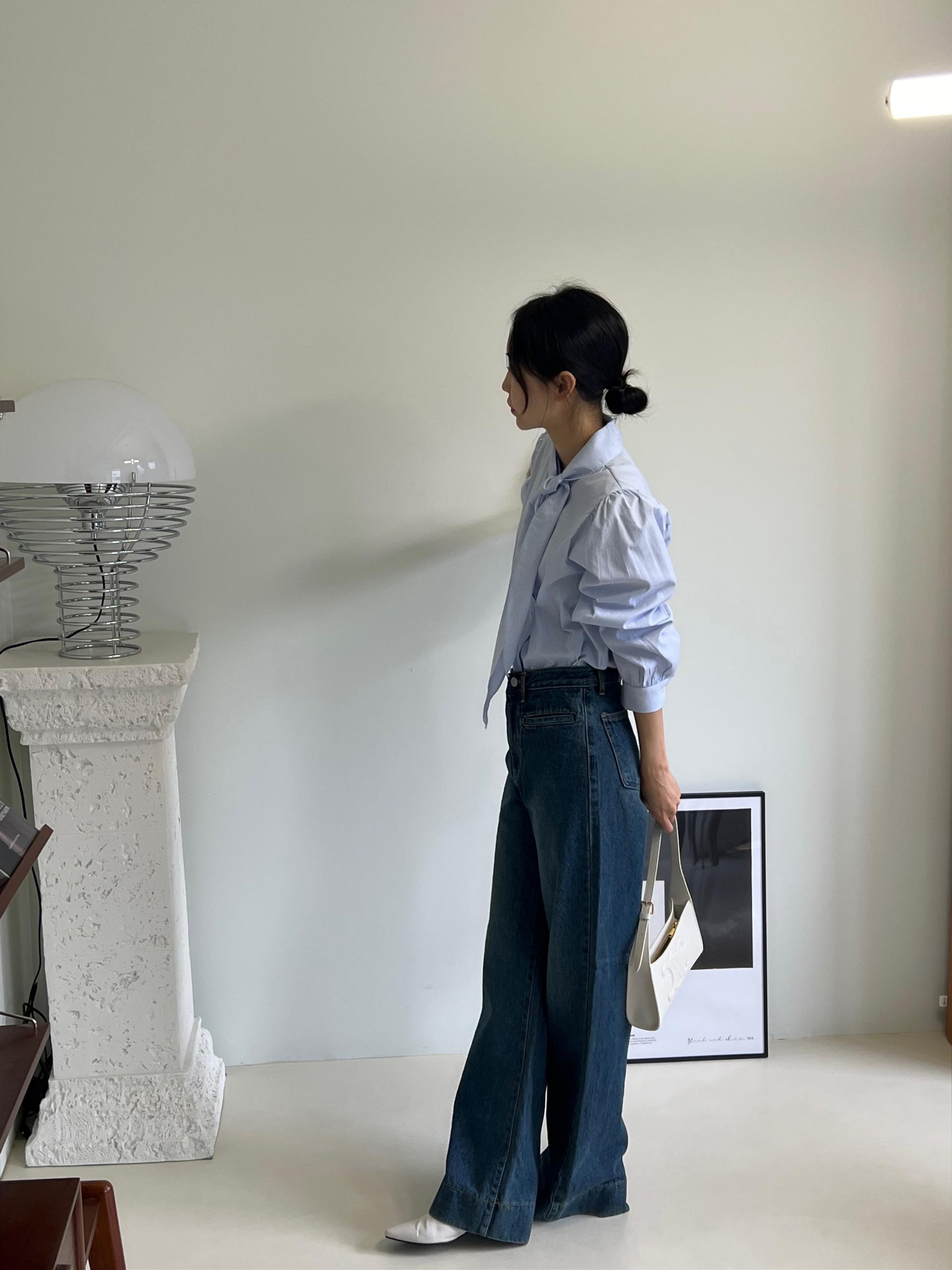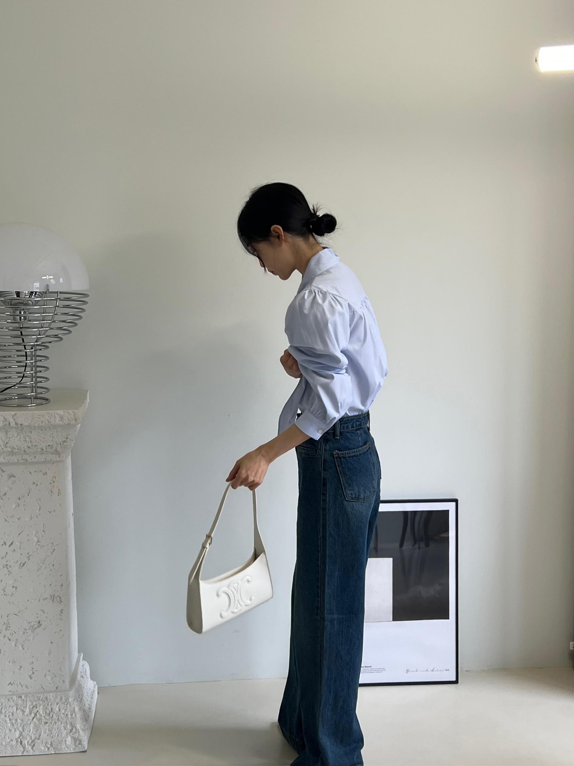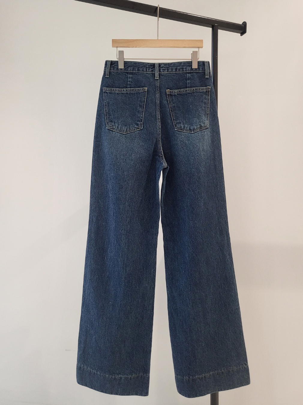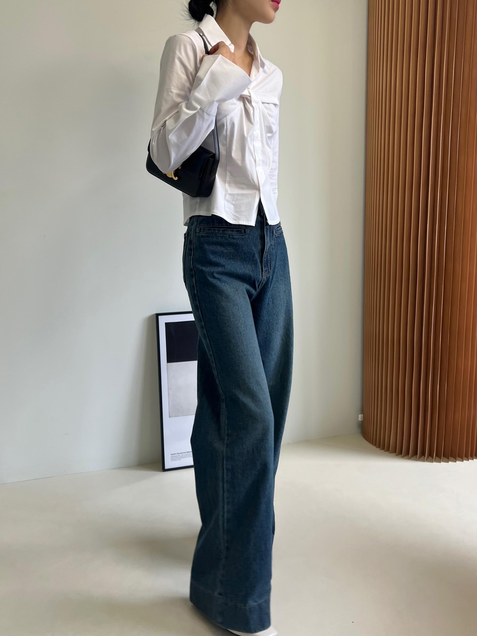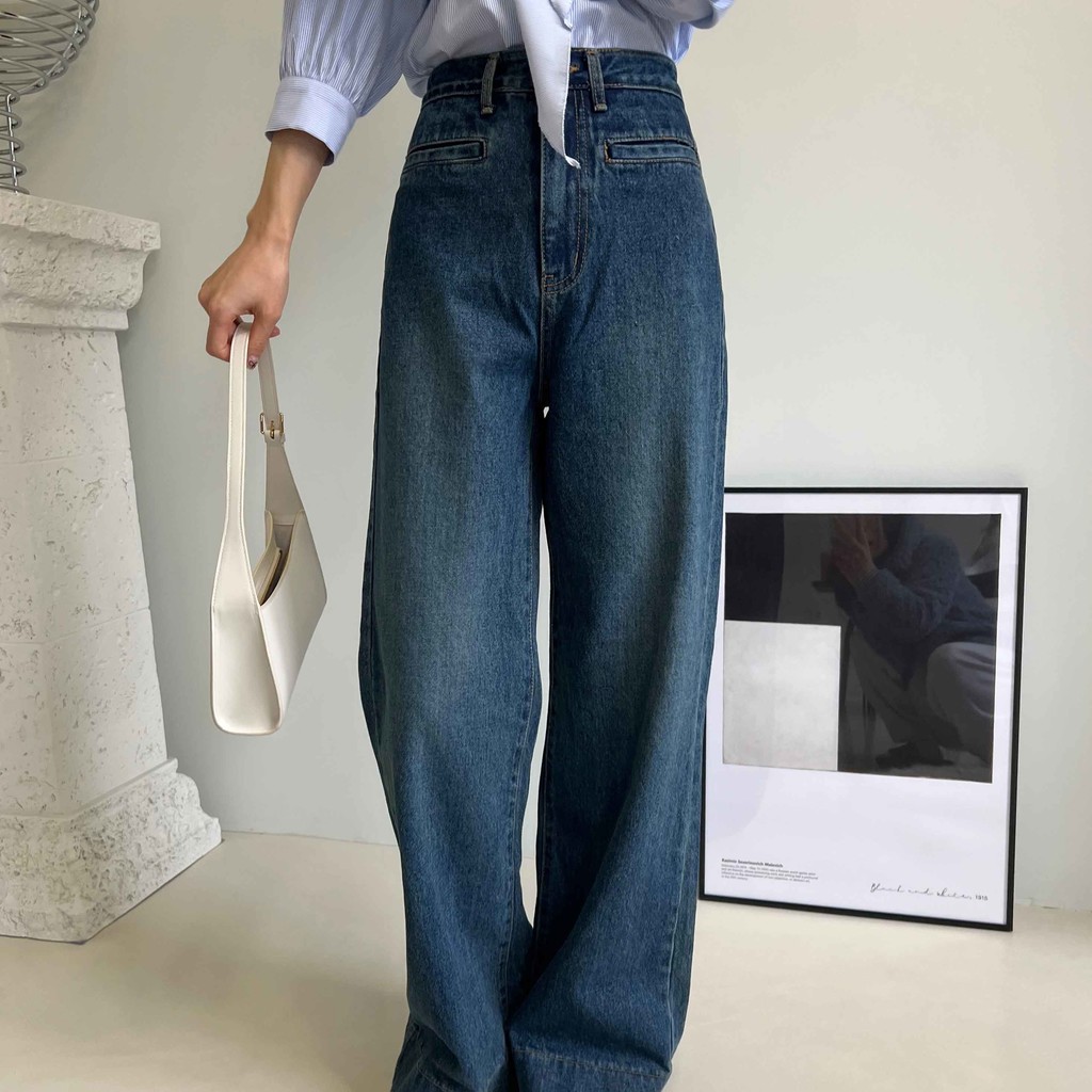 과하지 않은 일자, 세미 와이드 핏으로 체형을 커버하면서 날씬하게 떨어지는 실루엣이에요. 짙은 진청 컬러로 코디하기도 쉽고, 하이웨스트 밑위에 롱 기장으로 캐주얼룩부터 페미닌한 룩, 포멀 룩까지 모든 코디에 매치하기 좋습니다.