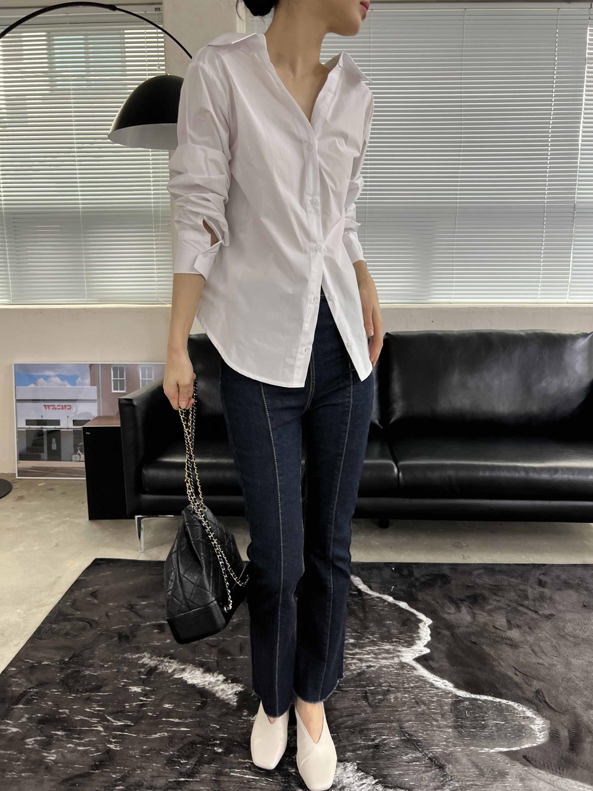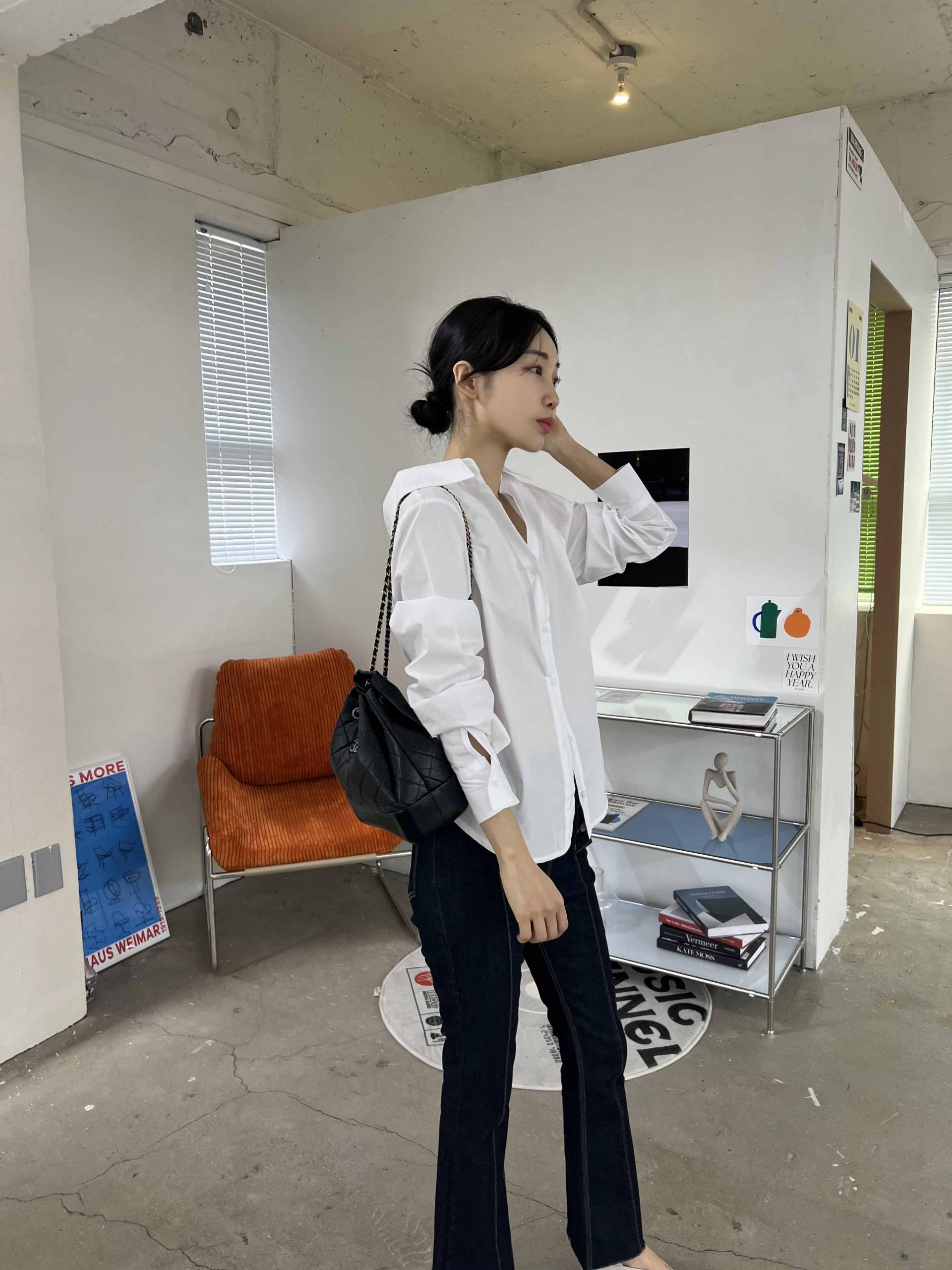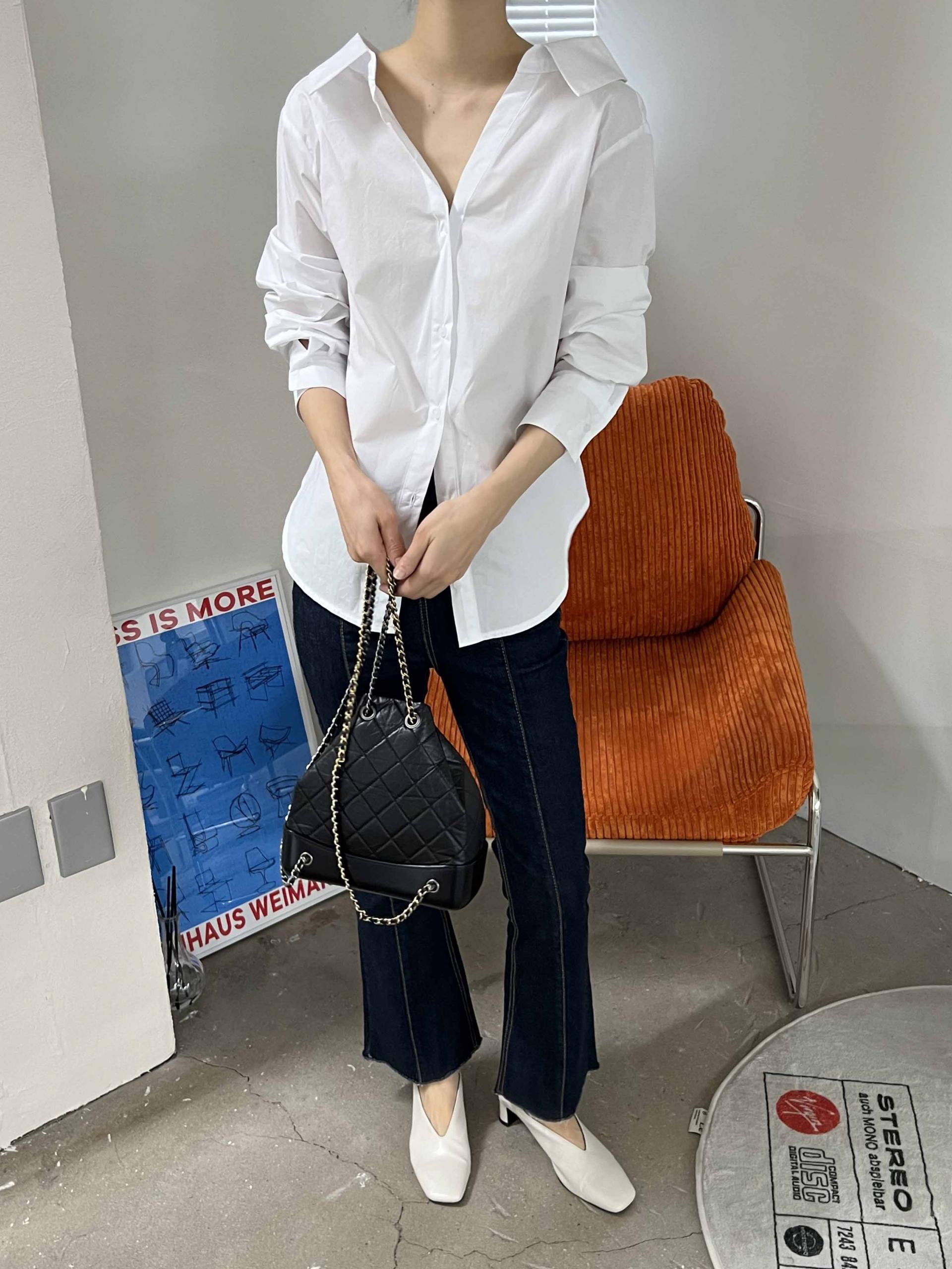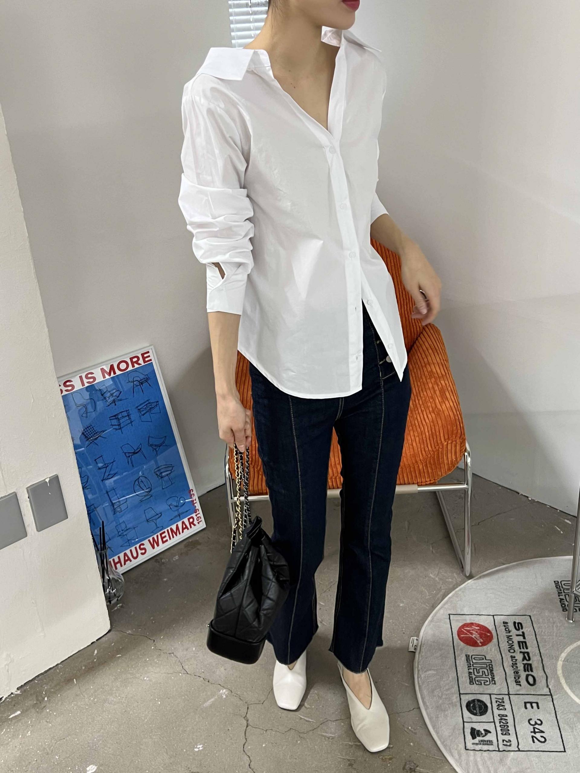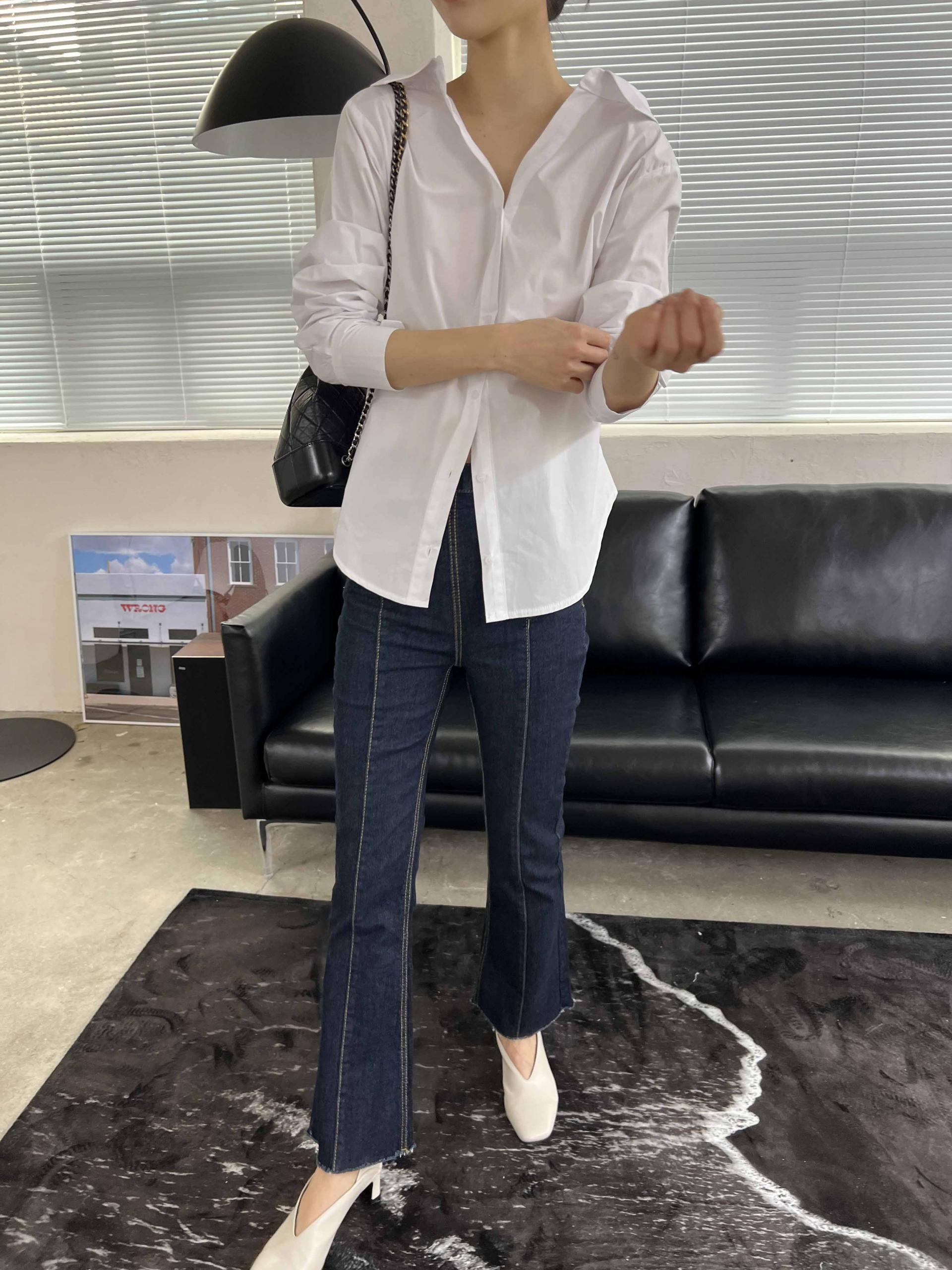 사진만 봐도 느껴지는 아주 빳빳한 코튼 소재로 단독으로만 착용하셔도 굉장히 세련된 느낌이고, 완성도 높은 코디를 하실 수 있을 거예요.