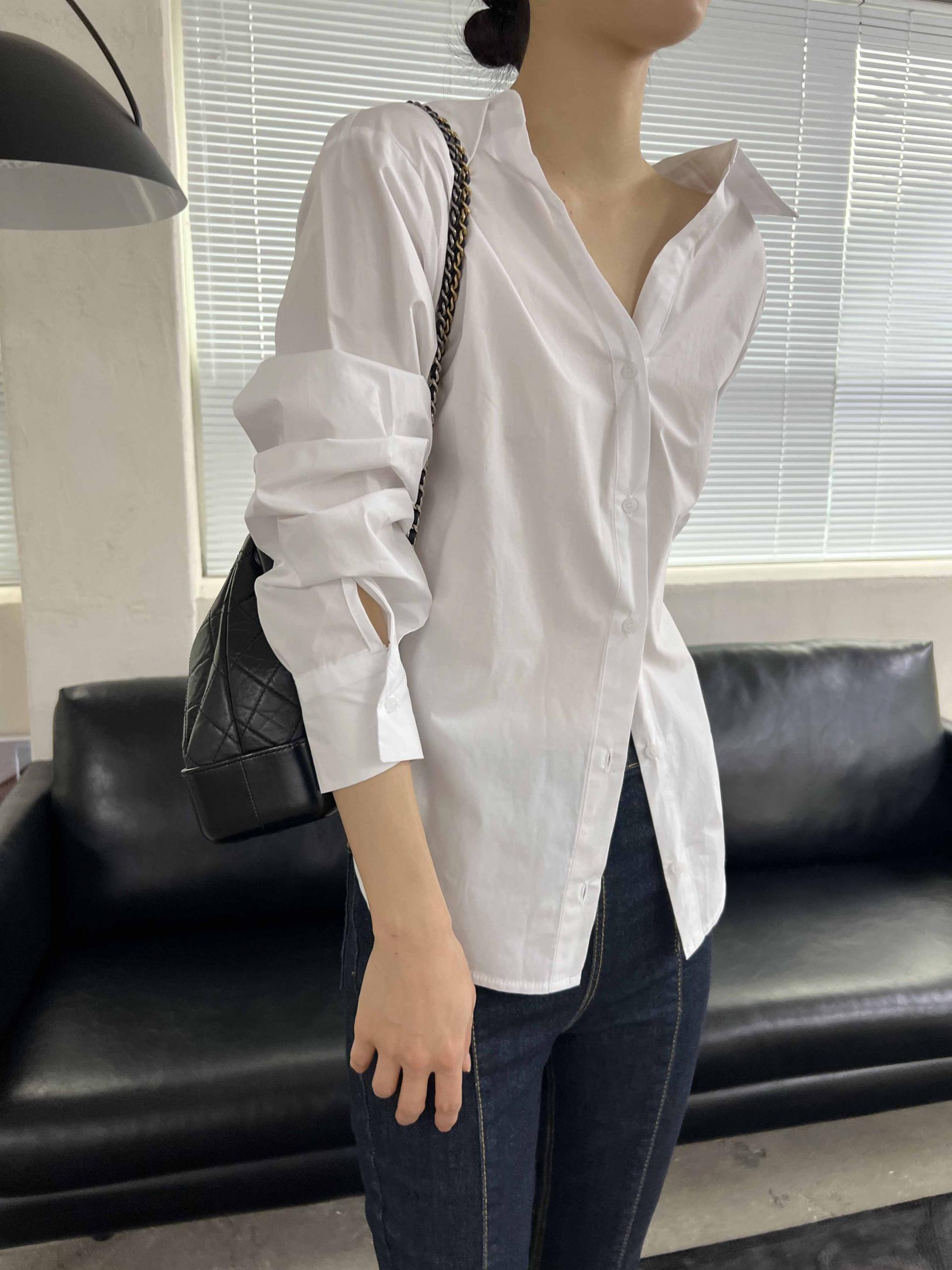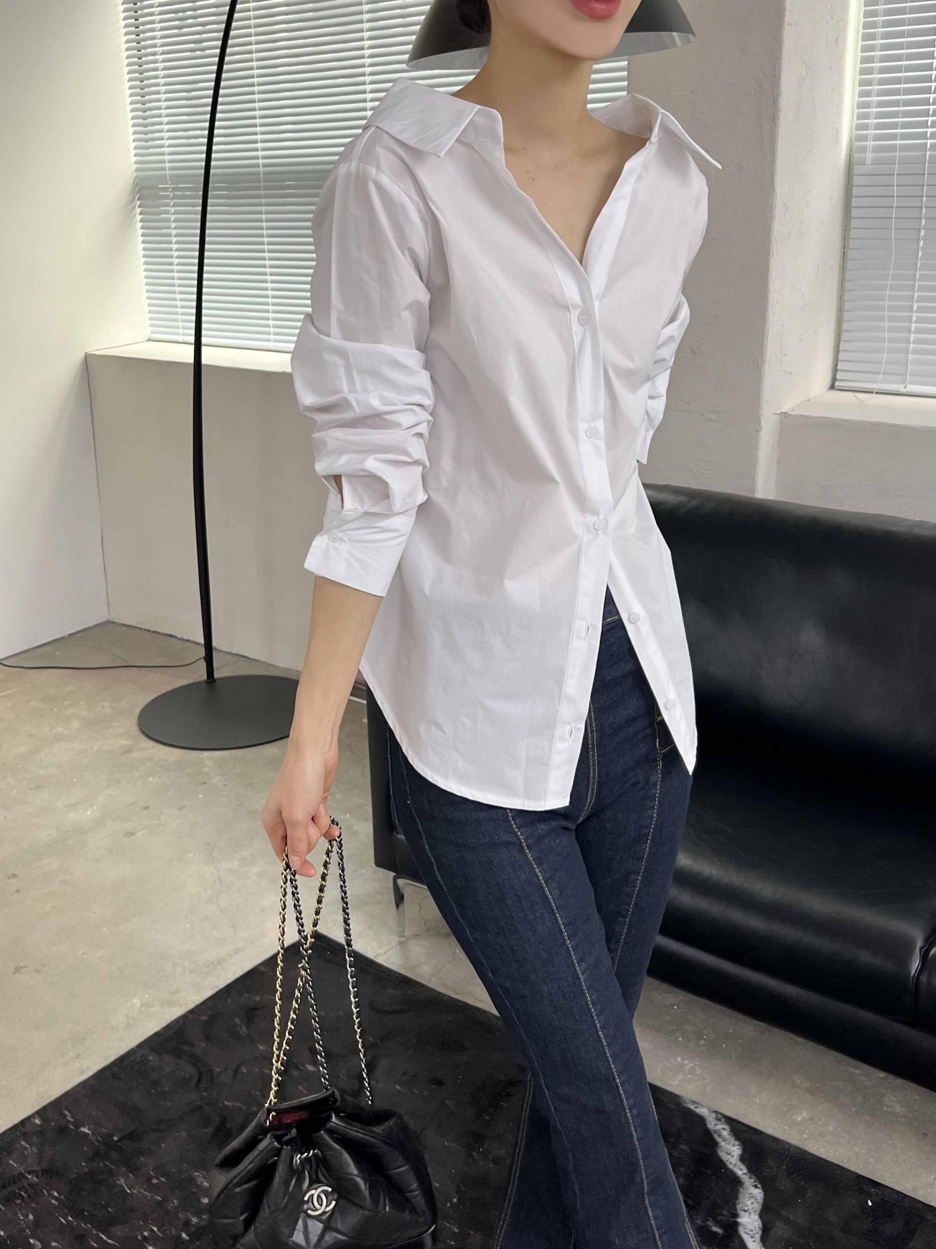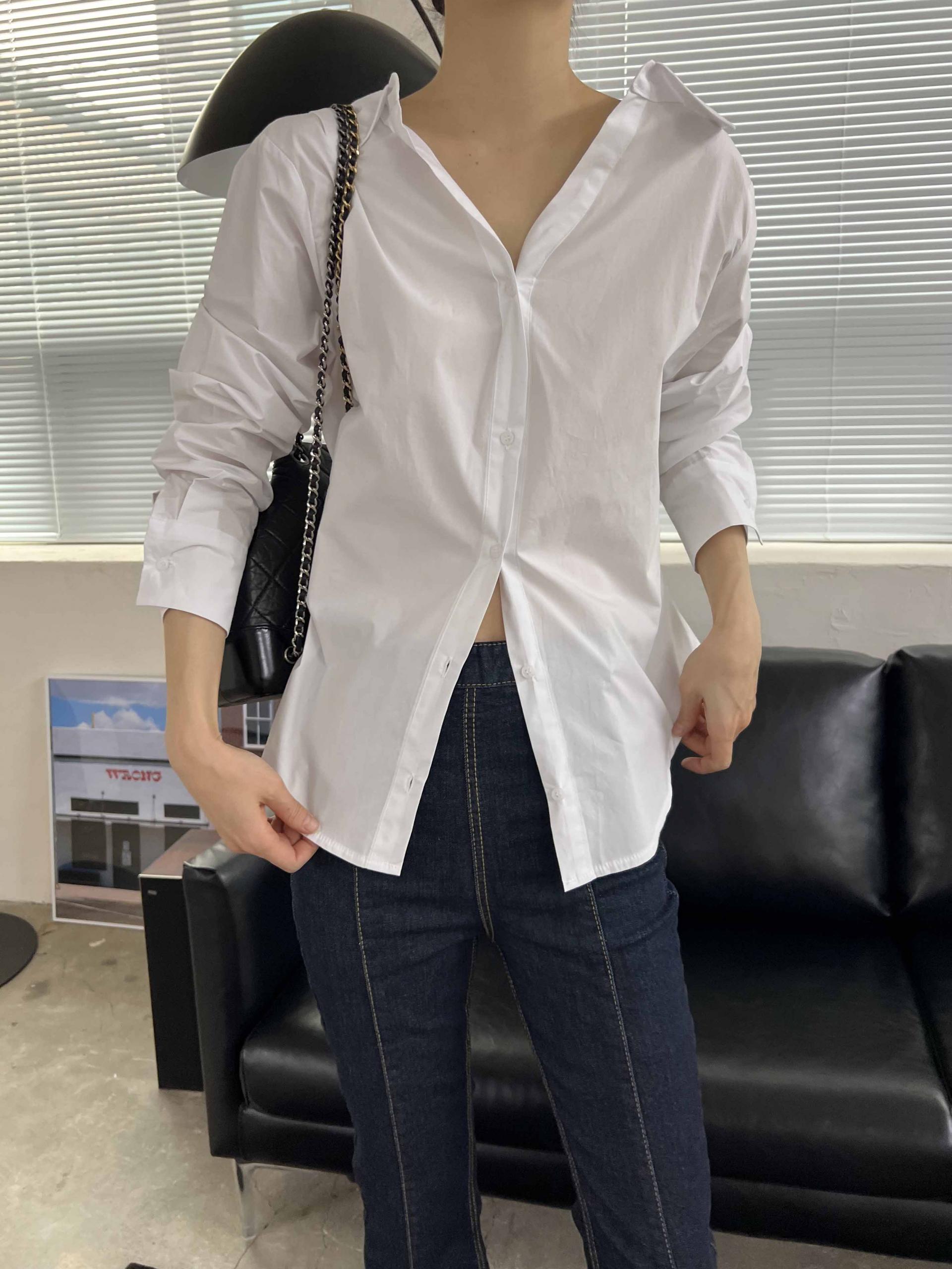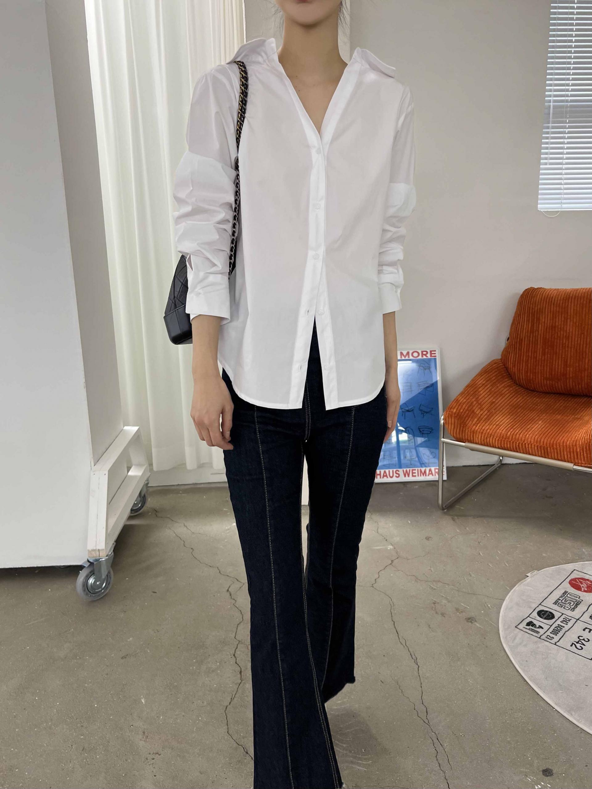 사진만 봐도 느껴지는 아주 빳빳한 코튼 소재로 단독으로만 착용하셔도 굉장히 세련된 느낌이고, 완성도 높은 코디를 하실 수 있을 거예요.