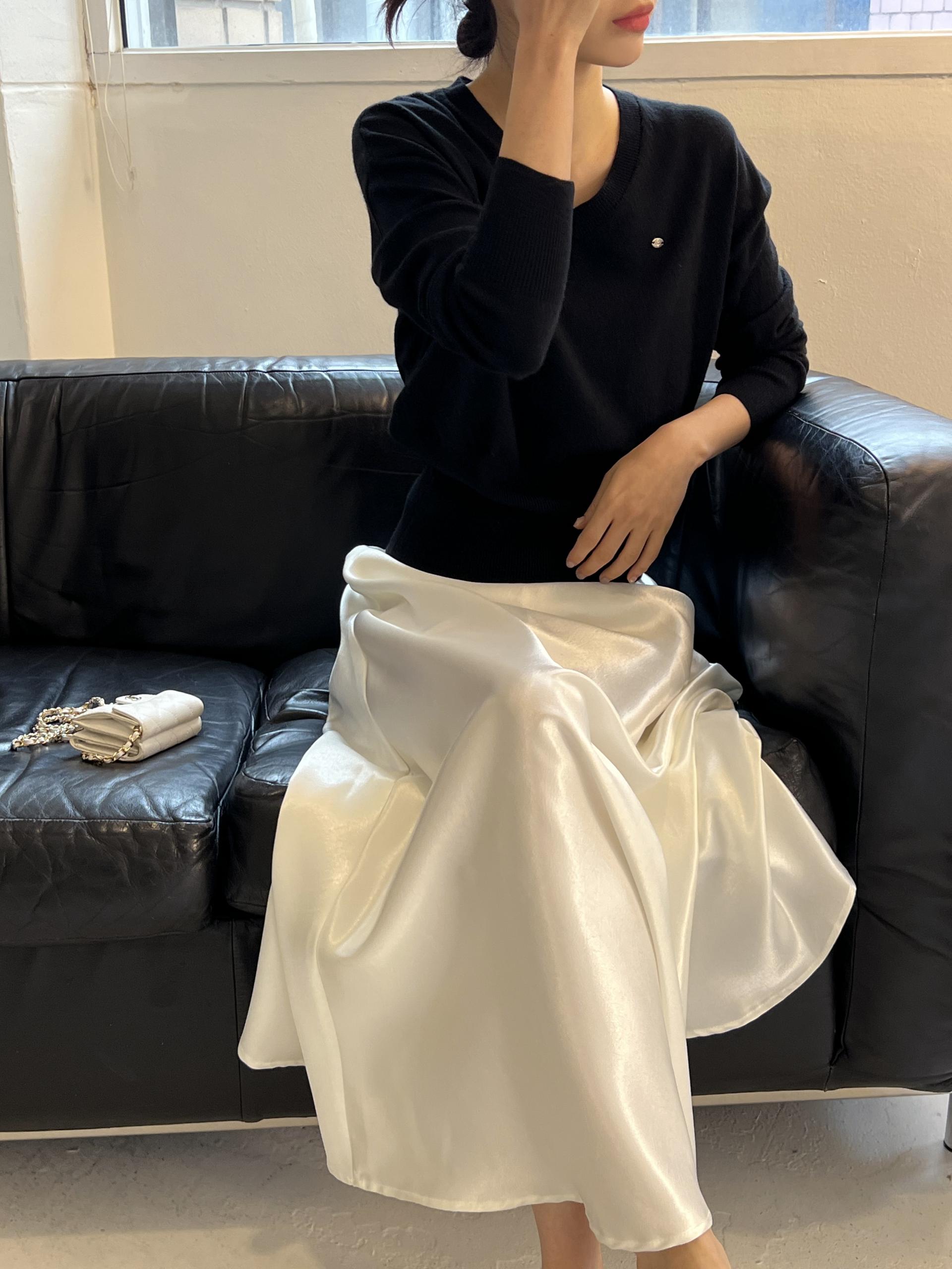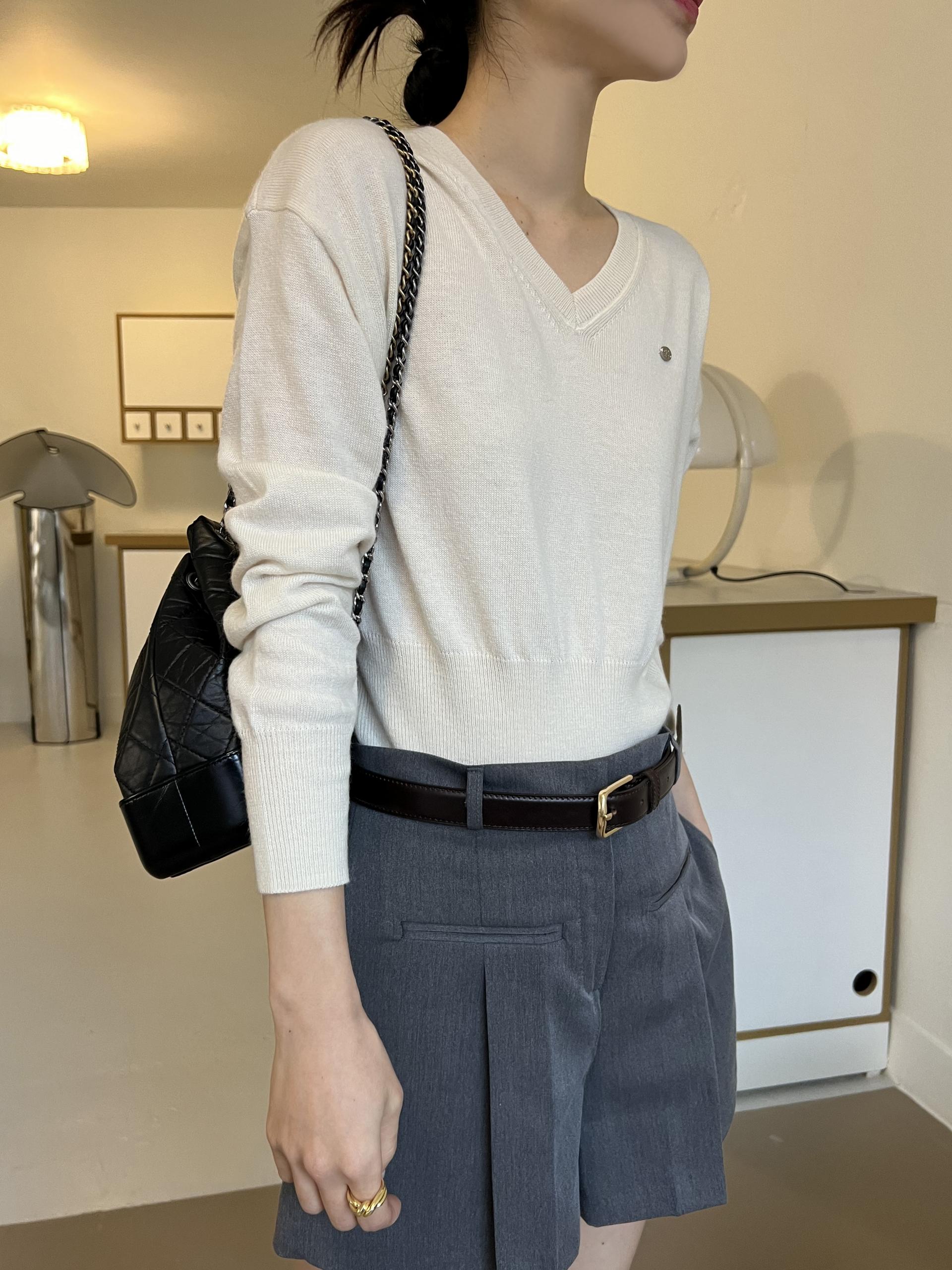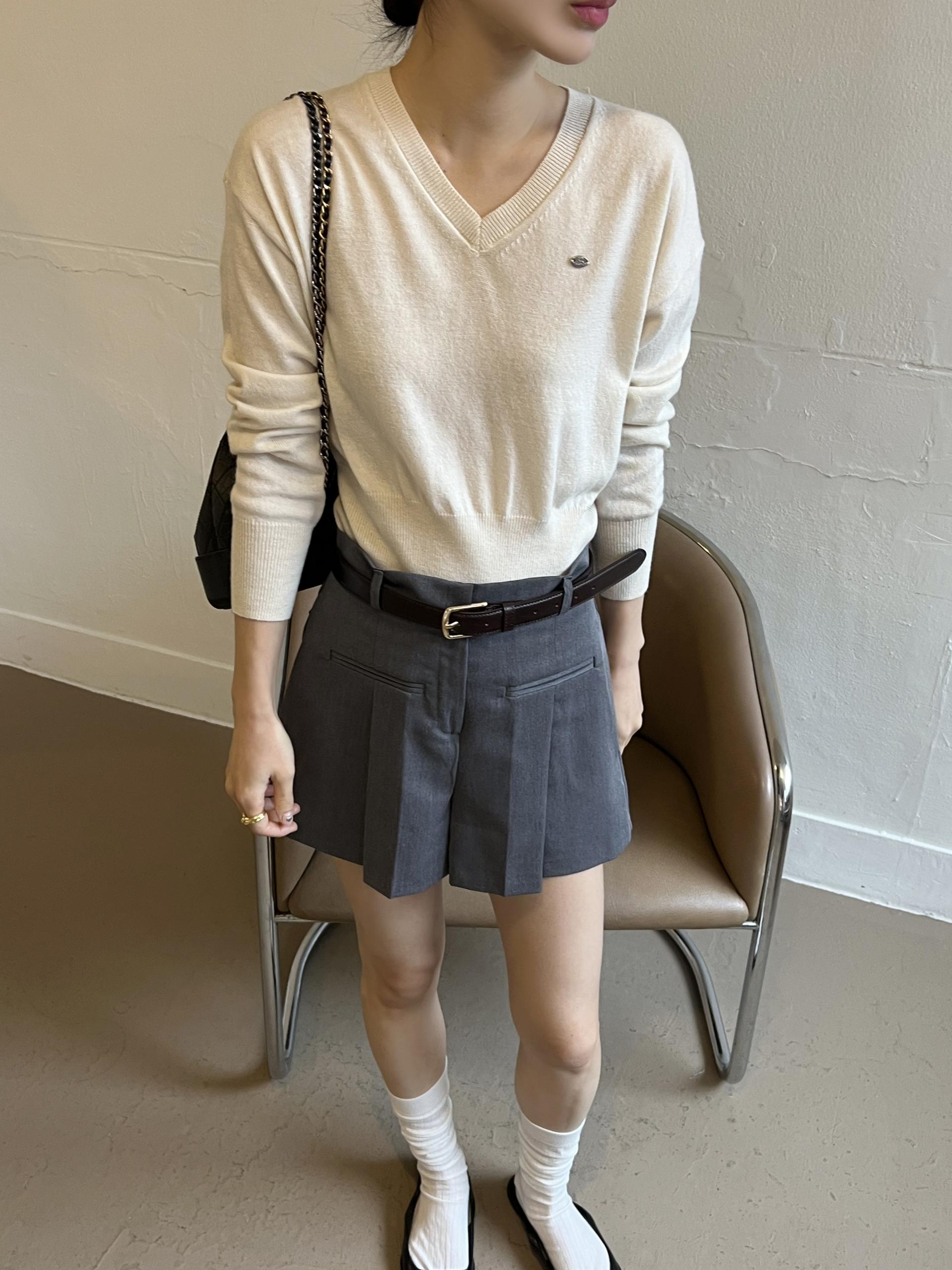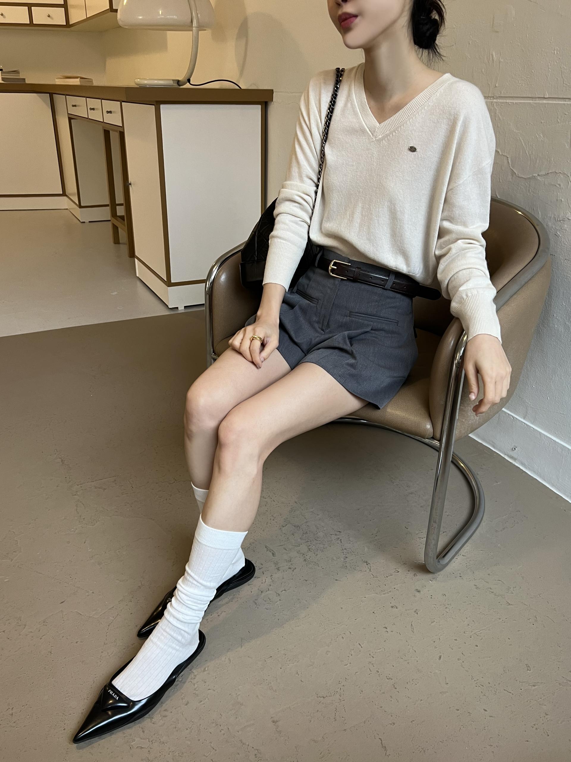 노출이 없으면서 여성스러운 브이넥 디자인이며, 적당한 높이의 시보리로 허리 라인을 자연스럽게 잡아주어 전체적으로 여리여리한 핏입니다.