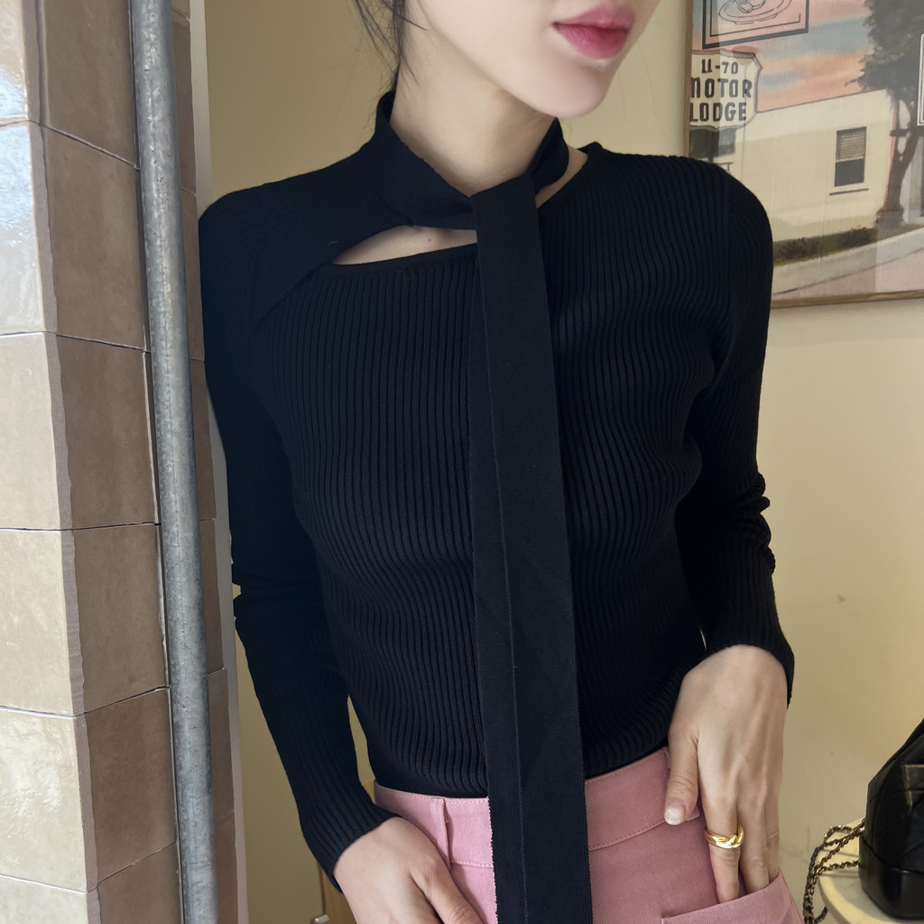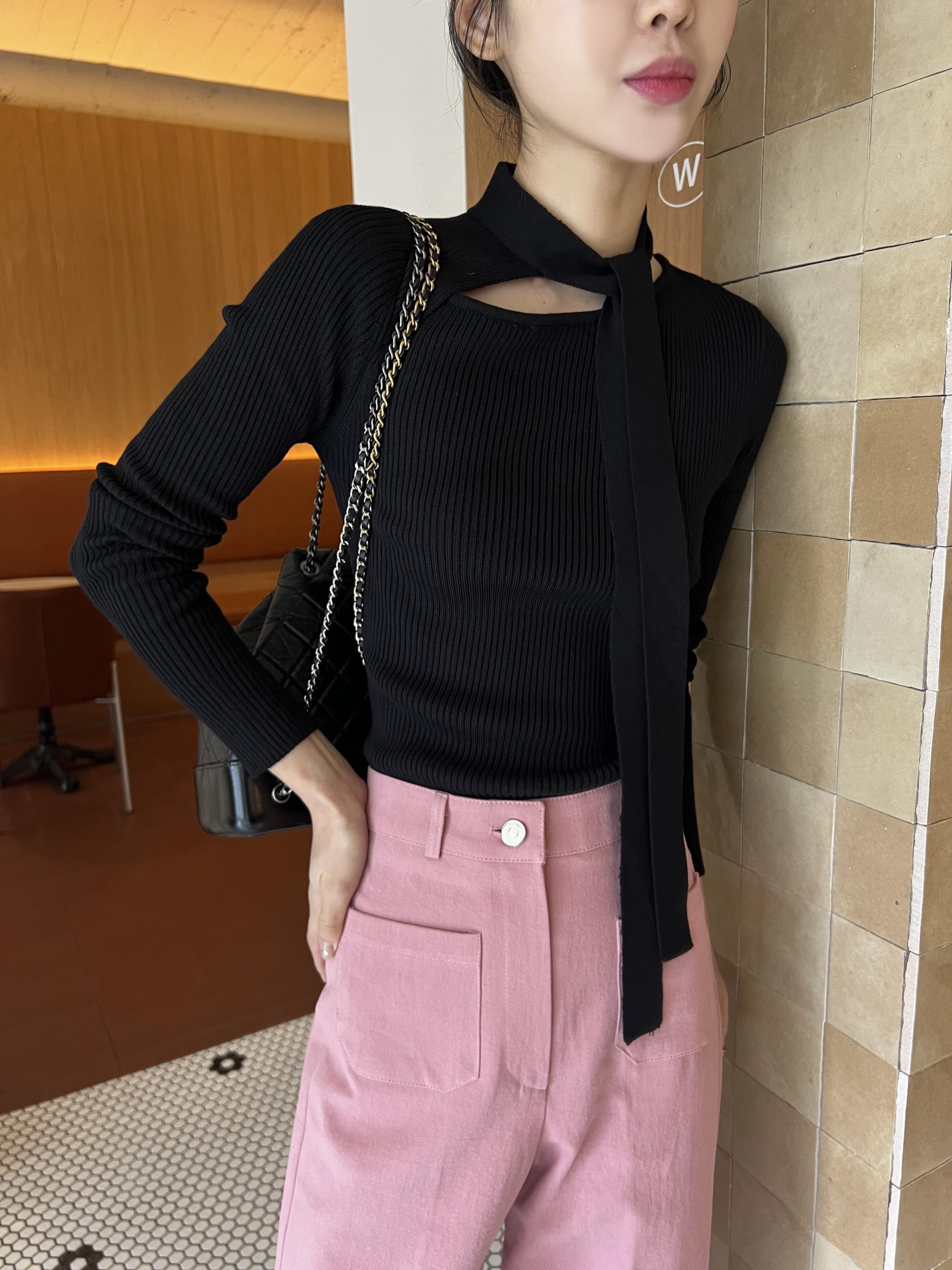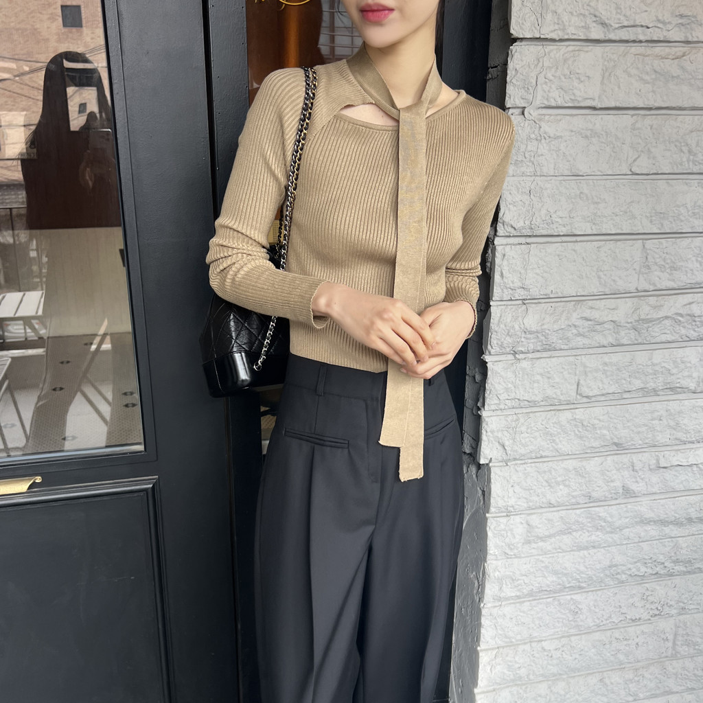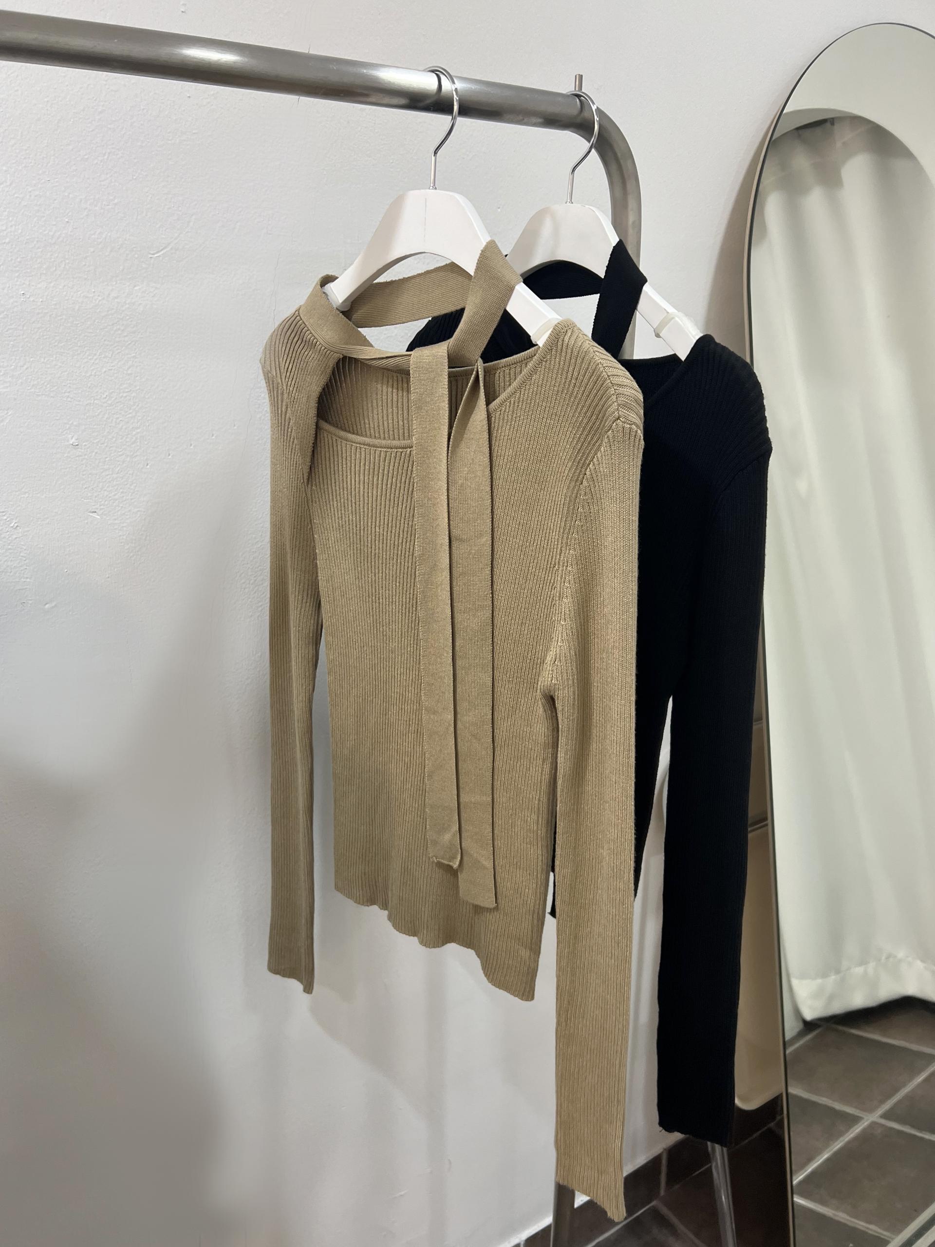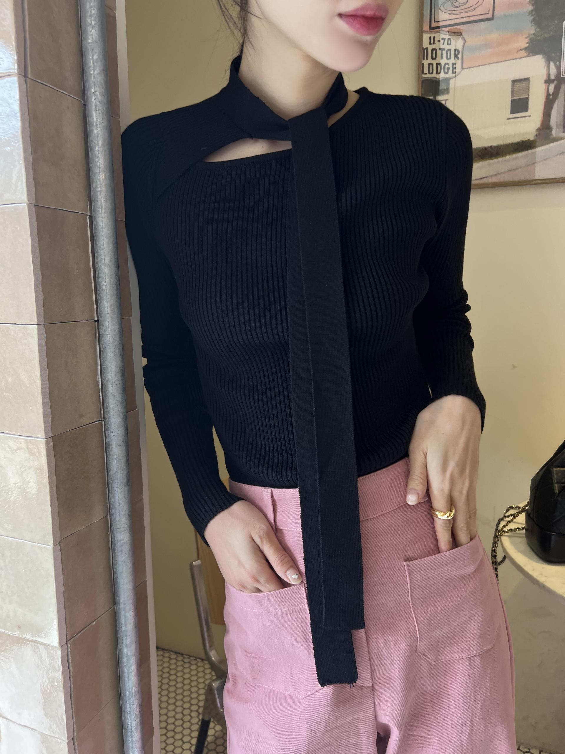 초커 느낌의 타이가 부착된 형태라 스타일링하기 쉽고, 깔끔한 무지 니트라 다양하게 코디하기 좋으실 거예요. 아우터 속 이너 니트로도 좋고, 단독으로도 충분한 존재감의 니트 티셔츠입니다.