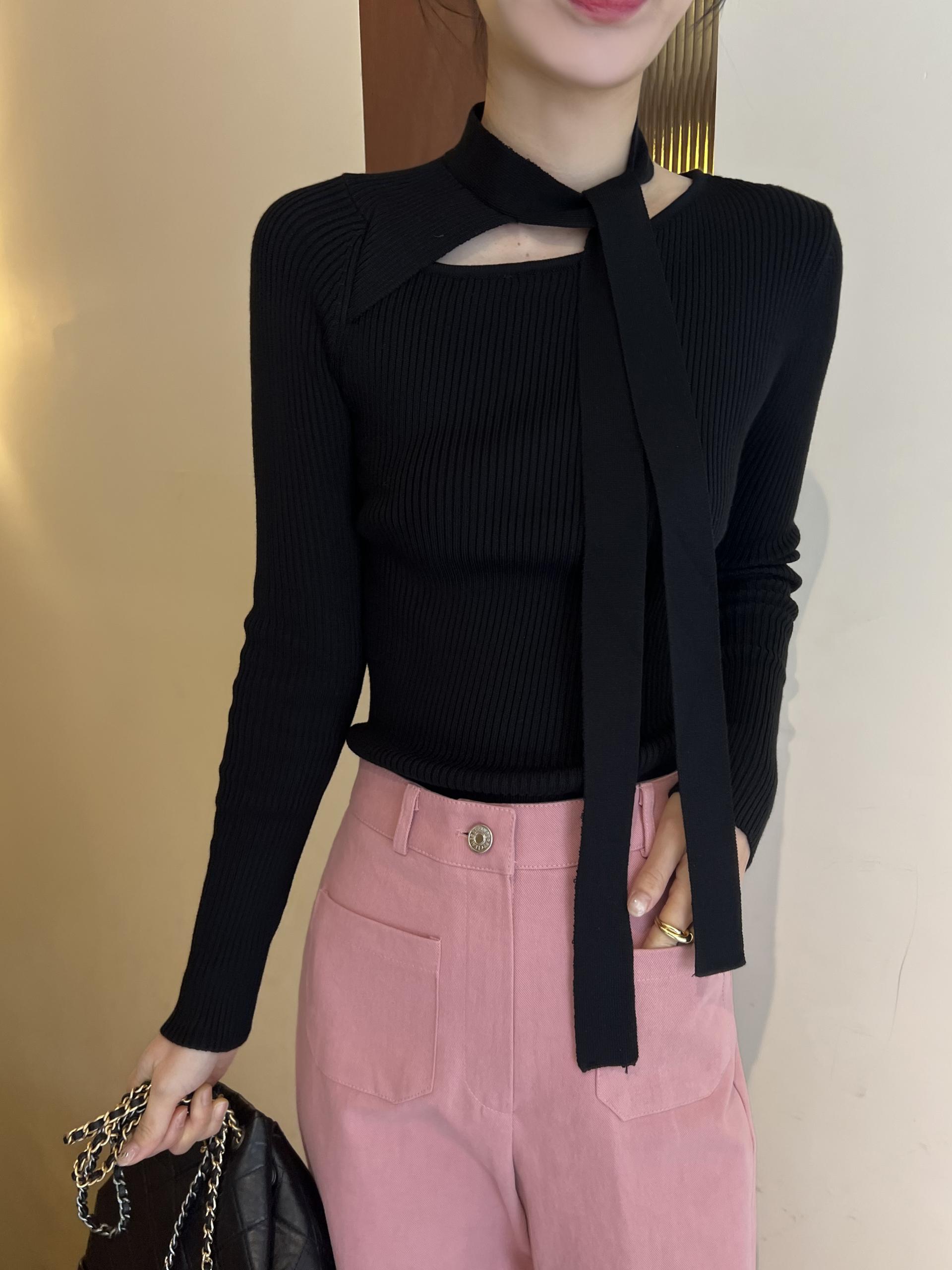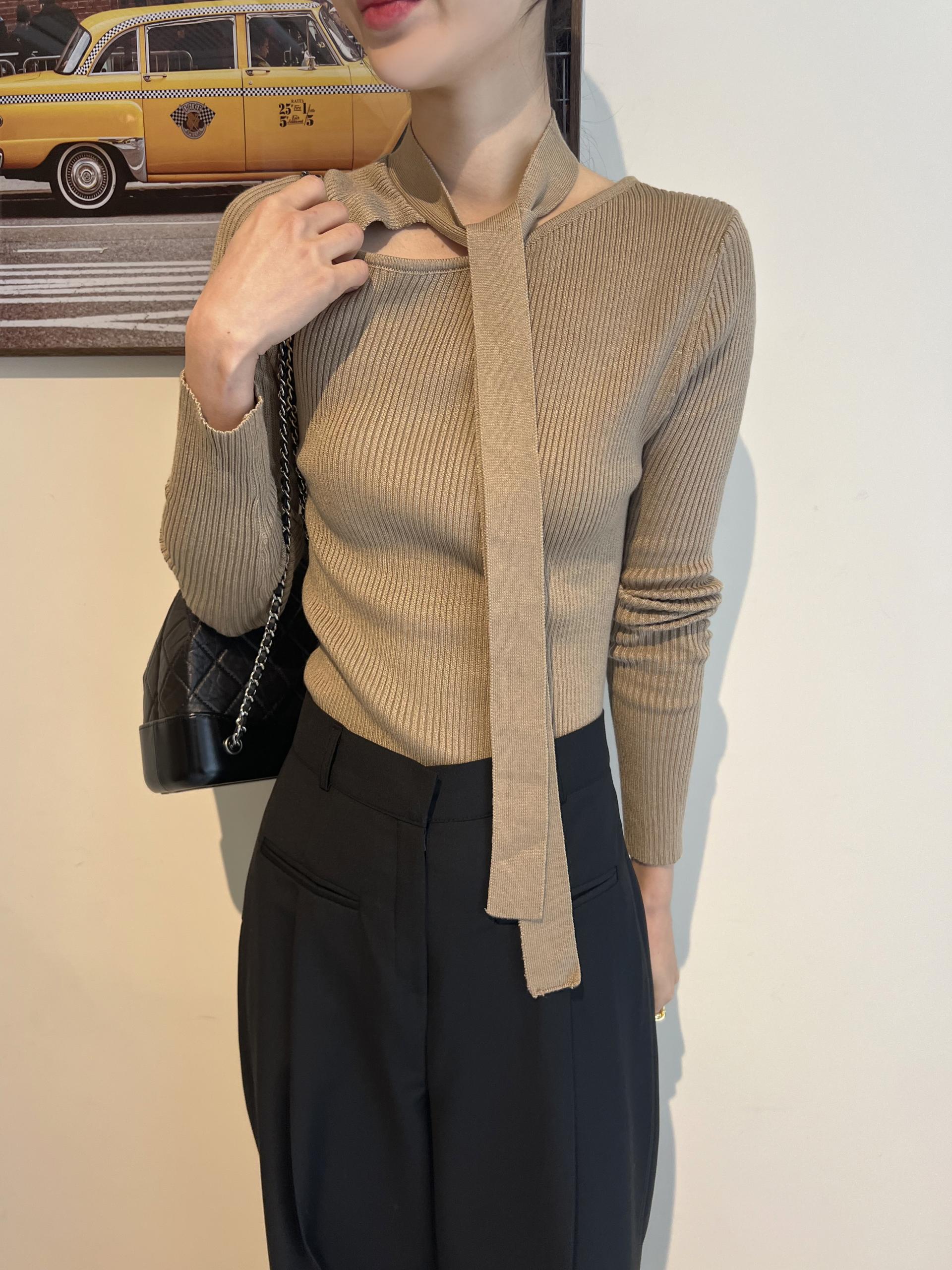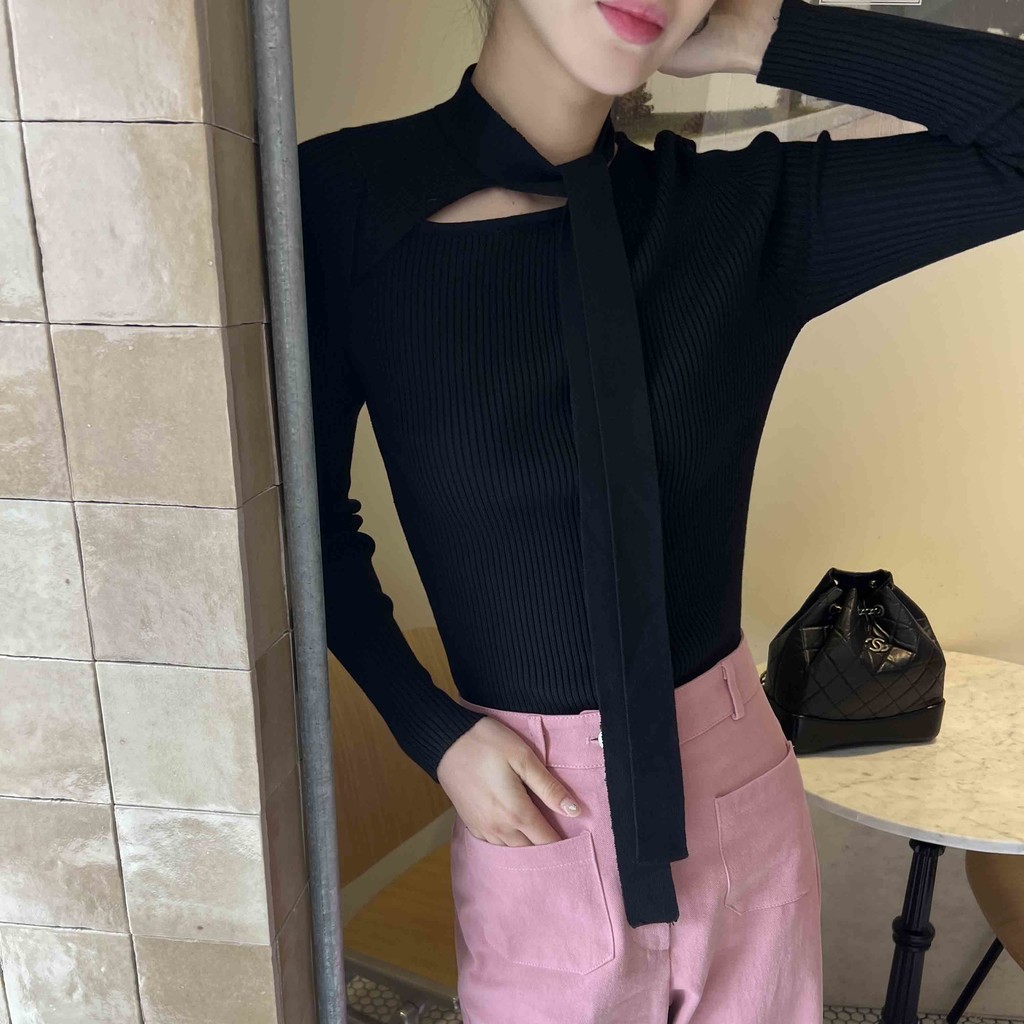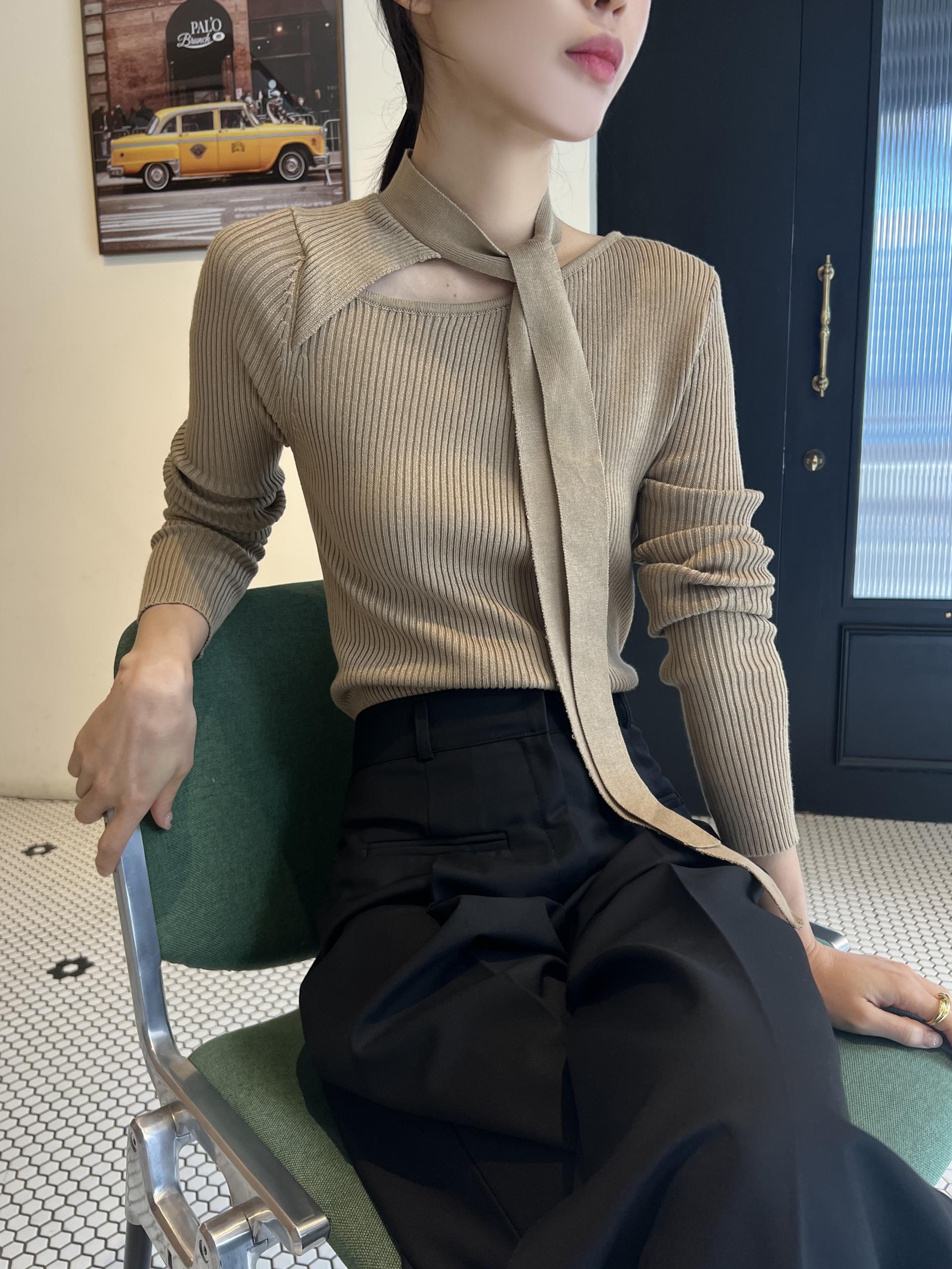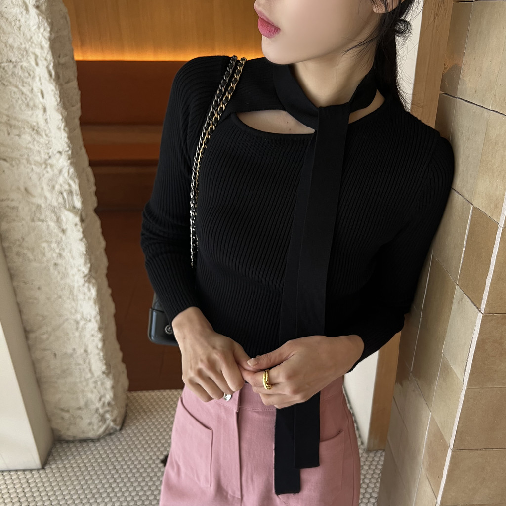 초커 느낌의 타이가 부착된 형태라 스타일링하기 쉽고, 깔끔한 무지 니트라 다양하게 코디하기 좋으실 거예요. 아우터 속 이너 니트로도 좋고, 단독으로도 충분한 존재감의 니트 티셔츠입니다.