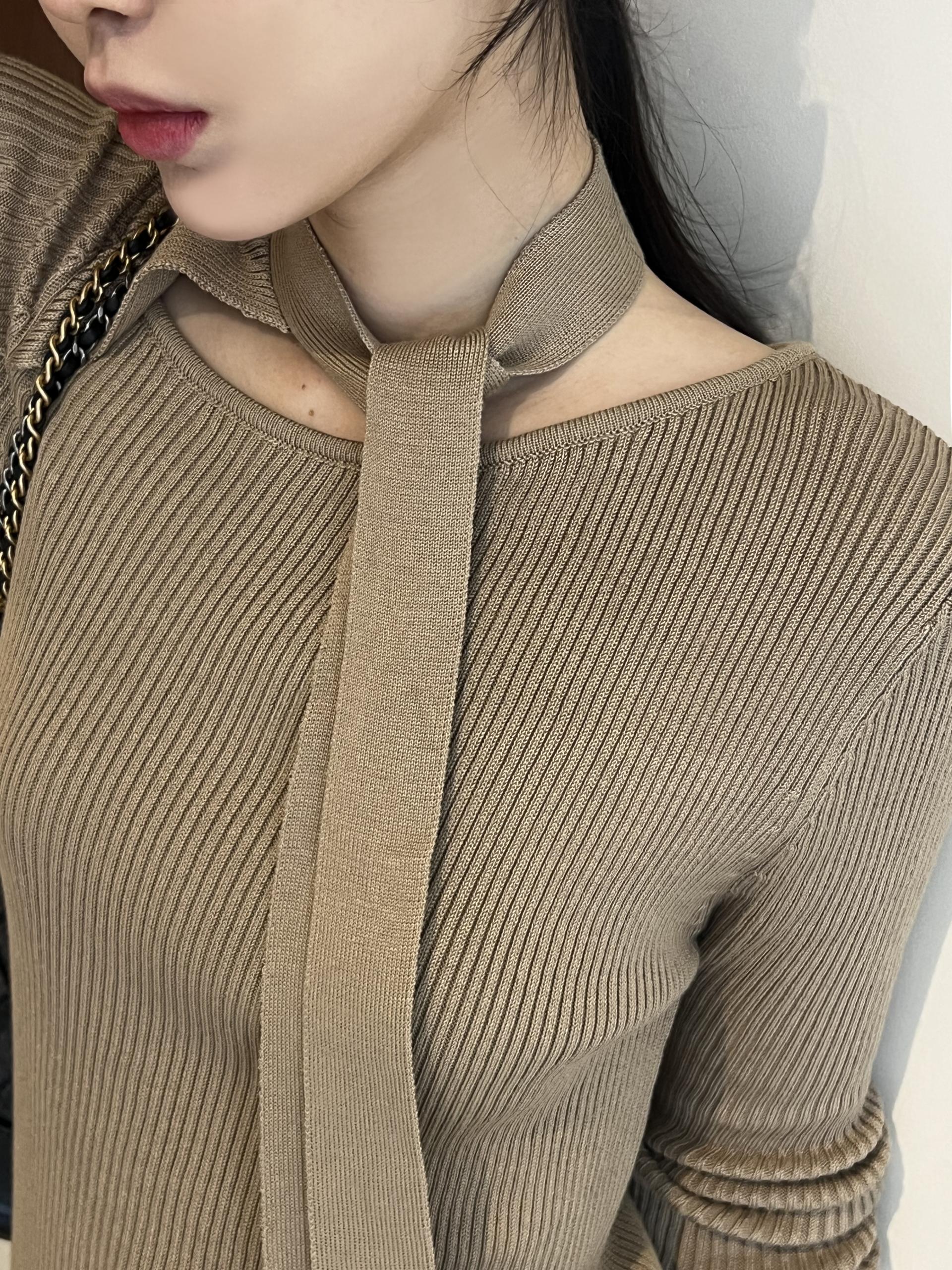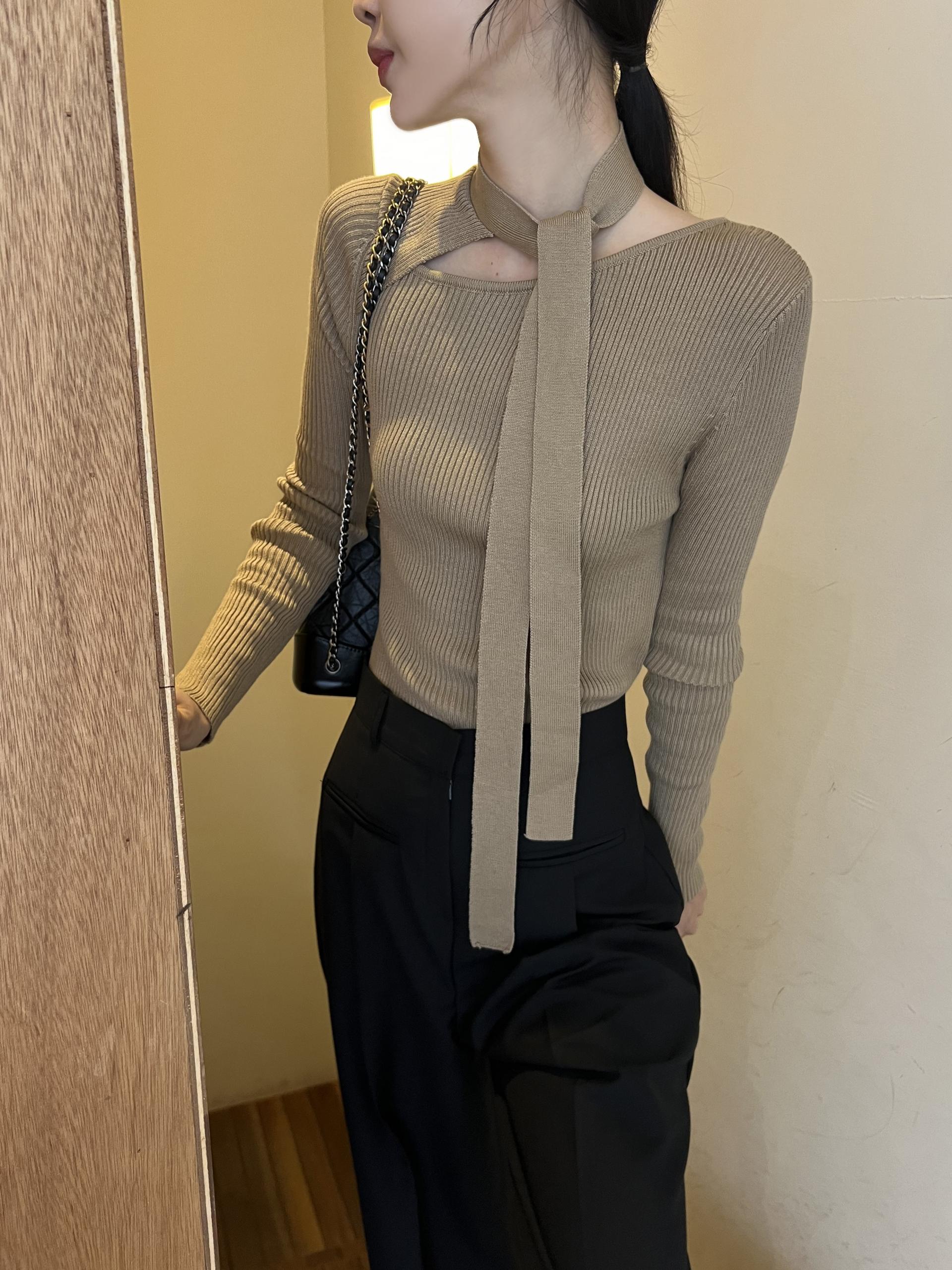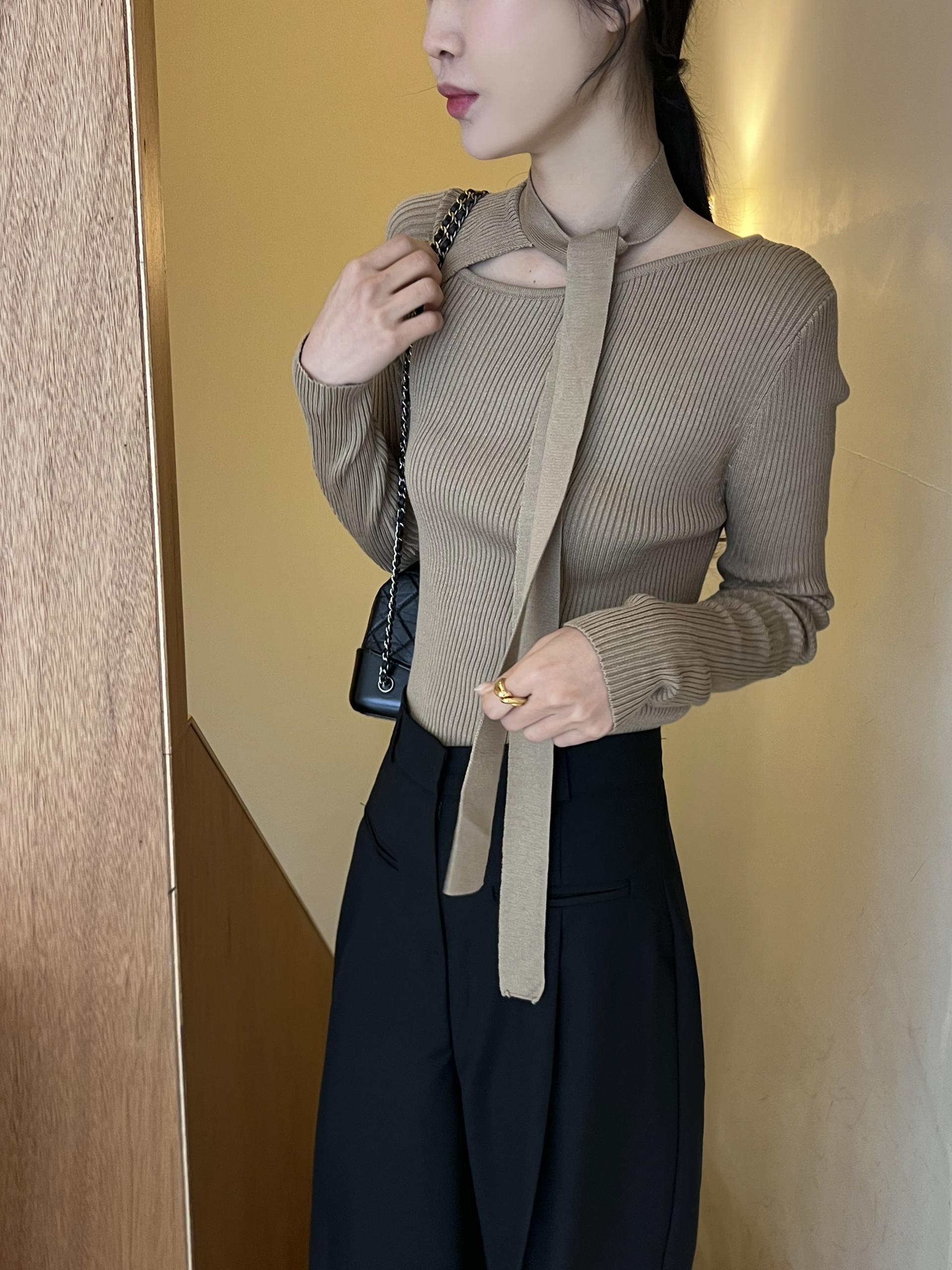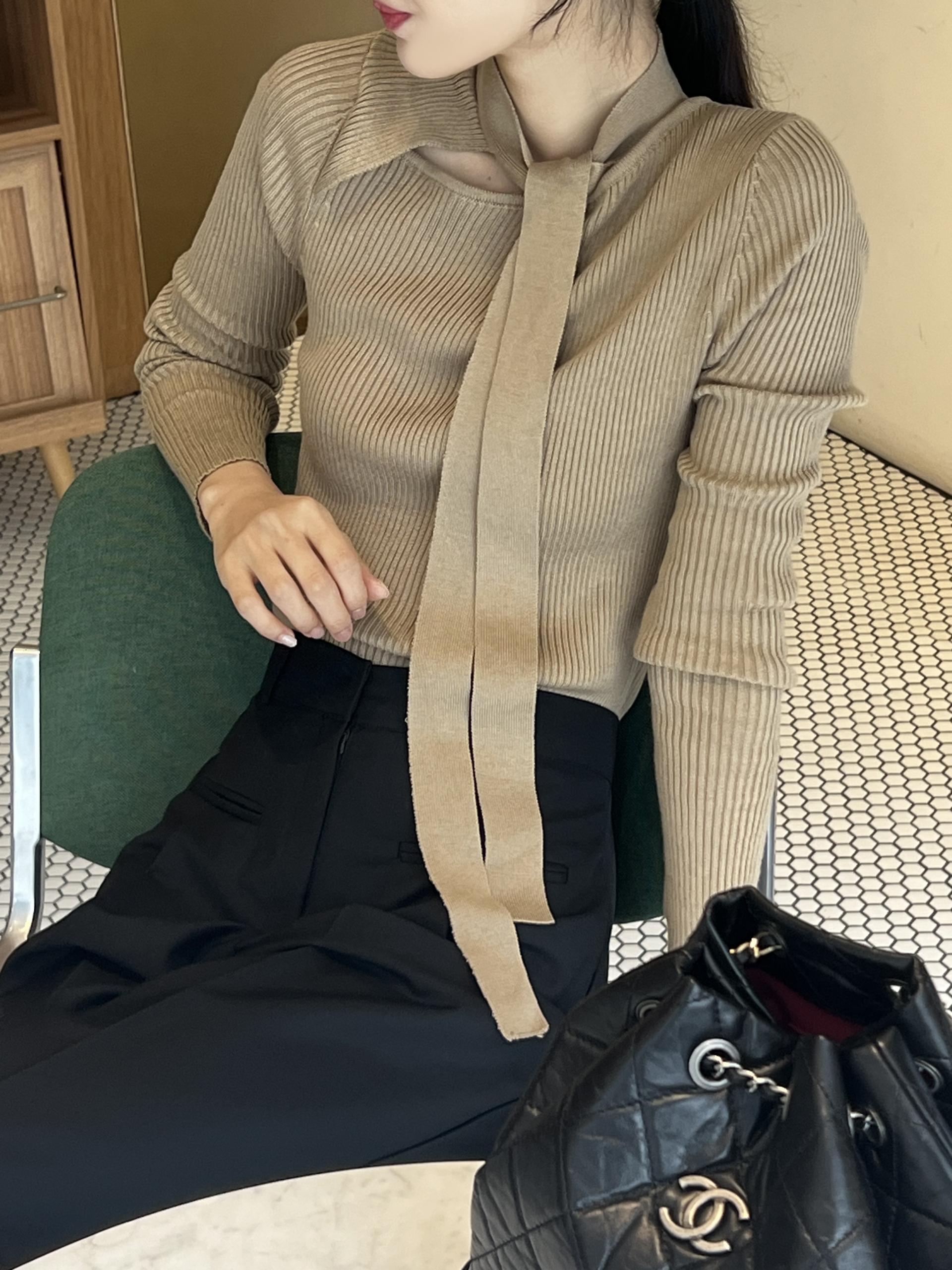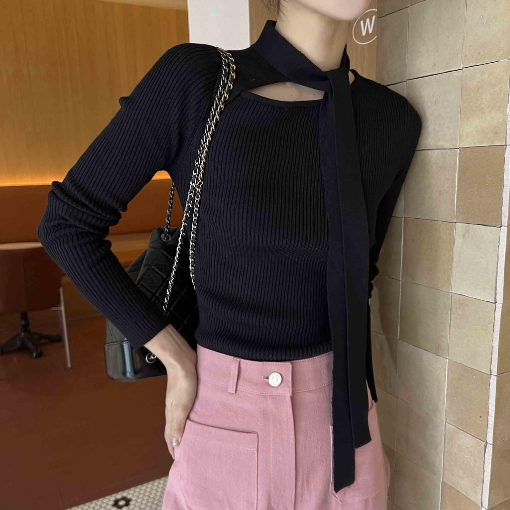 초커 느낌의 타이가 부착된 형태라 스타일링하기 쉽고, 깔끔한 무지 니트라 다양하게 코디하기 좋으실 거예요. 아우터 속 이너 니트로도 좋고, 단독으로도 충분한 존재감의 니트 티셔츠입니다.