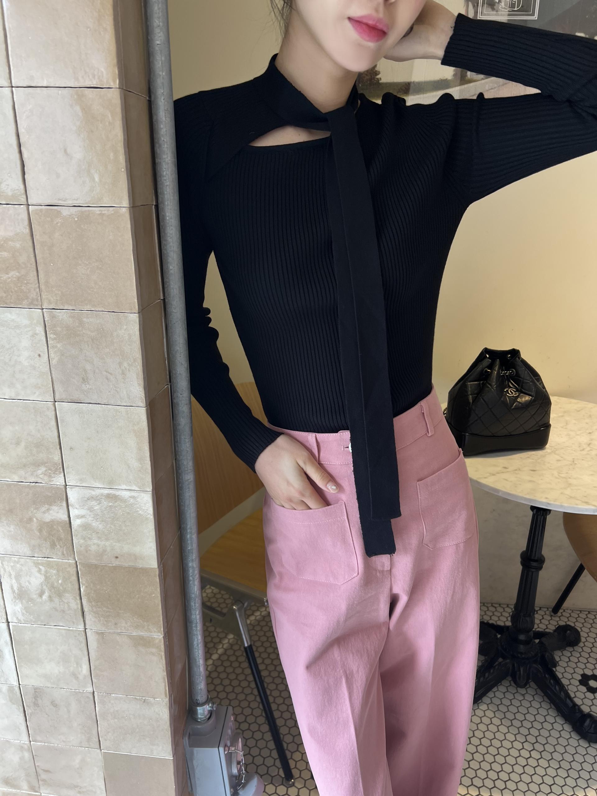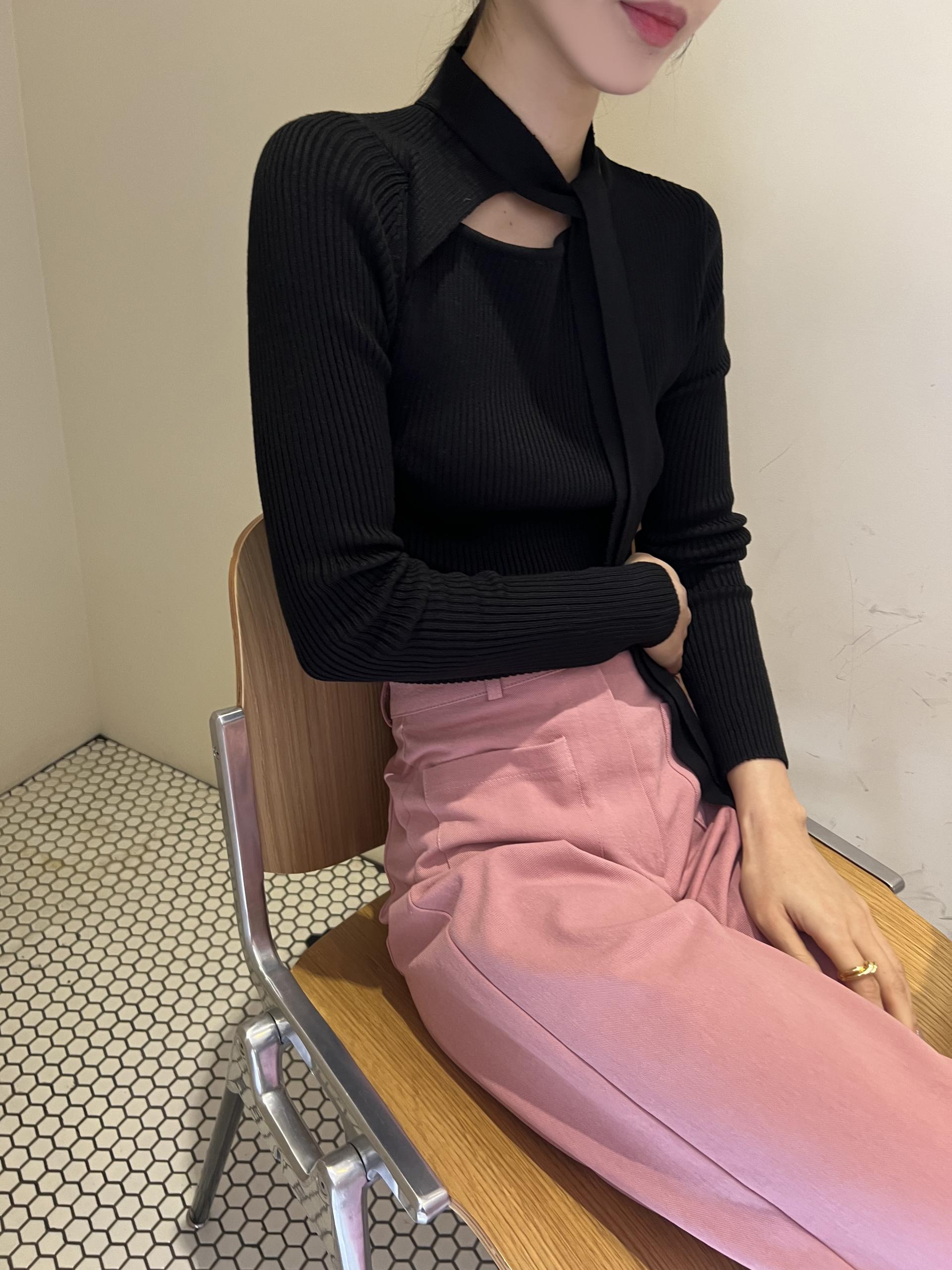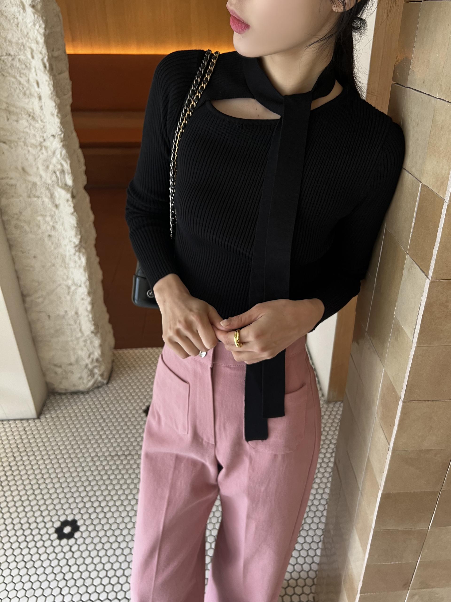 높은 텐션감으로 쫀쫀하고 슬림하게 피팅되는 타이 골지 니트입니다.