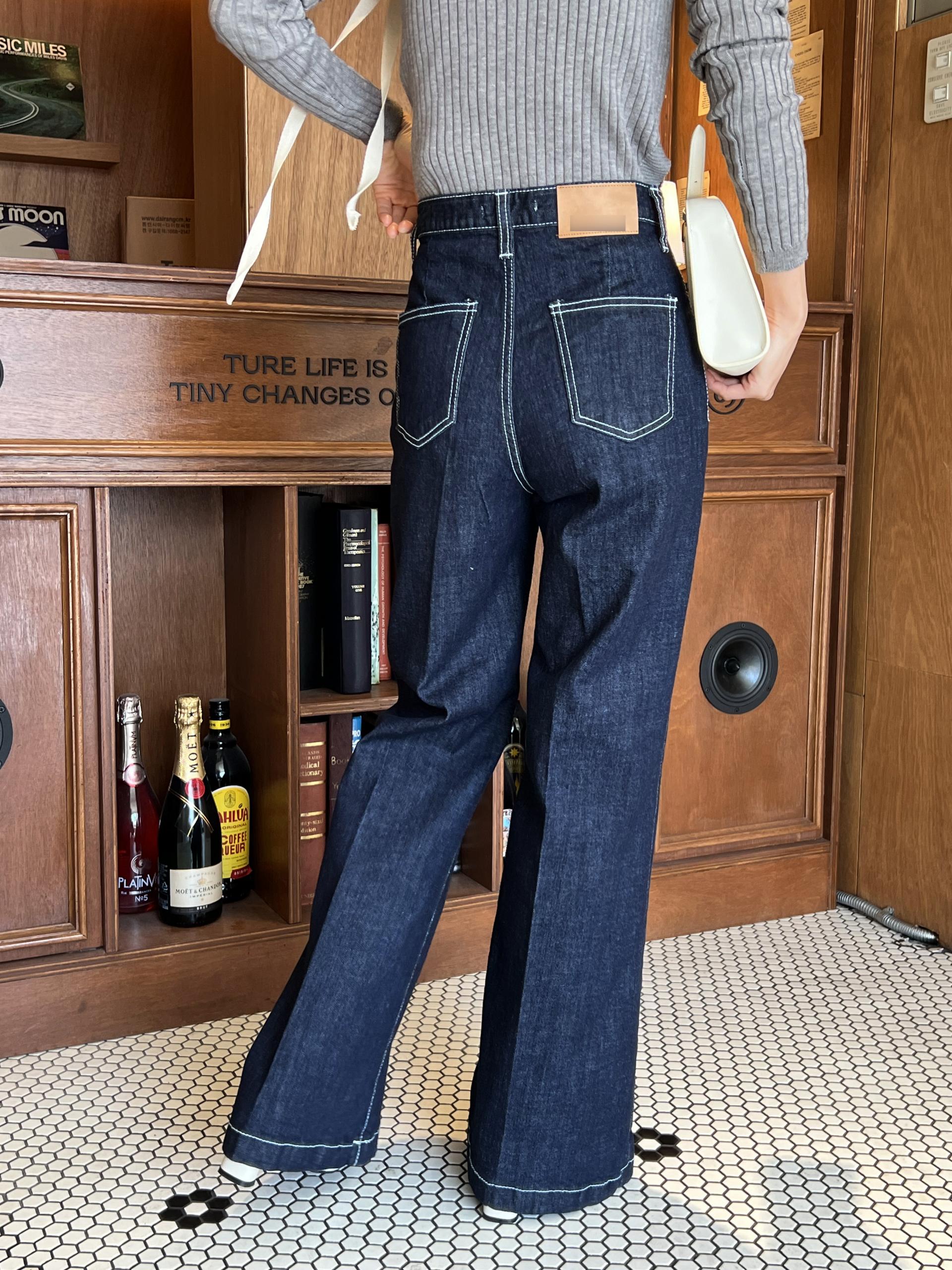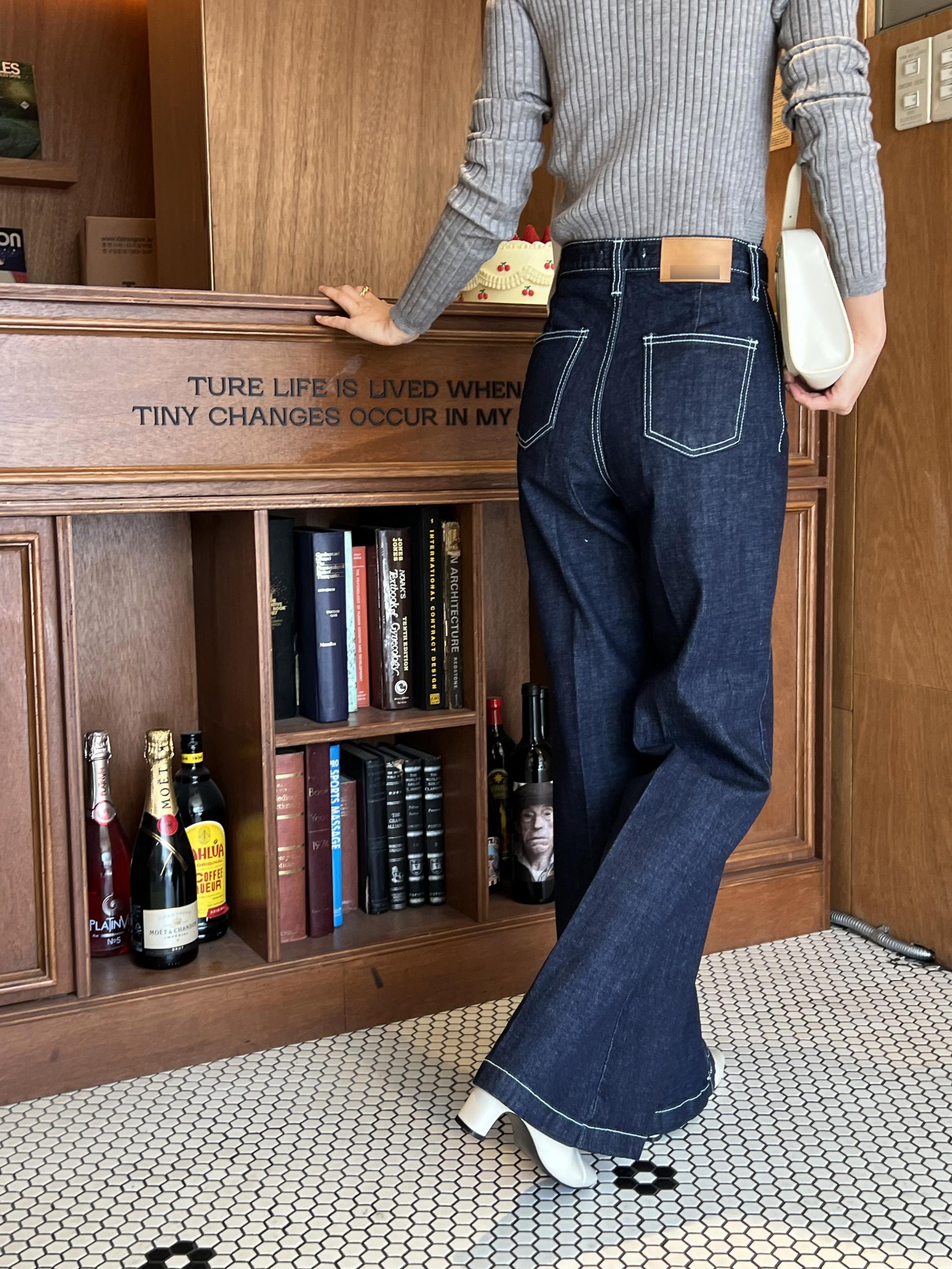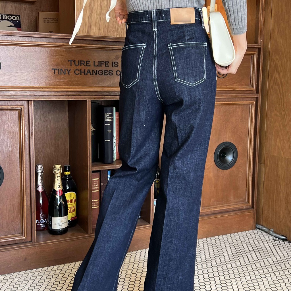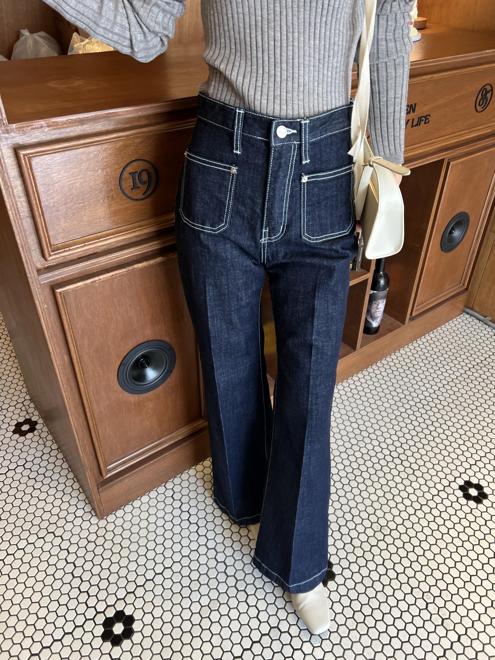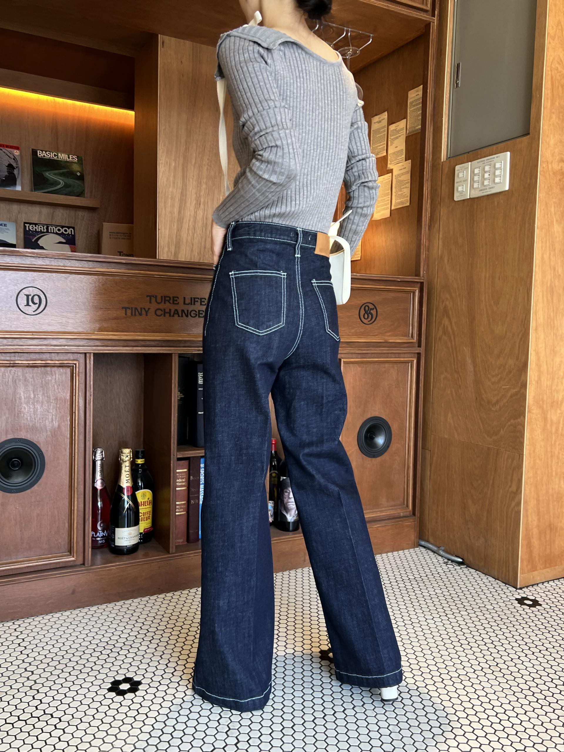 부츠컷 핏과 와이드 핏이 적절히 섞인, 완벽한 핏의 생지 데님 팬츠입니다.