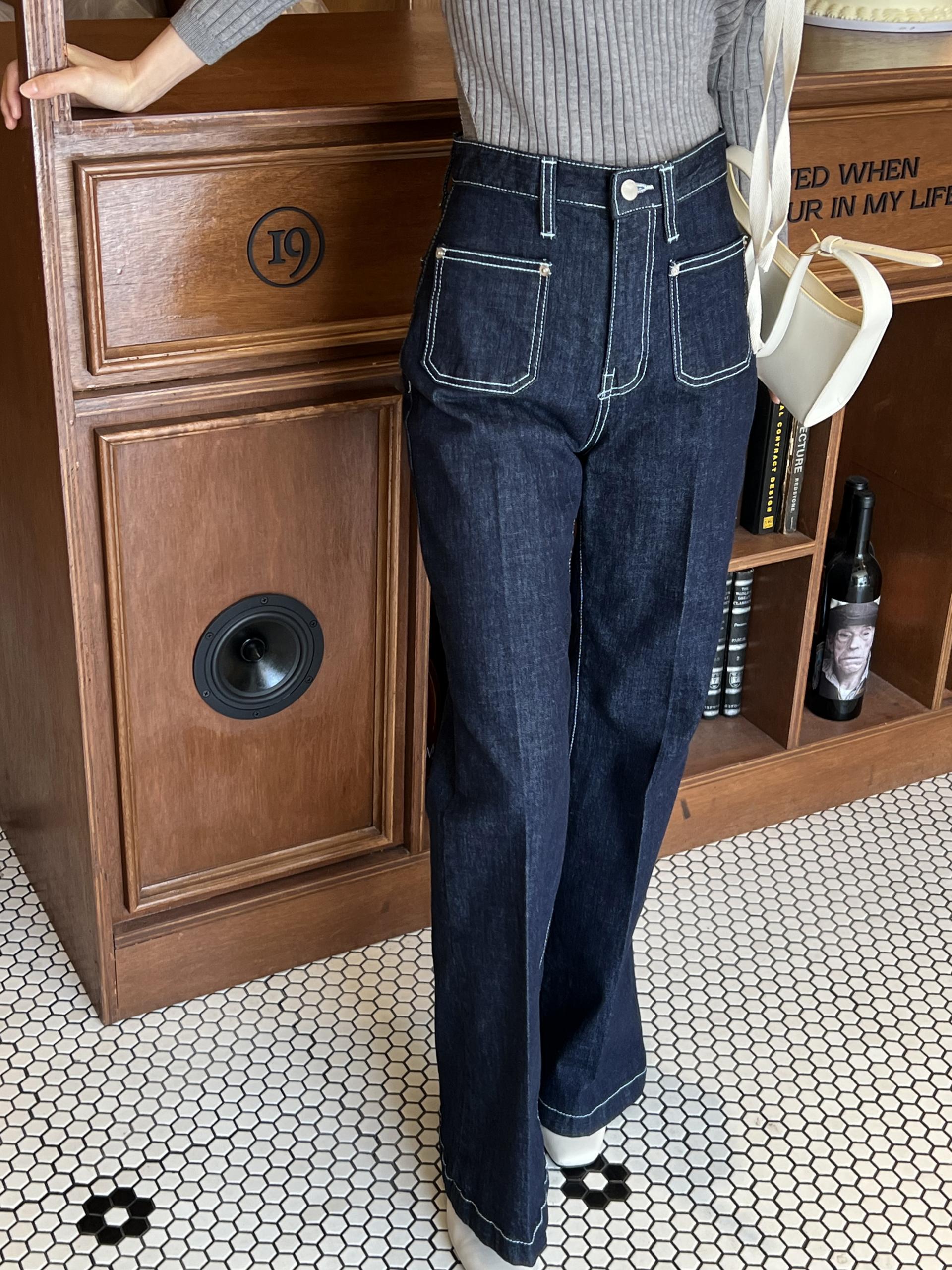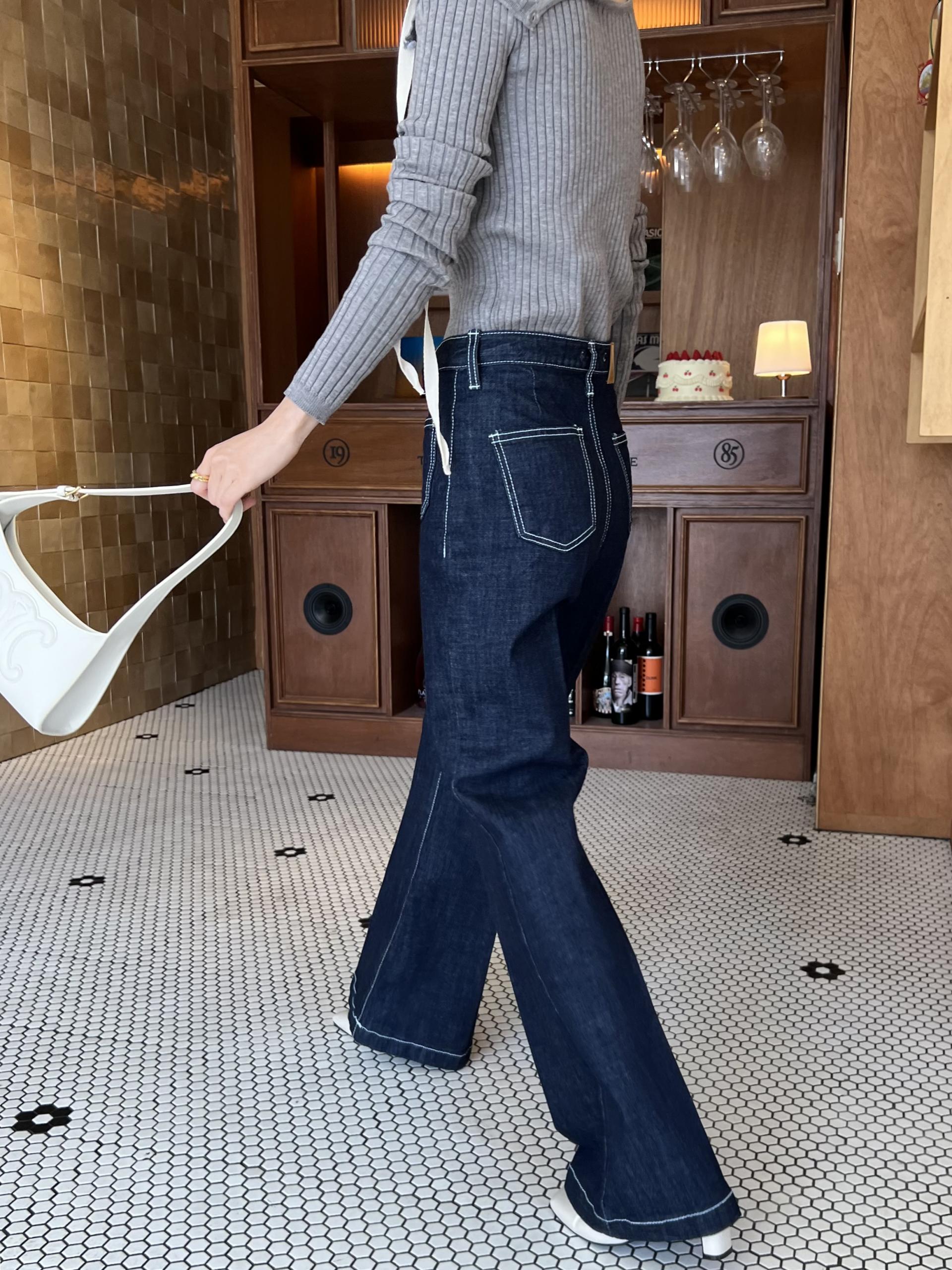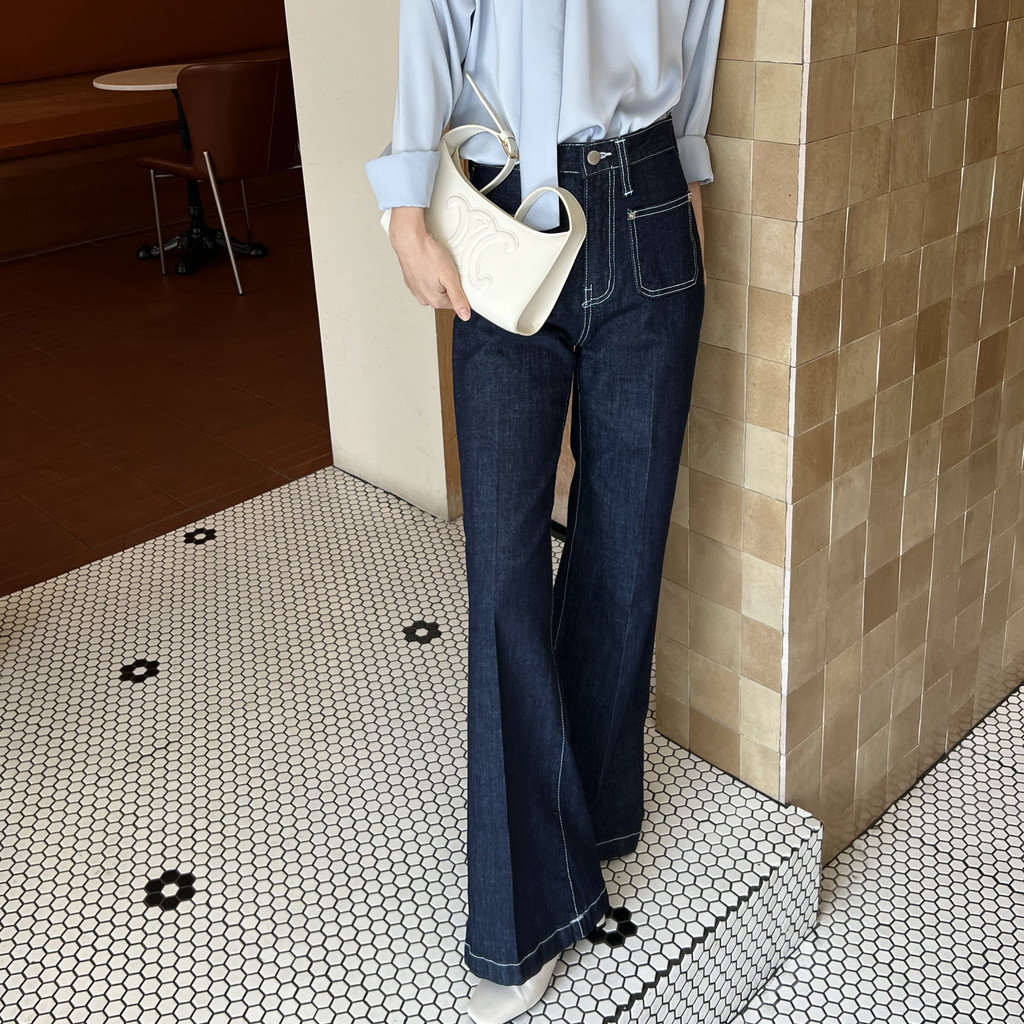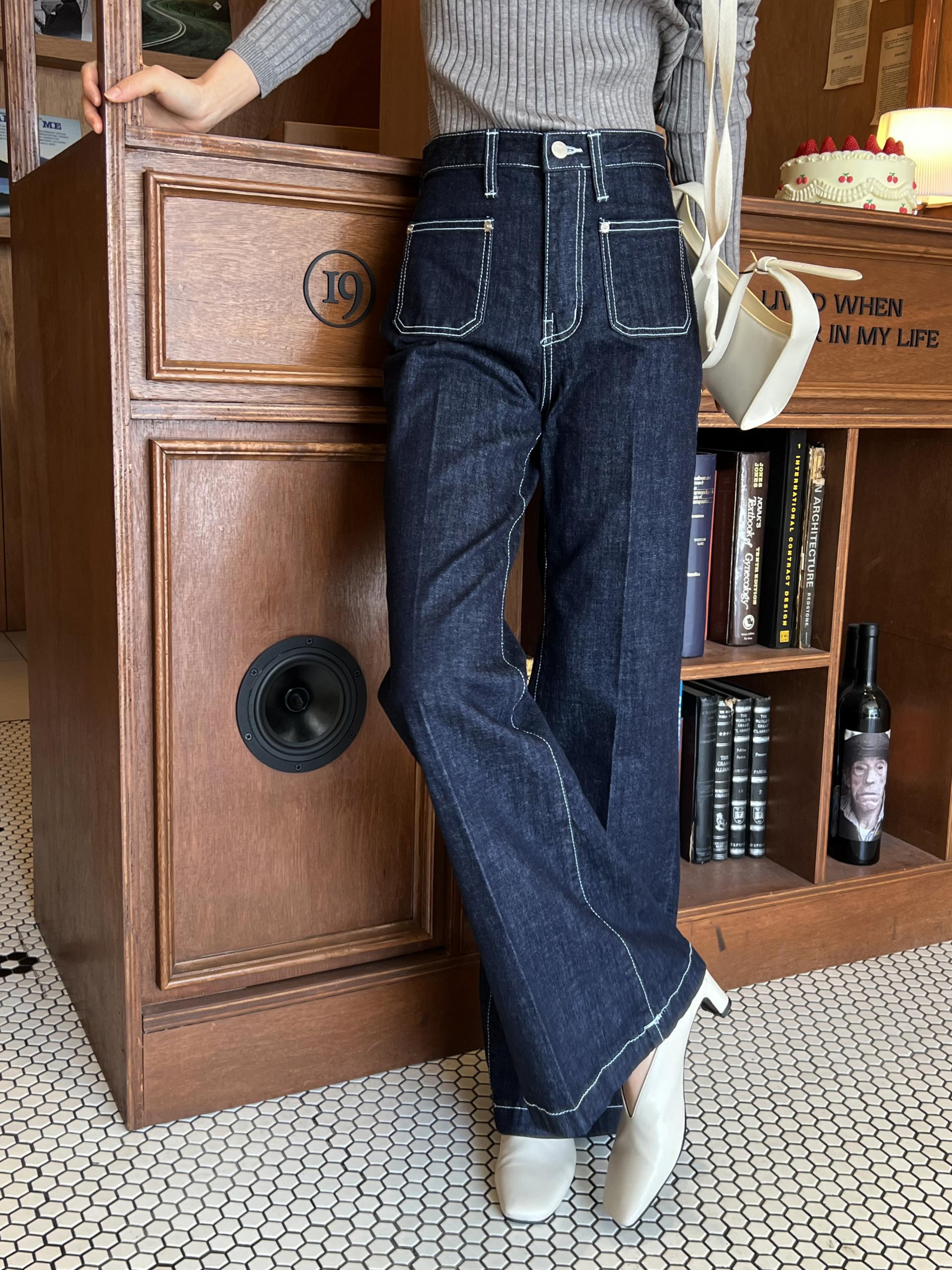 부츠컷 핏과 와이드 핏이 적절히 섞인, 완벽한 핏의 생지 데님 팬츠입니다.