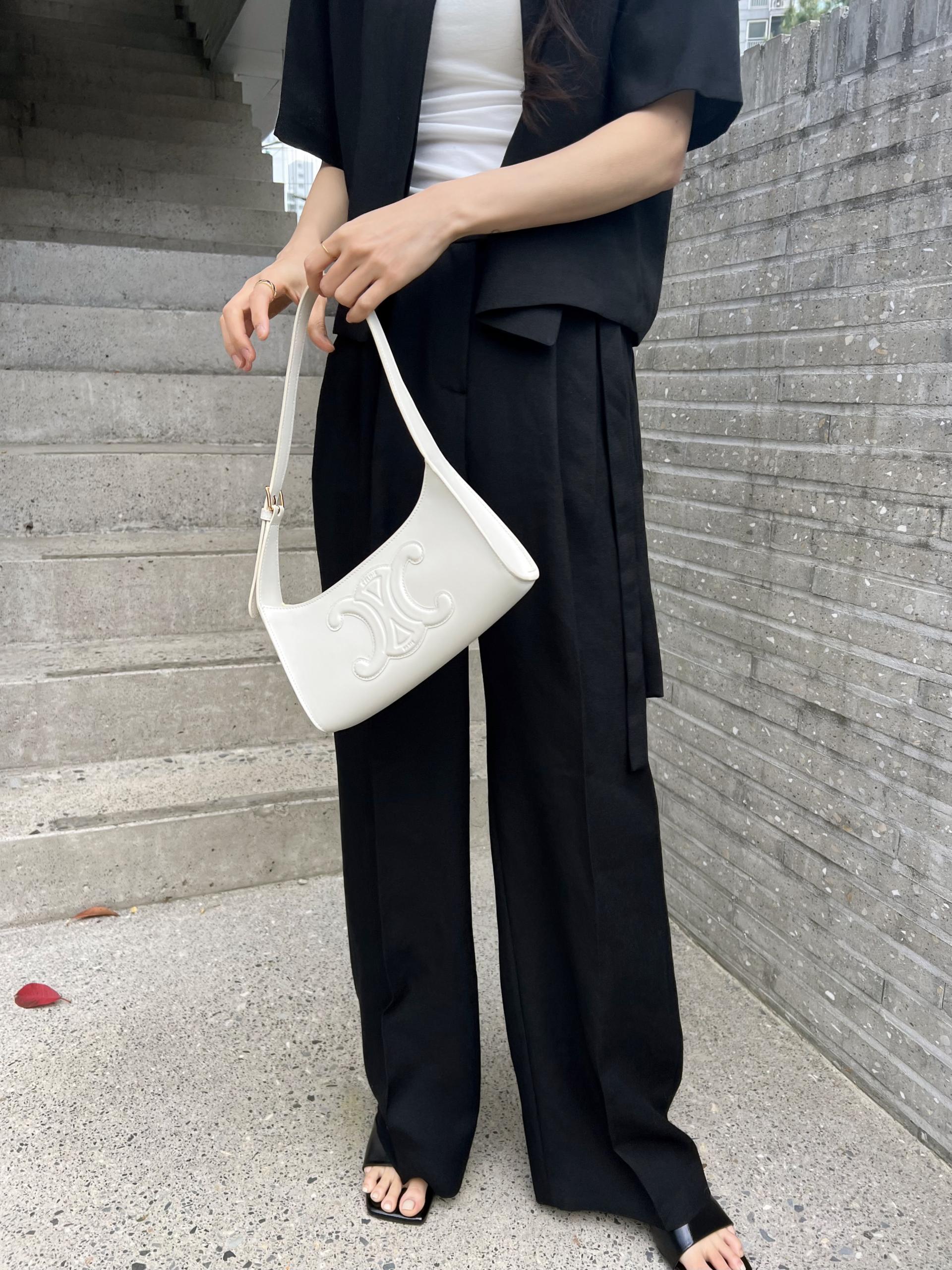 굵은 웨이스트 밴드로 허리가 가늘어 보이고, 부착된 스트랩을 사이드로 묶어 연출할 수 있습니다. 심플한 디자인이지만 매력적인 디테일로 밋밋한 느낌이 없어 좋았어요.