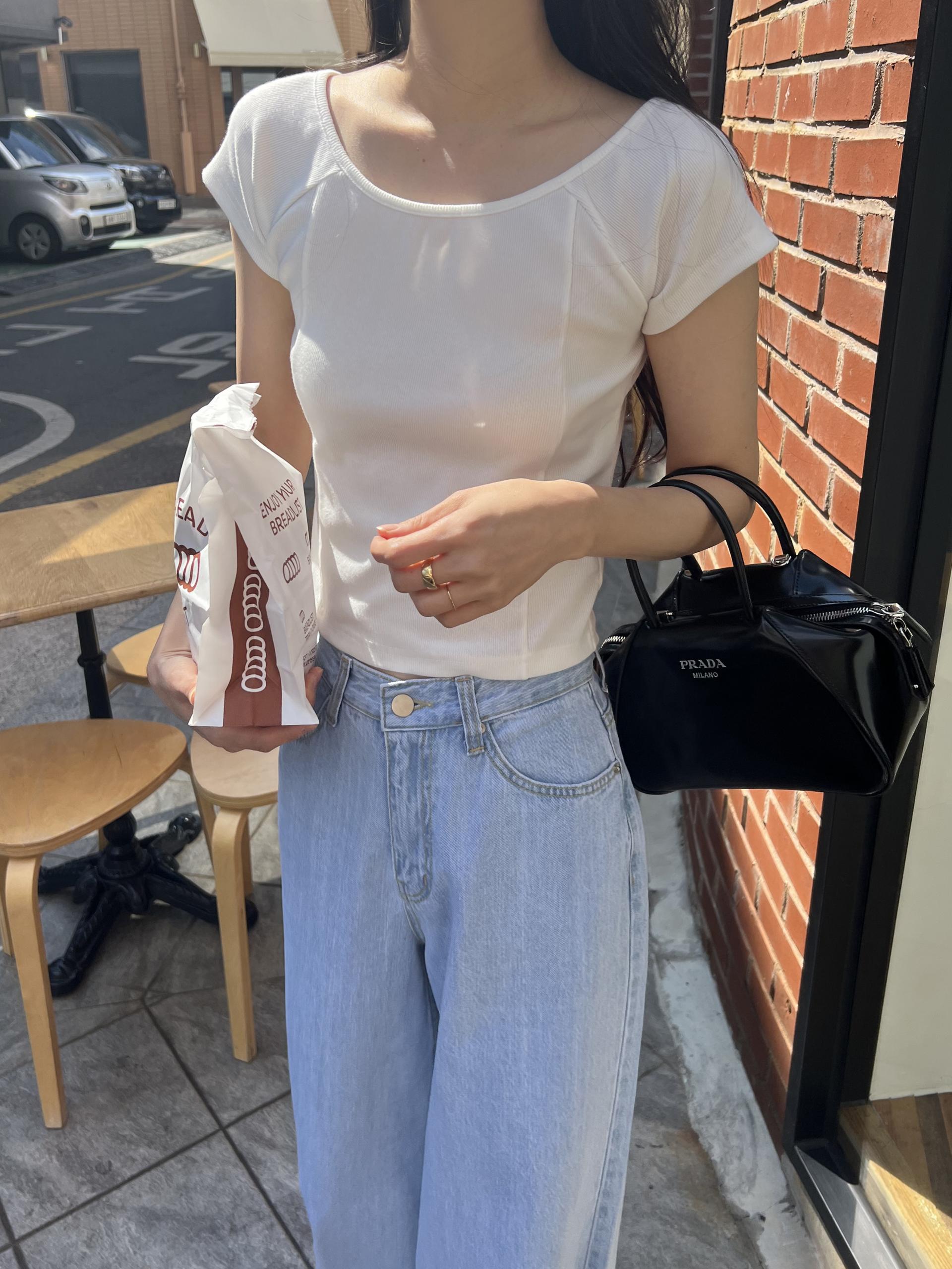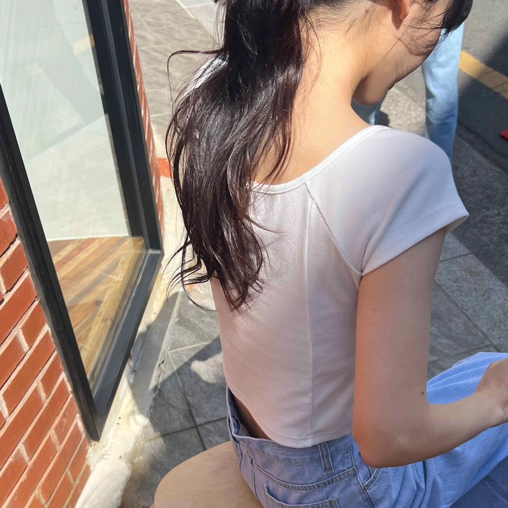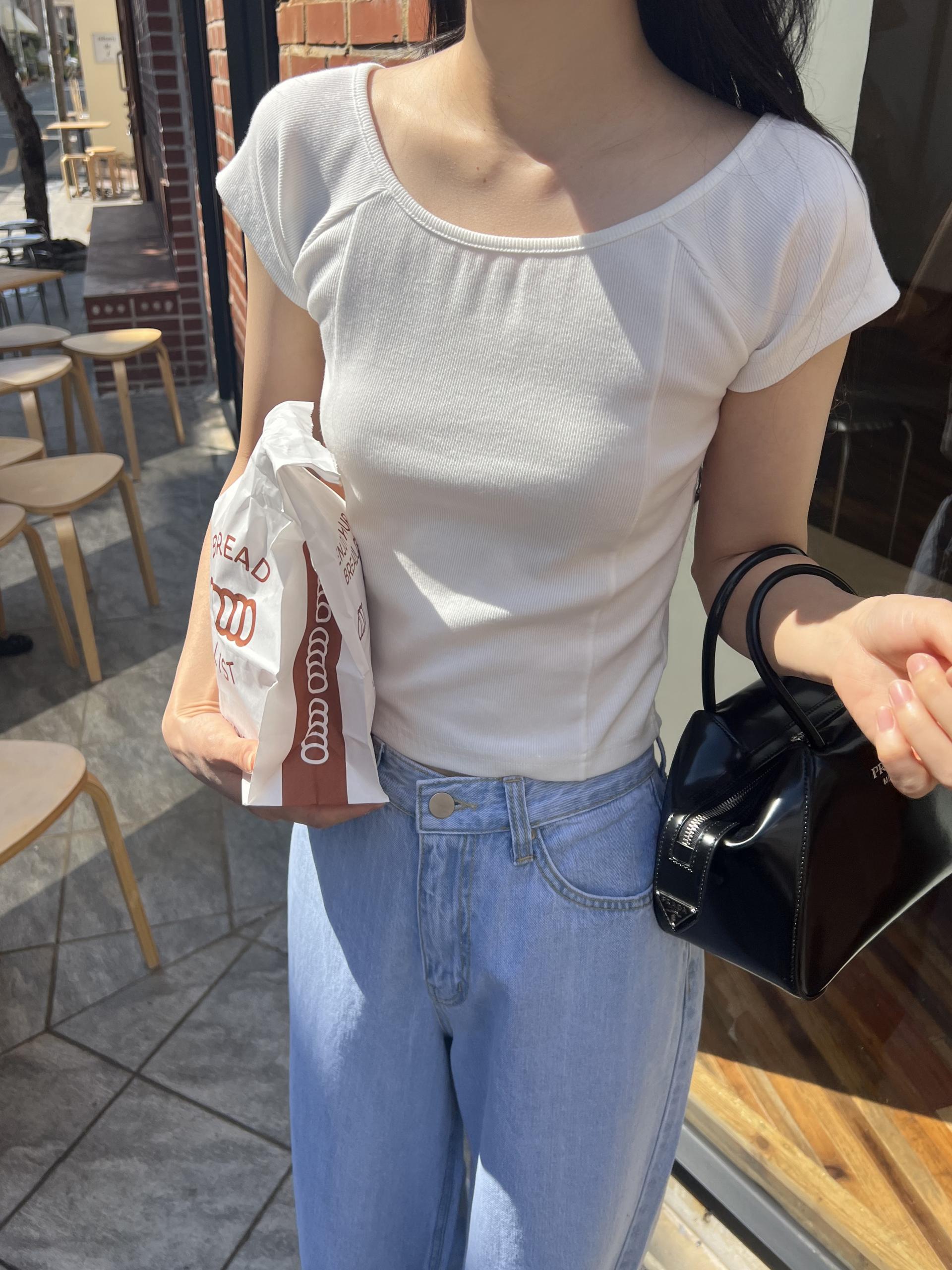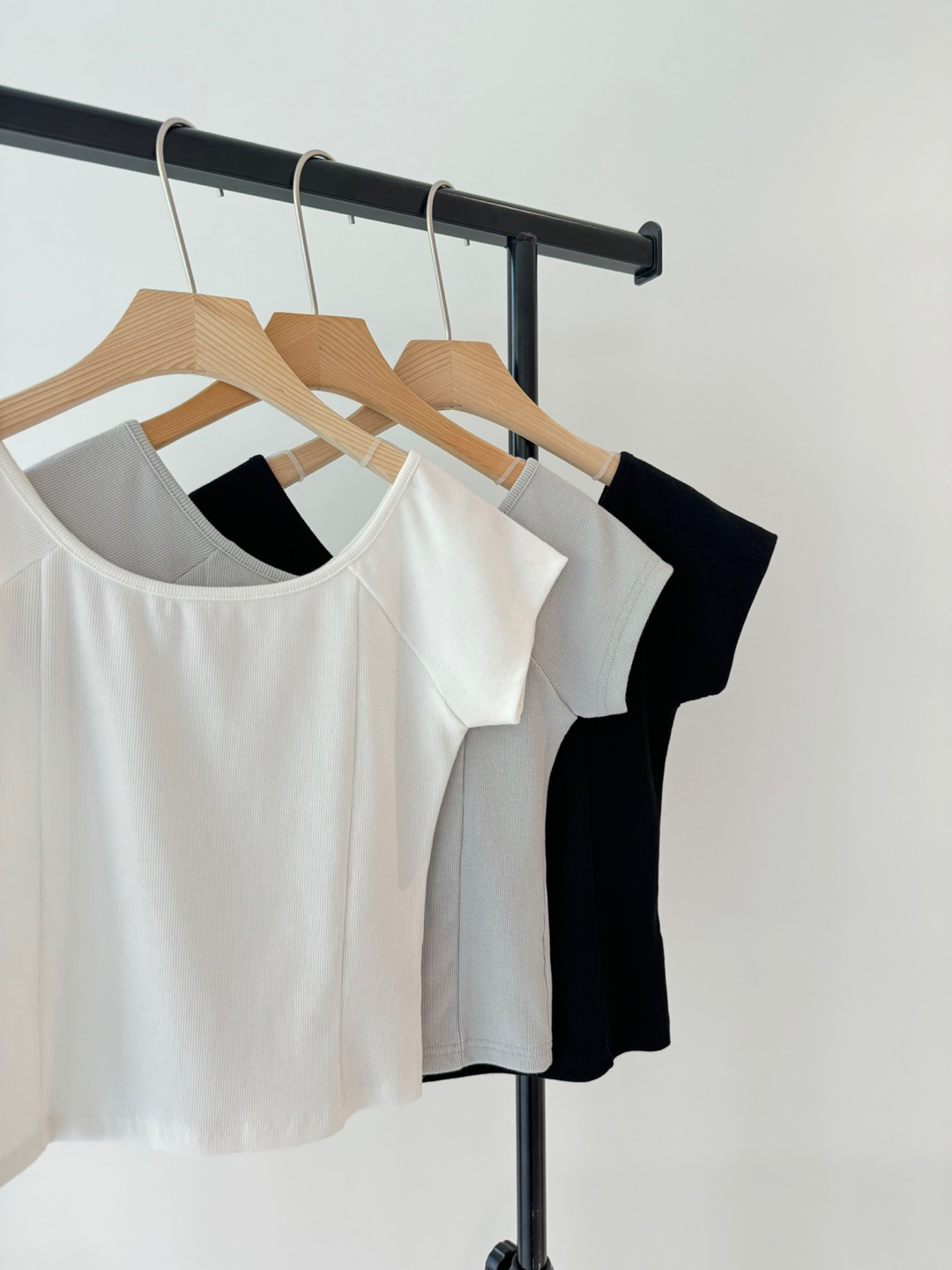 어깨 선 없이 자연스럽게 이어지는 소매 라인과 슬림한 핏, 크롭 기장으로 전체적인 밸런스가 좋은 탑이에요.