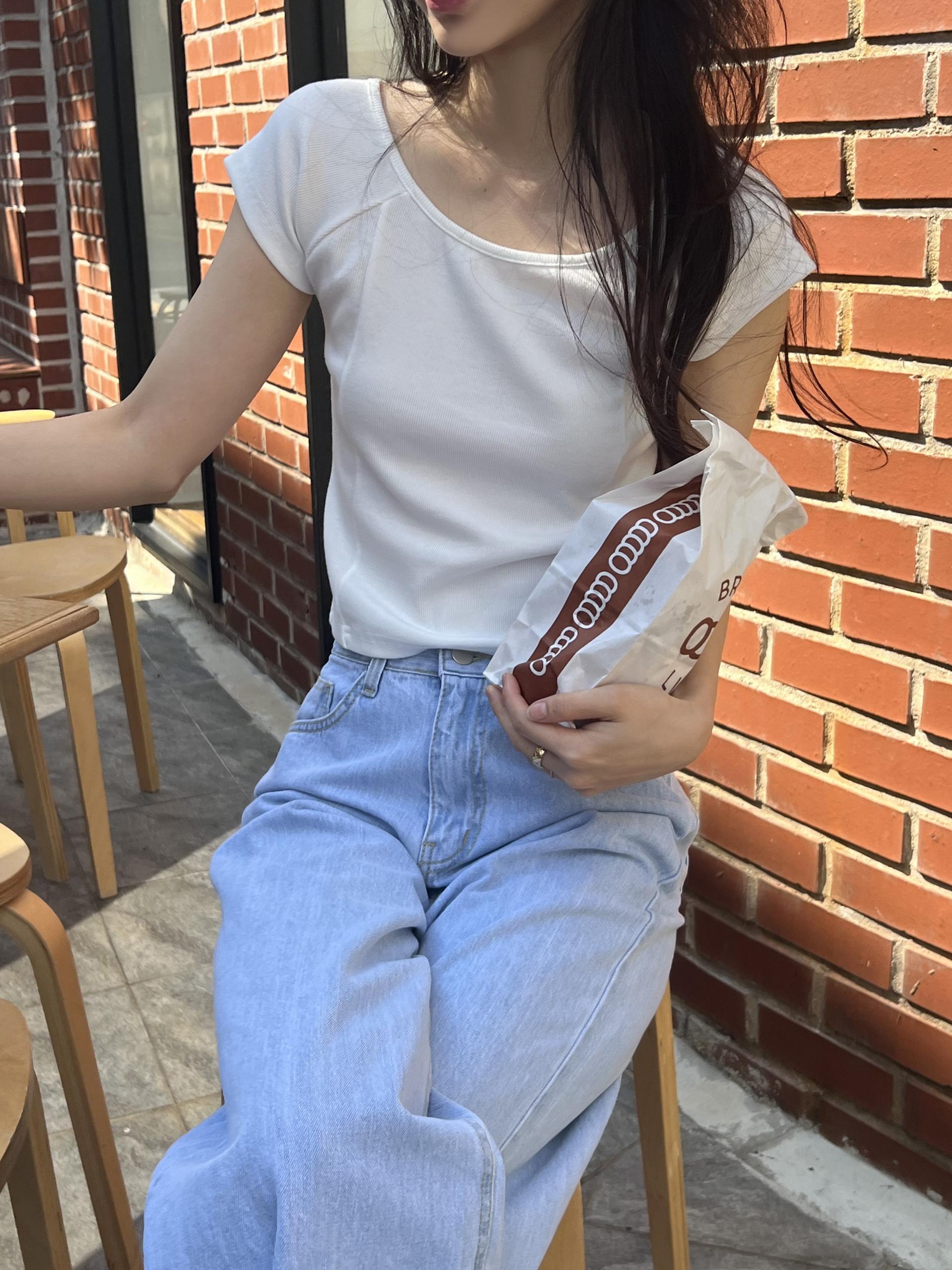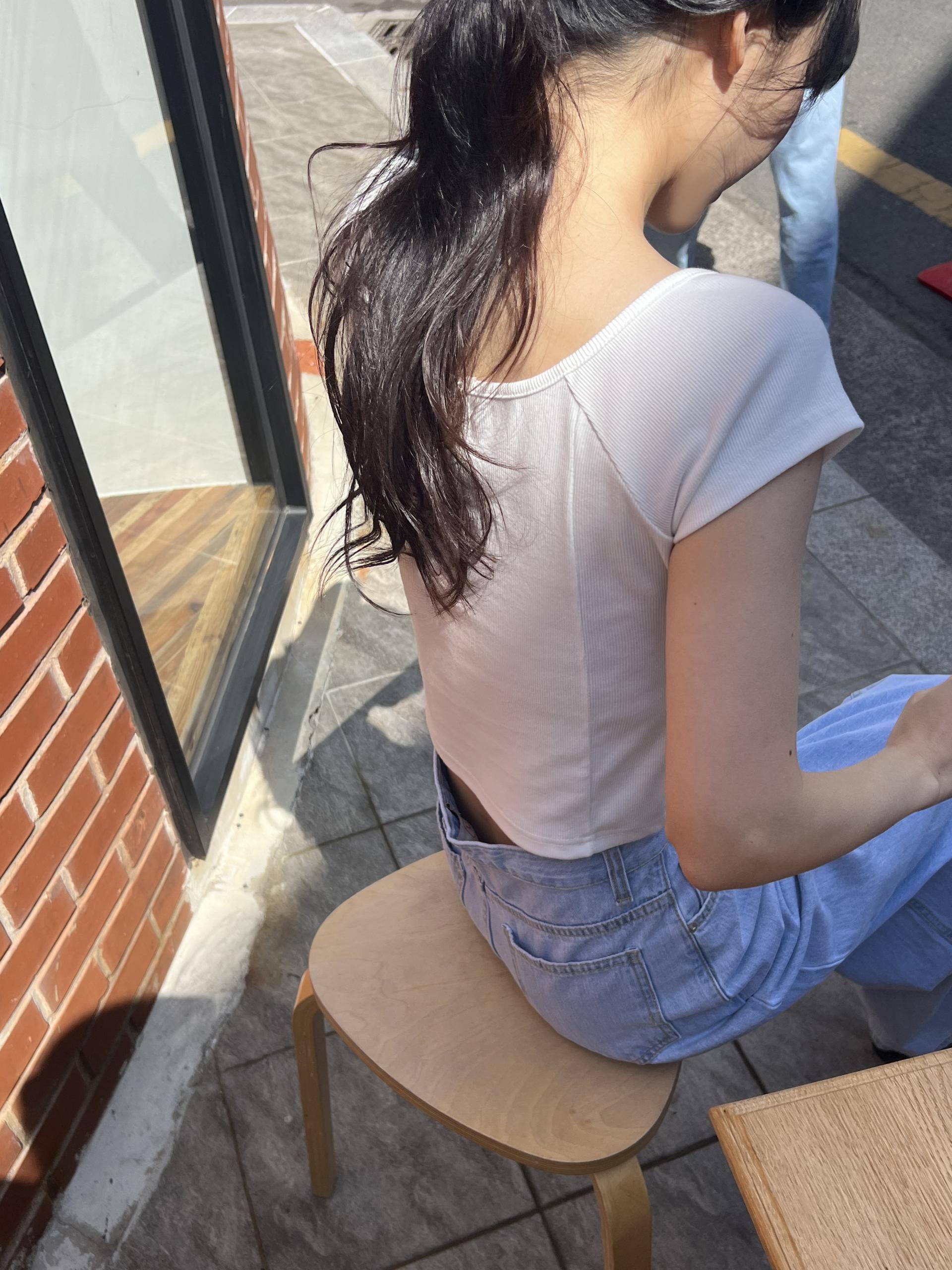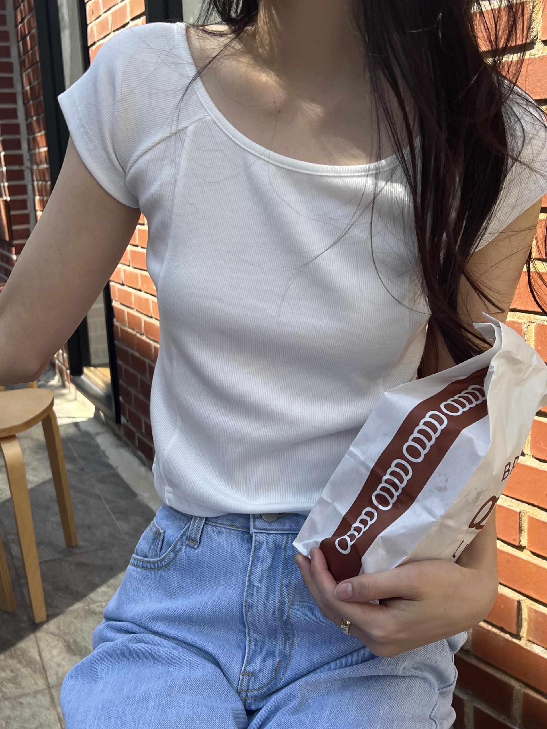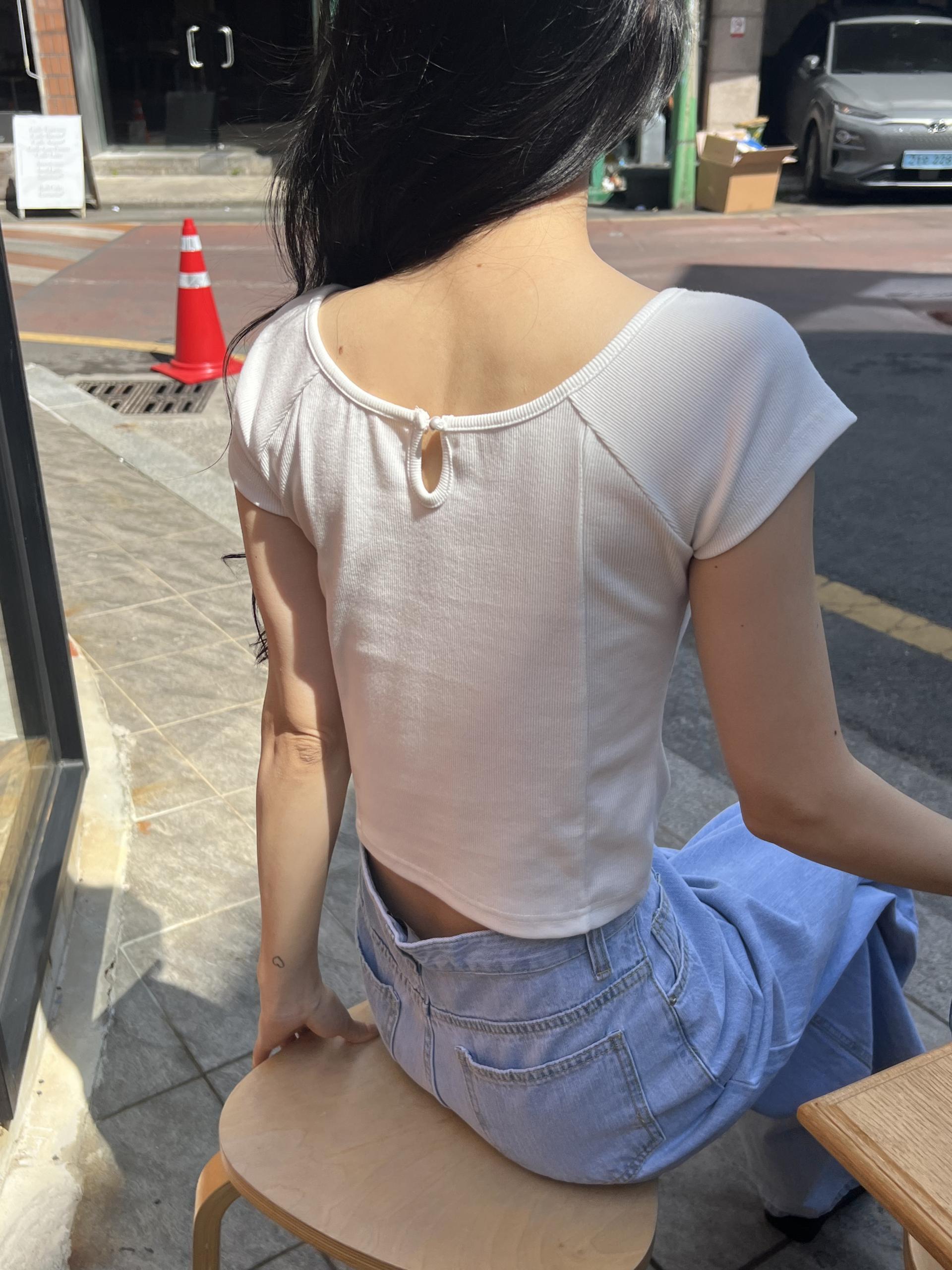 어깨 선 없이 자연스럽게 이어지는 소매 라인과 슬림한 핏, 크롭 기장으로 전체적인 밸런스가 좋은 탑이에요.