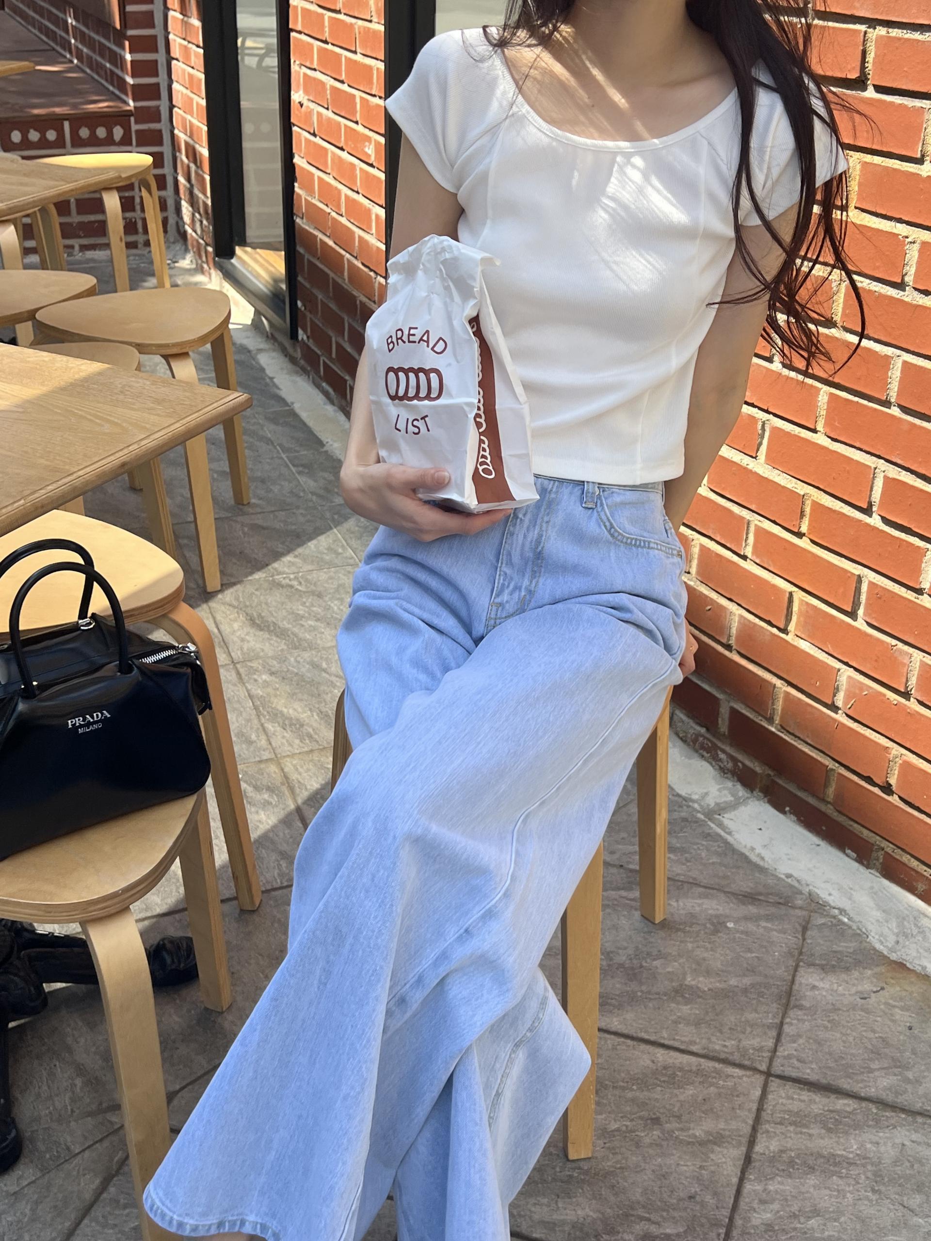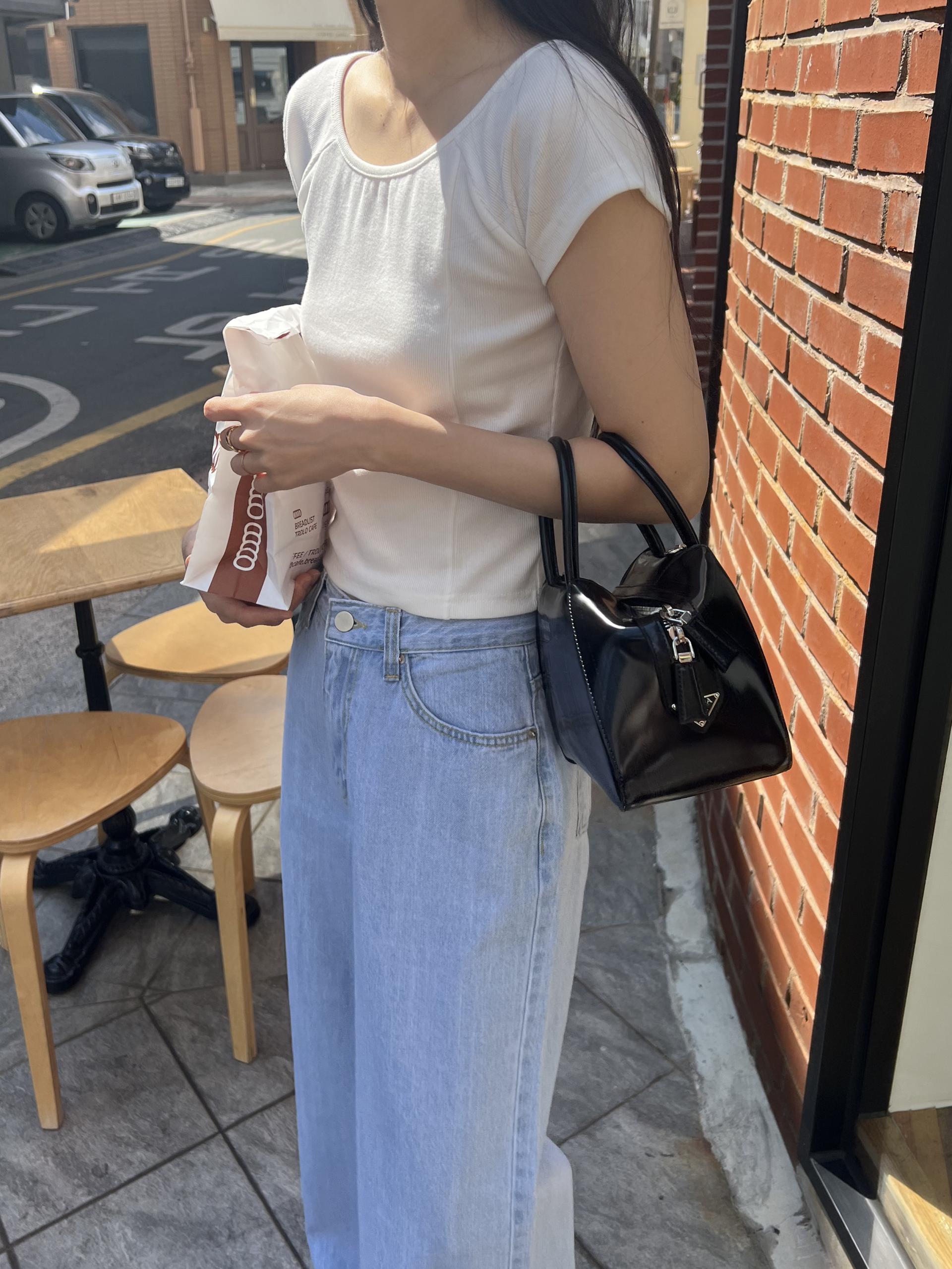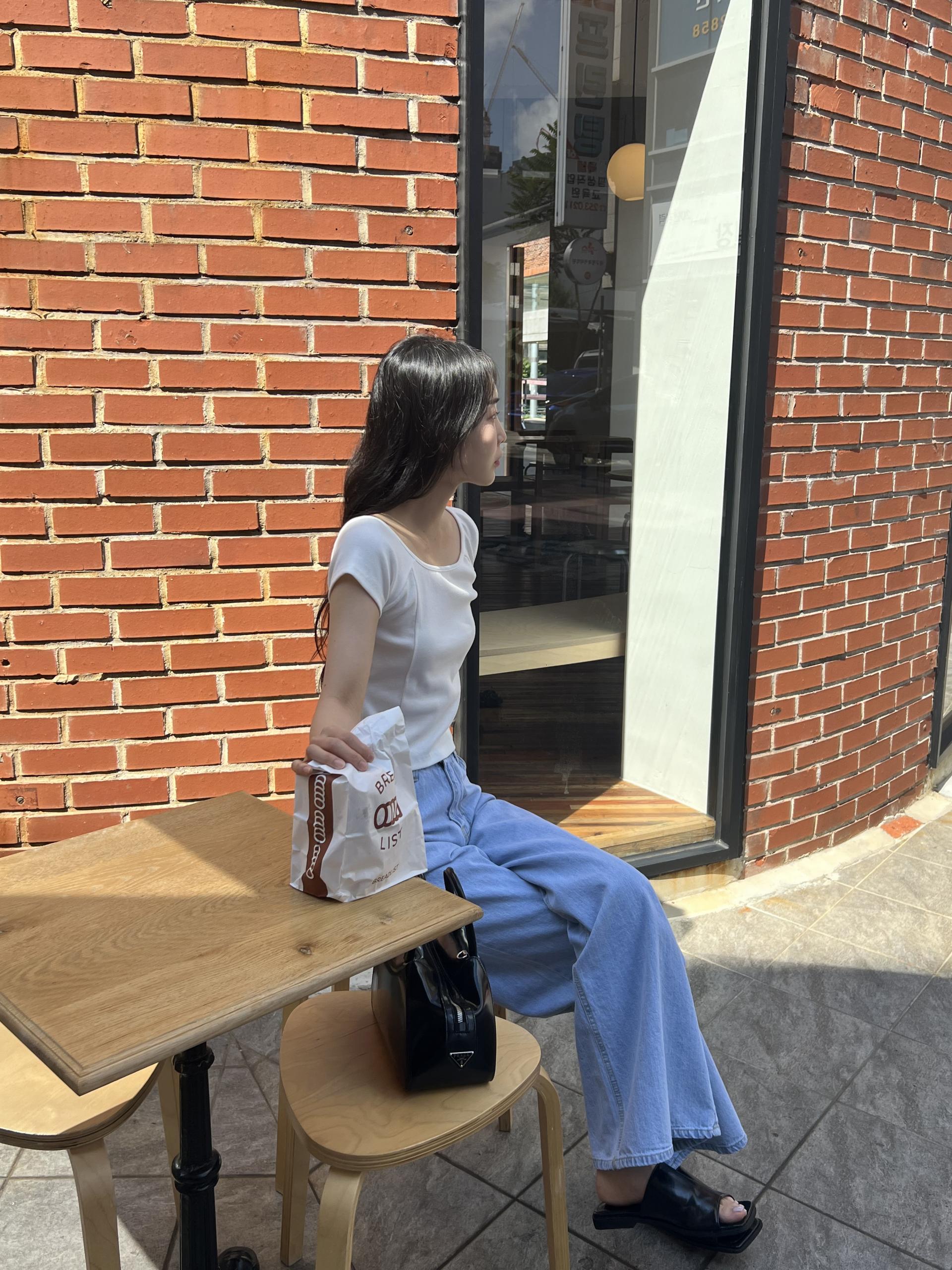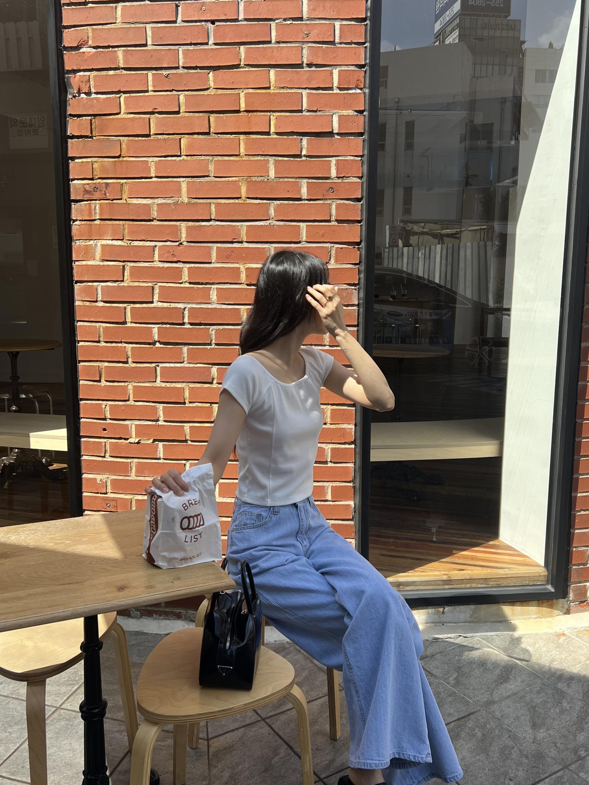 어깨 선 없이 자연스럽게 이어지는 소매 라인과 슬림한 핏, 크롭 기장으로 전체적인 밸런스가 좋은 탑이에요.