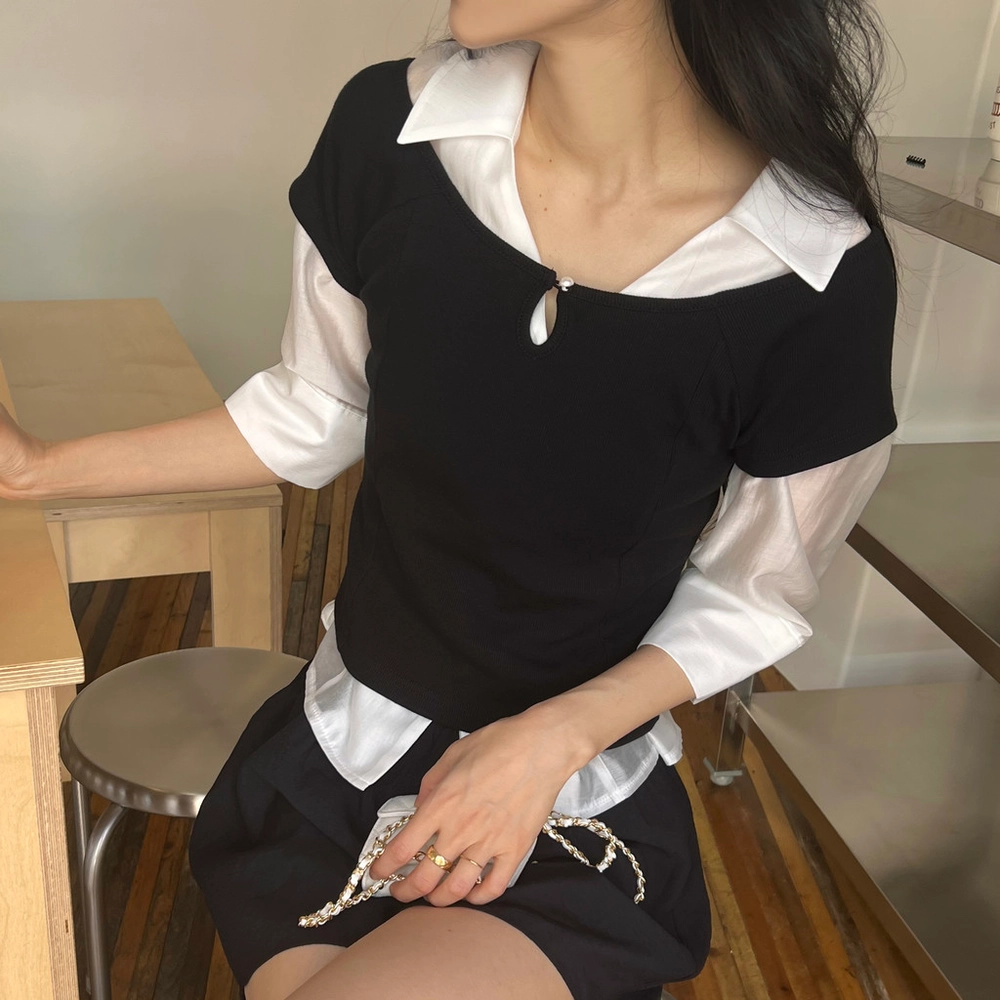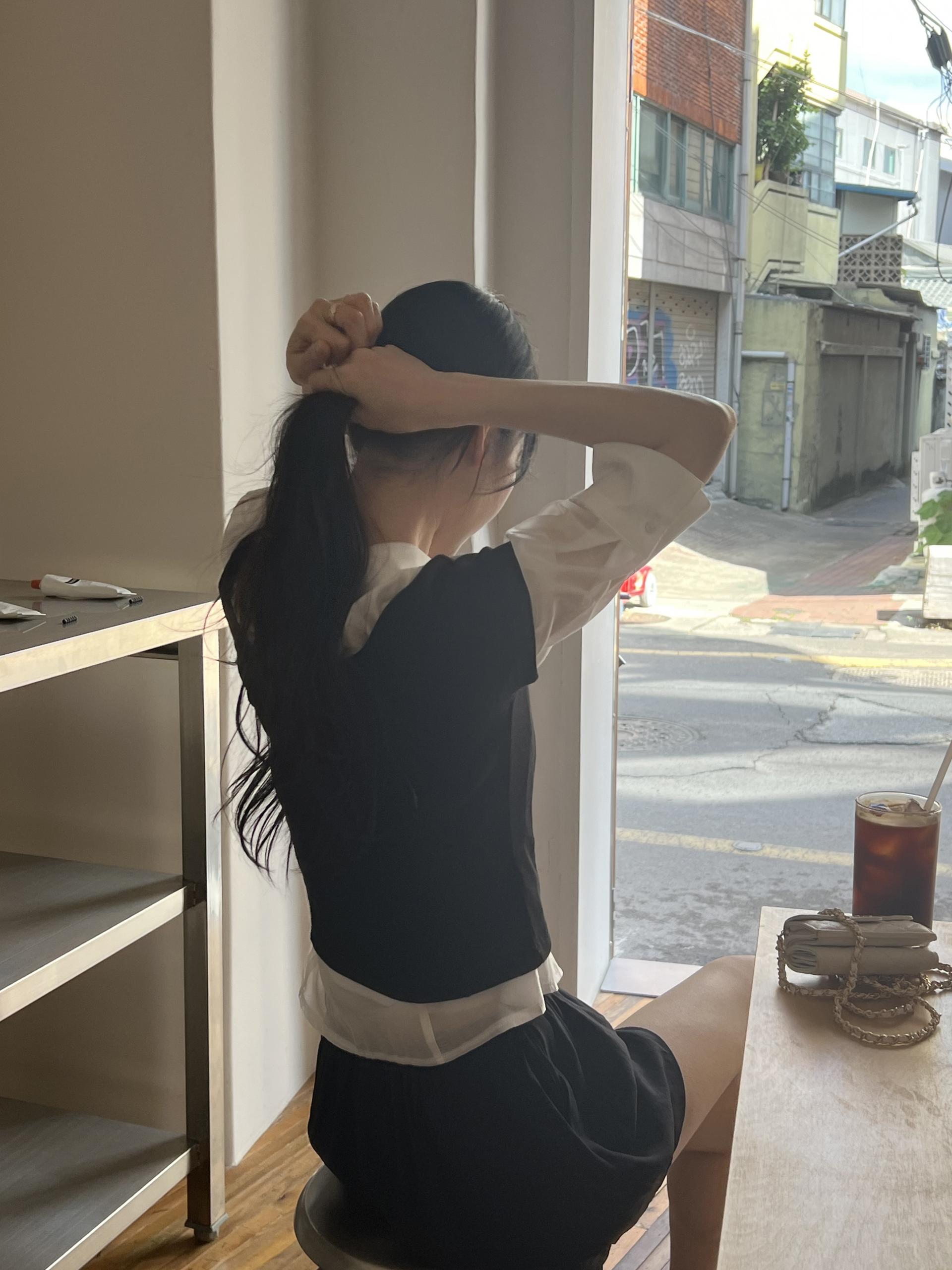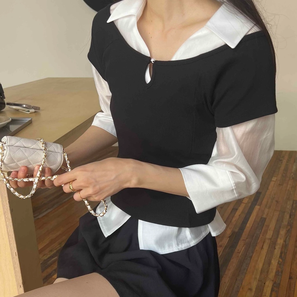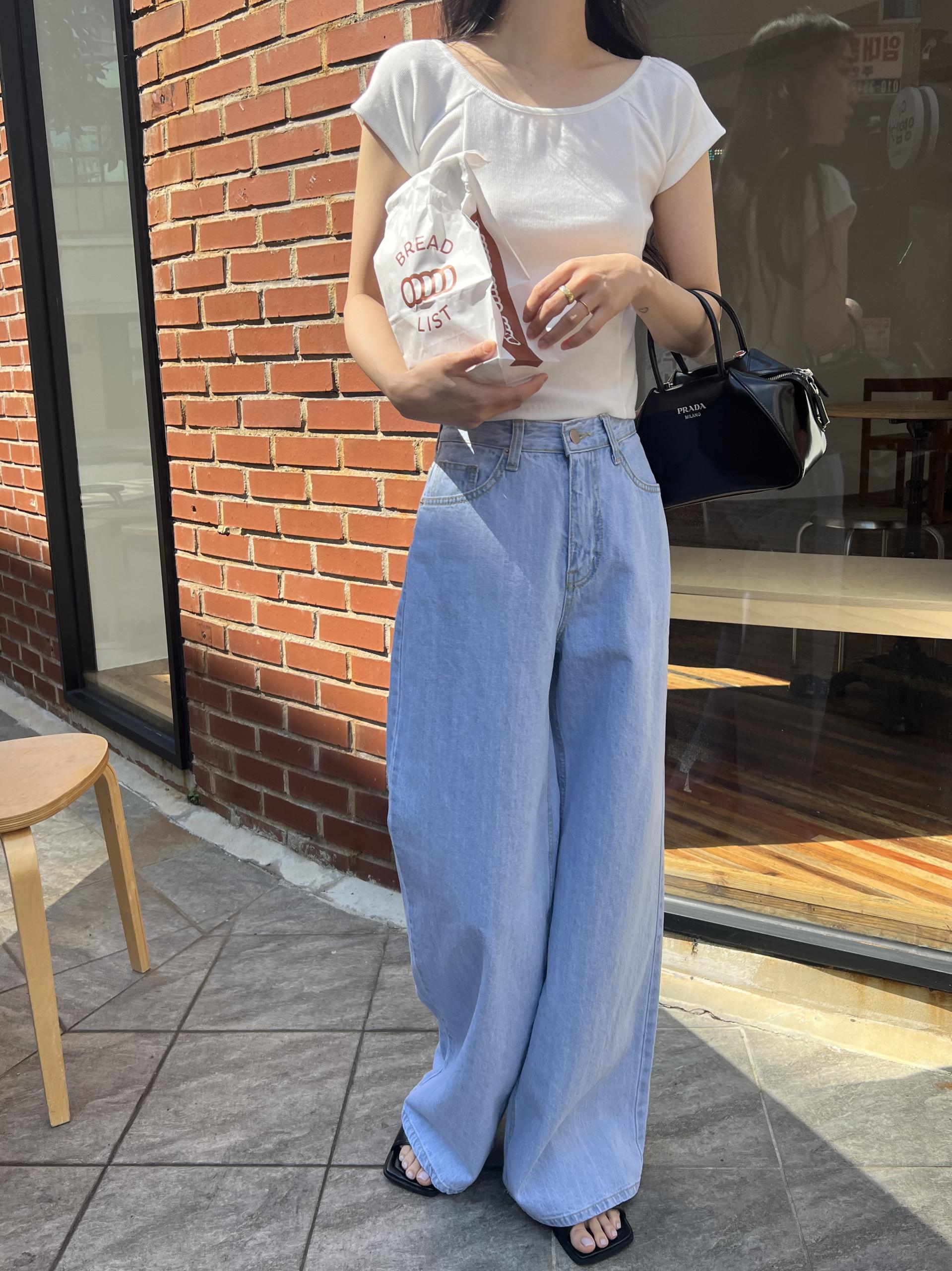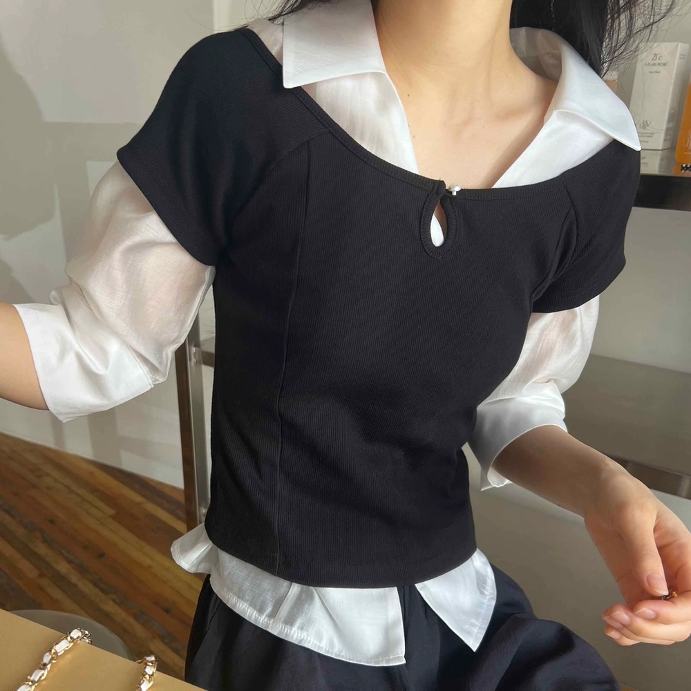 어깨 선 없이 자연스럽게 이어지는 소매 라인과 슬림한 핏, 크롭 기장으로 전체적인 밸런스가 좋은 탑이에요.