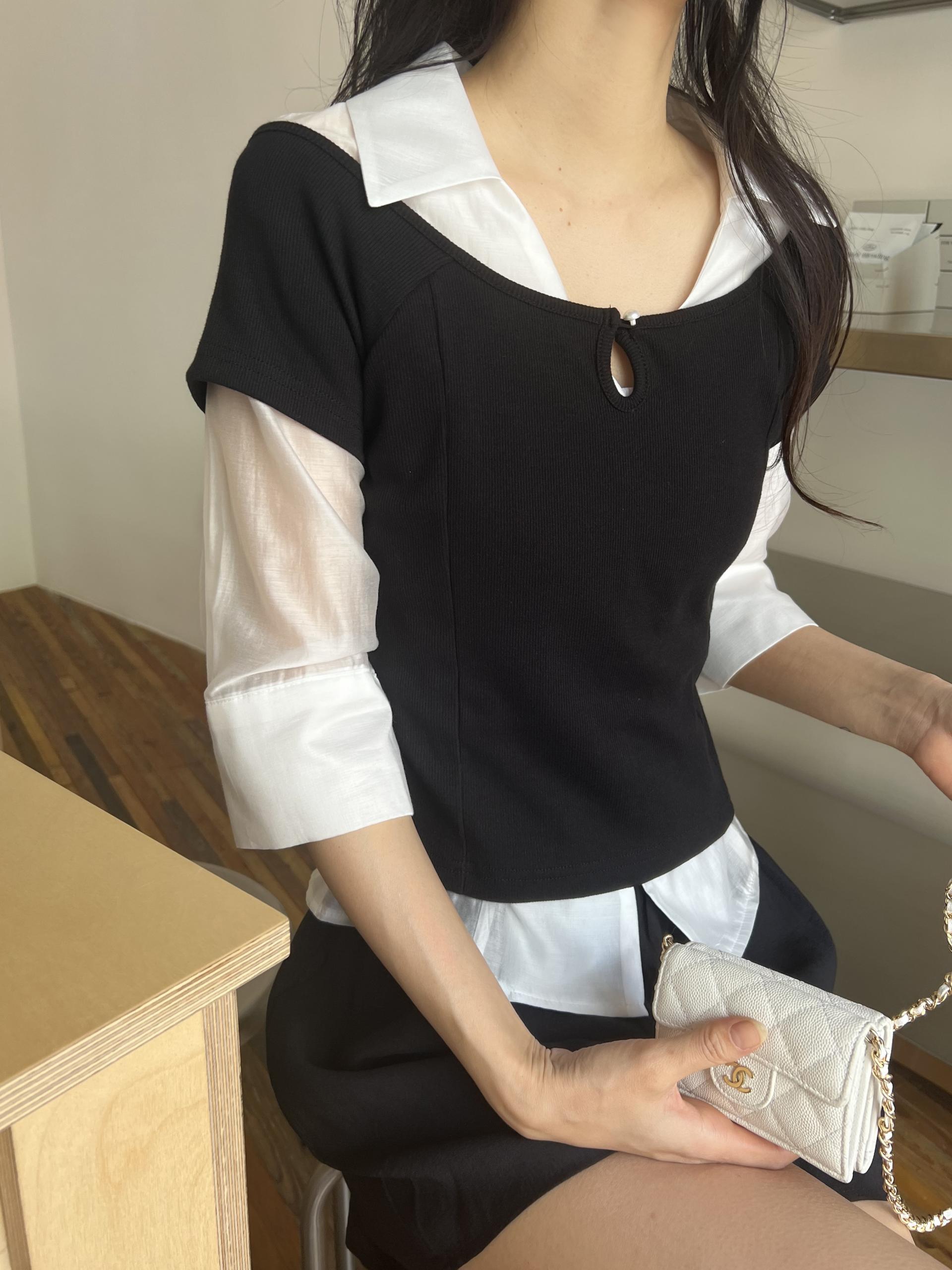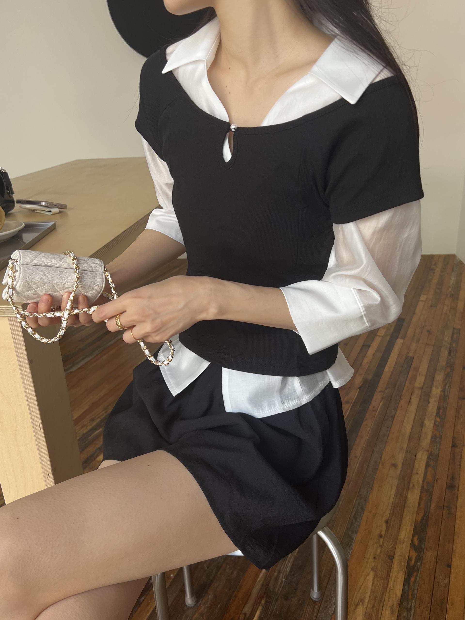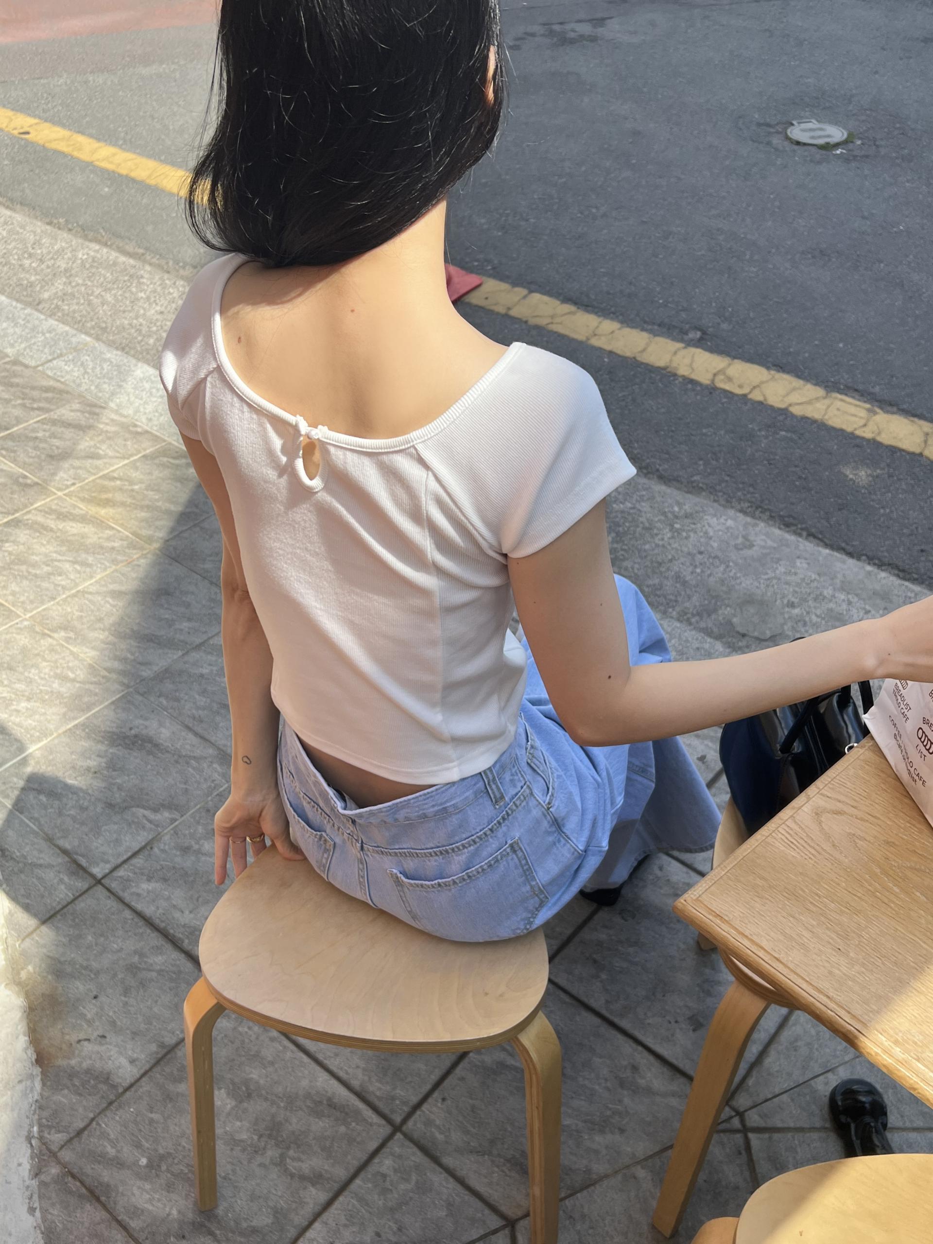 무지 디테일 방향과 진주와 작은 홀이 있는 방향 두 면 모두 활용할 수 있으며, 세미 오프숄더넥, 유넥 두 가지 형태로도 착용 가능합니다. 다양하게 연출할 수 있어 활용도가 좋은 티셔츠에요. 단독으로 입어도 좋고, 블랙 모델컷과 같이 레이어드하기에도 좋습니다.