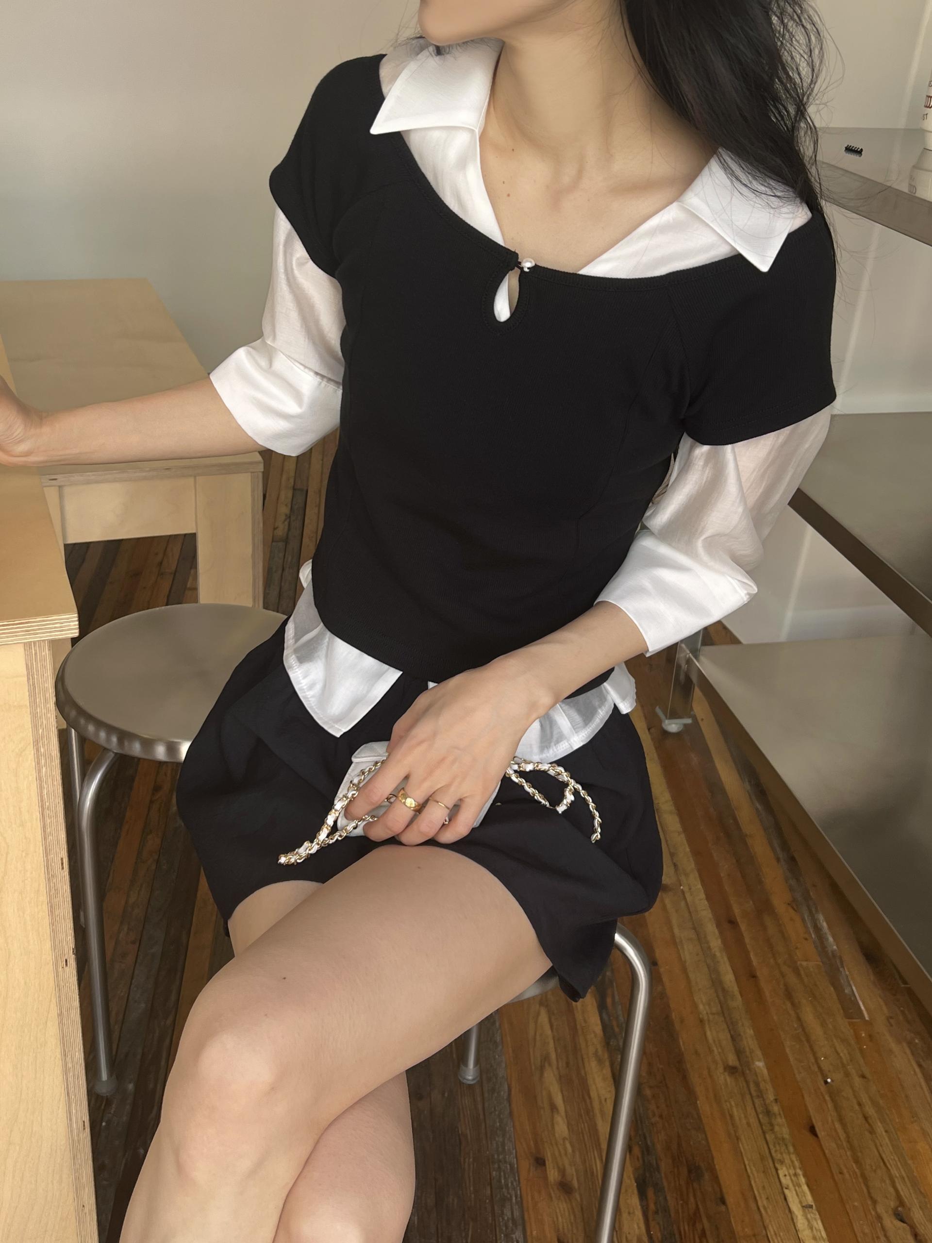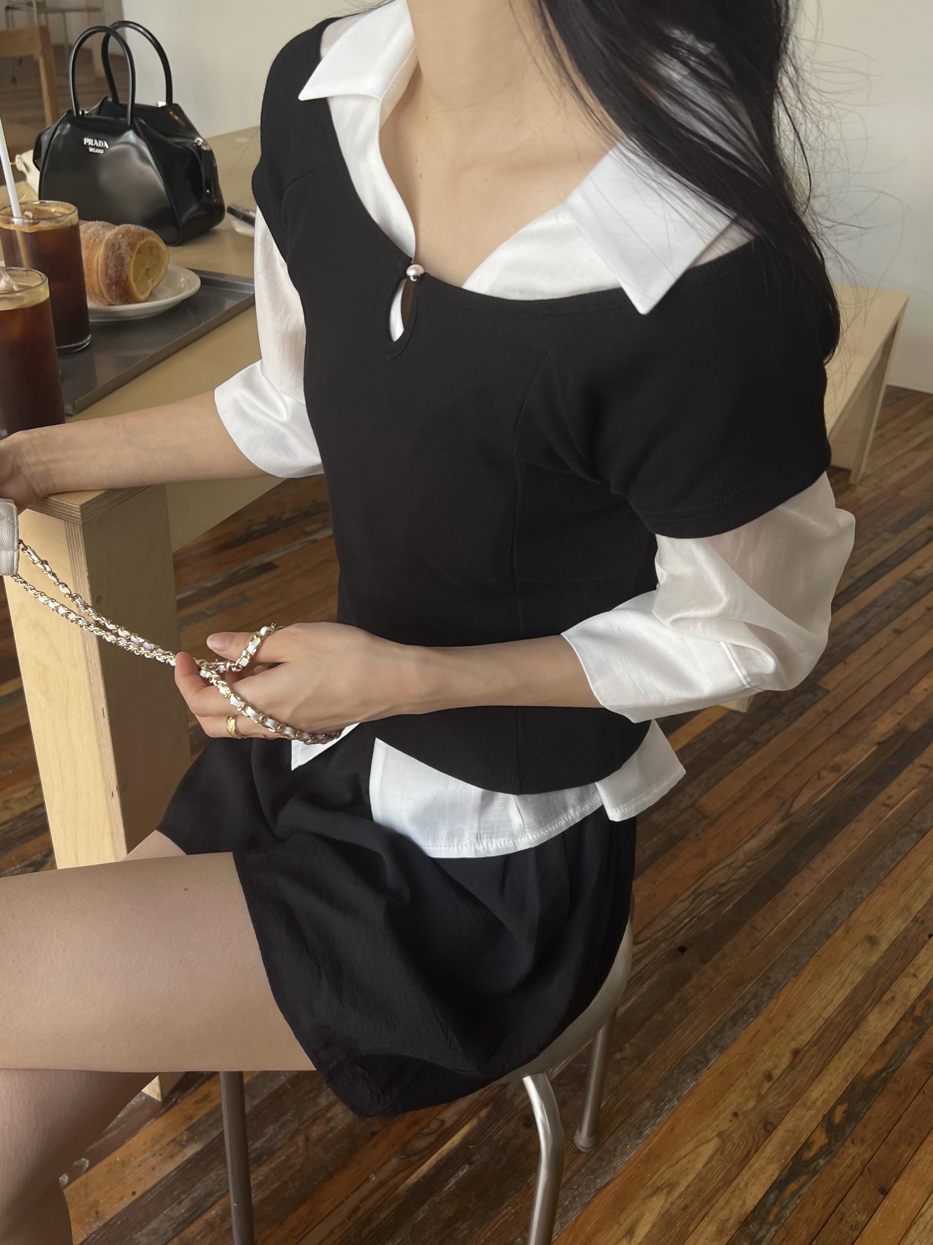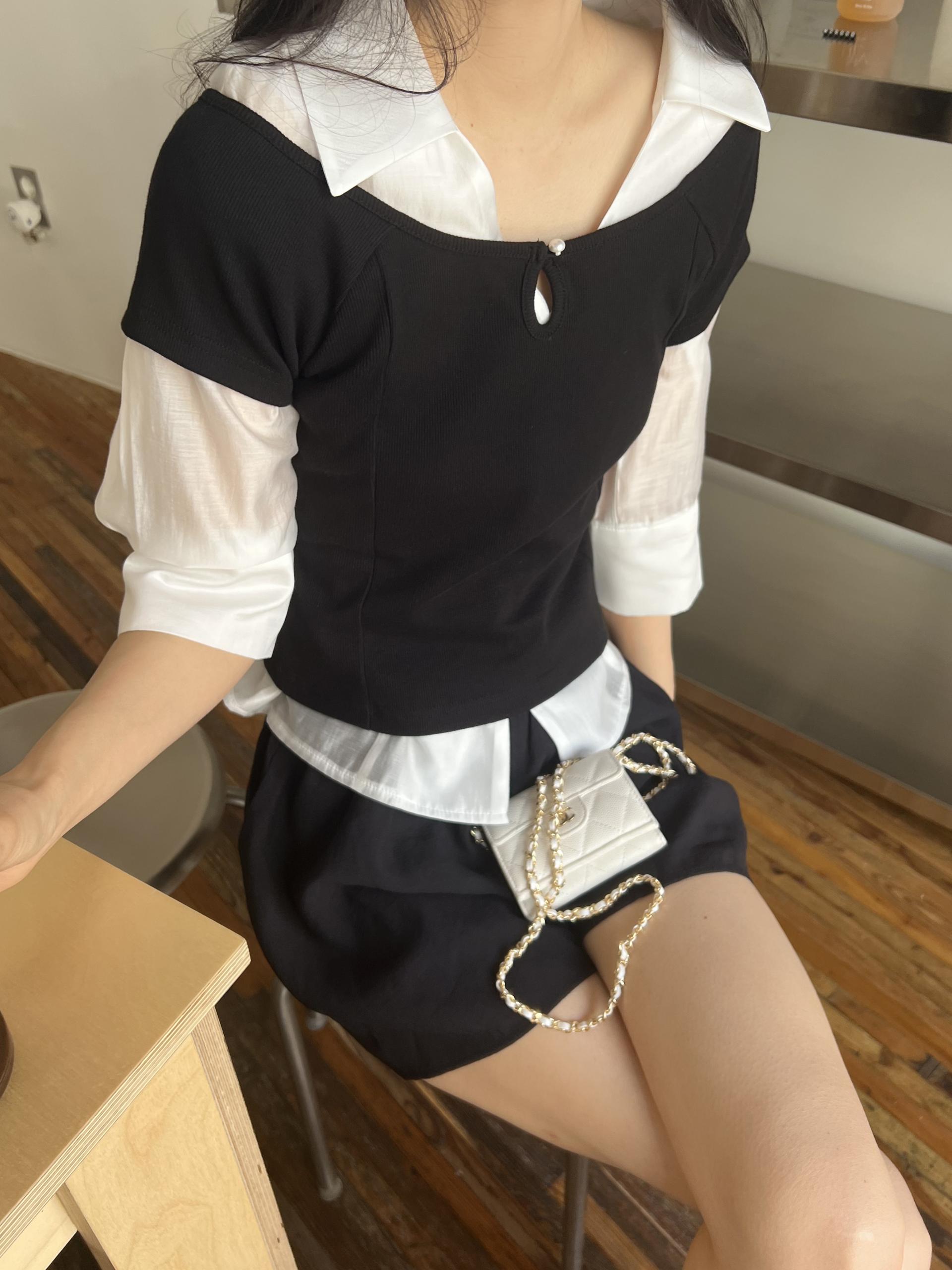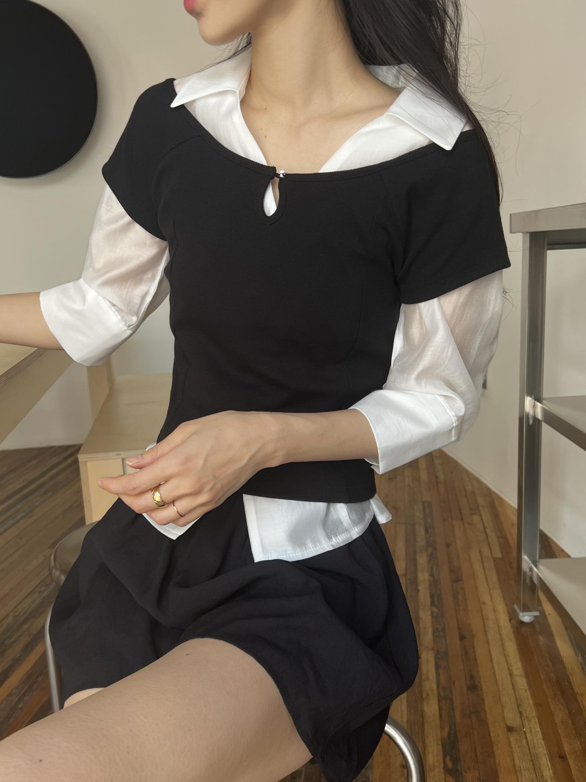 무지 디테일 방향과 진주와 작은 홀이 있는 방향 두 면 모두 활용할 수 있으며, 세미 오프숄더넥, 유넥 두 가지 형태로도 착용 가능합니다. 다양하게 연출할 수 있어 활용도가 좋은 티셔츠에요. 단독으로 입어도 좋고, 블랙 모델컷과 같이 레이어드하기에도 좋습니다.