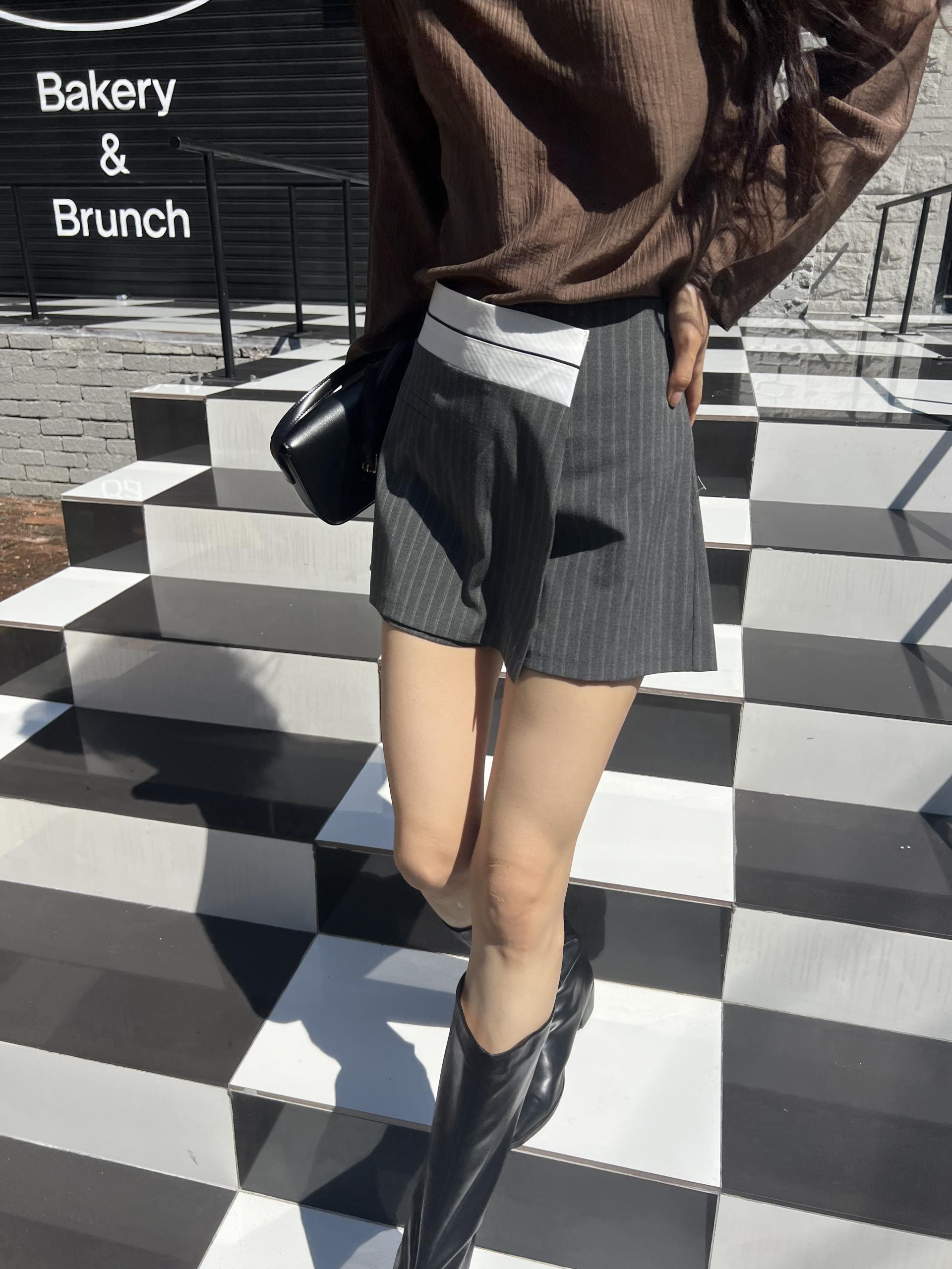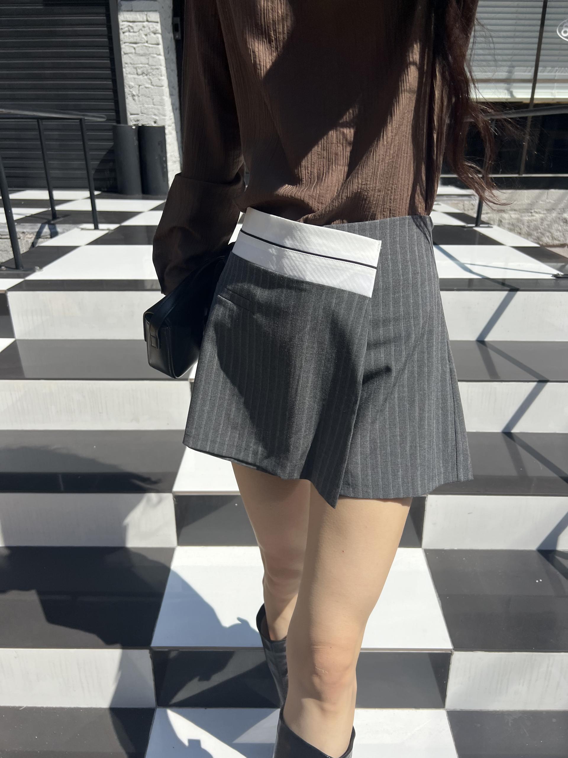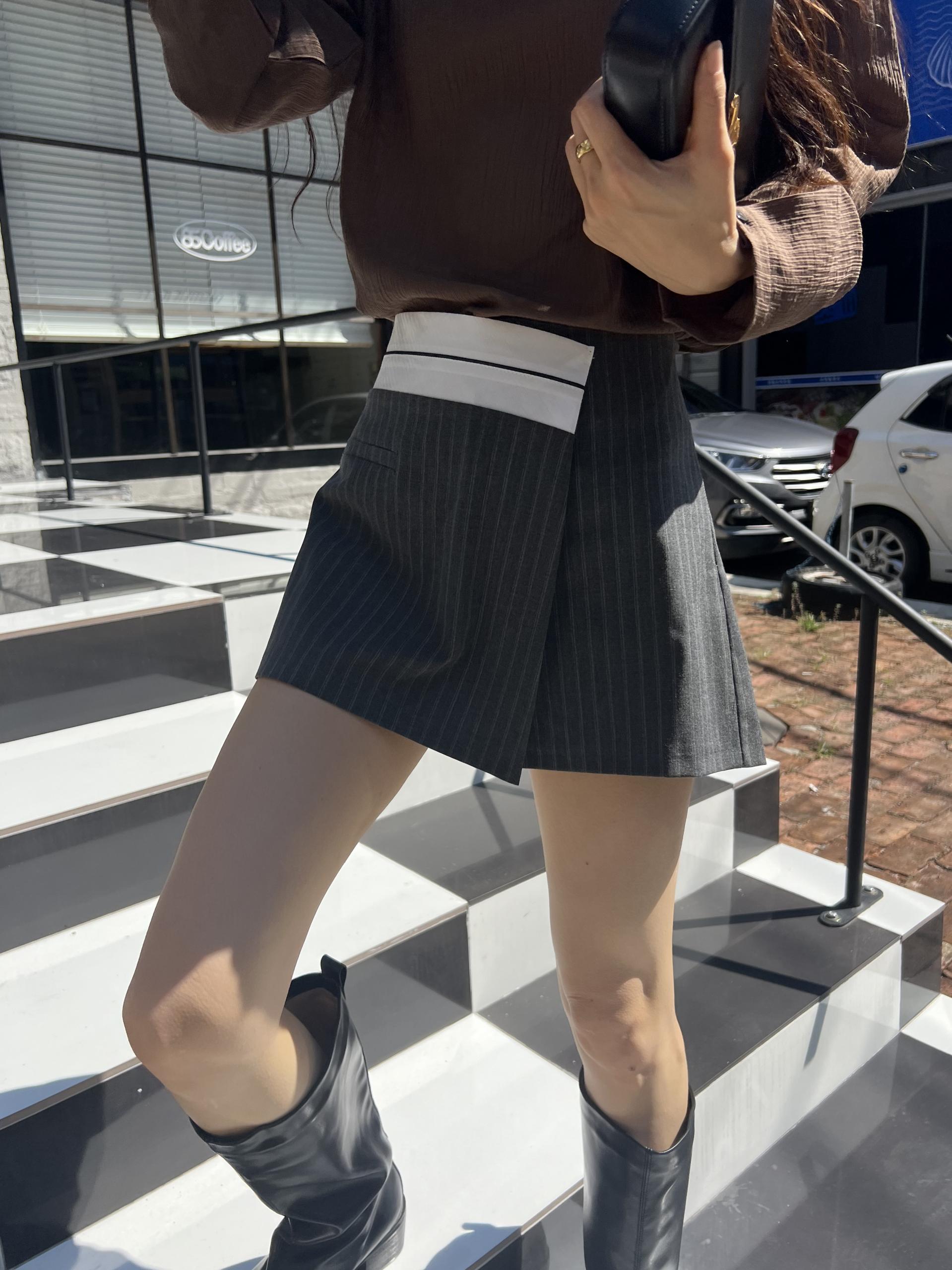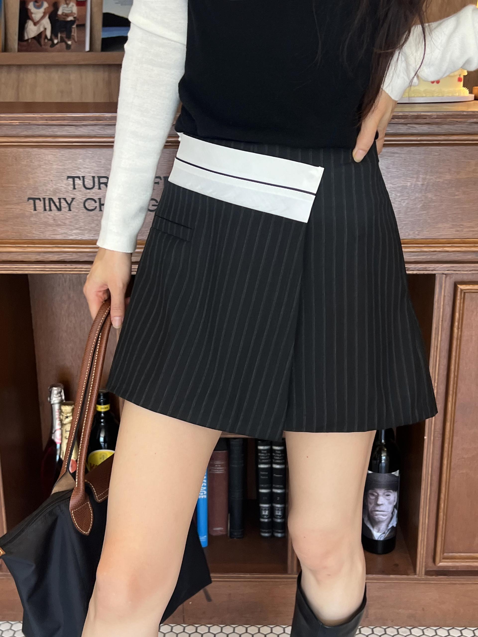 웨이스트 밴드 배색 포인트와 랩 디테일의 치마바지입니다.