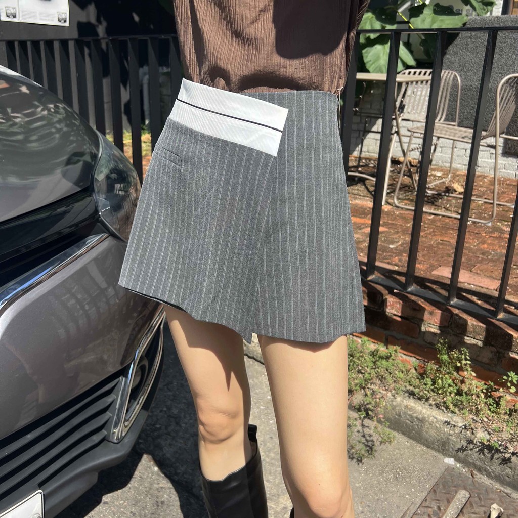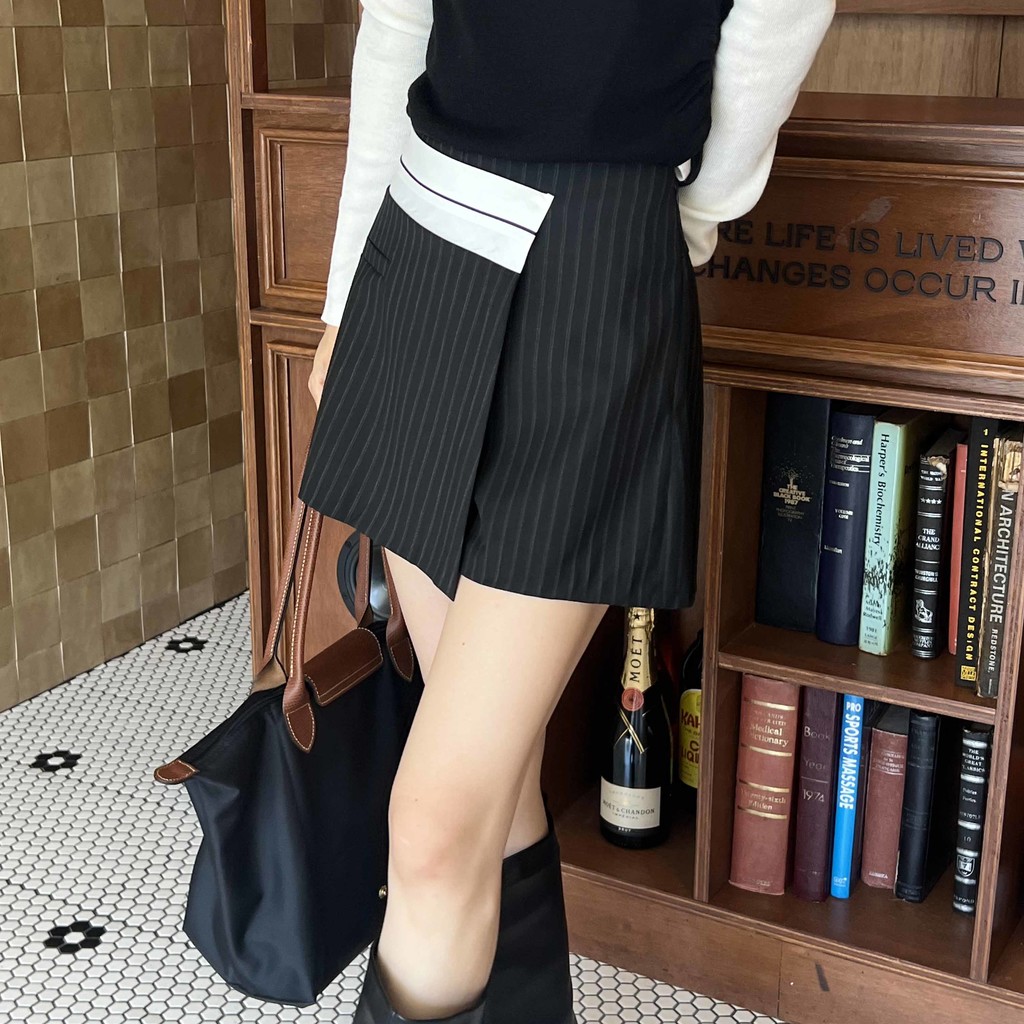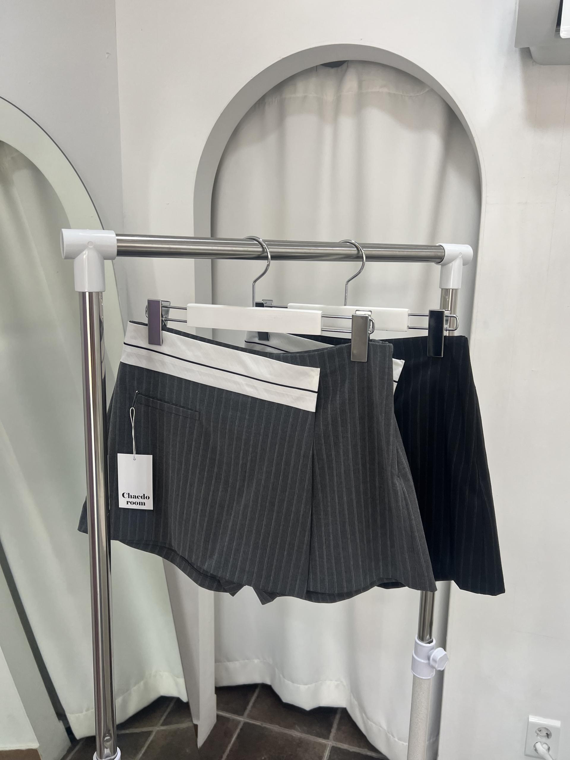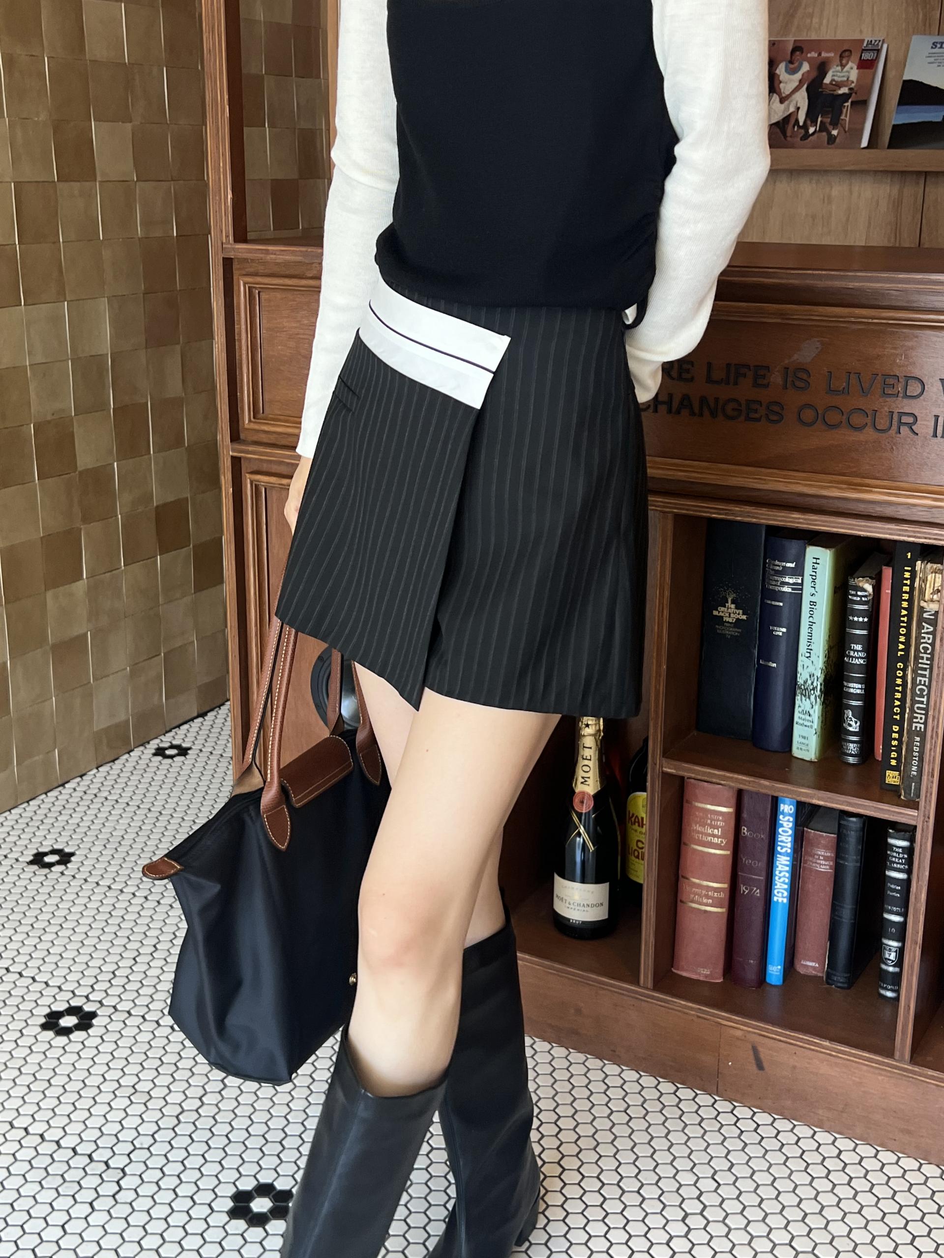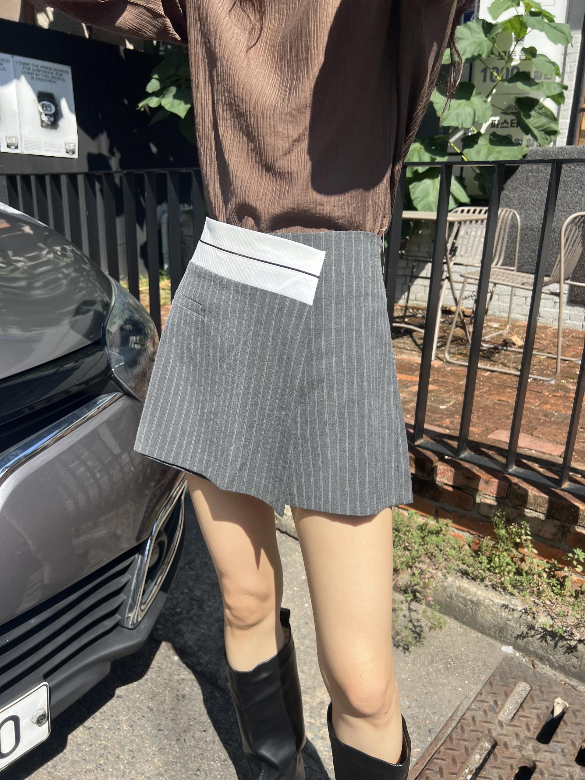 웨이스트 밴드 배색 포인트와 랩 디테일의 치마바지입니다.