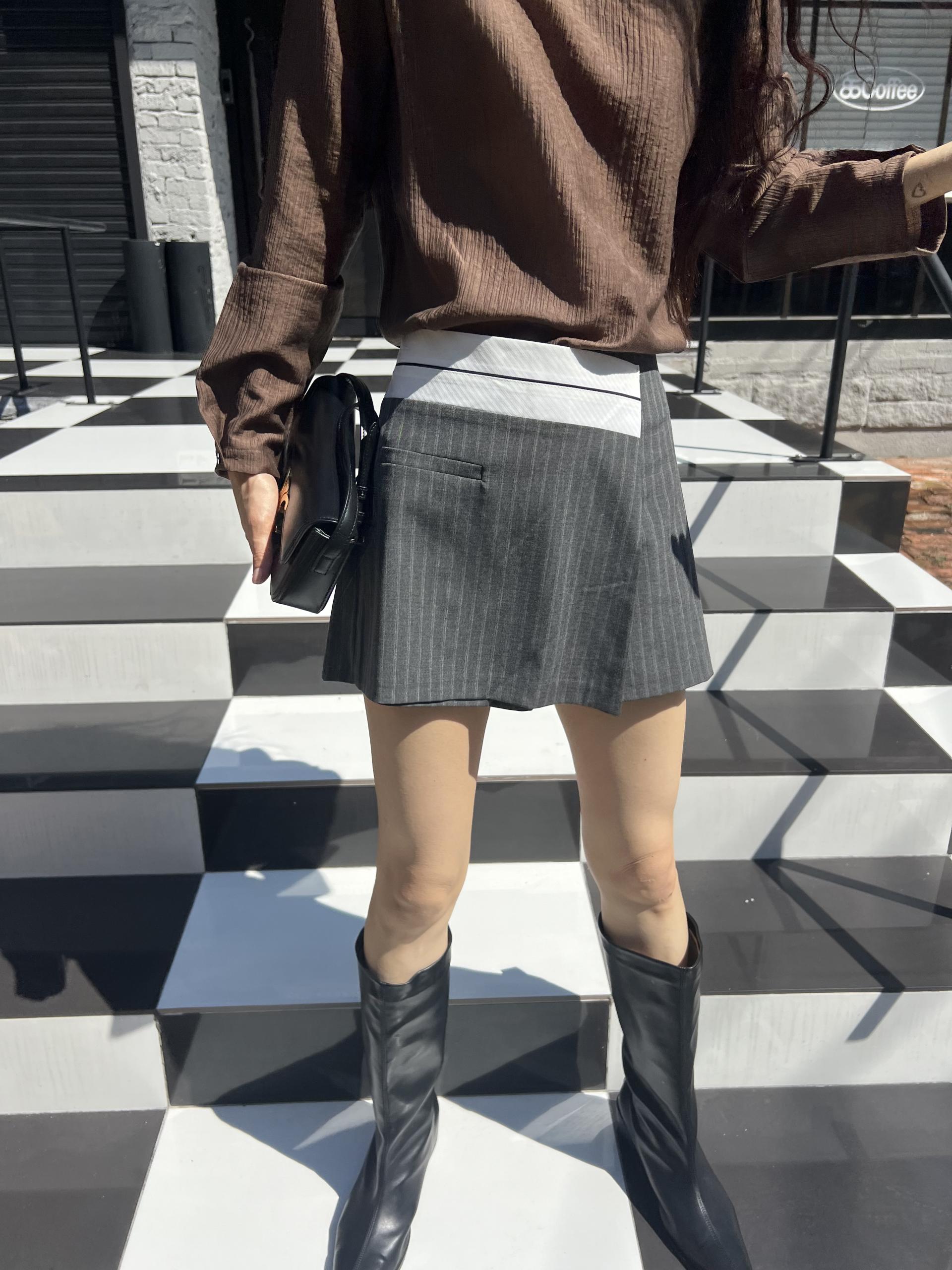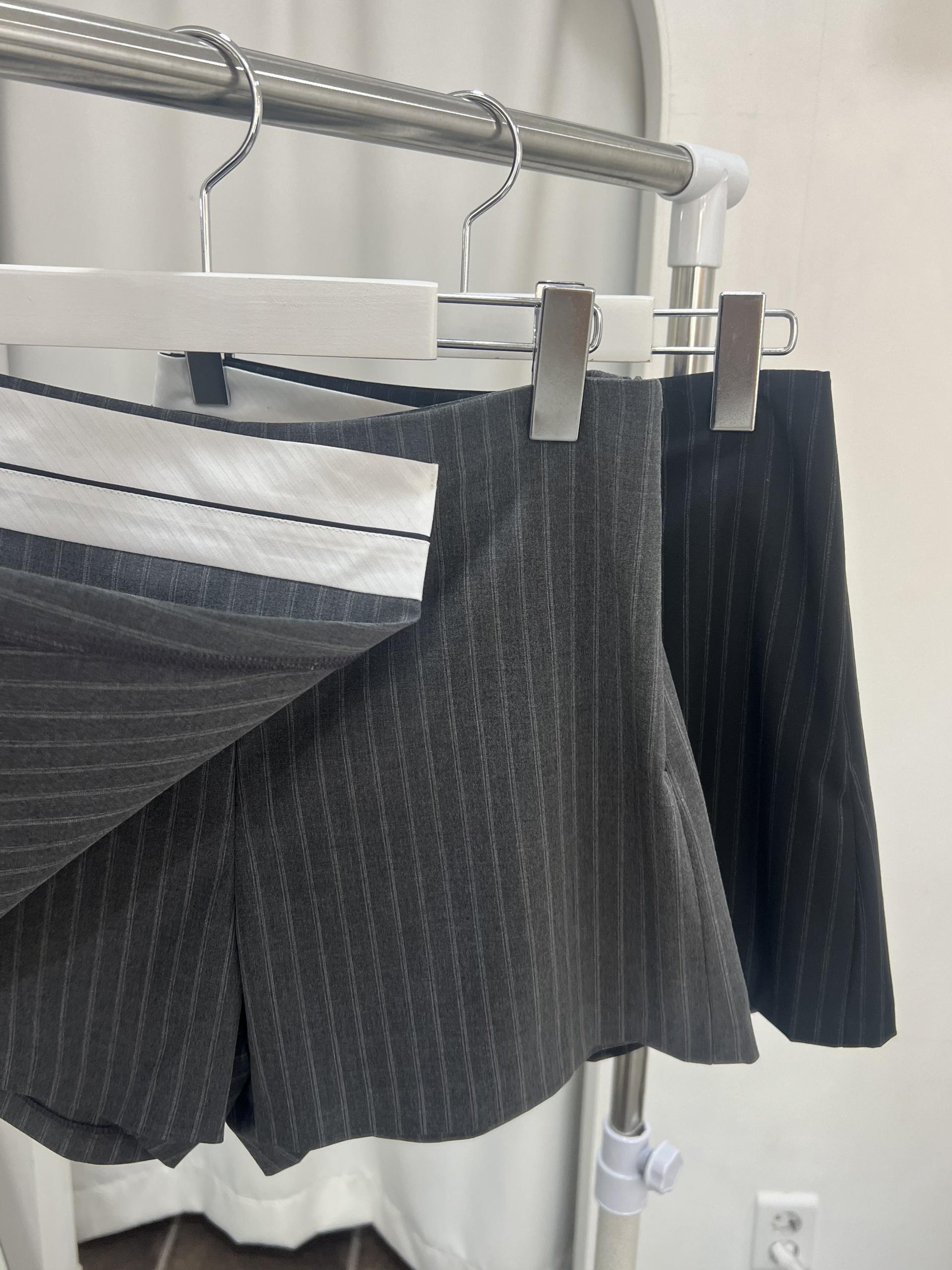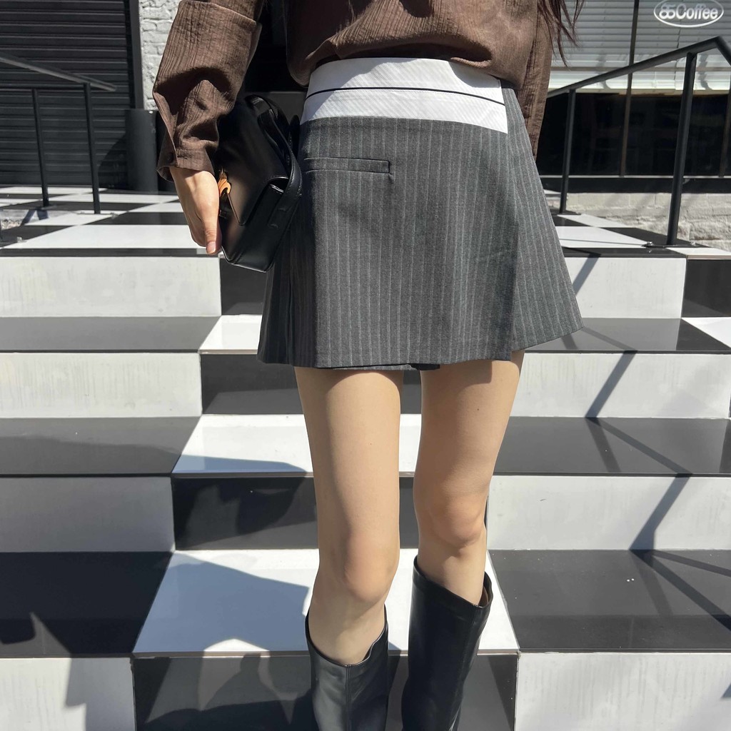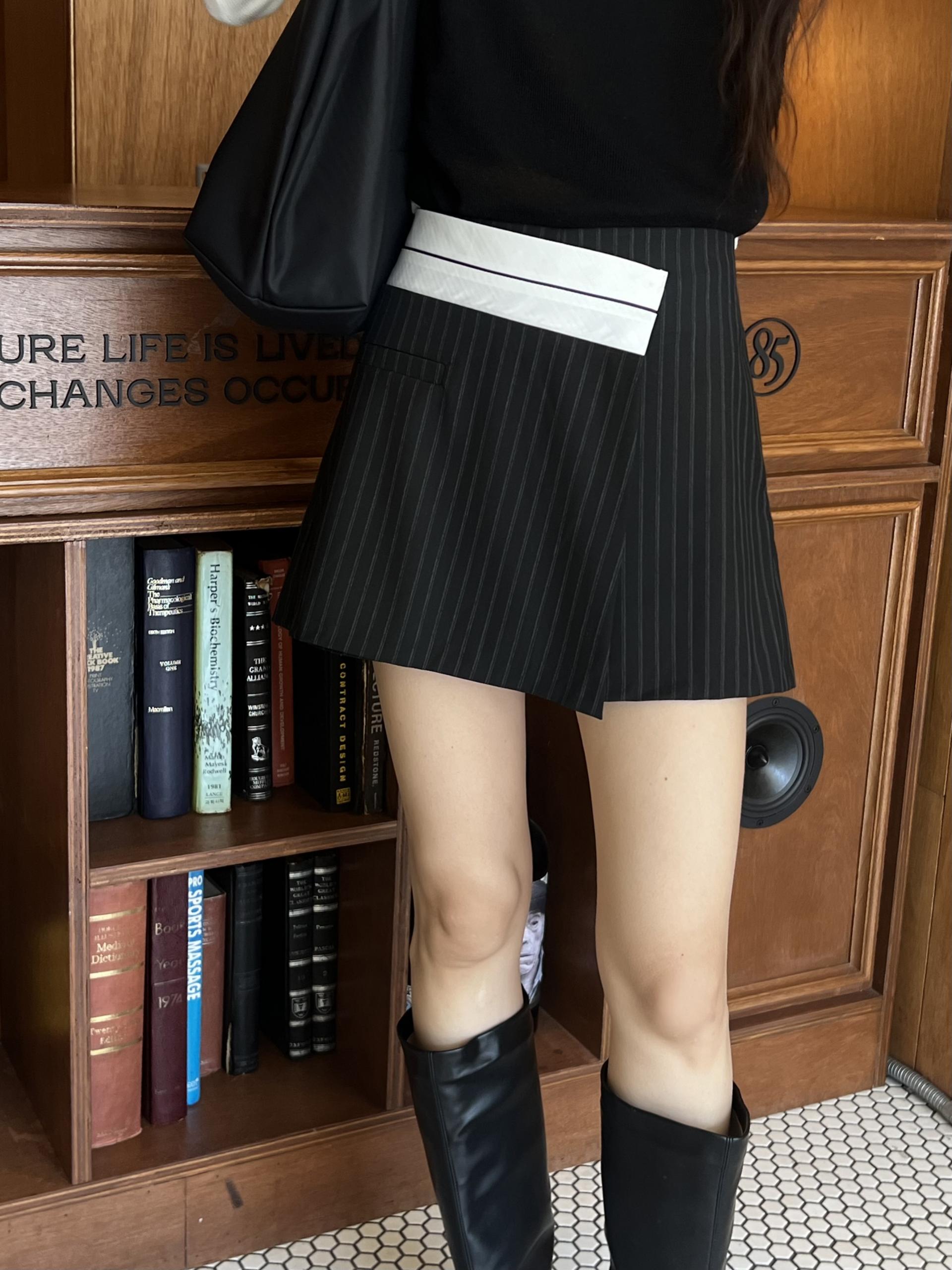 웨이스트 밴드 배색 포인트와 랩 디테일의 치마바지입니다.