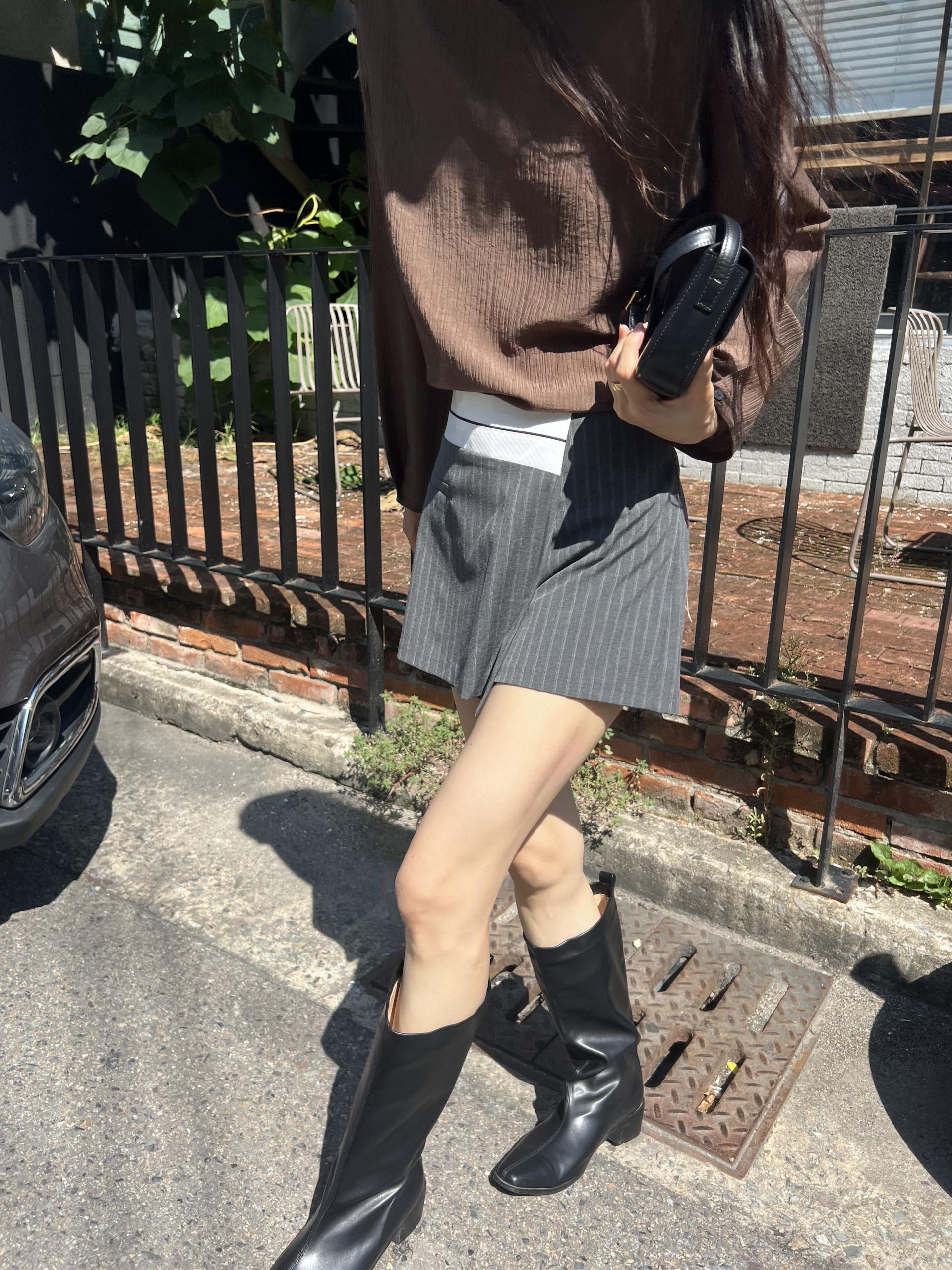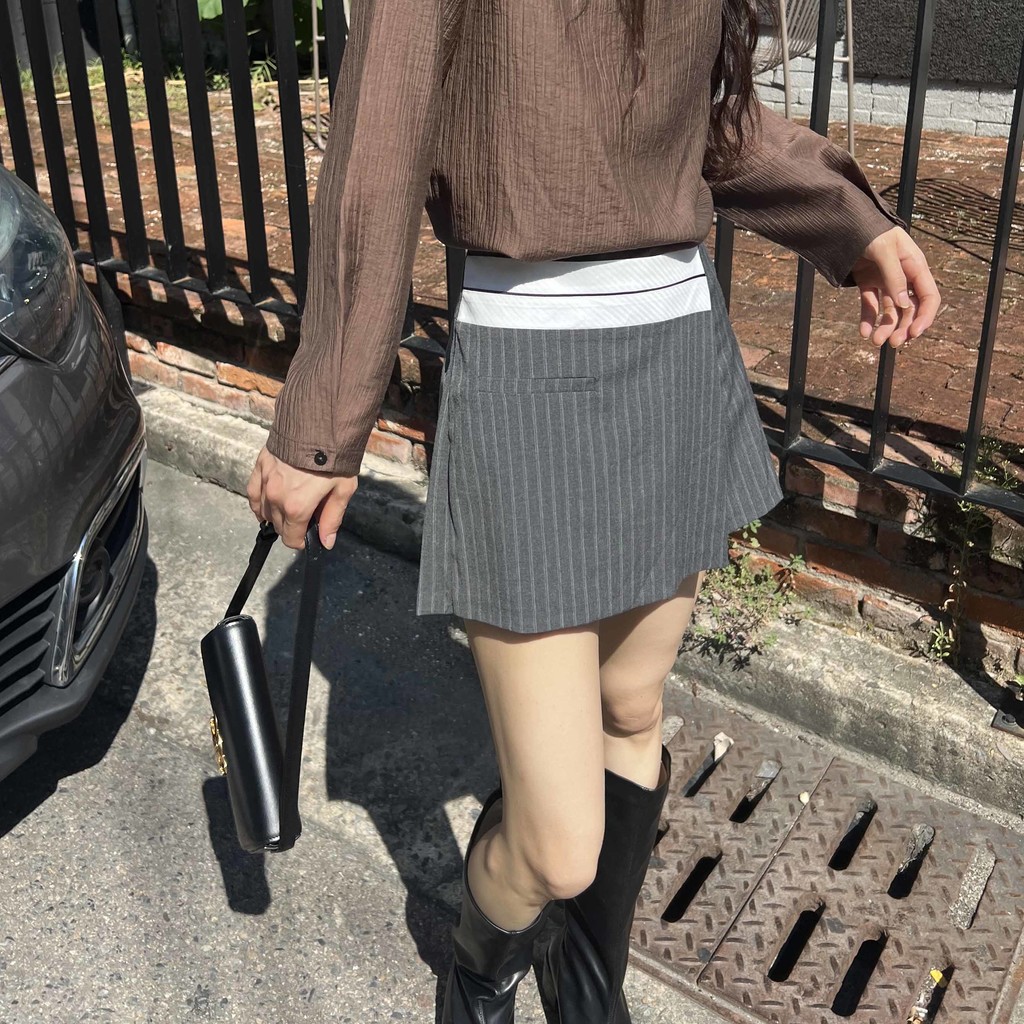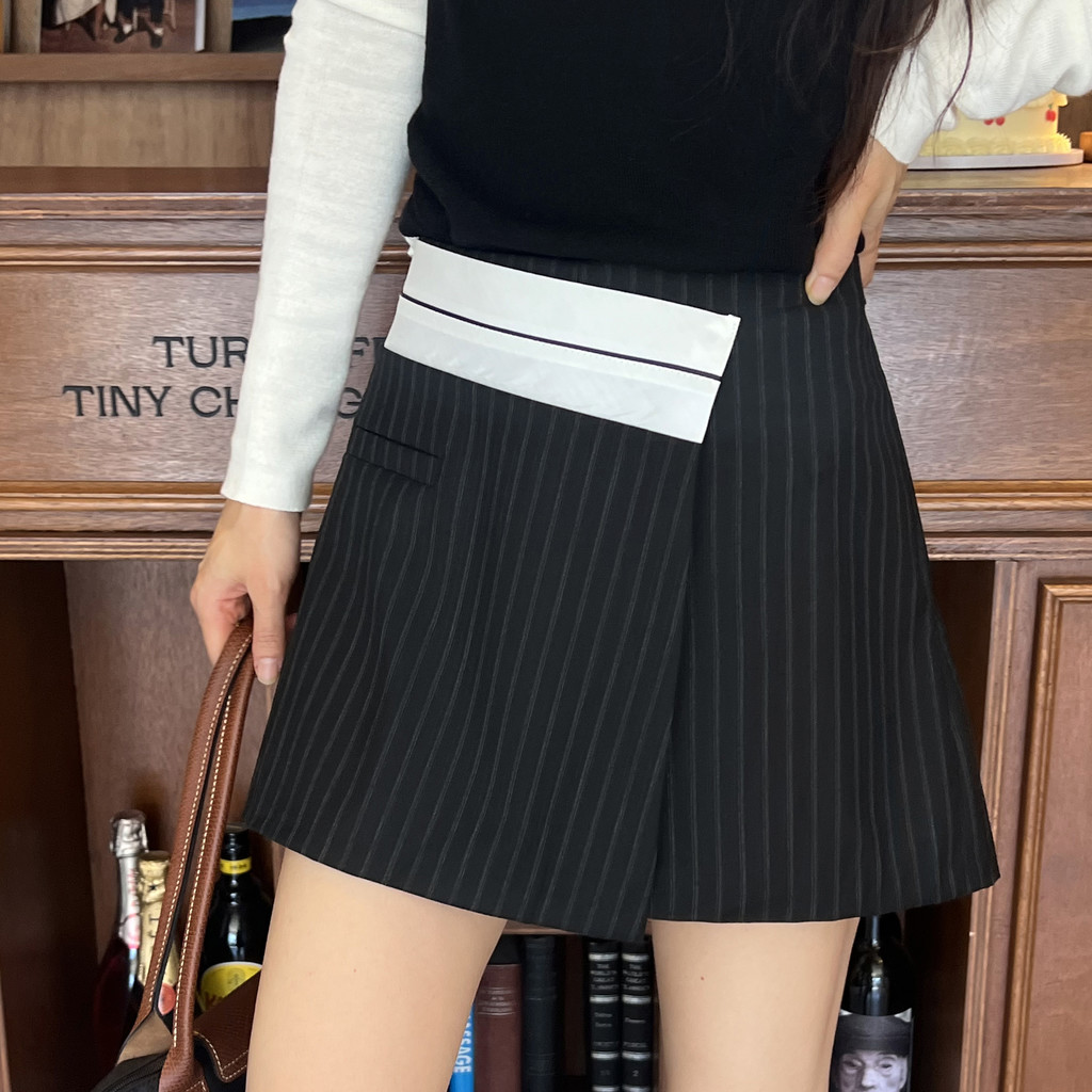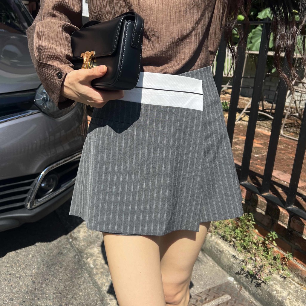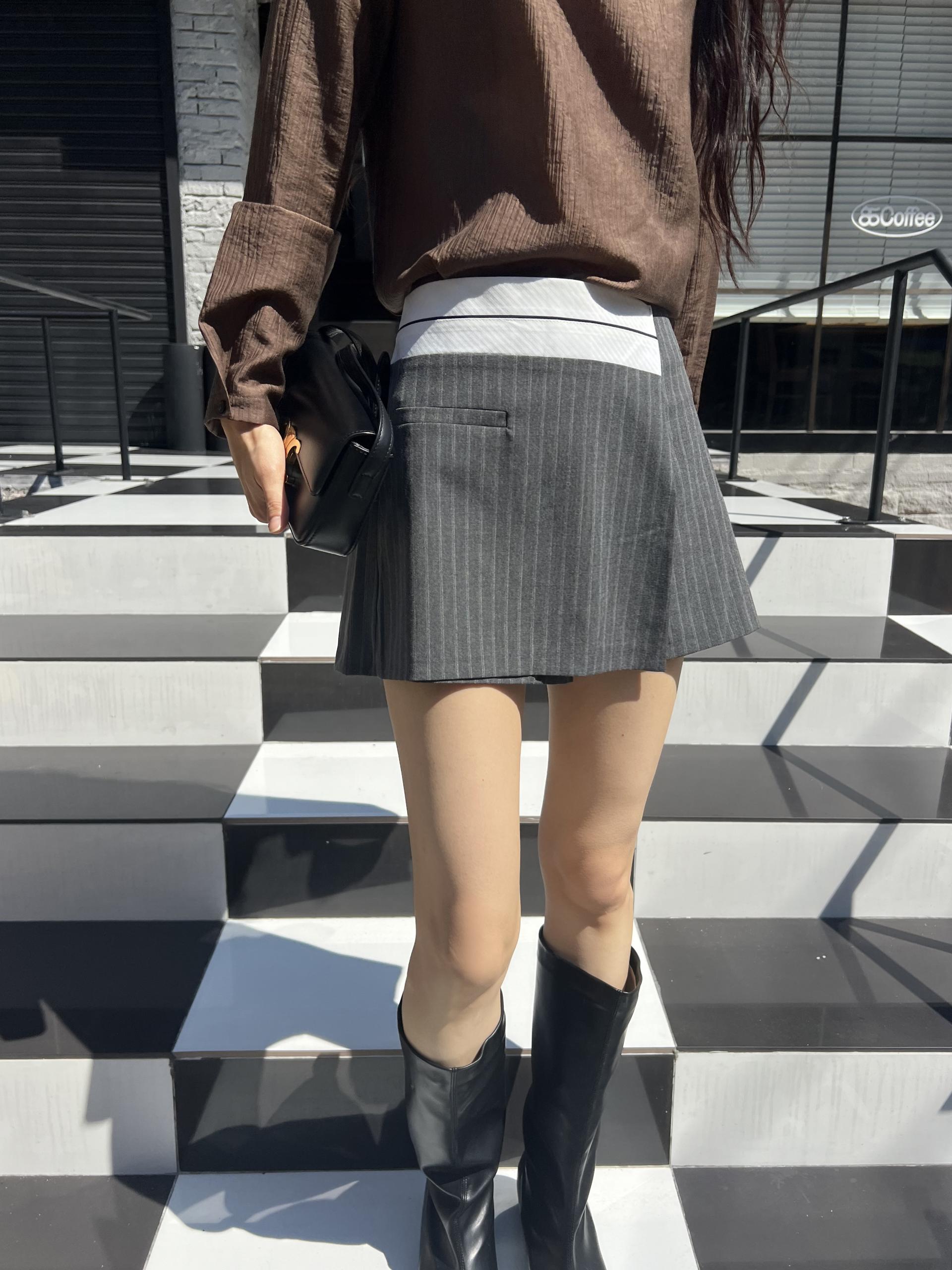 웨이스트 밴드 배색 포인트와 랩 디테일의 치마바지입니다.