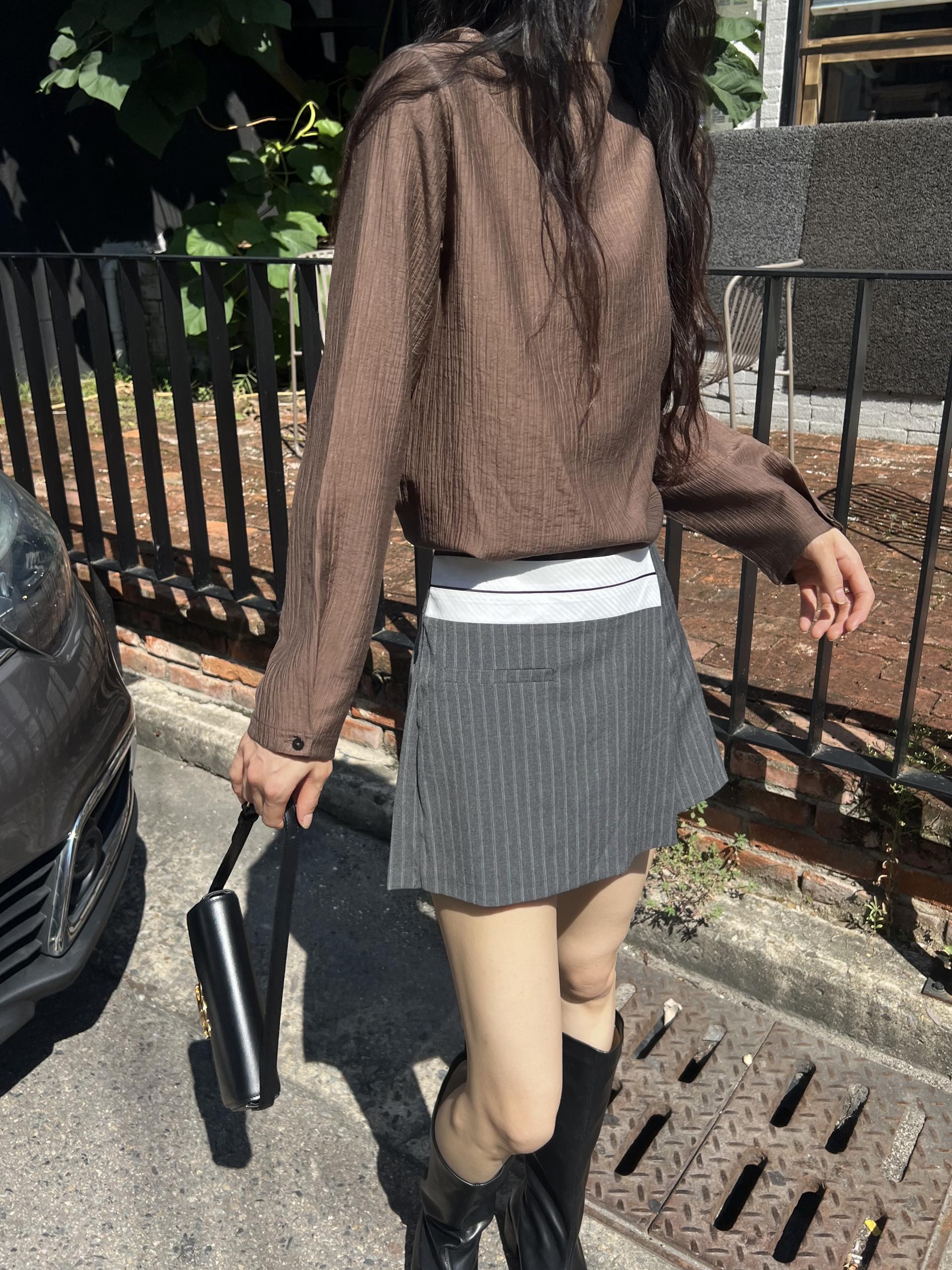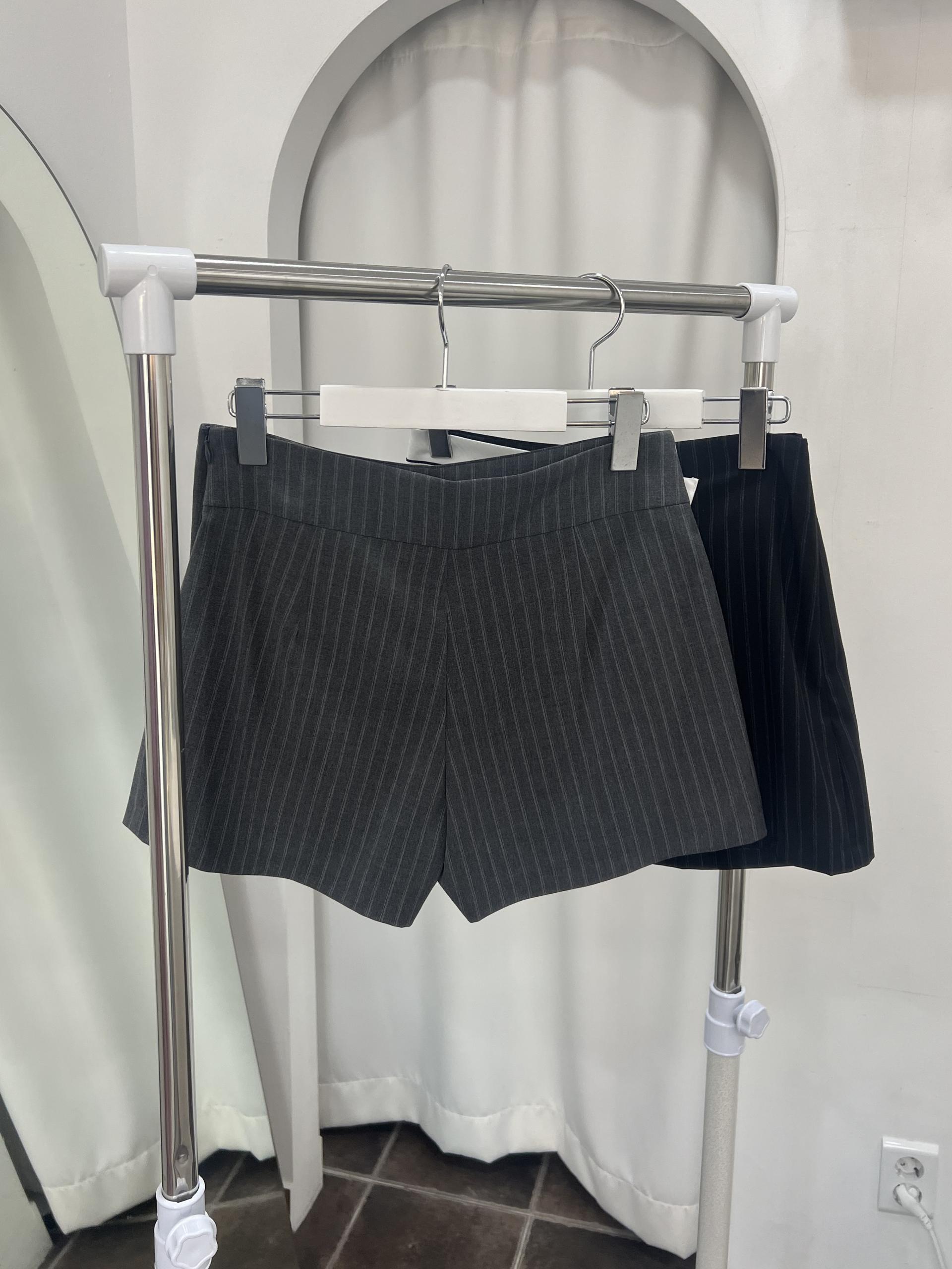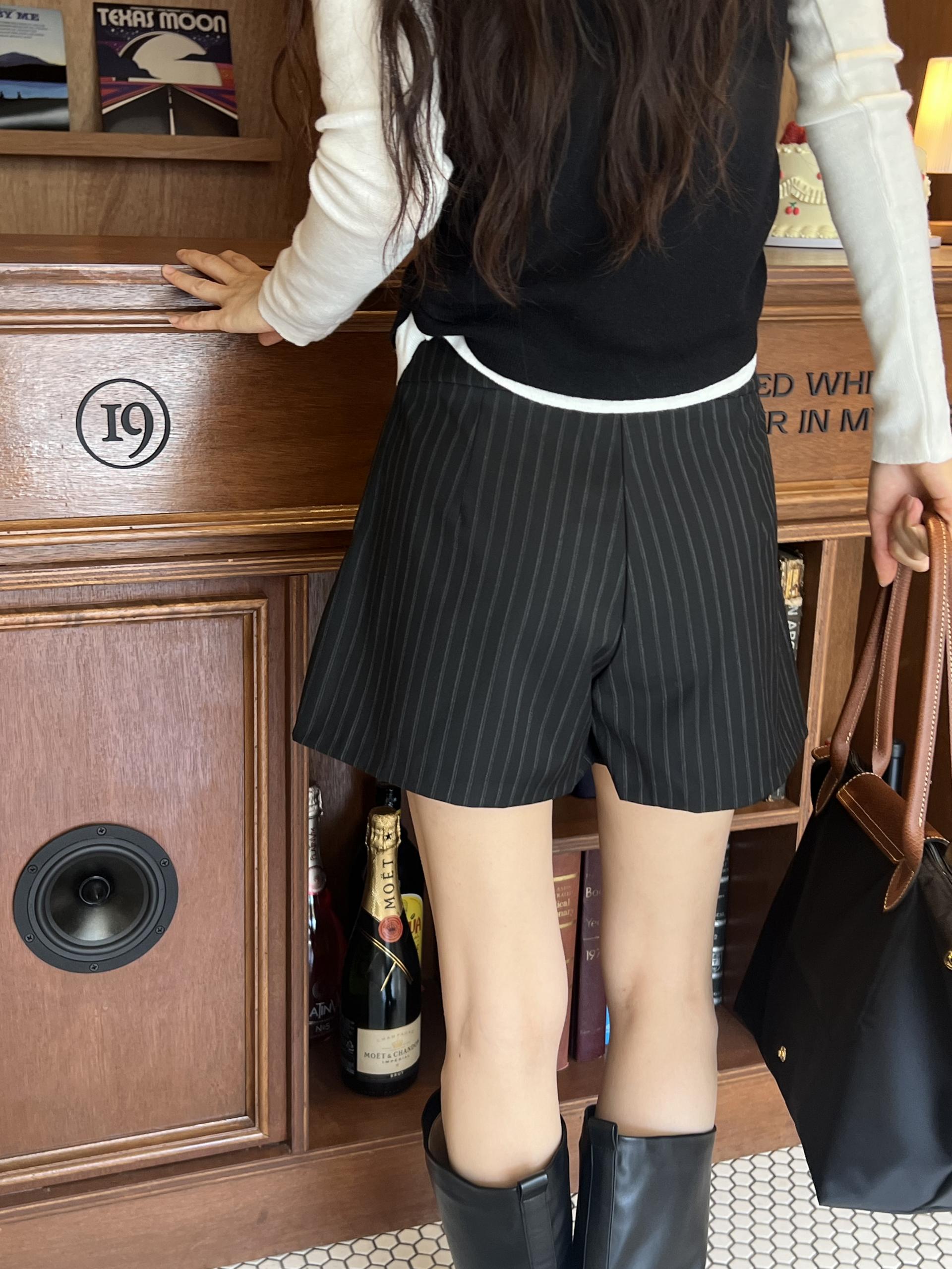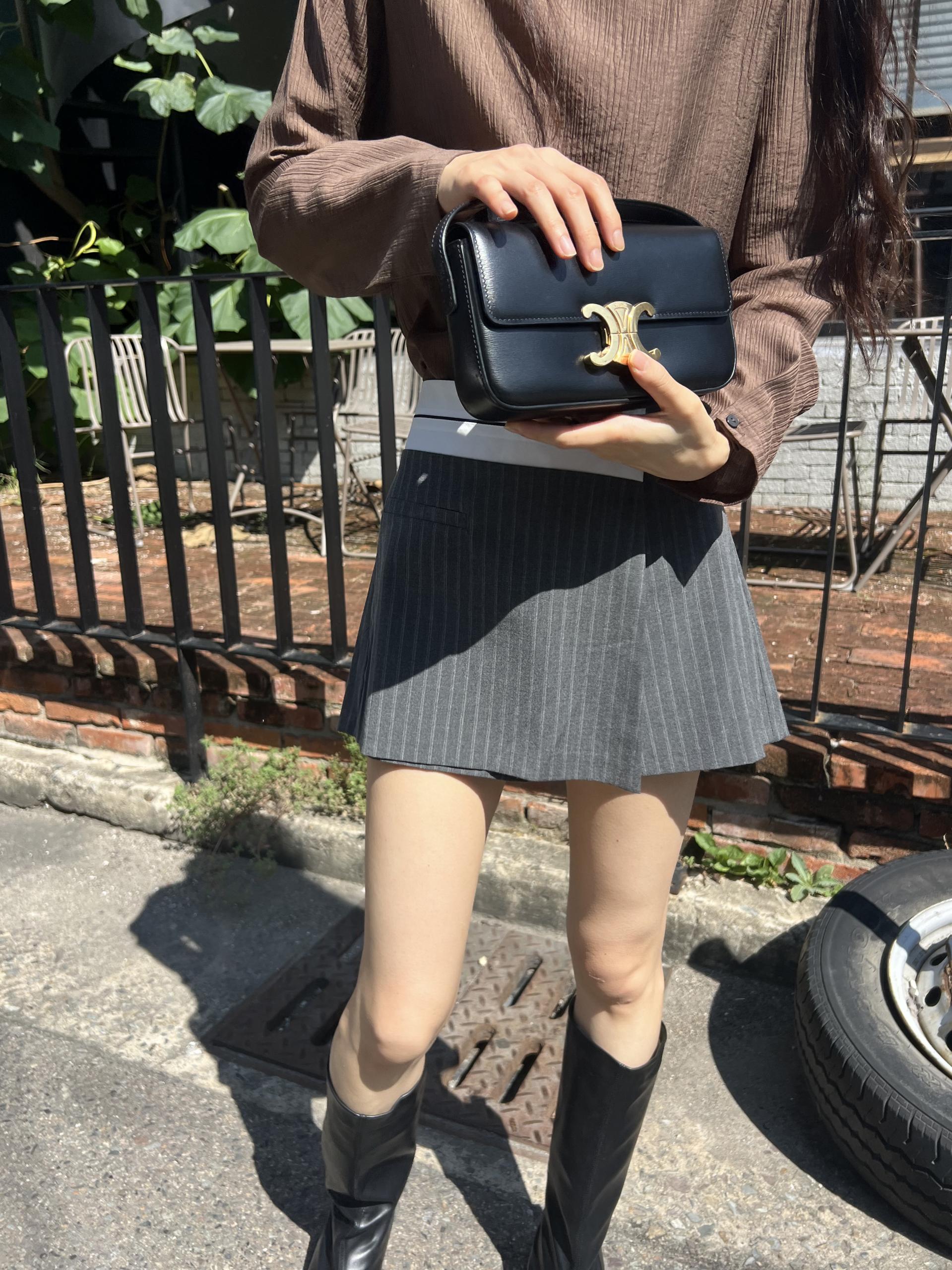 웨이스트 밴드 배색 포인트와 랩 디테일의 치마바지입니다.