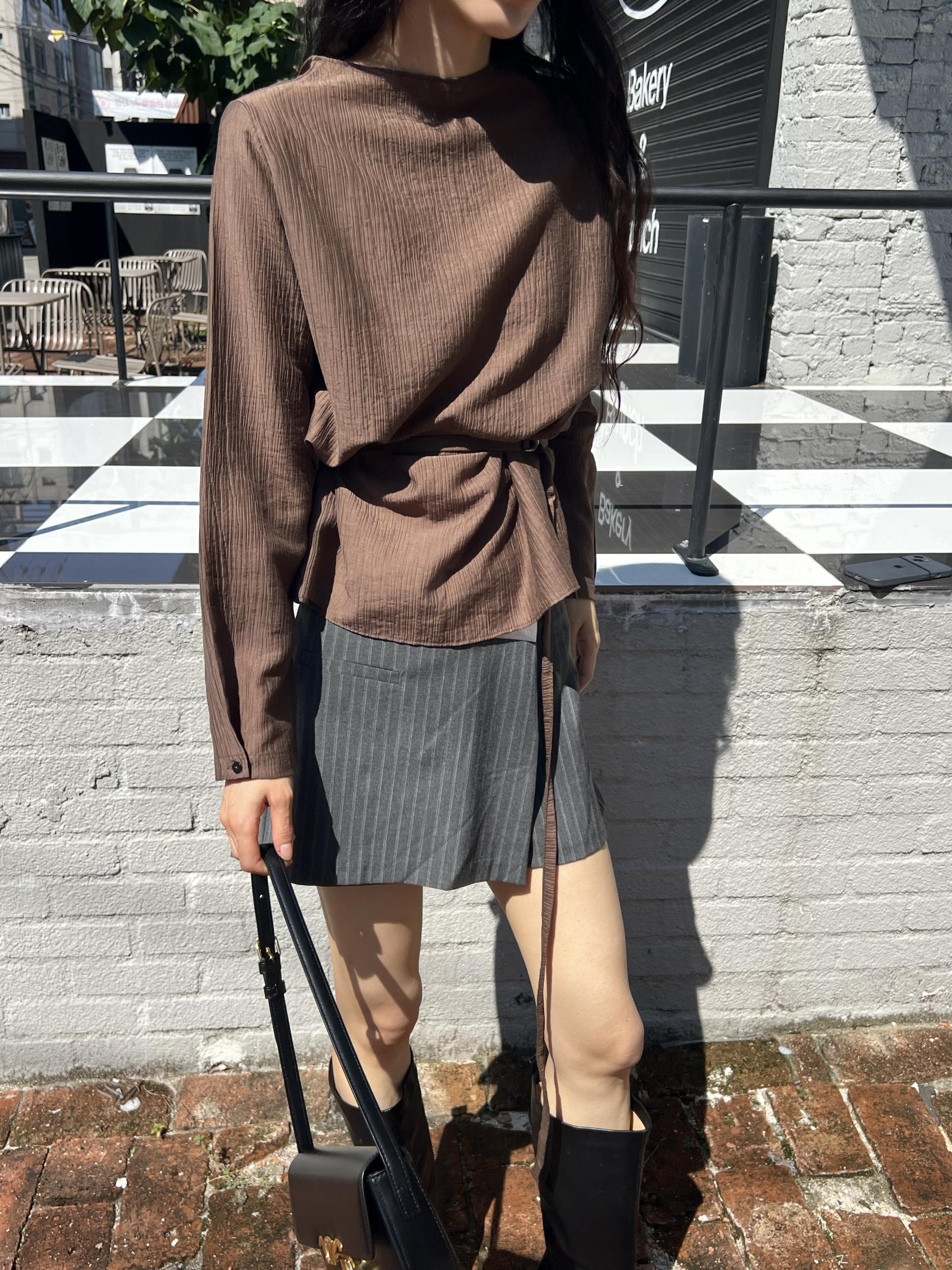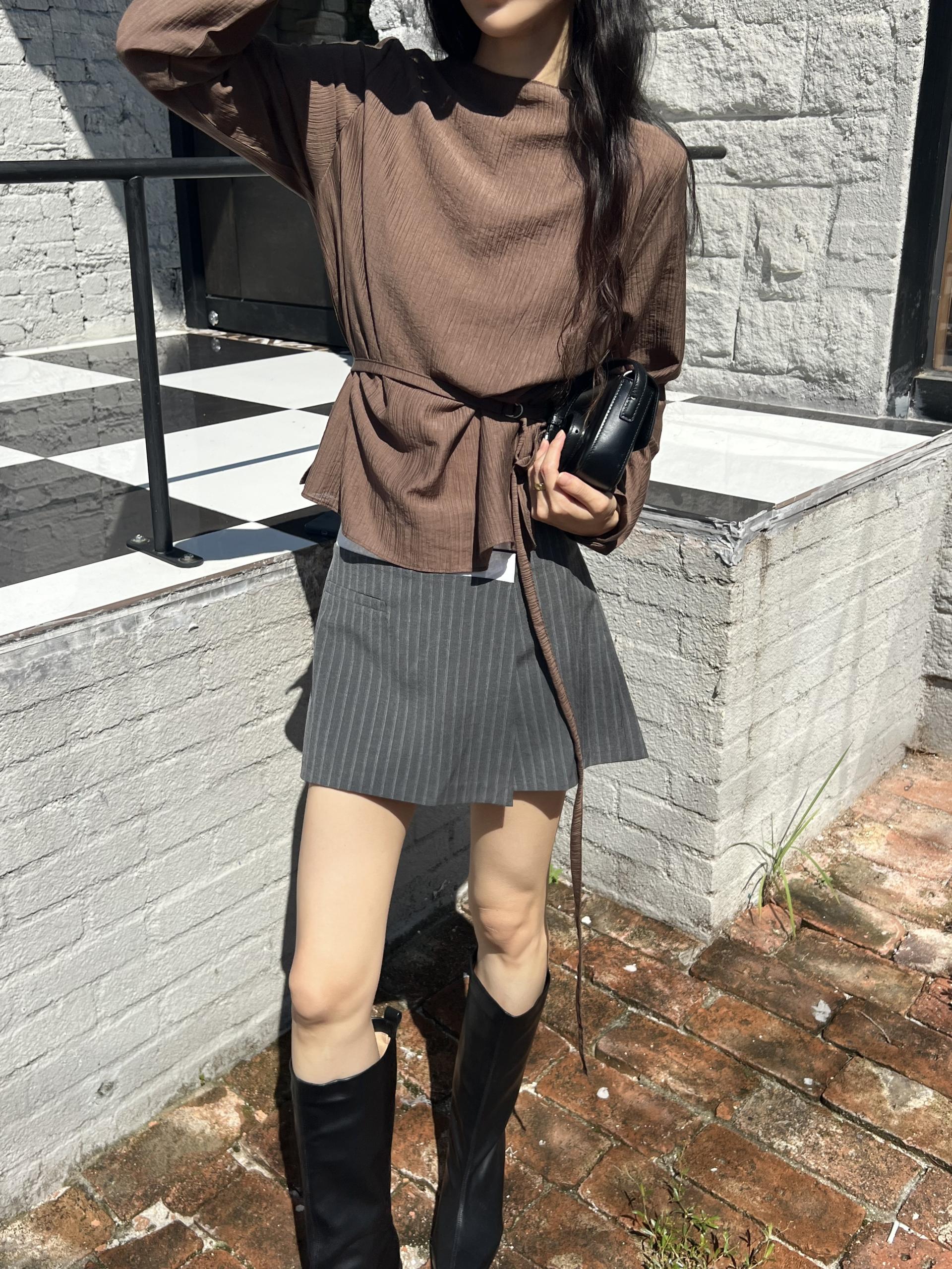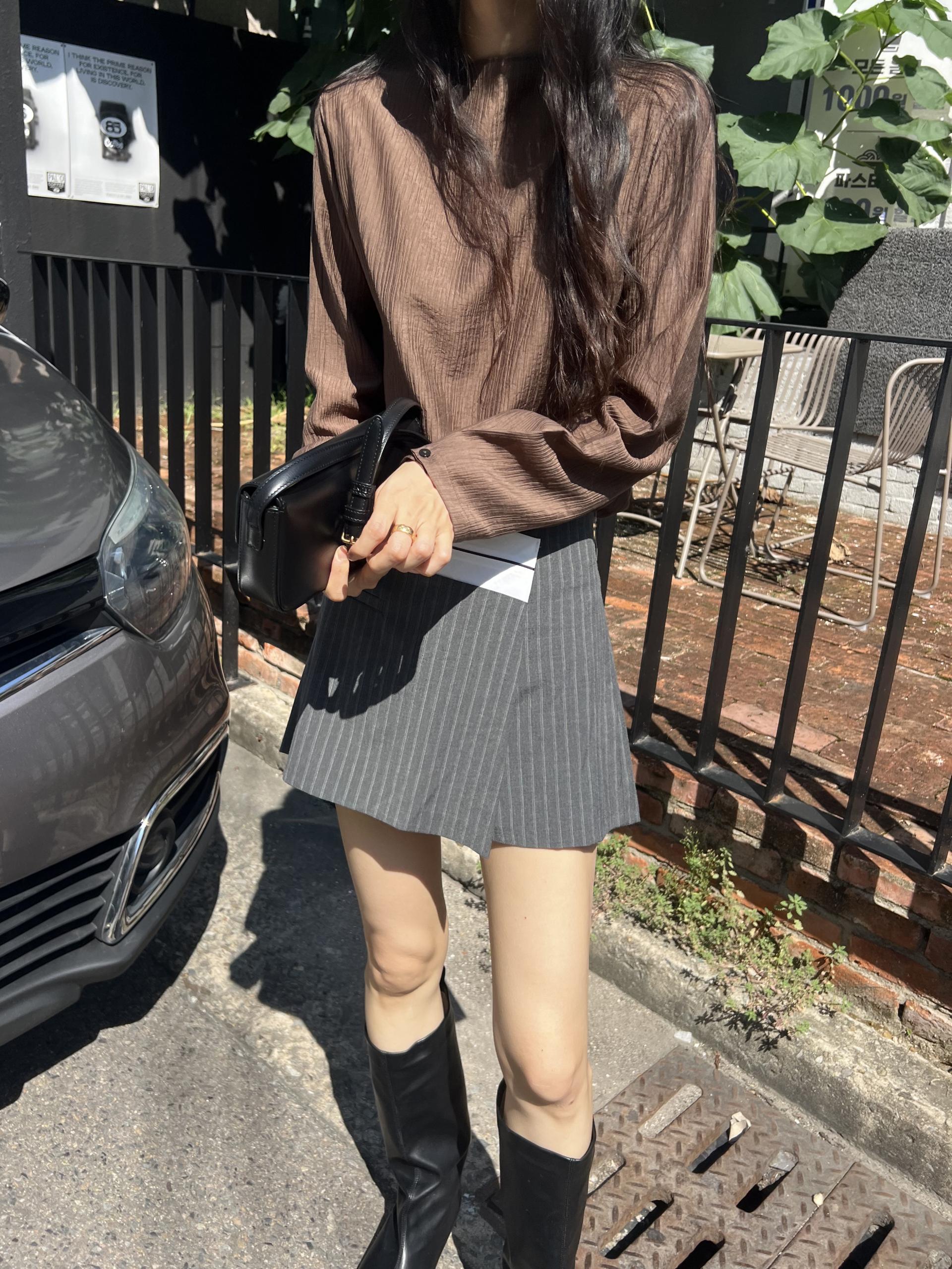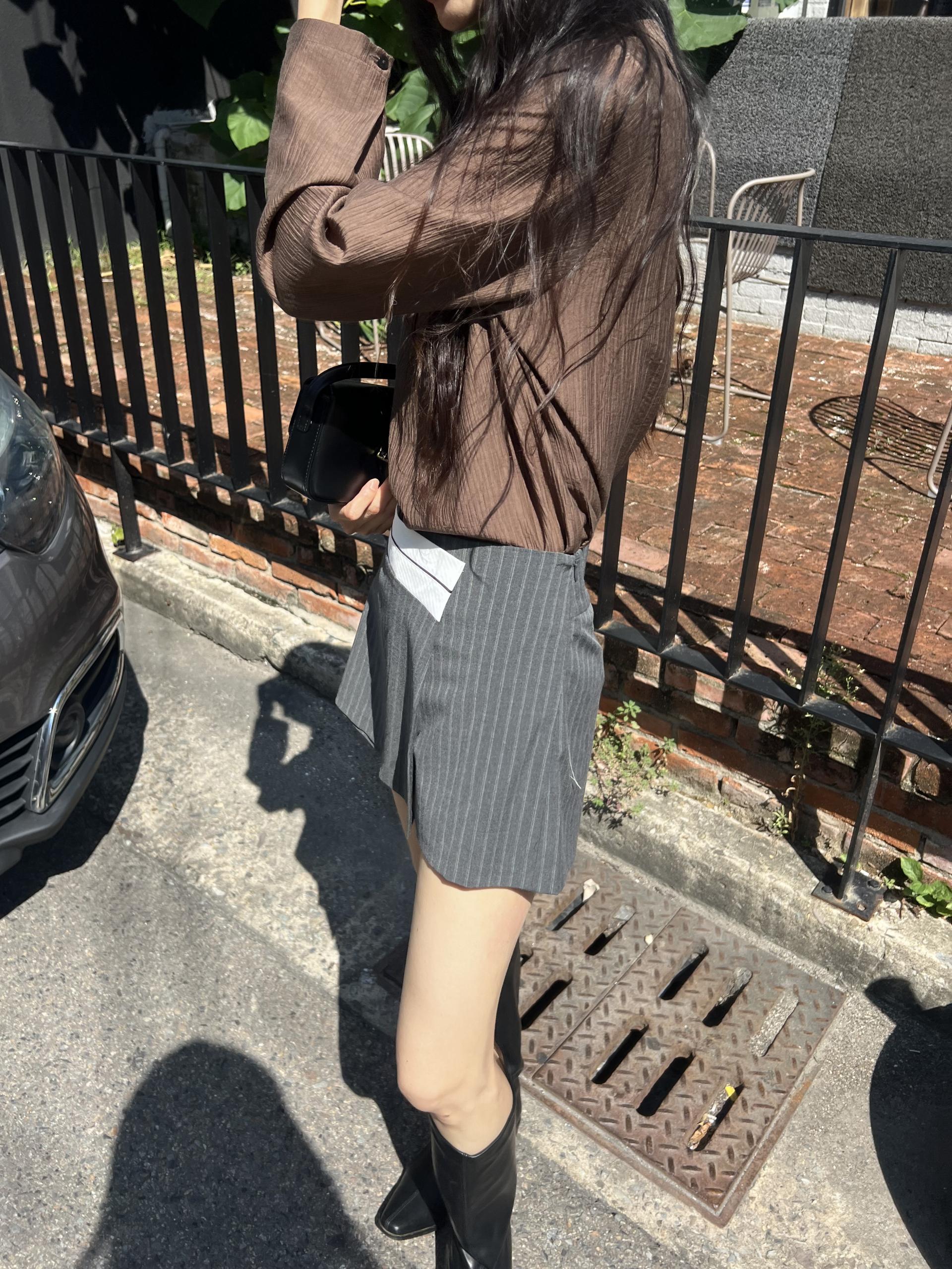 세미 A라인 핏이라 허벅지는 더 가늘어 보이고 랩 디테일로 배를 감싸줘 더 안정적인 착용감입니다. 핏이 예쁘고, 치마바지라 편하게 입을 수 있어 추천드립니다.
