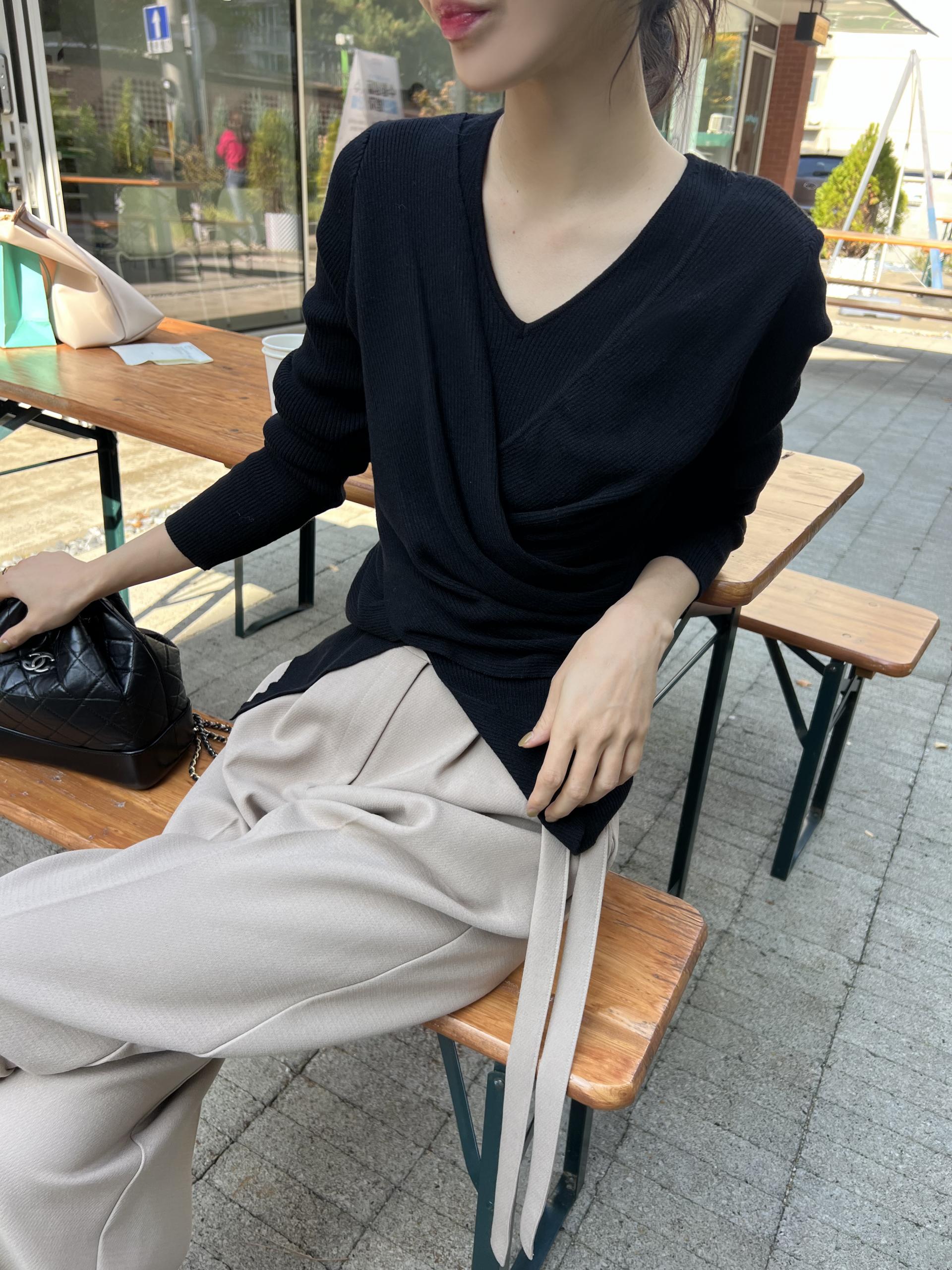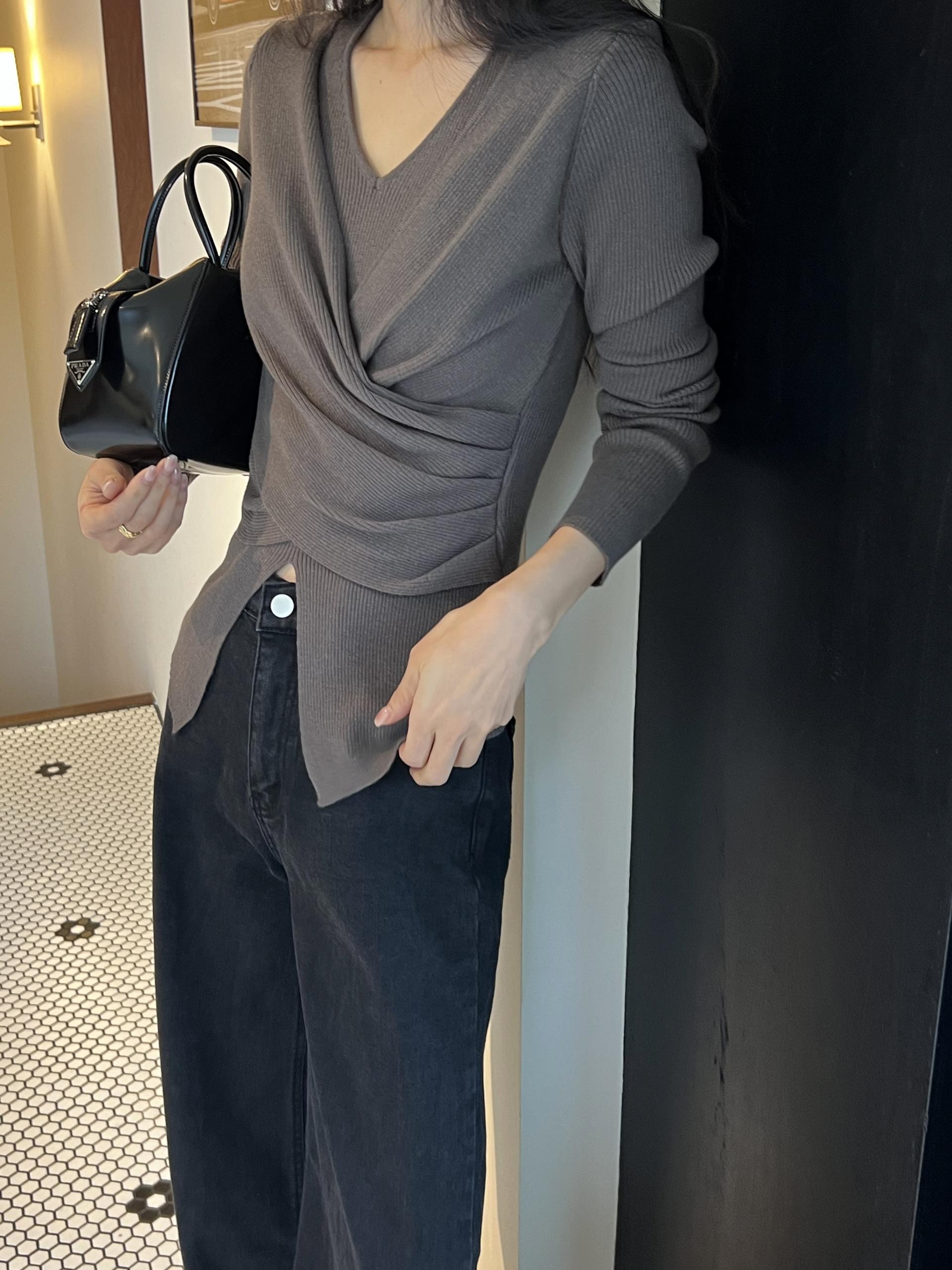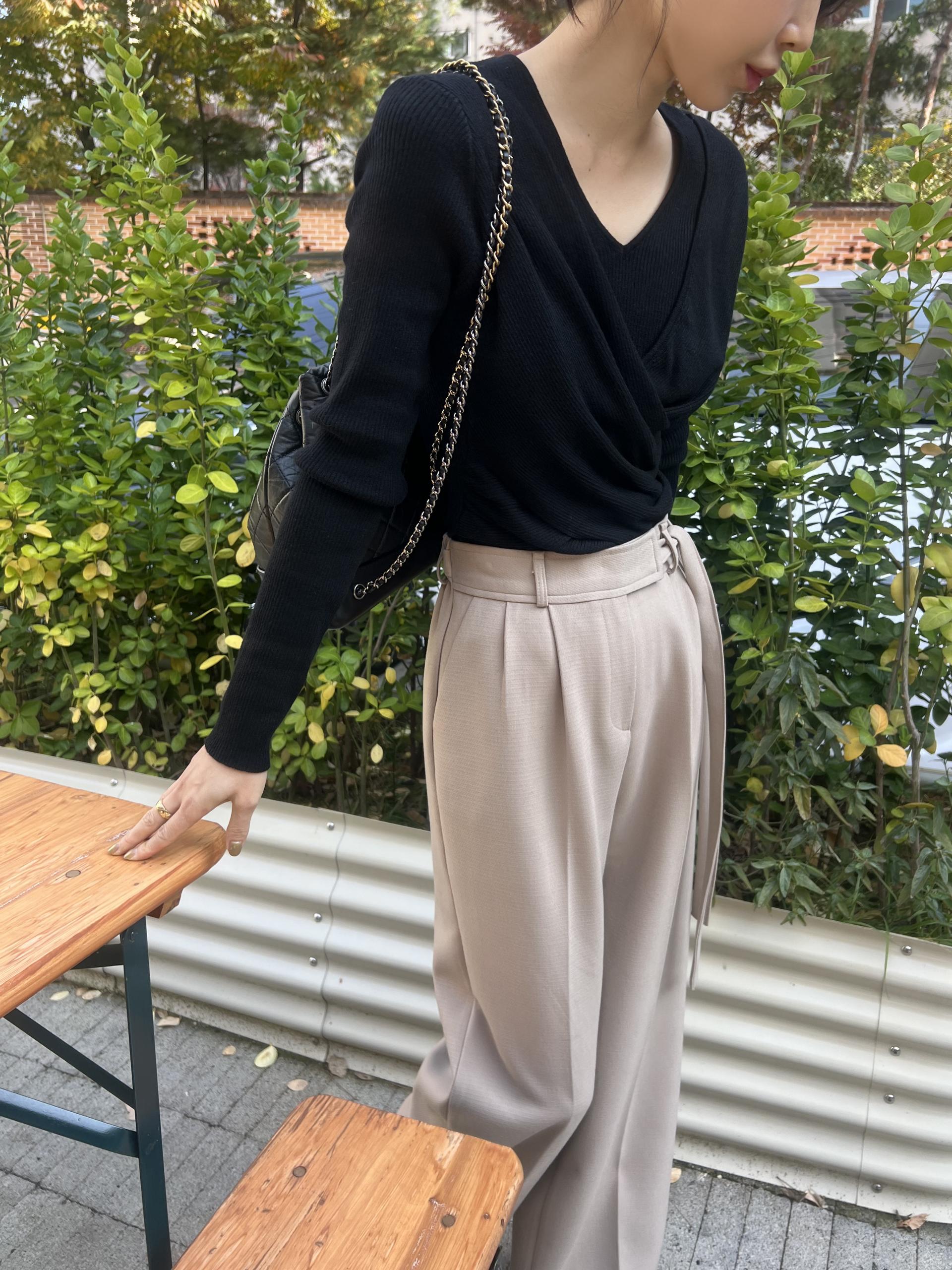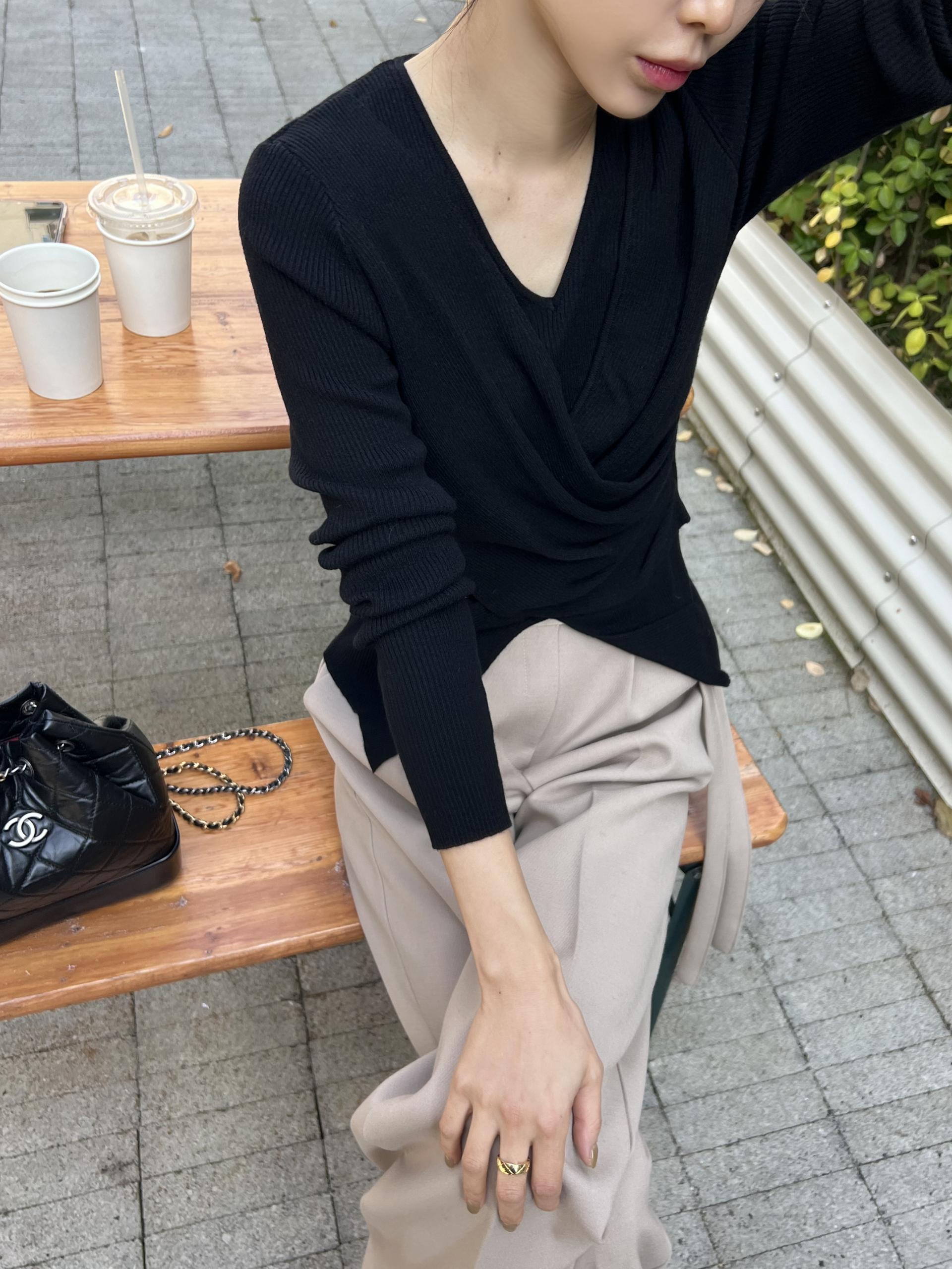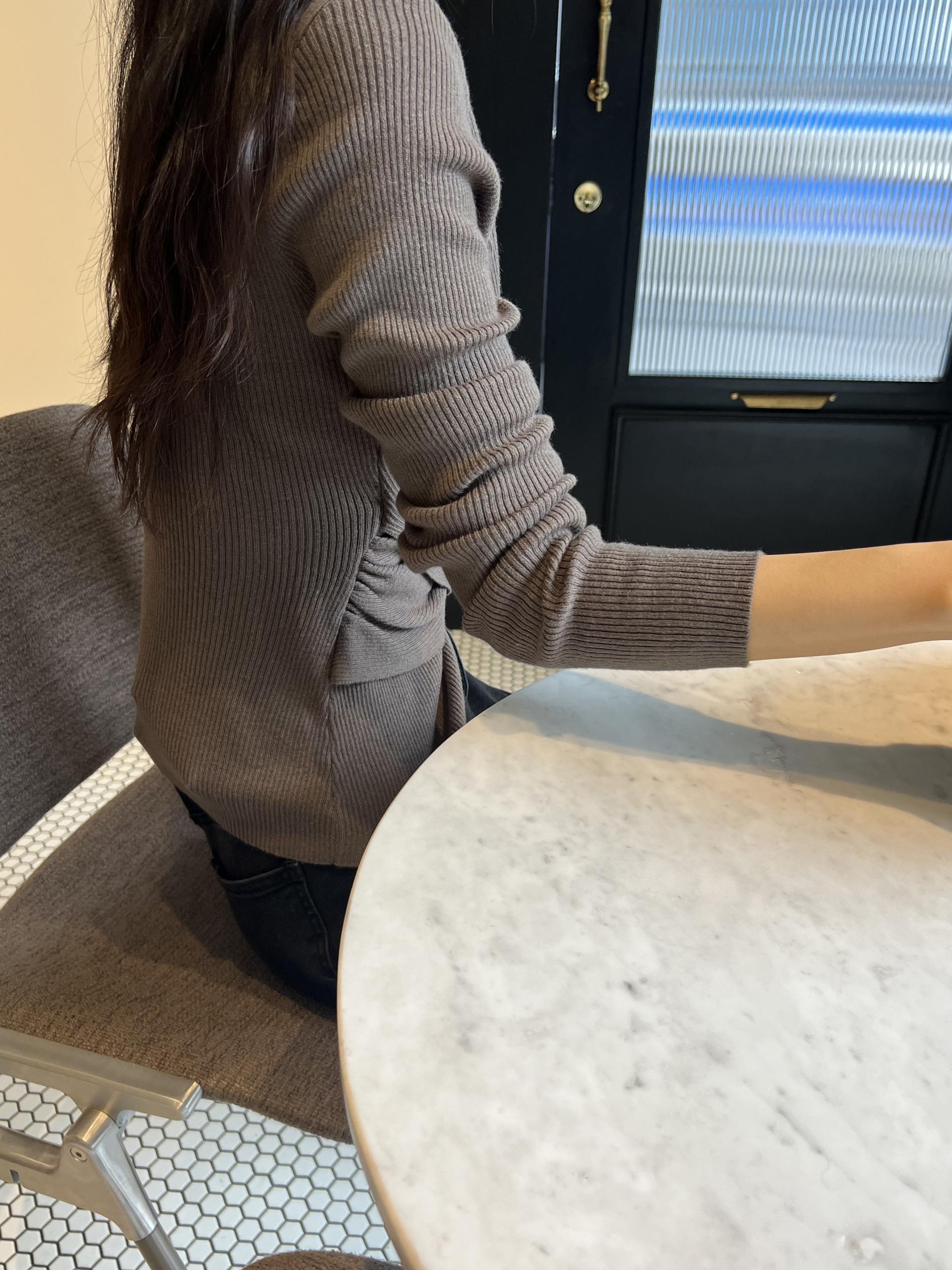 슬림한 핏인데, 앞 셔링이 있어 가슴은 볼륨 있어 보이면서 앞 뱃살은 커버가 되고, 또 트임이 있어 허리는 더 가늘어 보였어요. 소매 기장도 길어서 더 여리 핏 !! 팔도 더 말라 보였습니다. 겨울에 이너 니트로 입기 딱 좋고, 봄이나 가을에는 단독으로 입어도 좋아요.