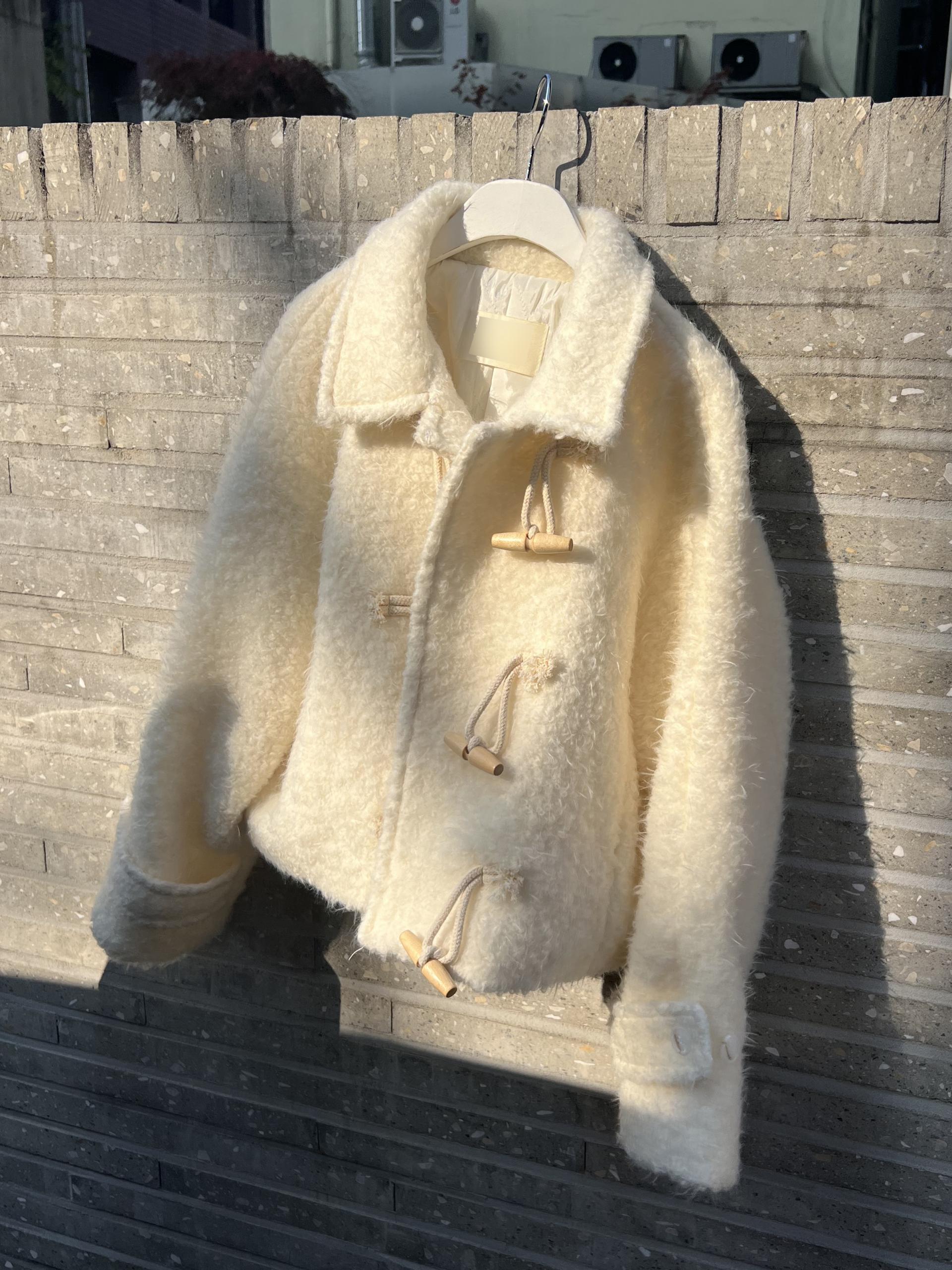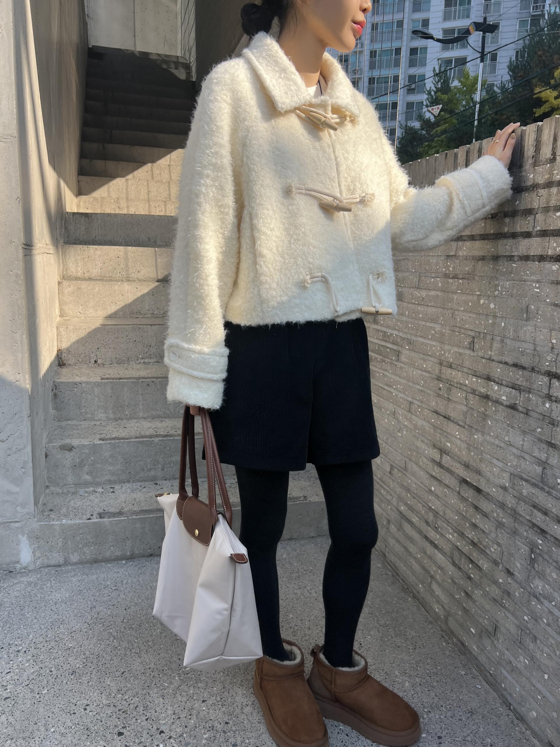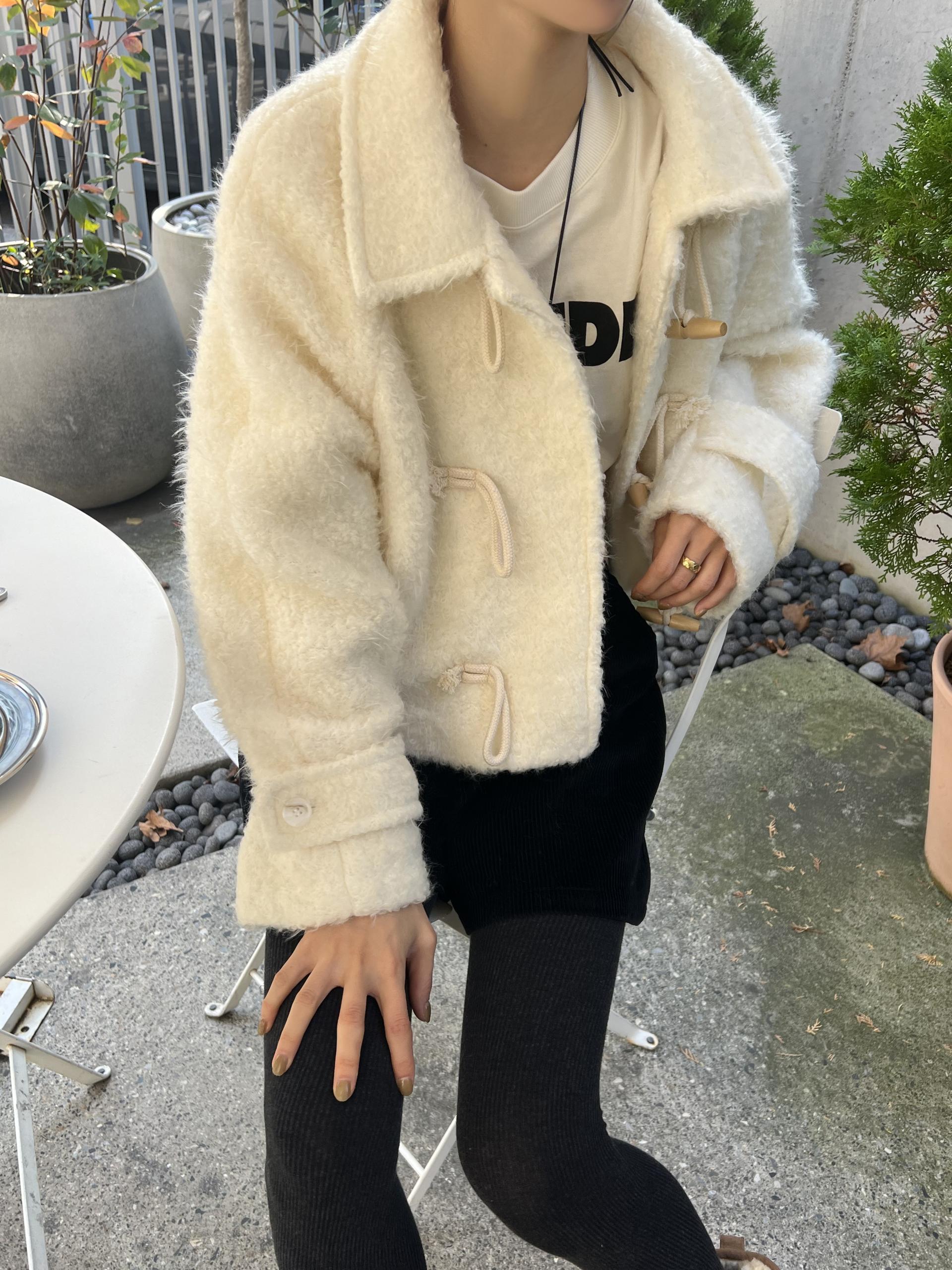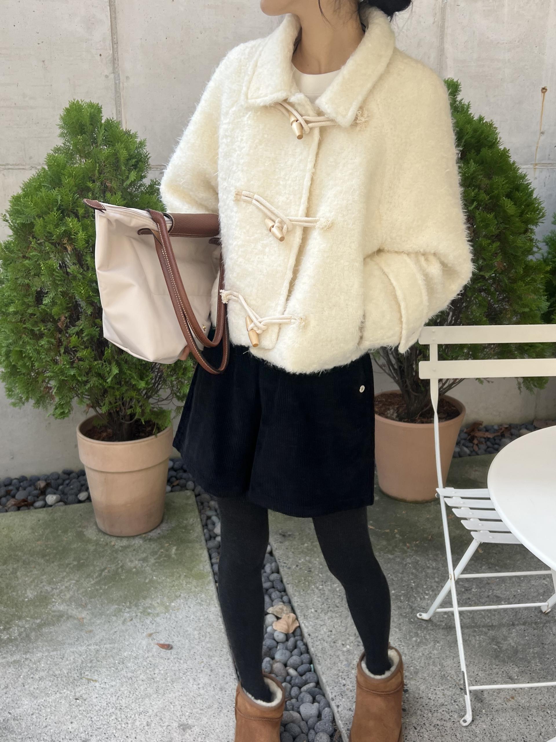 토글 혹은 떡볶이 단추라 불리는 단추 디자인이 포인트로, 귀여우면서 편안한 느낌을 줍니다. 또 짧은 기장감에 대비되는 긴 소매로 아웃핏이 더욱 예쁘게 잡혀요.