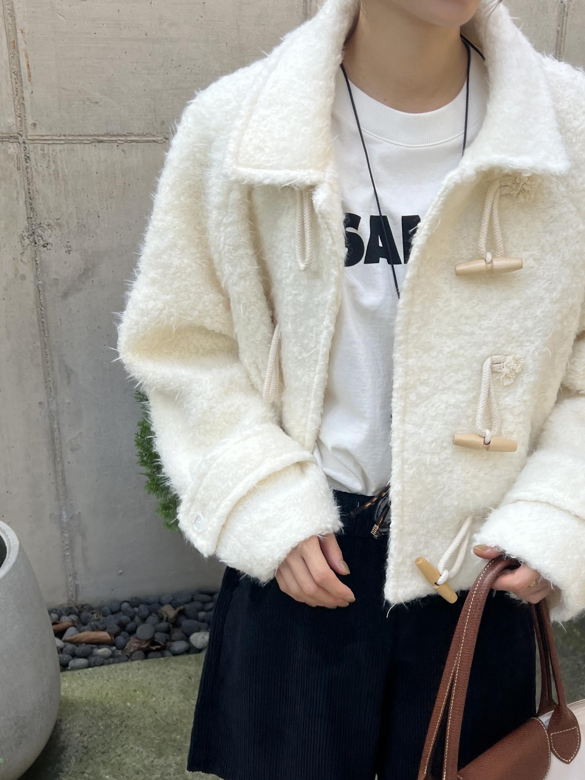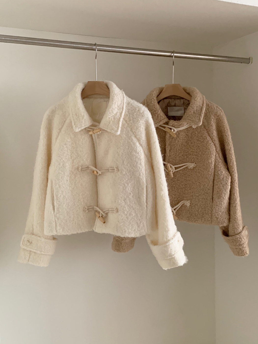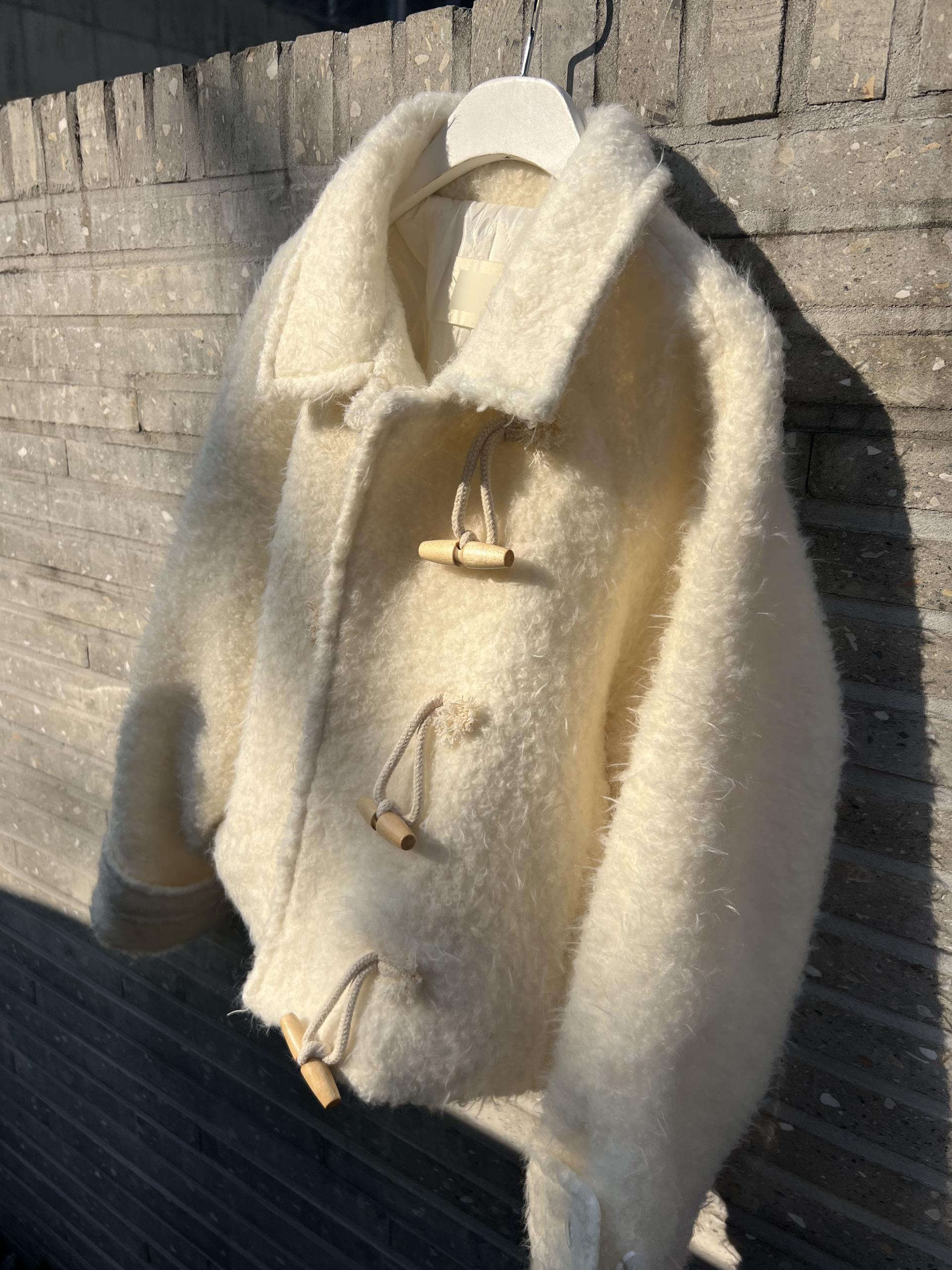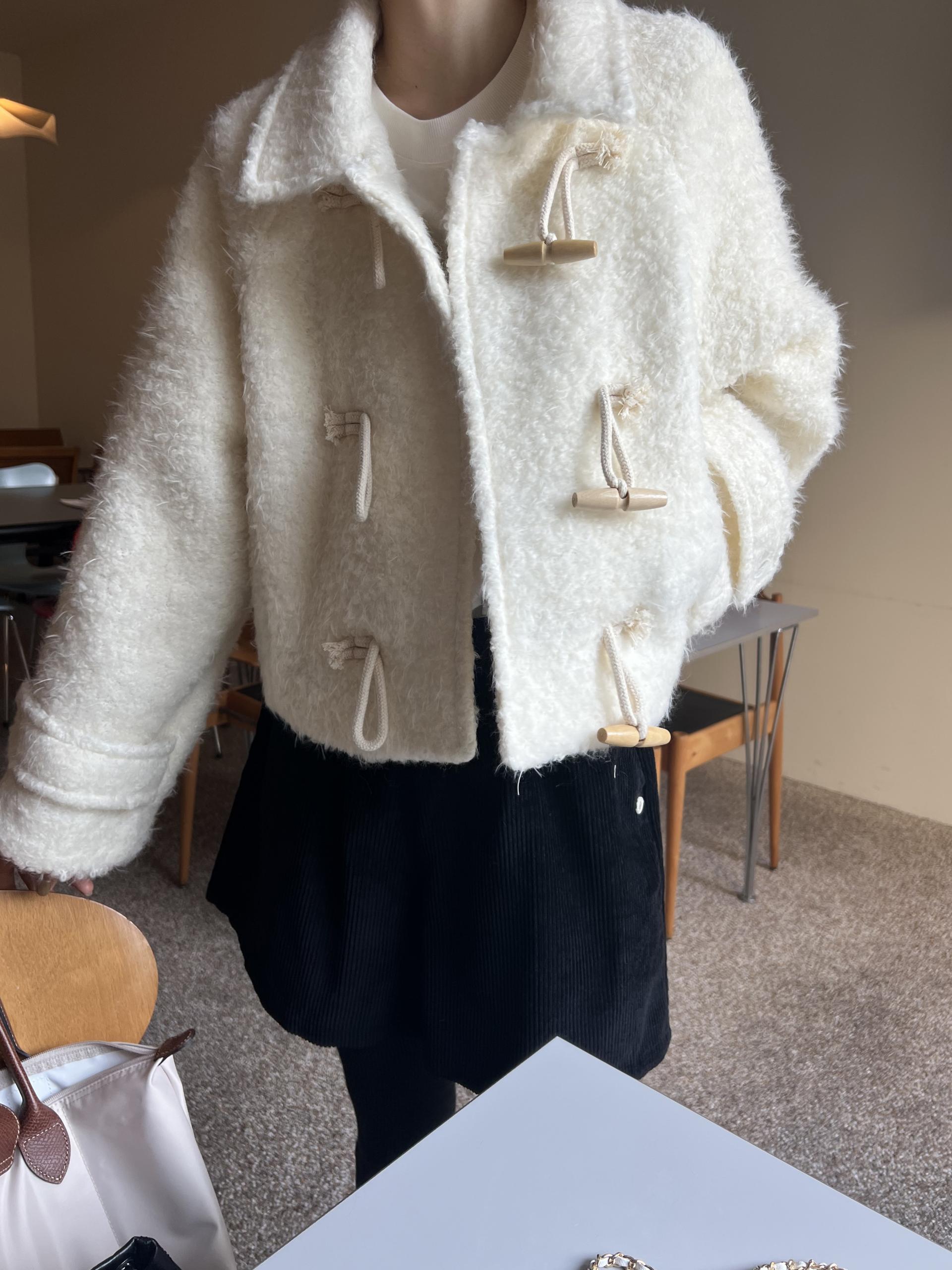 토글 혹은 떡볶이 단추라 불리는 단추 디자인이 포인트로, 귀여우면서 편안한 느낌을 줍니다. 또 짧은 기장감에 대비되는 긴 소매로 아웃핏이 더욱 예쁘게 잡혀요.