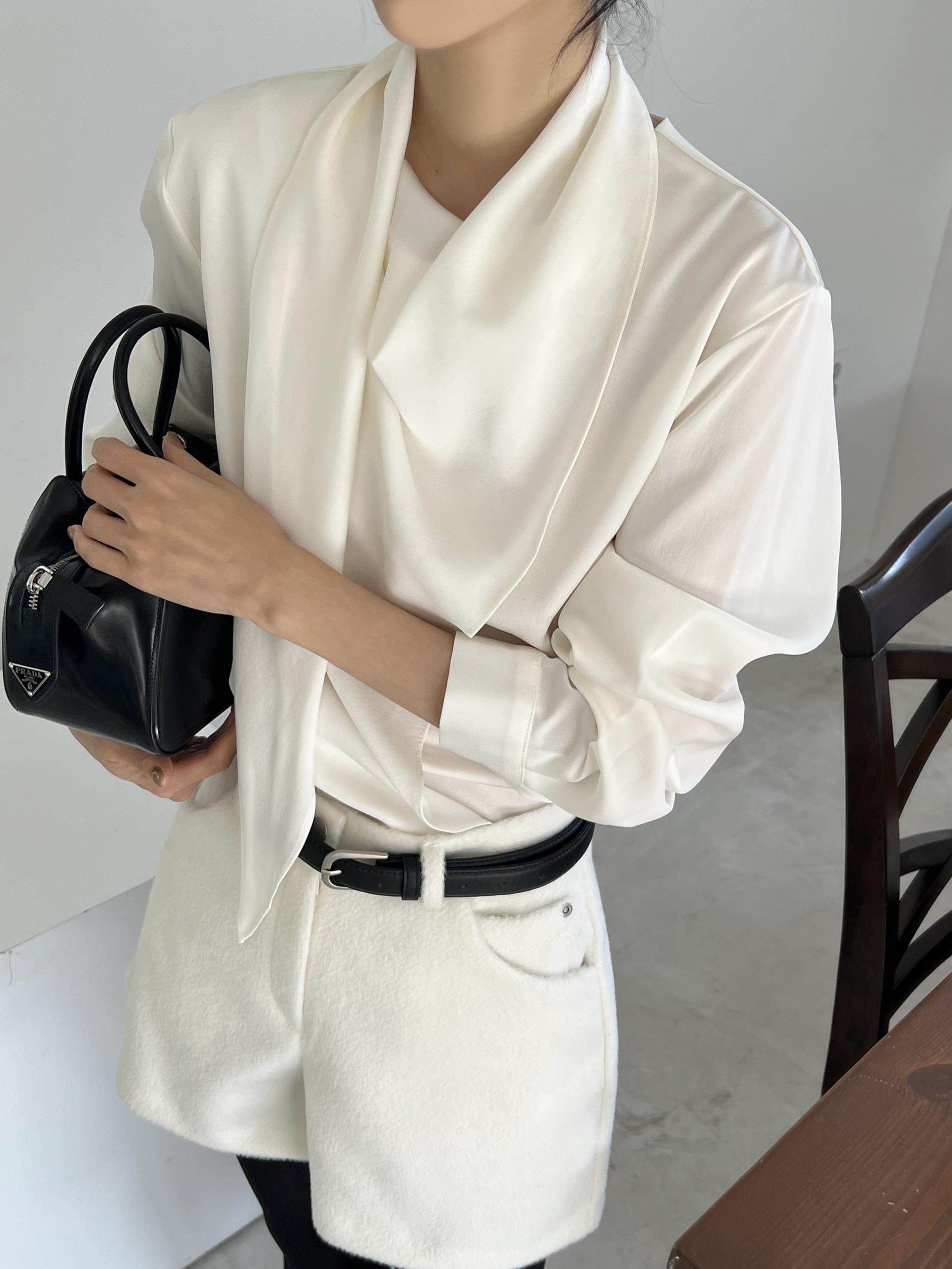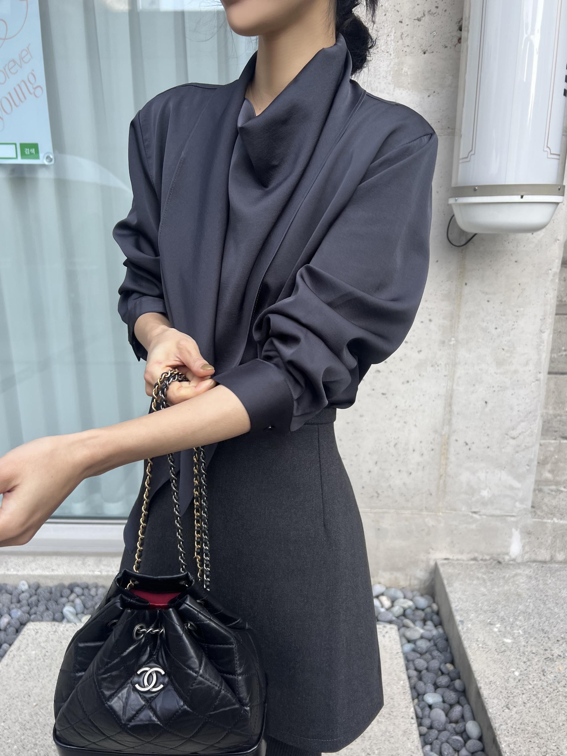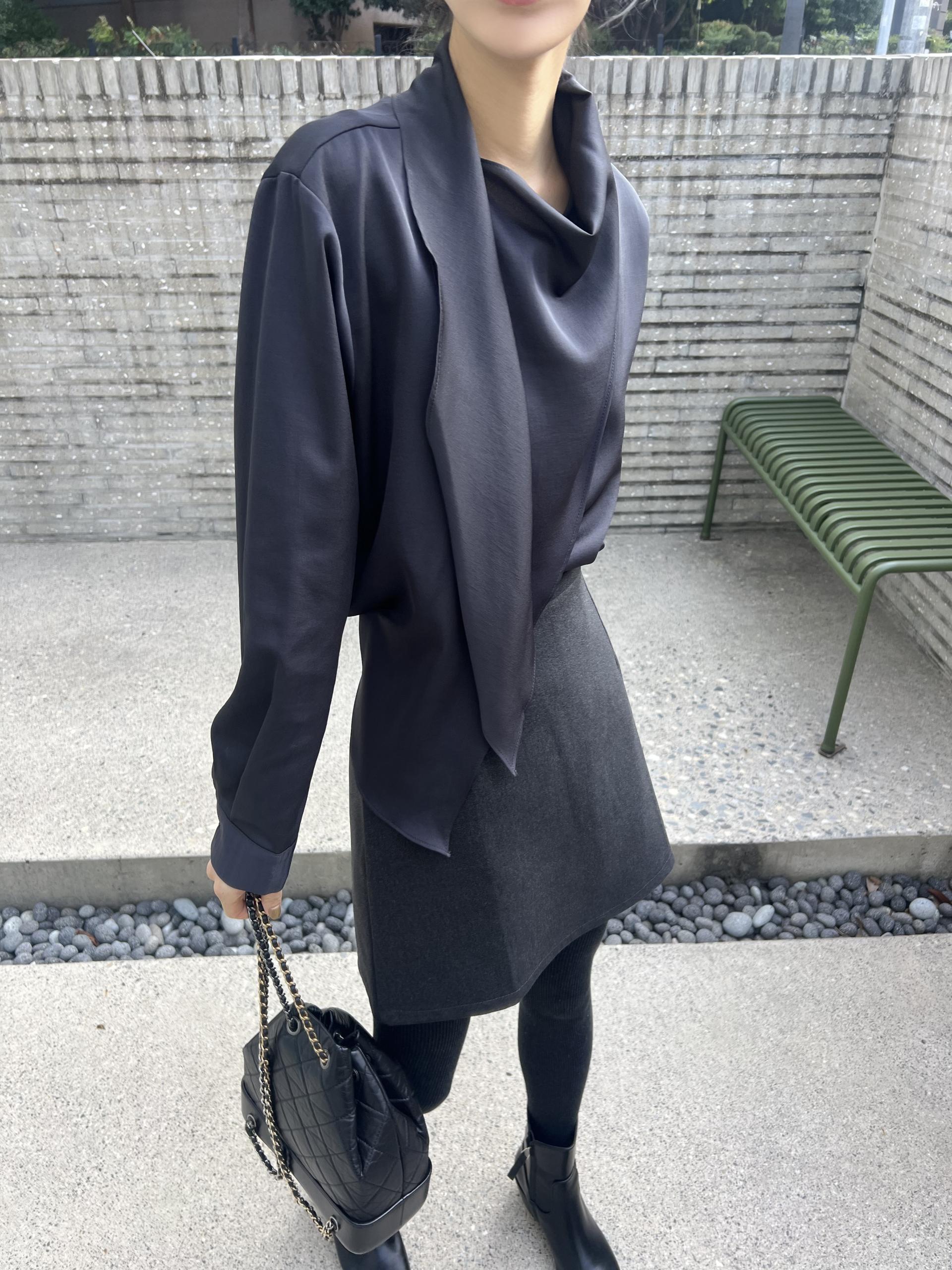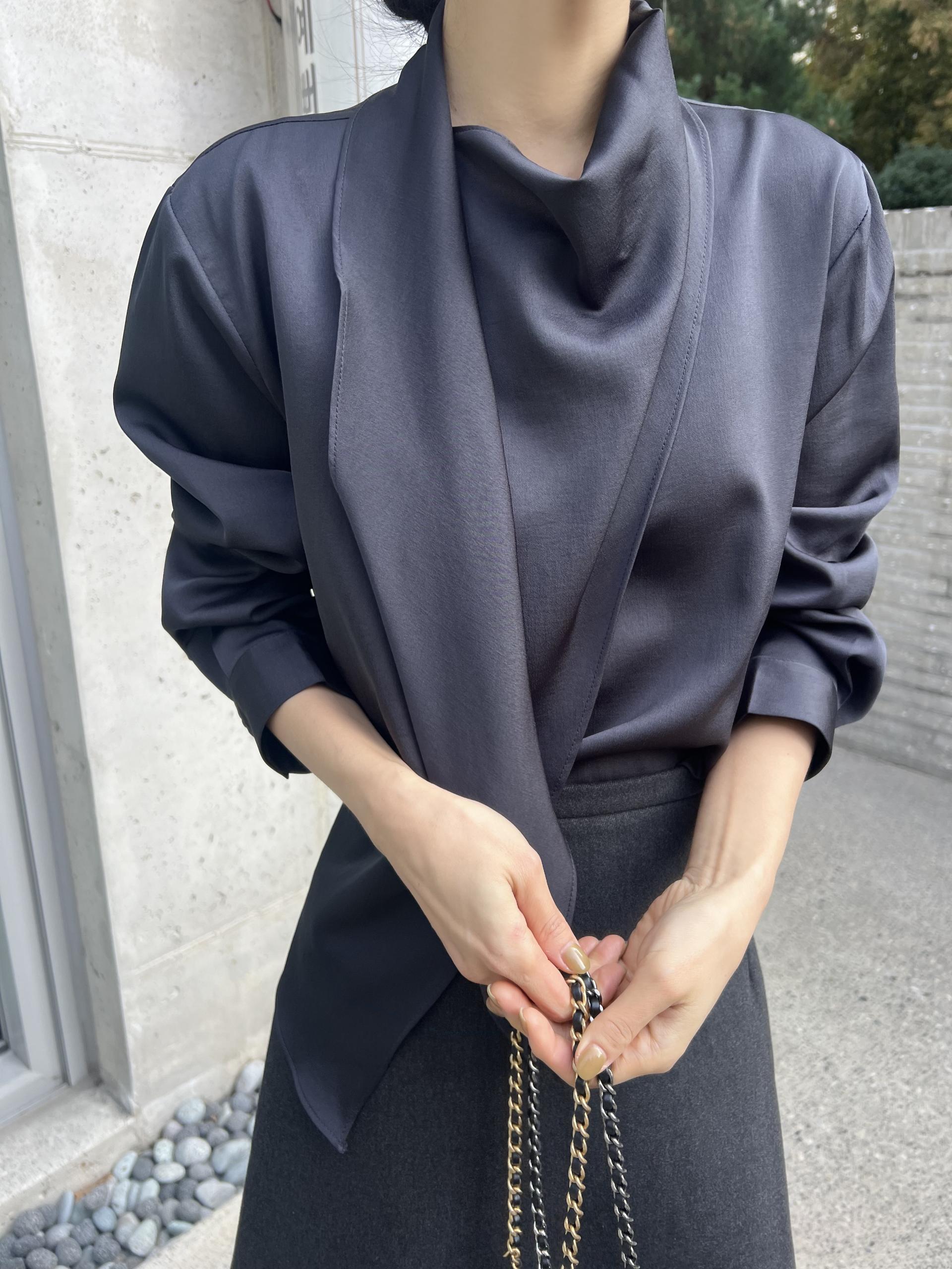 숄처럼 두르는 형태로 타이를 연출하시면 됩니다. 길게 늘어뜨려도 좋고, 한 번 더 감아 짧게 연출해 주셔도 좋아요. 단독으로 입었을 때 전면에 잡히는 드레이프가 특히 고급미 철철 !!