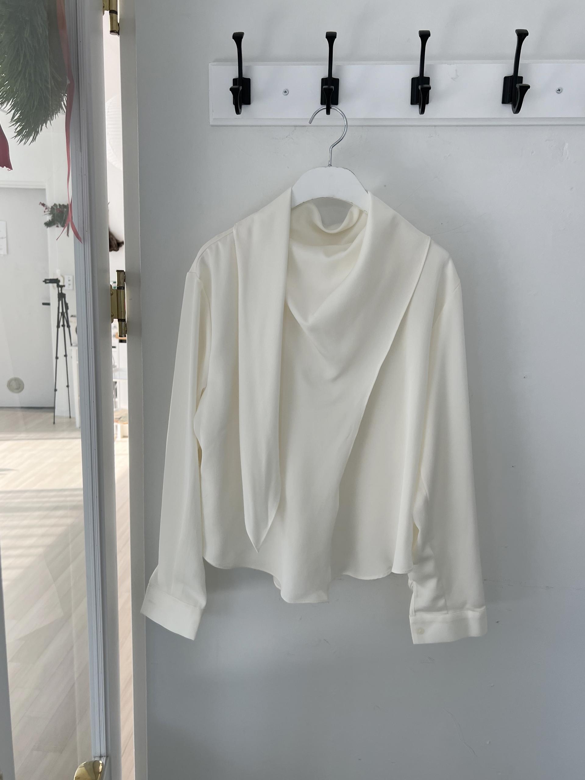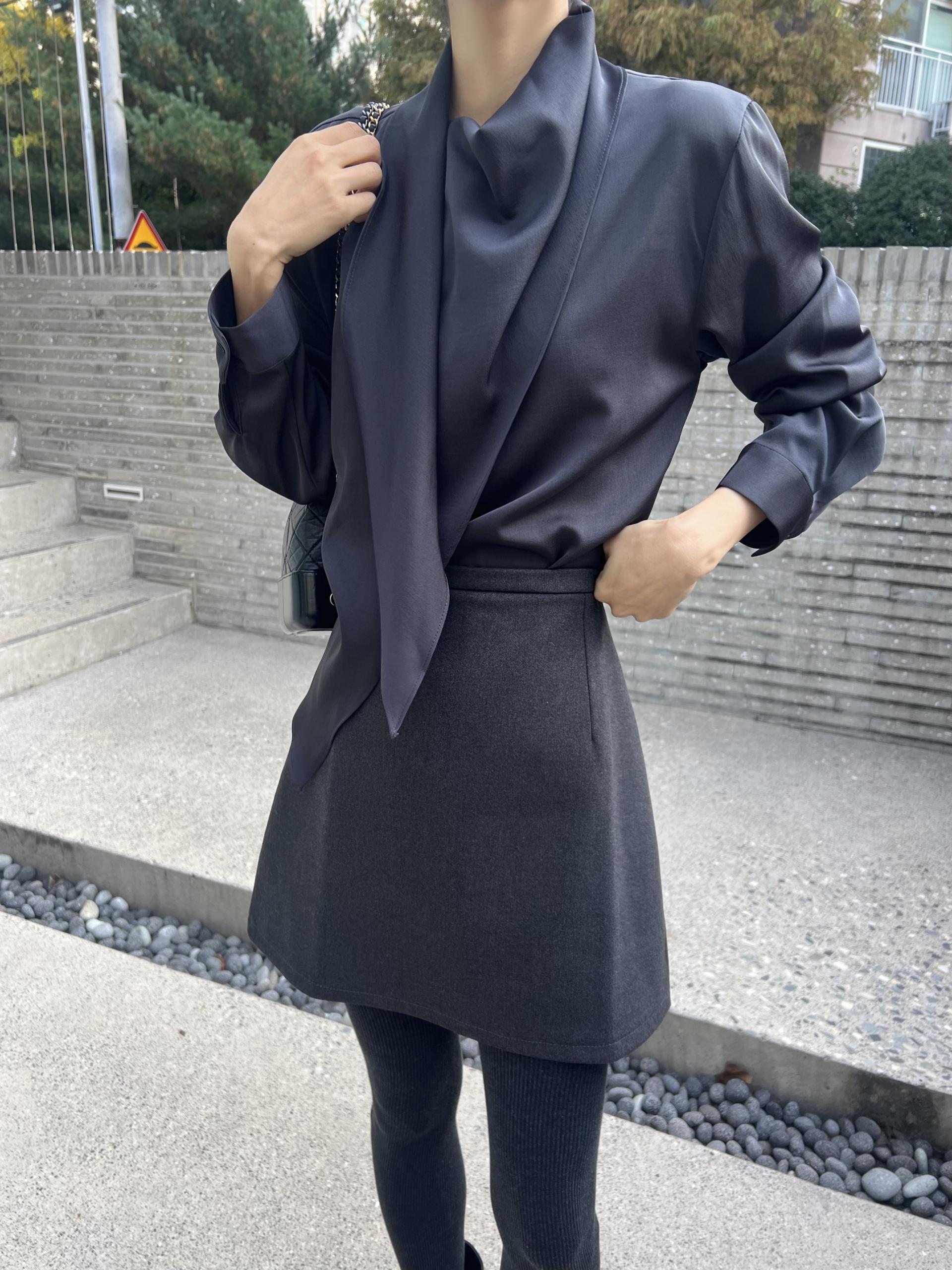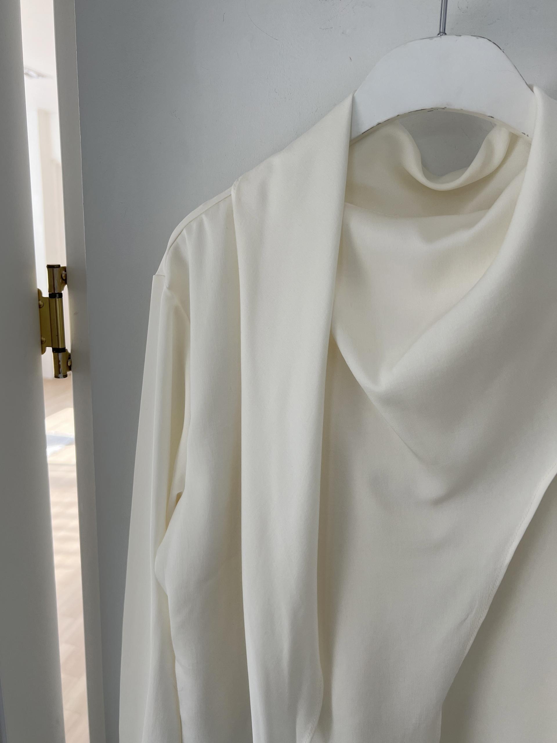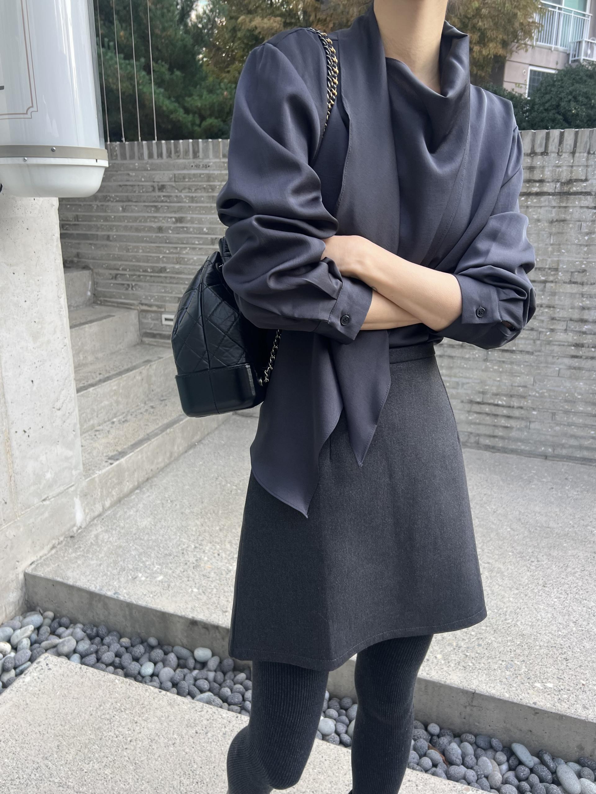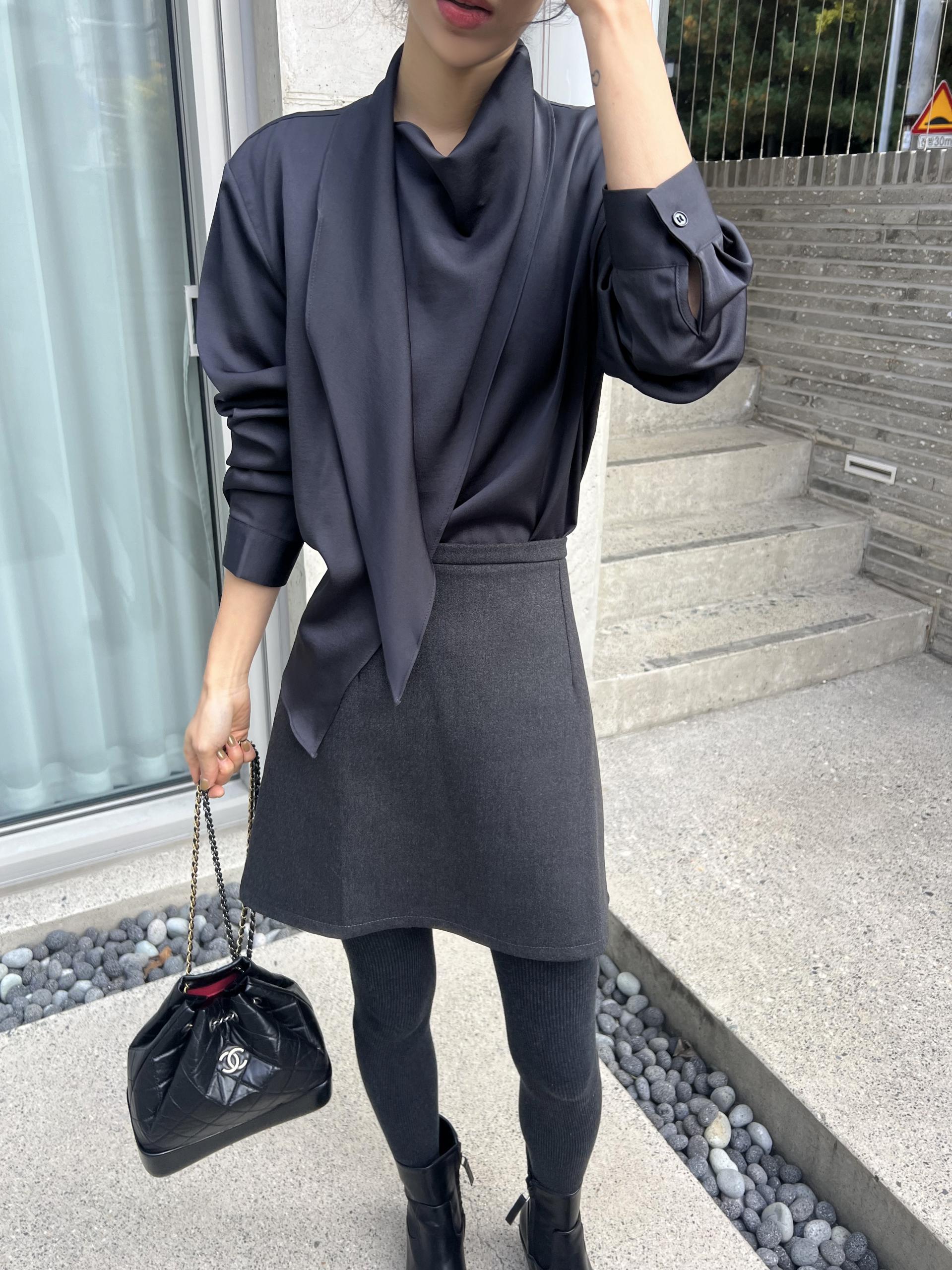 숄처럼 두르는 형태로 타이를 연출하시면 됩니다. 길게 늘어뜨려도 좋고, 한 번 더 감아 짧게 연출해 주셔도 좋아요. 단독으로 입었을 때 전면에 잡히는 드레이프가 특히 고급미 철철 !!