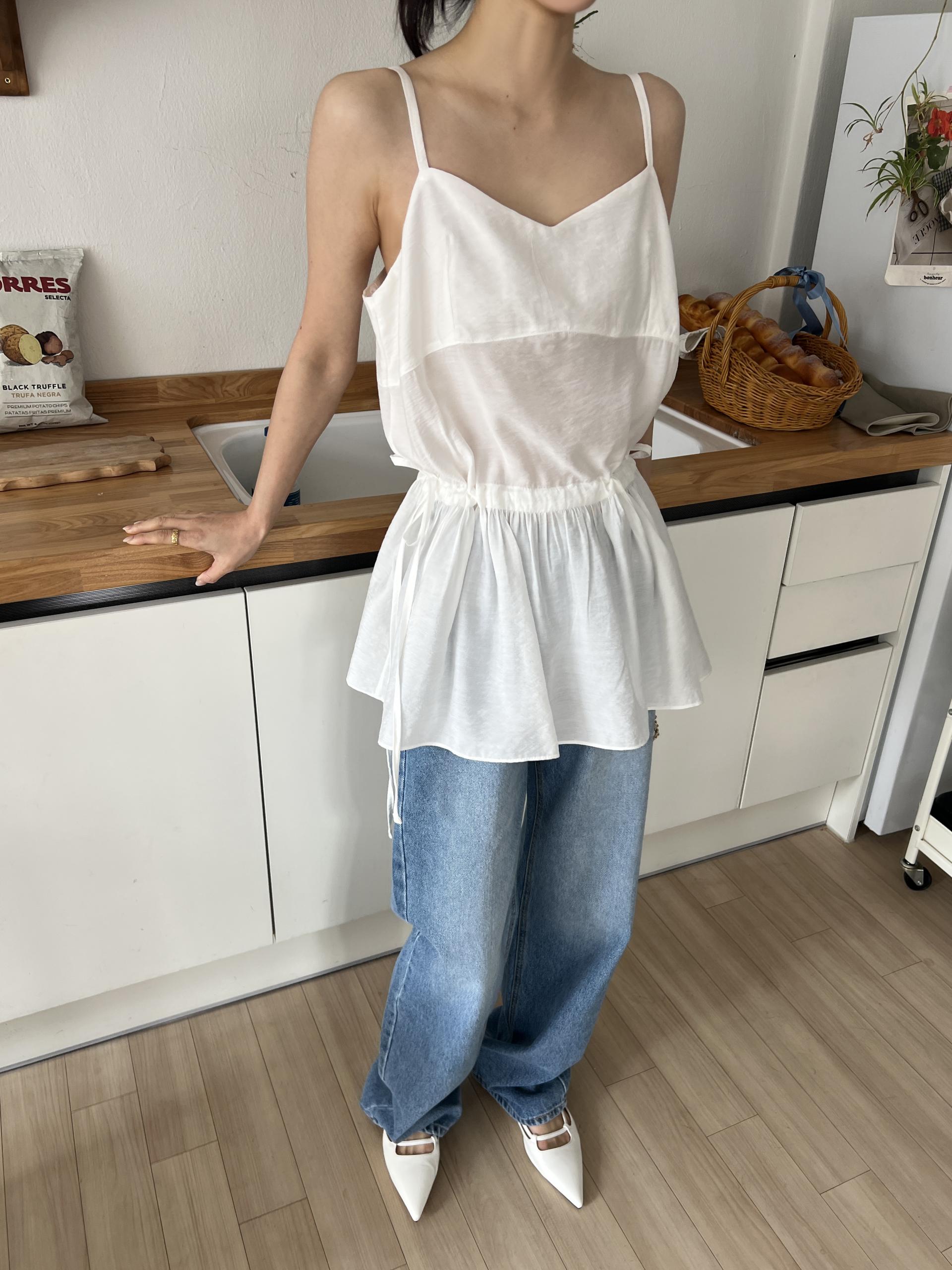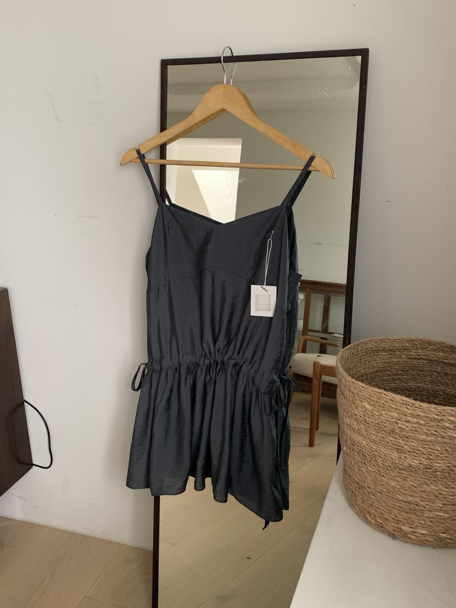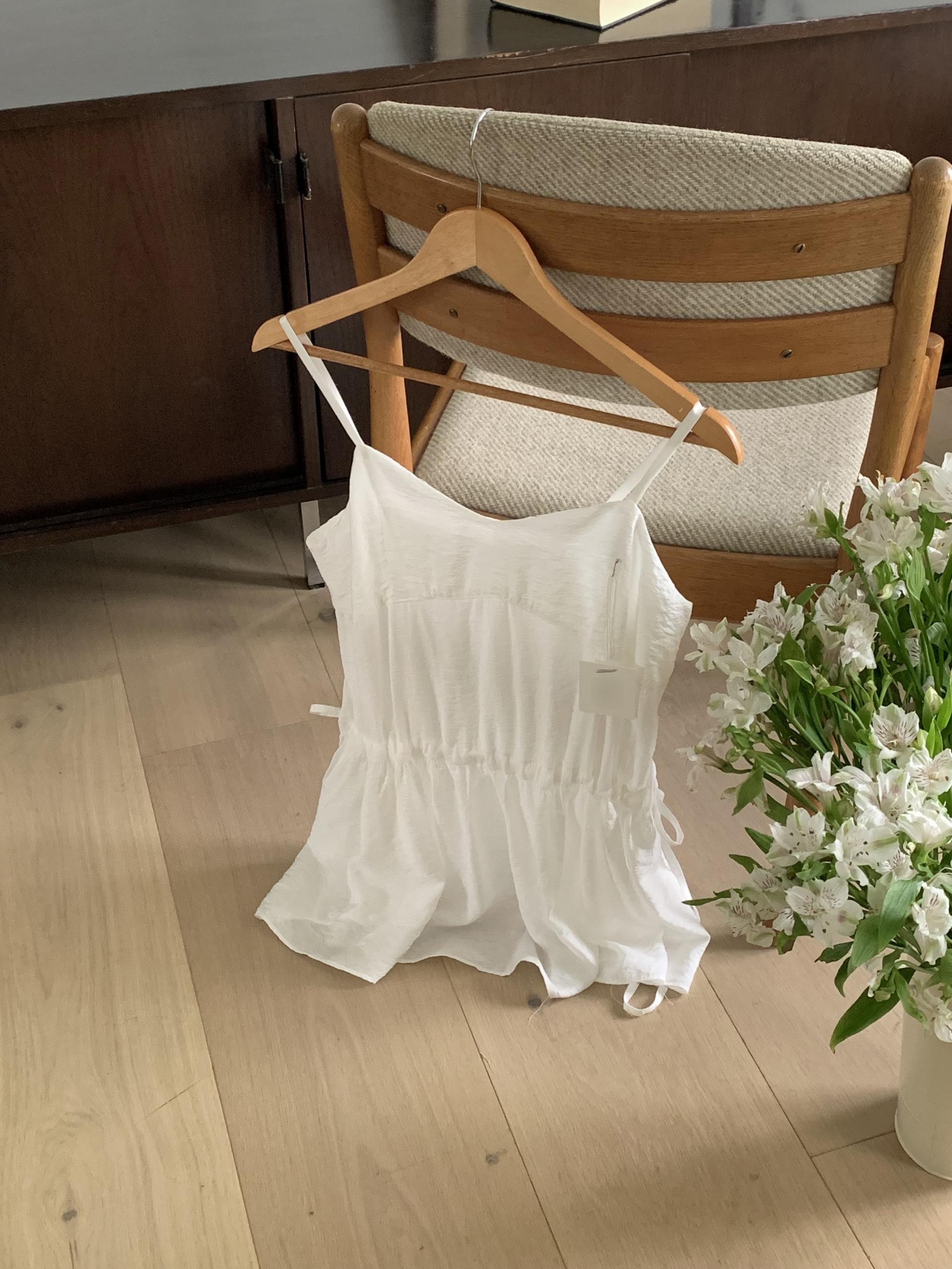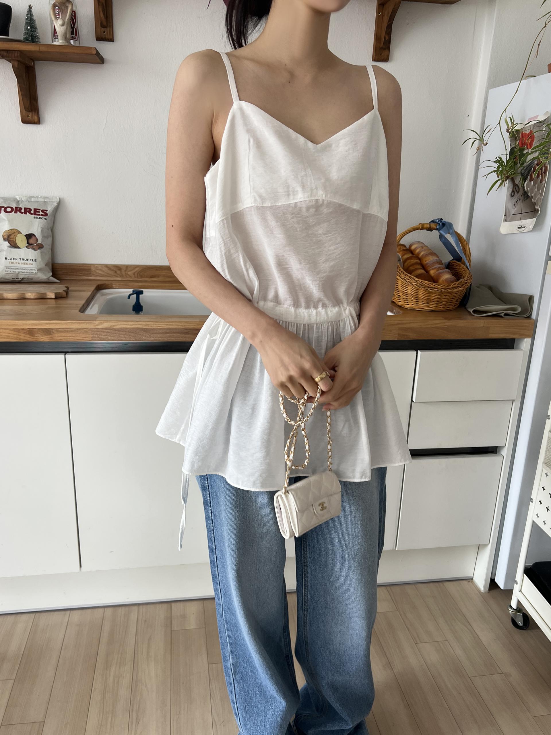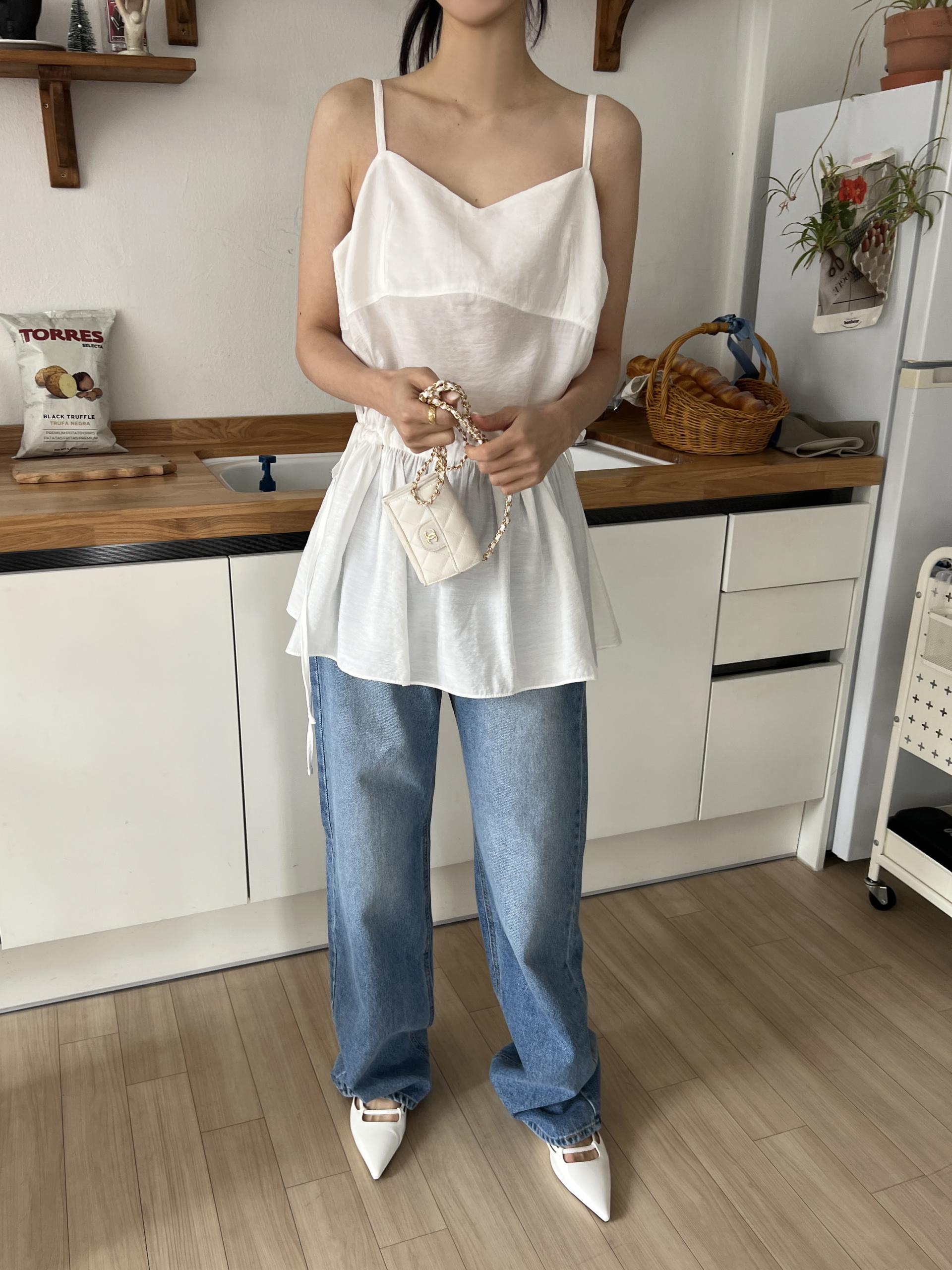 허리 양쪽의 끈을 쪼아 셔링과 라인을 잡을 수 있어 취향에 맞게 핏을 연출하시면 됩니다. 실크 같은 여리한 소재감으로 봄, 여름 시즌 무한히 활용하실 수 있을 거예요.