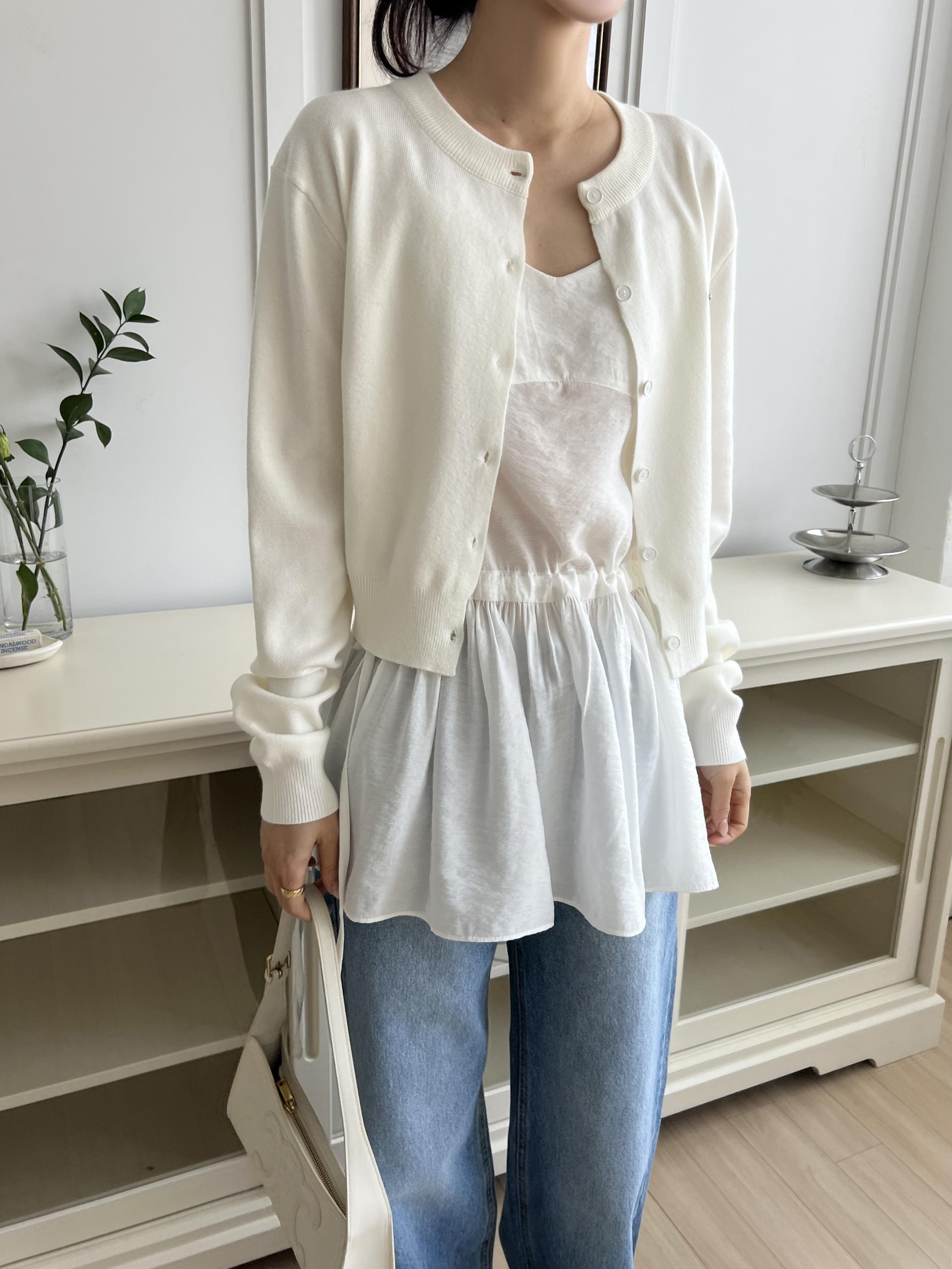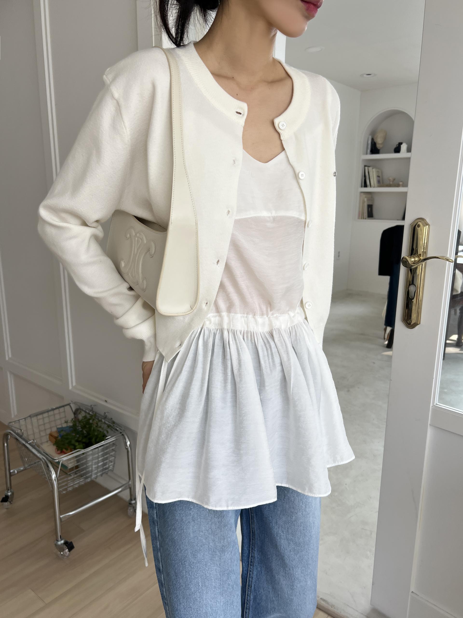 끈 나시에 힙을 덮는 하프 기장으로 크롭 기장의 상의와 레이어드하기 좋습니다. 뷔스티에 형태로 티셔츠나 니트, 셔츠 위에 레이어드하셔도 좋아요.