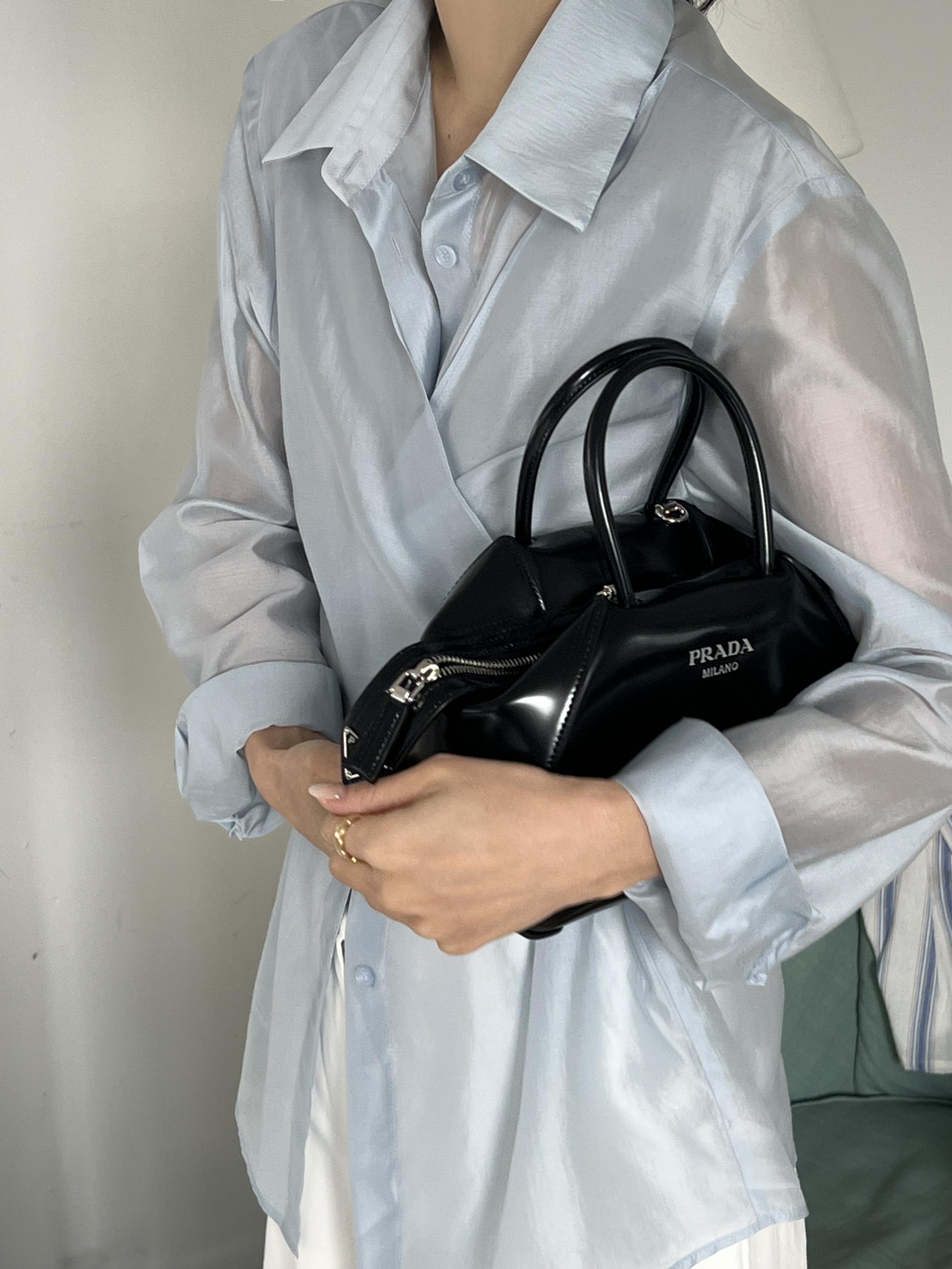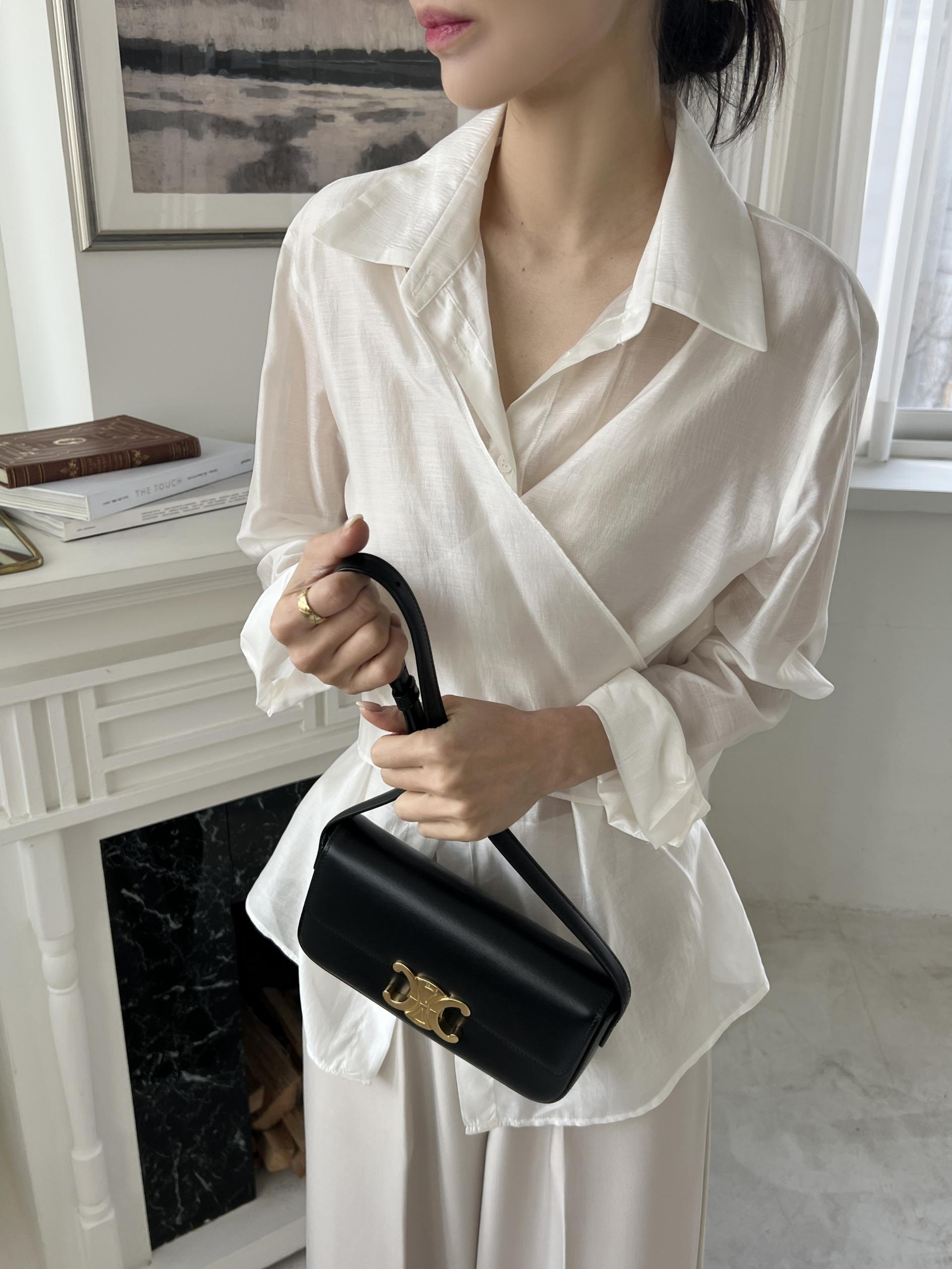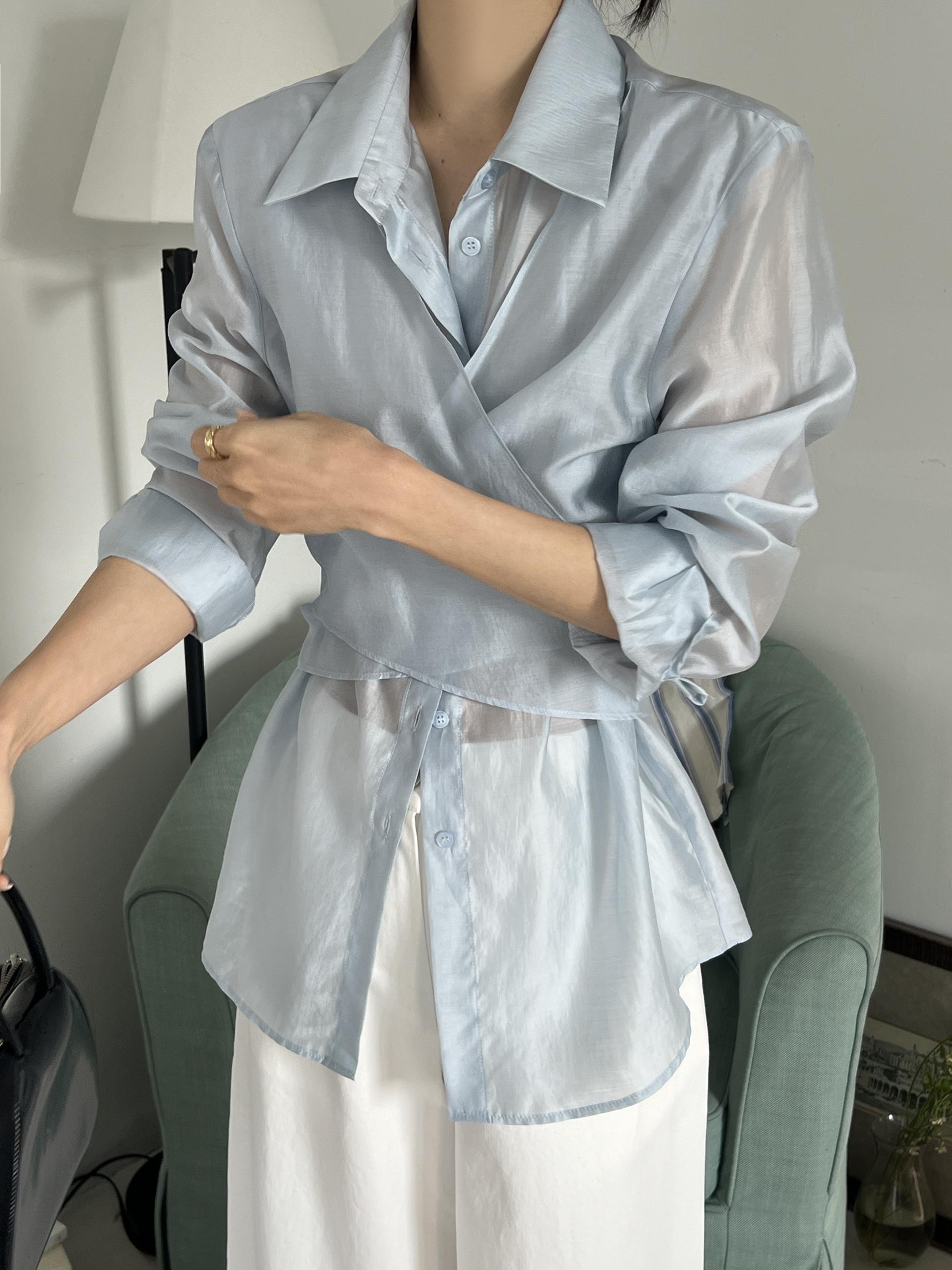 비침이 있는 시스루 소재에 실크 같은 은은한 광택감의 블라우스로 봄, 여름 시즌 착용하기 좋습니다.