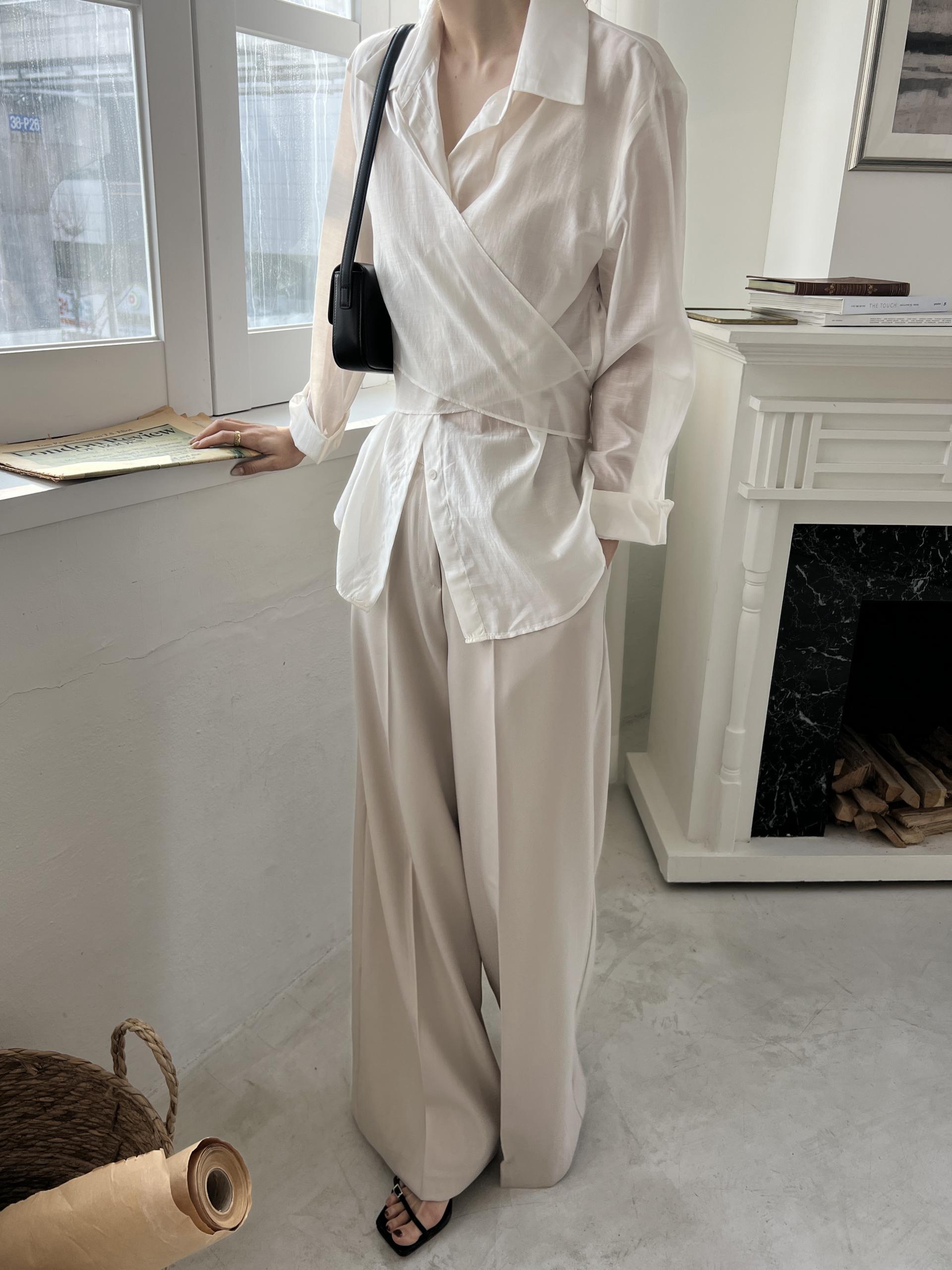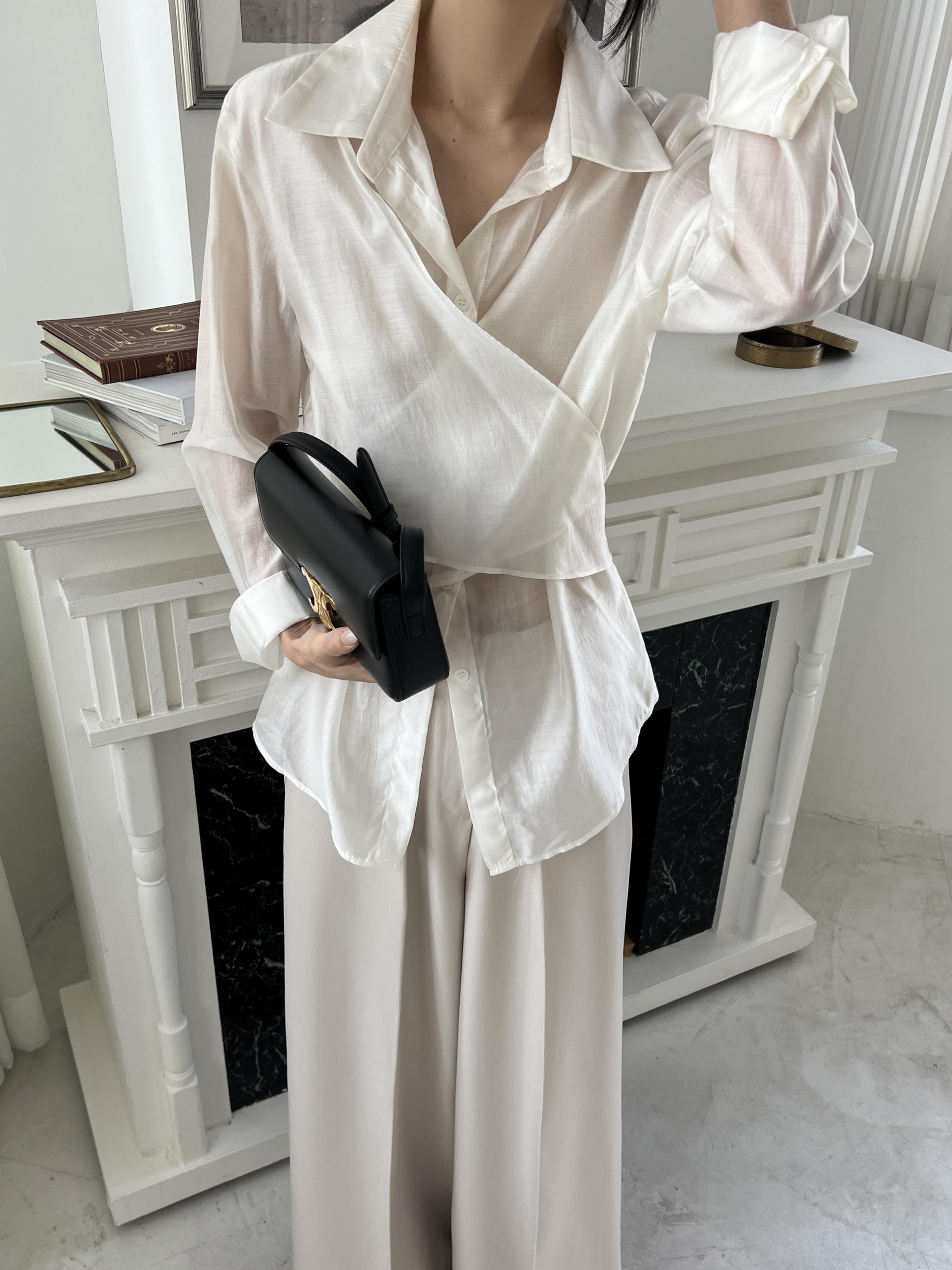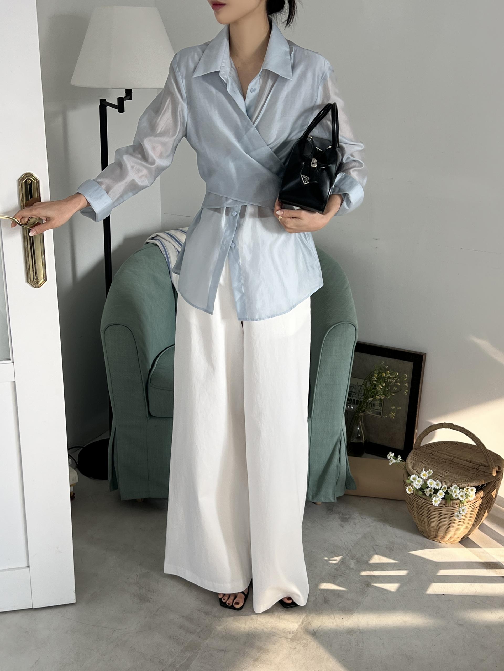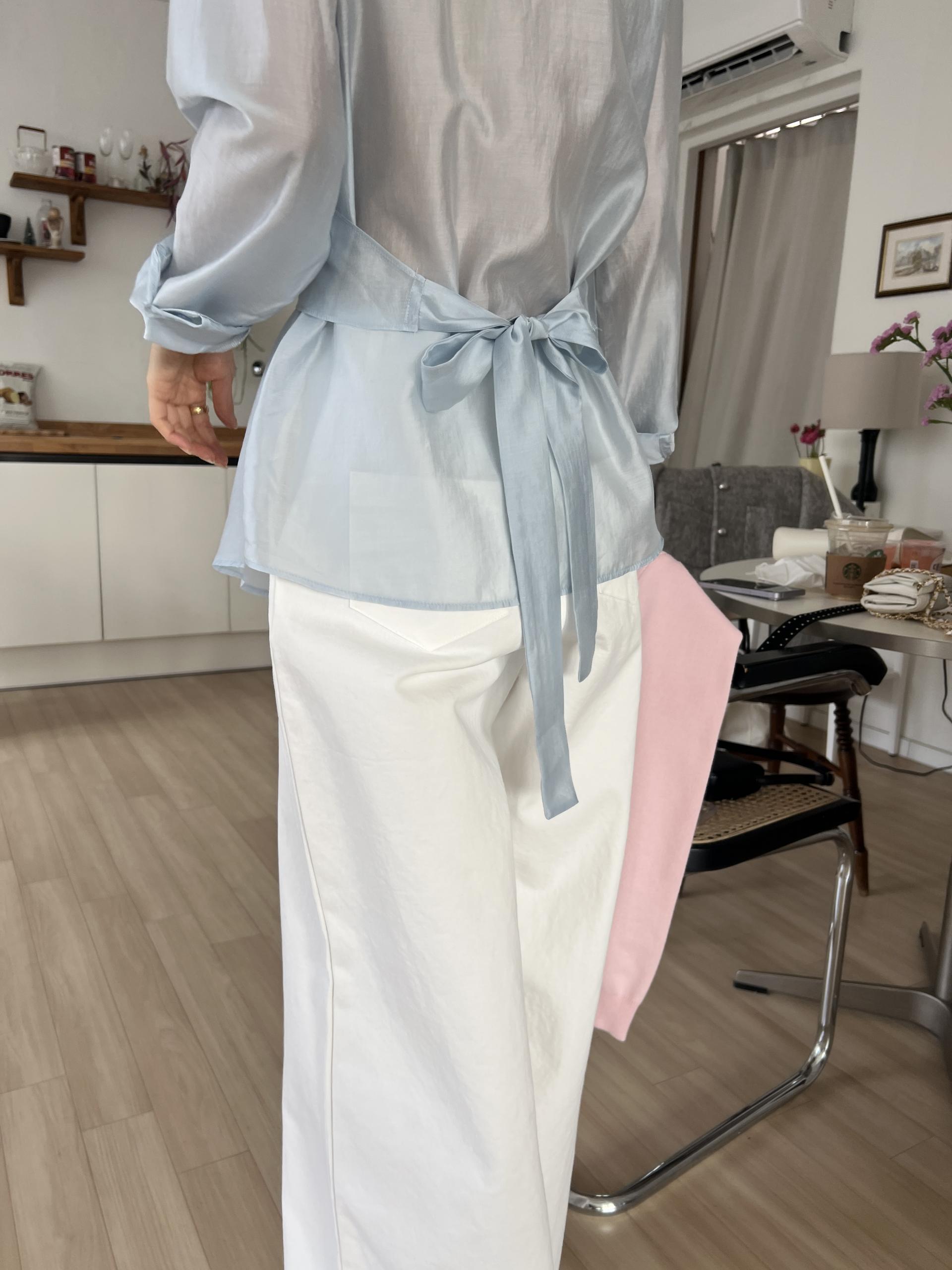 비침이 있는 시스루 소재에 실크 같은 은은한 광택감의 블라우스로 봄, 여름 시즌 착용하기 좋습니다.