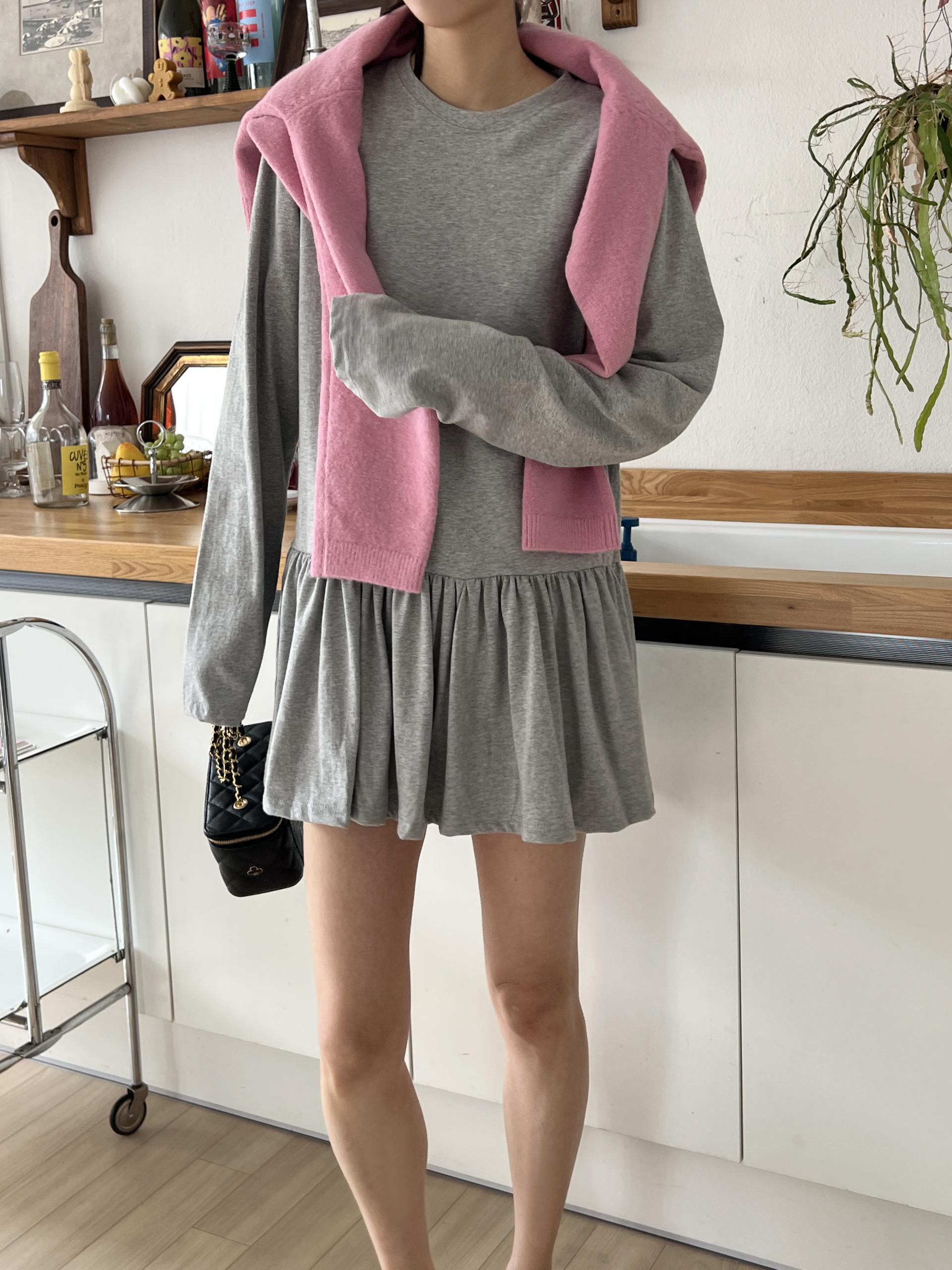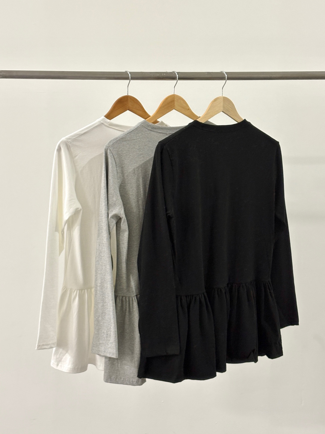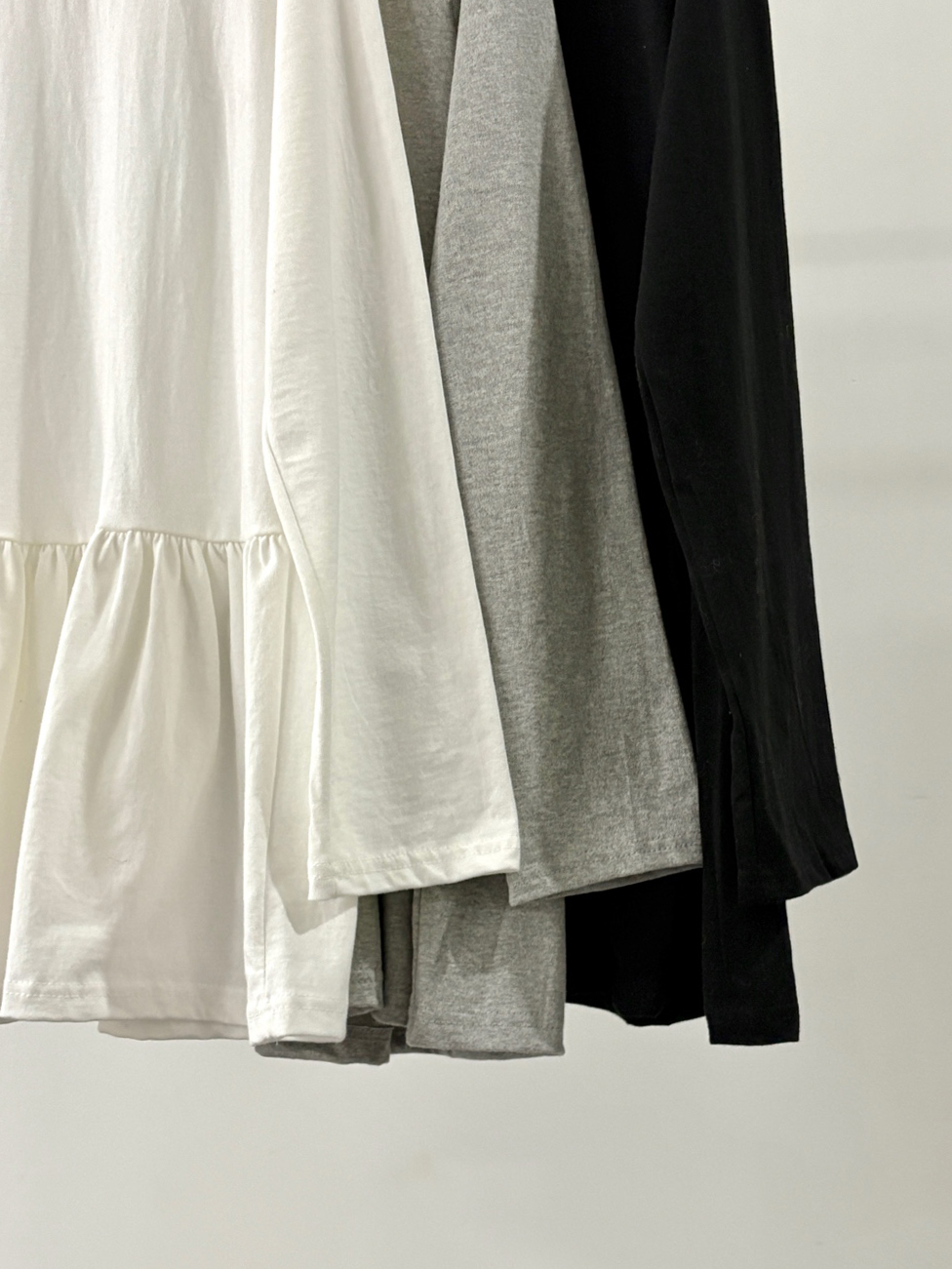 여리여리한 루즈핏에 밑단 프릴로 미니 원피스처럼 단독으로 착용하셔도 좋고, 청바지와 레이어드해 착용해도 좋아요.