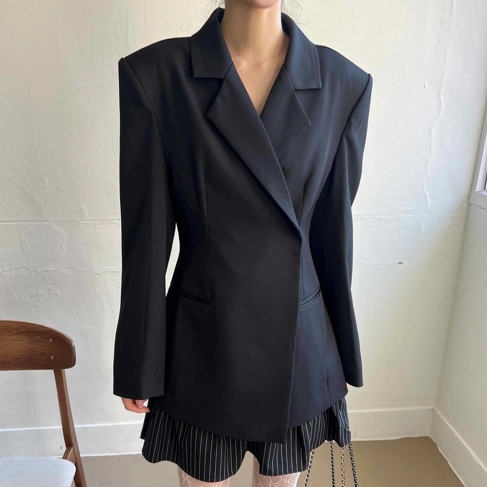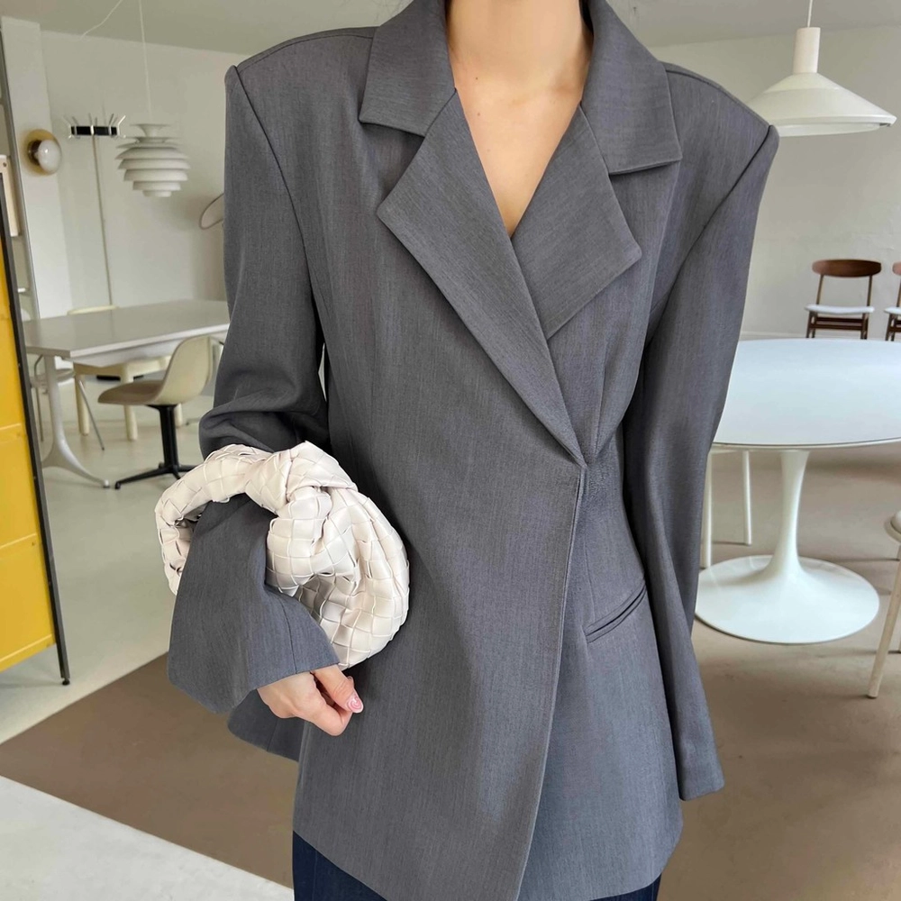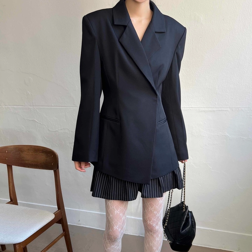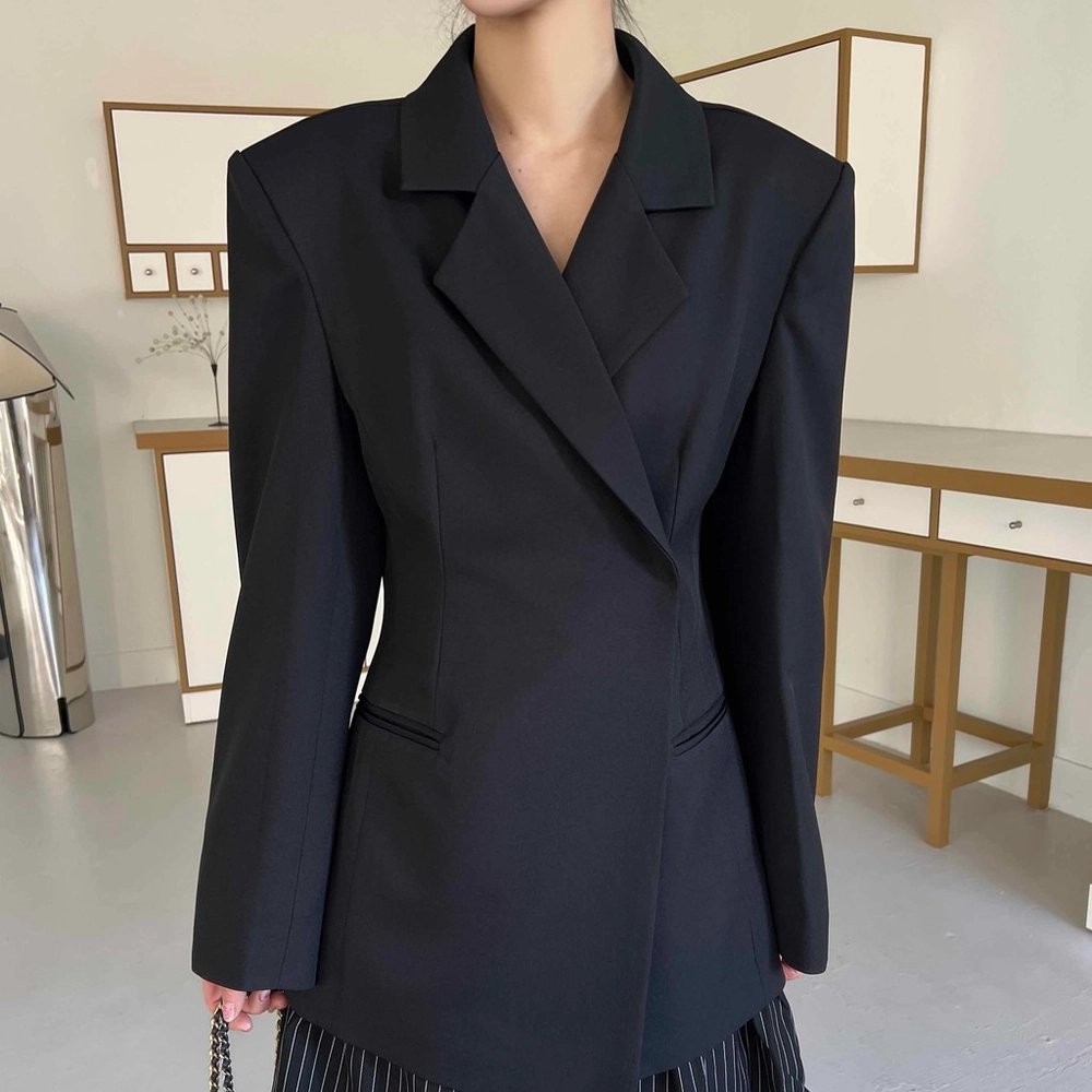 잘록한 허리 패턴으로 여성스러운 아워글래스 라인의 정장 자켓이에요. 세련된 테일러 카라로 격식이 있는 자리에도 잘 어울려 봄 하객룩이나 상견례룩, 오피스룩 등으로도 추천해요.