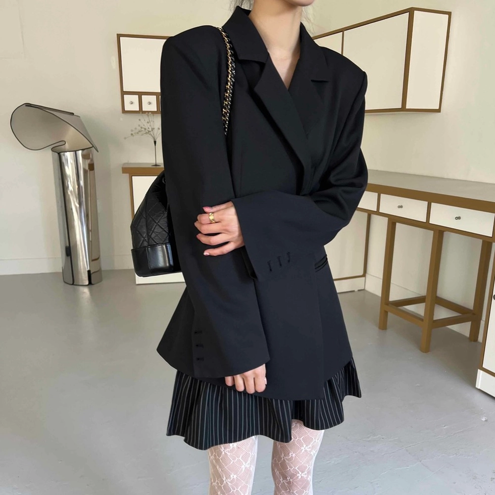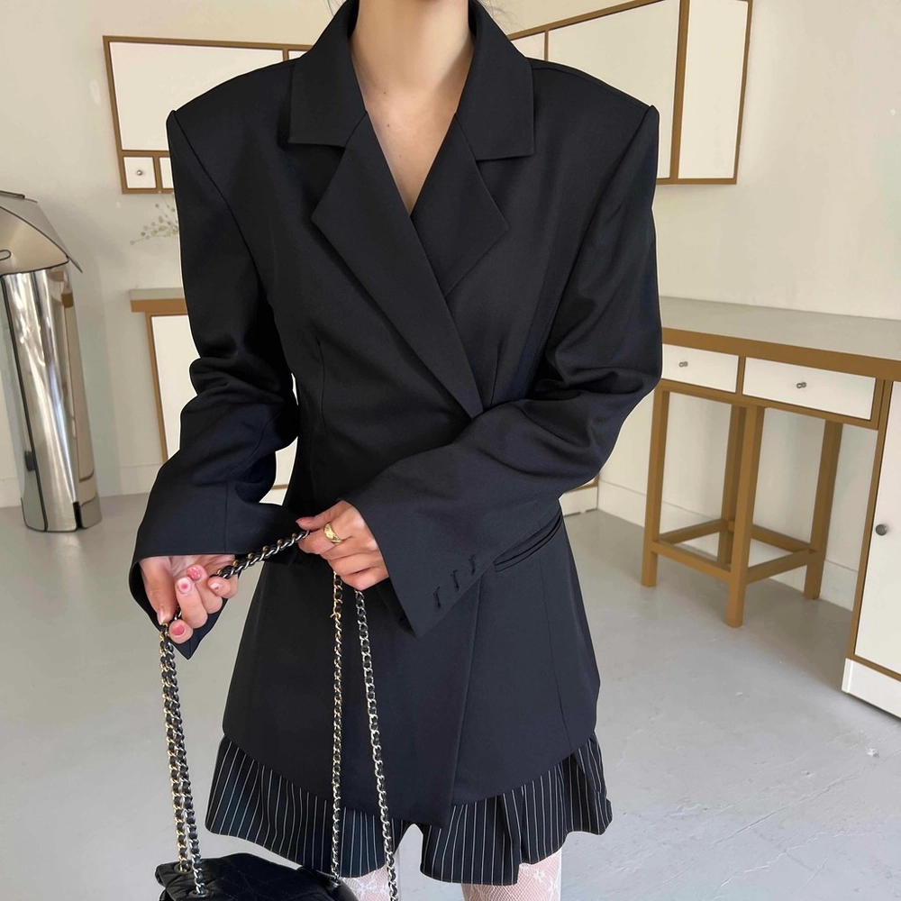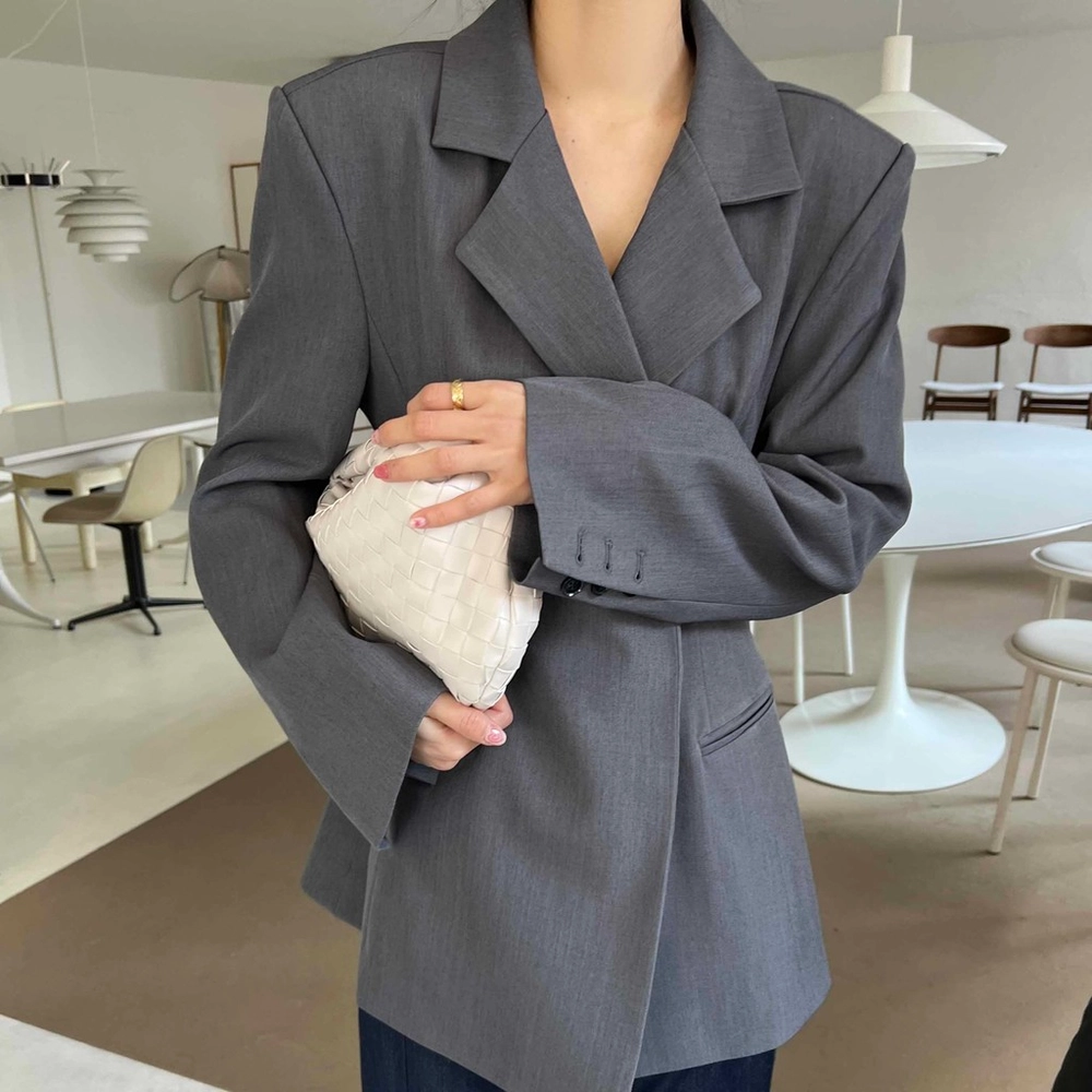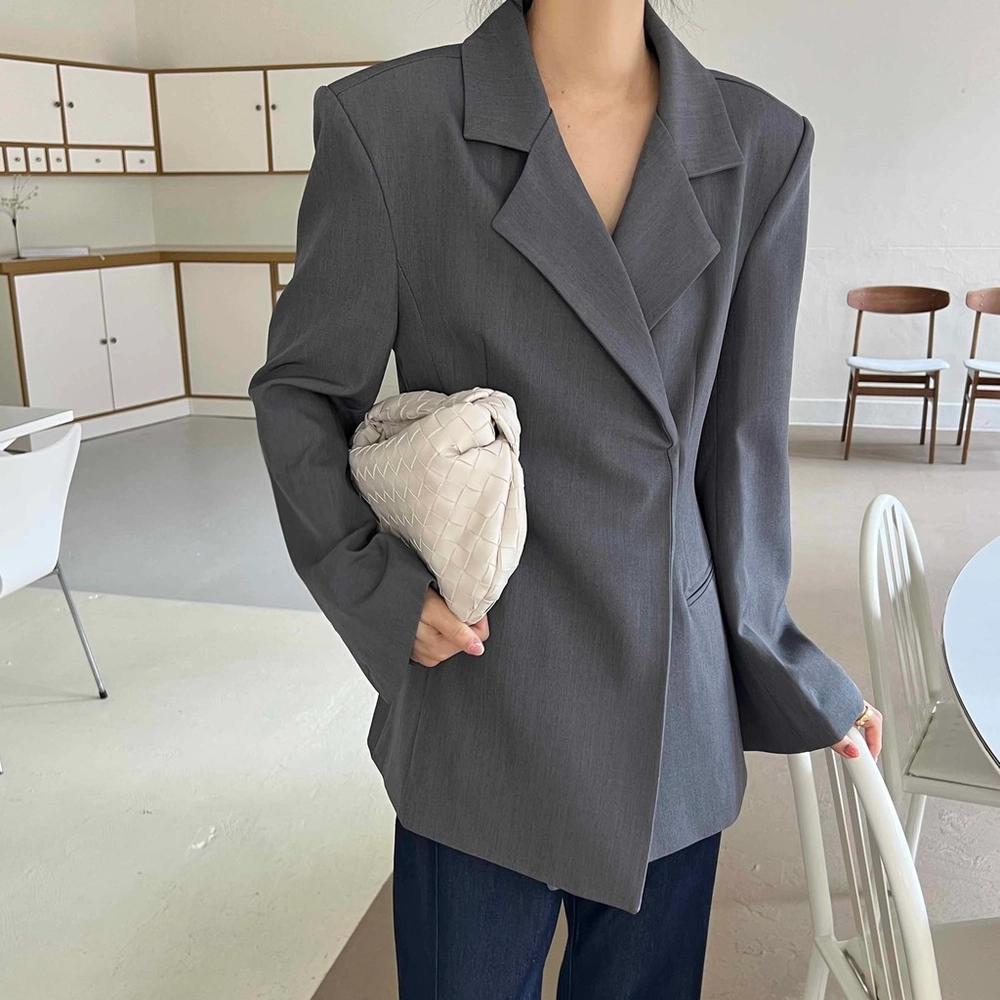 잘록한 허리 패턴으로 여성스러운 아워글래스 라인의 정장 자켓이에요. 세련된 테일러 카라로 격식이 있는 자리에도 잘 어울려 봄 하객룩이나 상견례룩, 오피스룩 등으로도 추천해요.