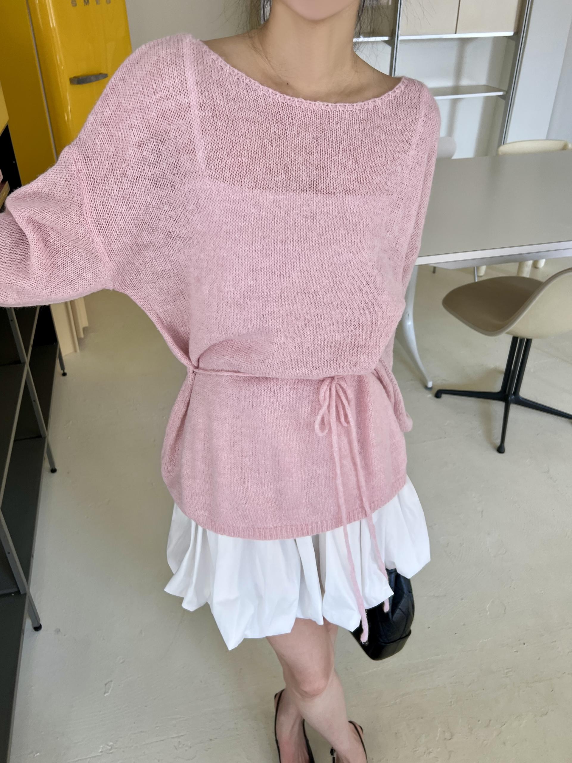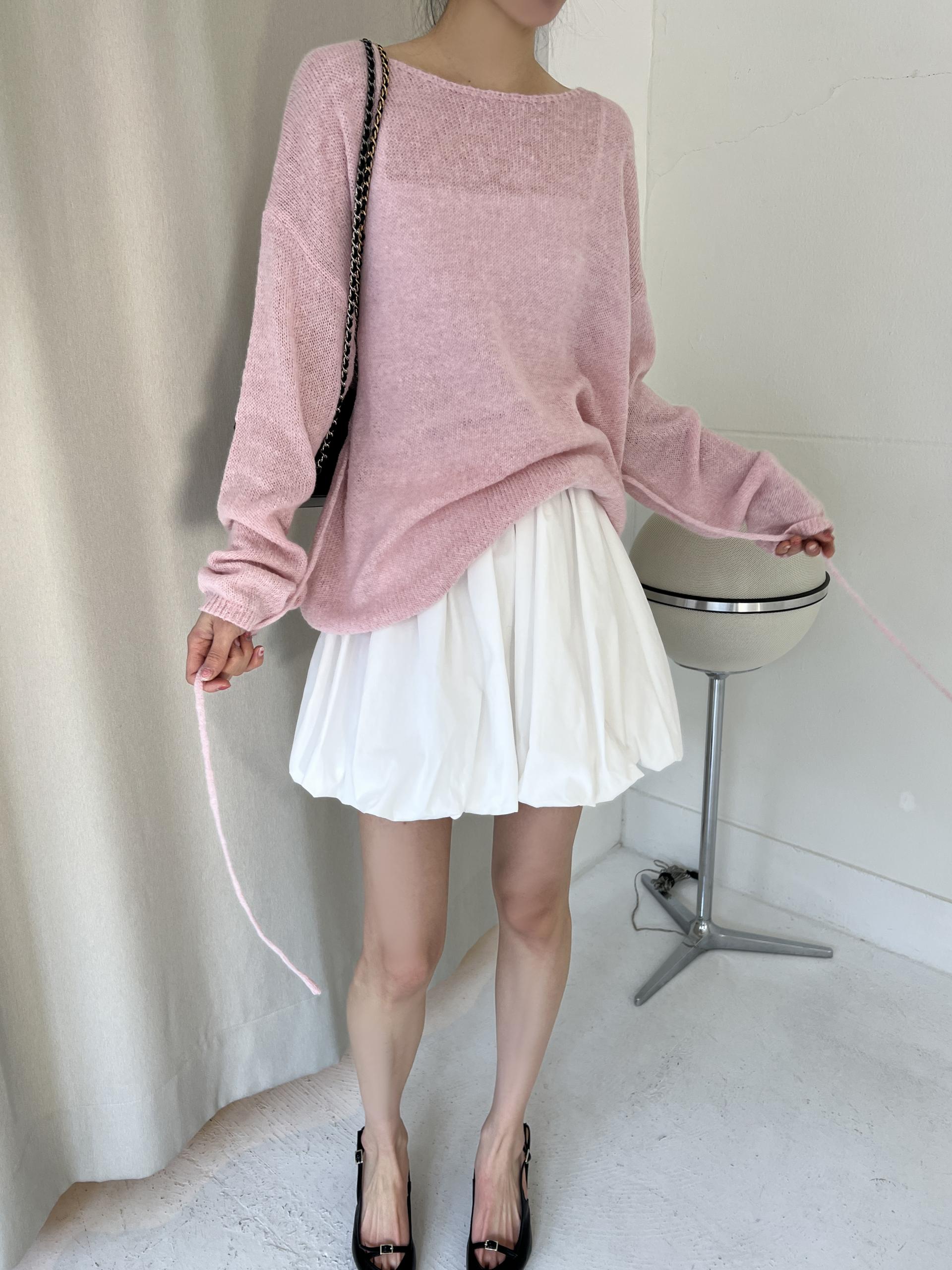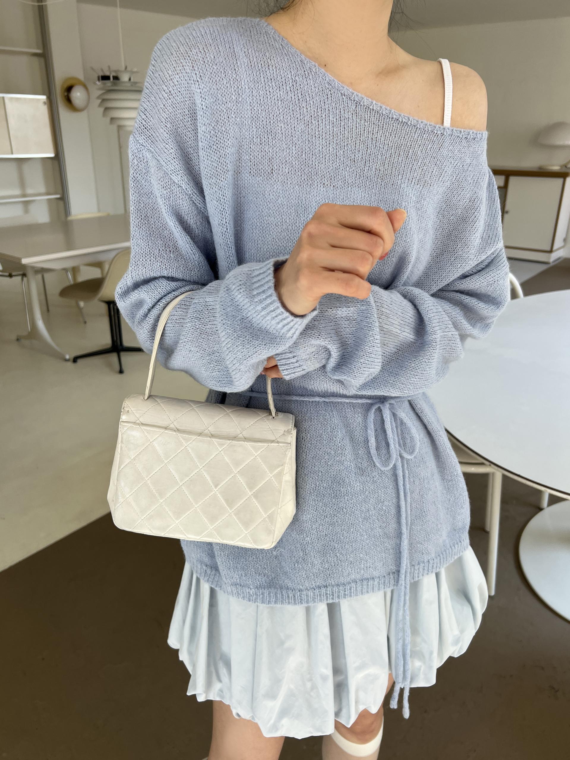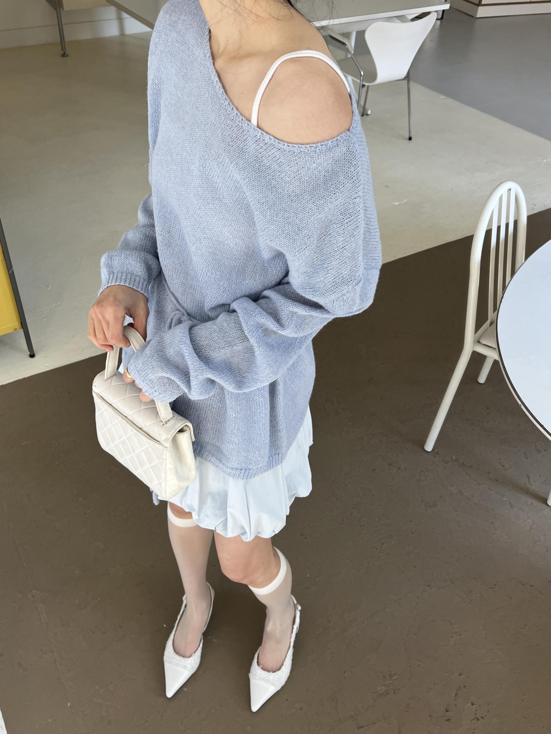 가로로 긴 보트넥에 그물같이 느슨한 짜임의 시스루 느낌 원단이라 여리여리함이 극대화되는 니트입니다. 한 쪽 어깨를 내려 원 오프숄더로도 착용할 수 있어요.