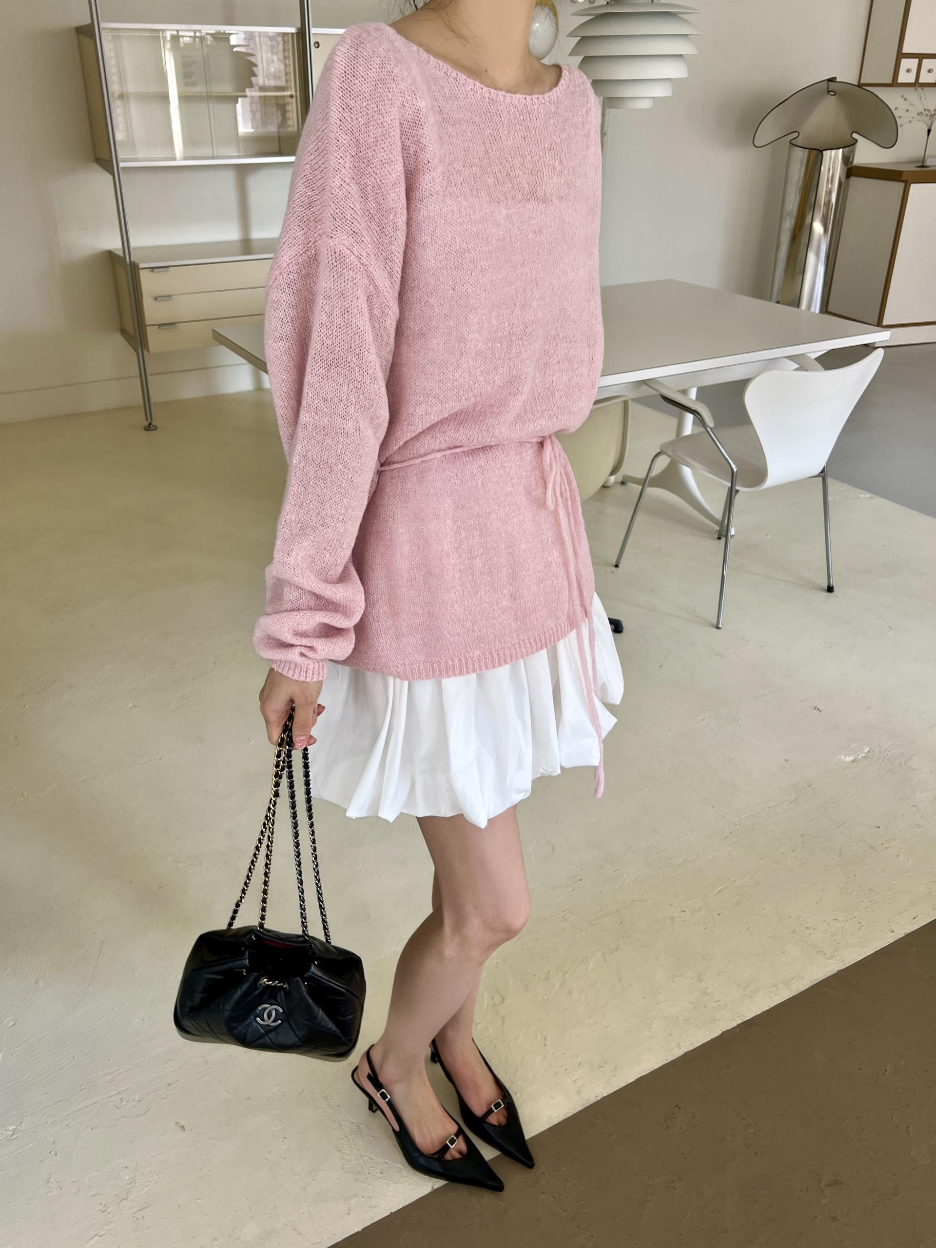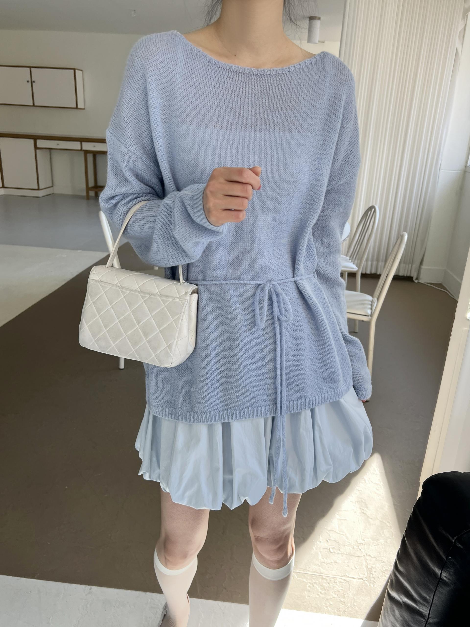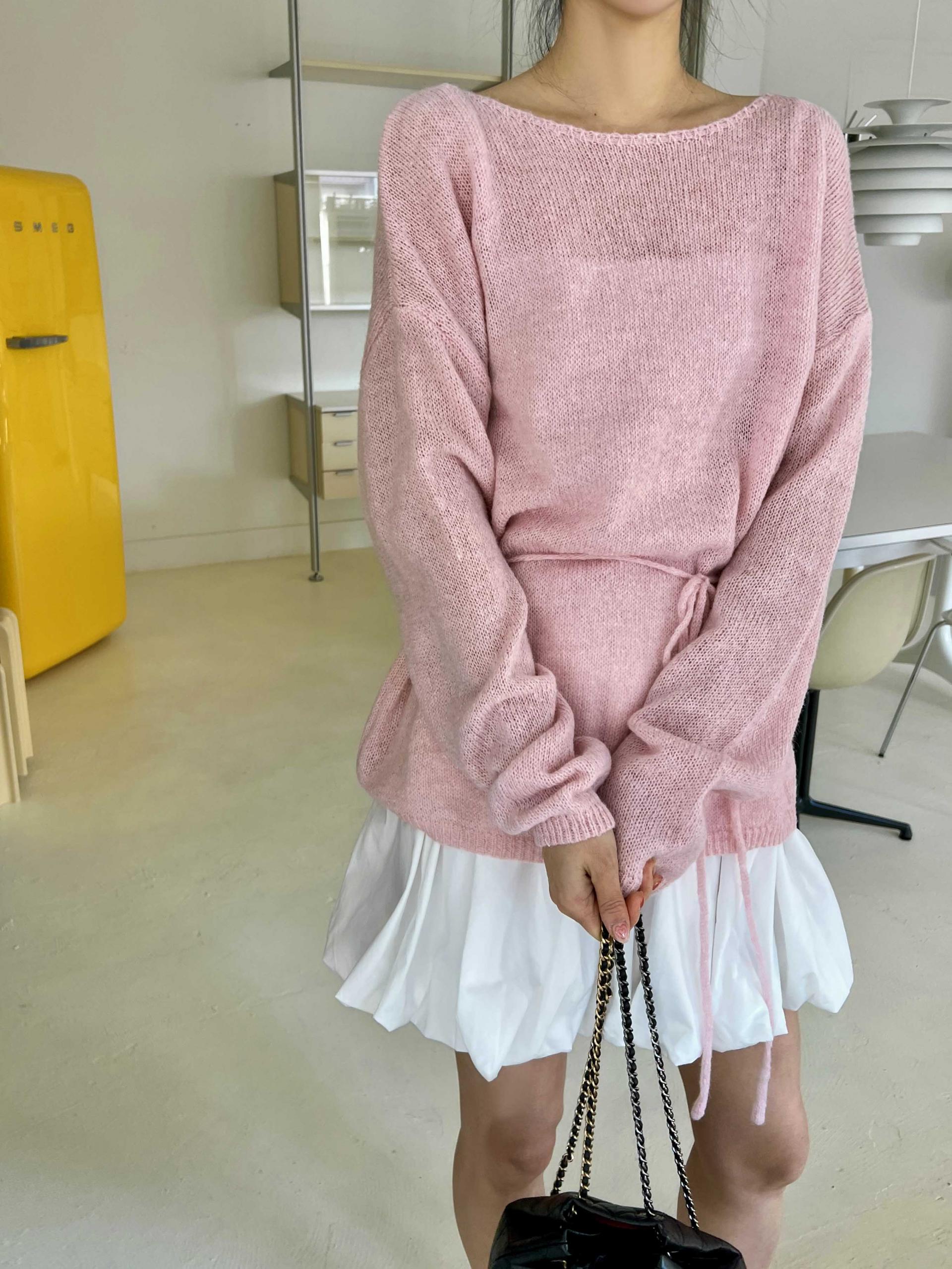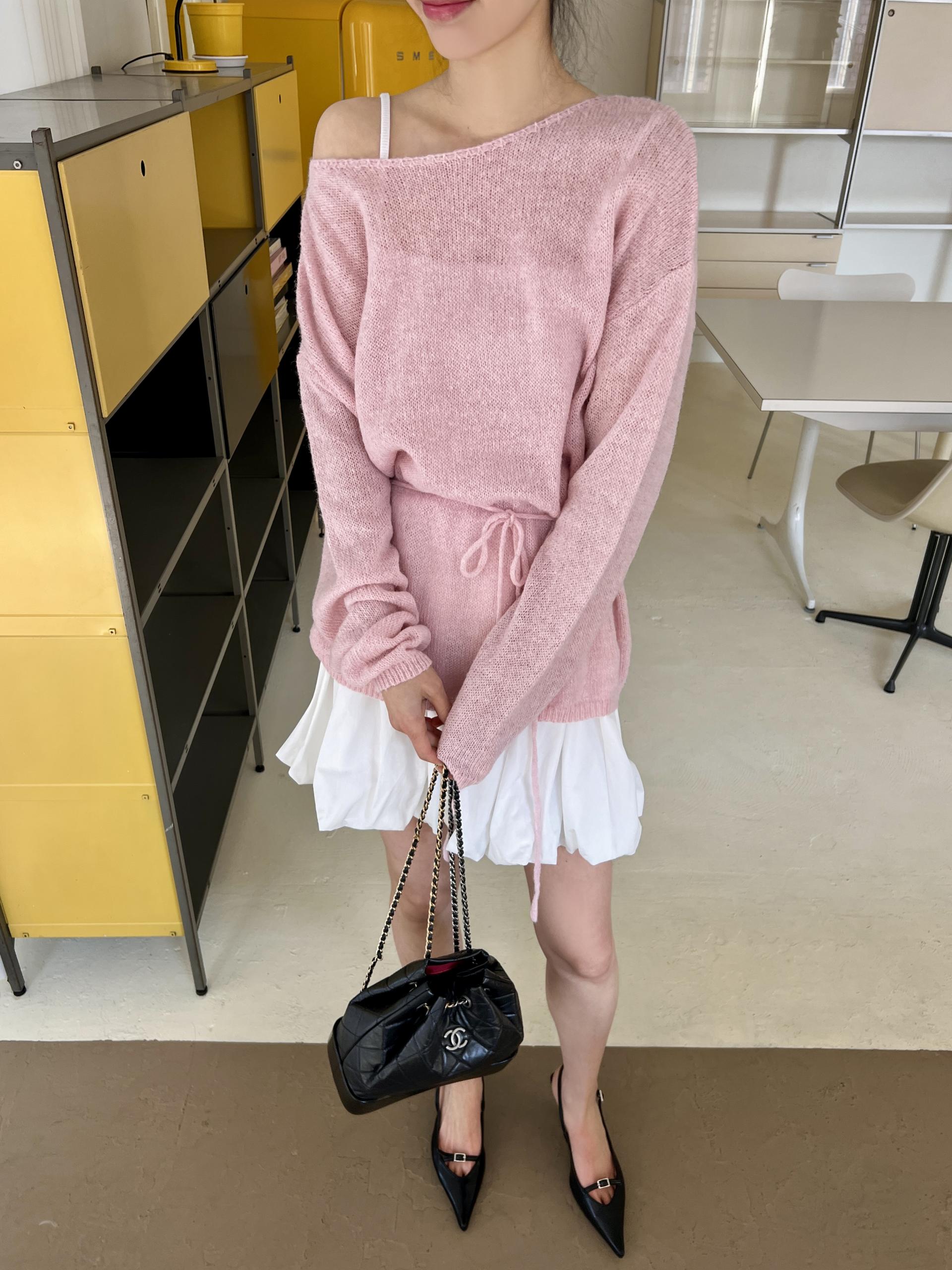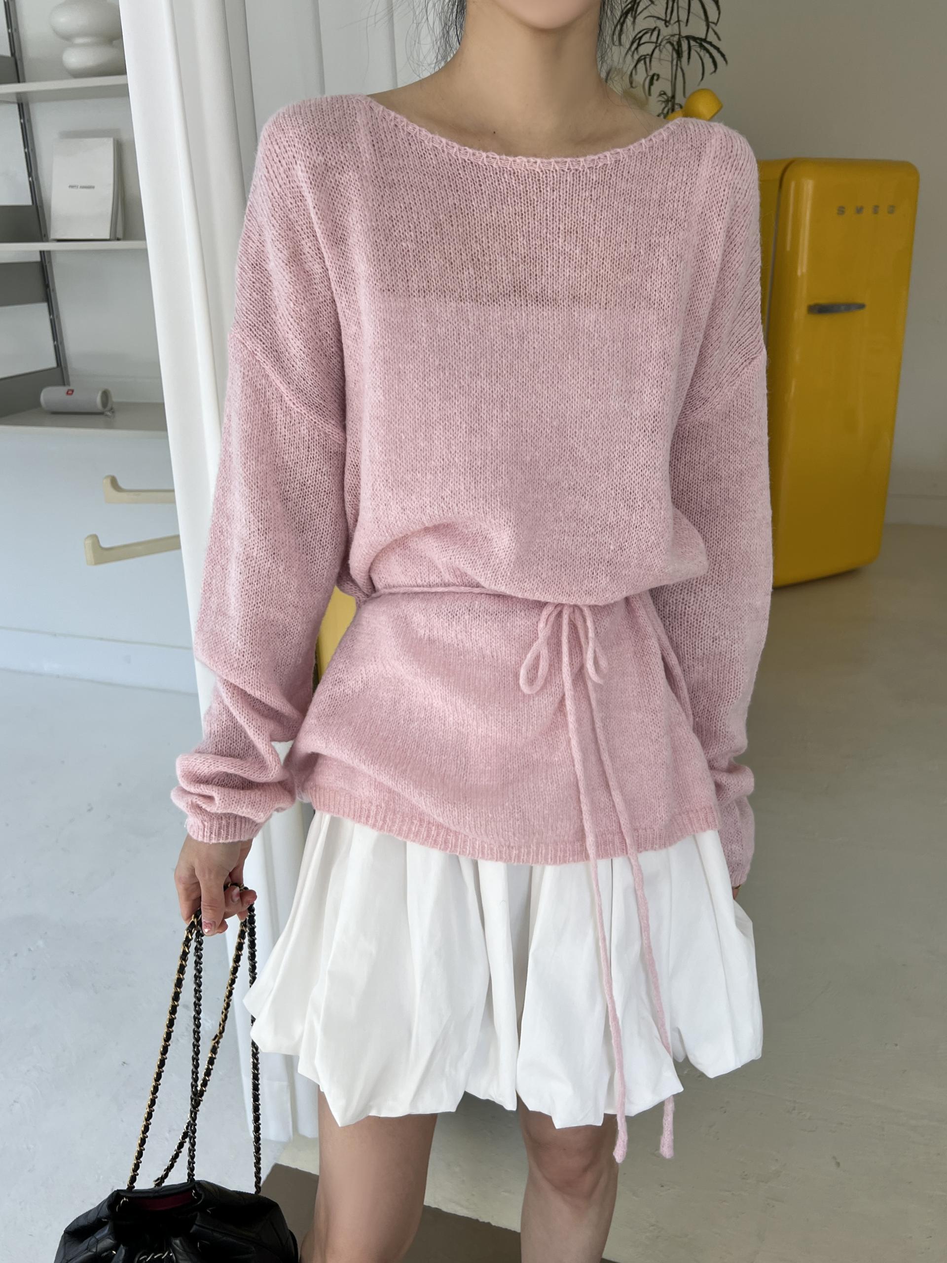 가로로 긴 보트넥에 그물같이 느슨한 짜임의 시스루 느낌 원단이라 여리여리함이 극대화되는 니트입니다. 한 쪽 어깨를 내려 원 오프숄더로도 착용할 수 있어요.