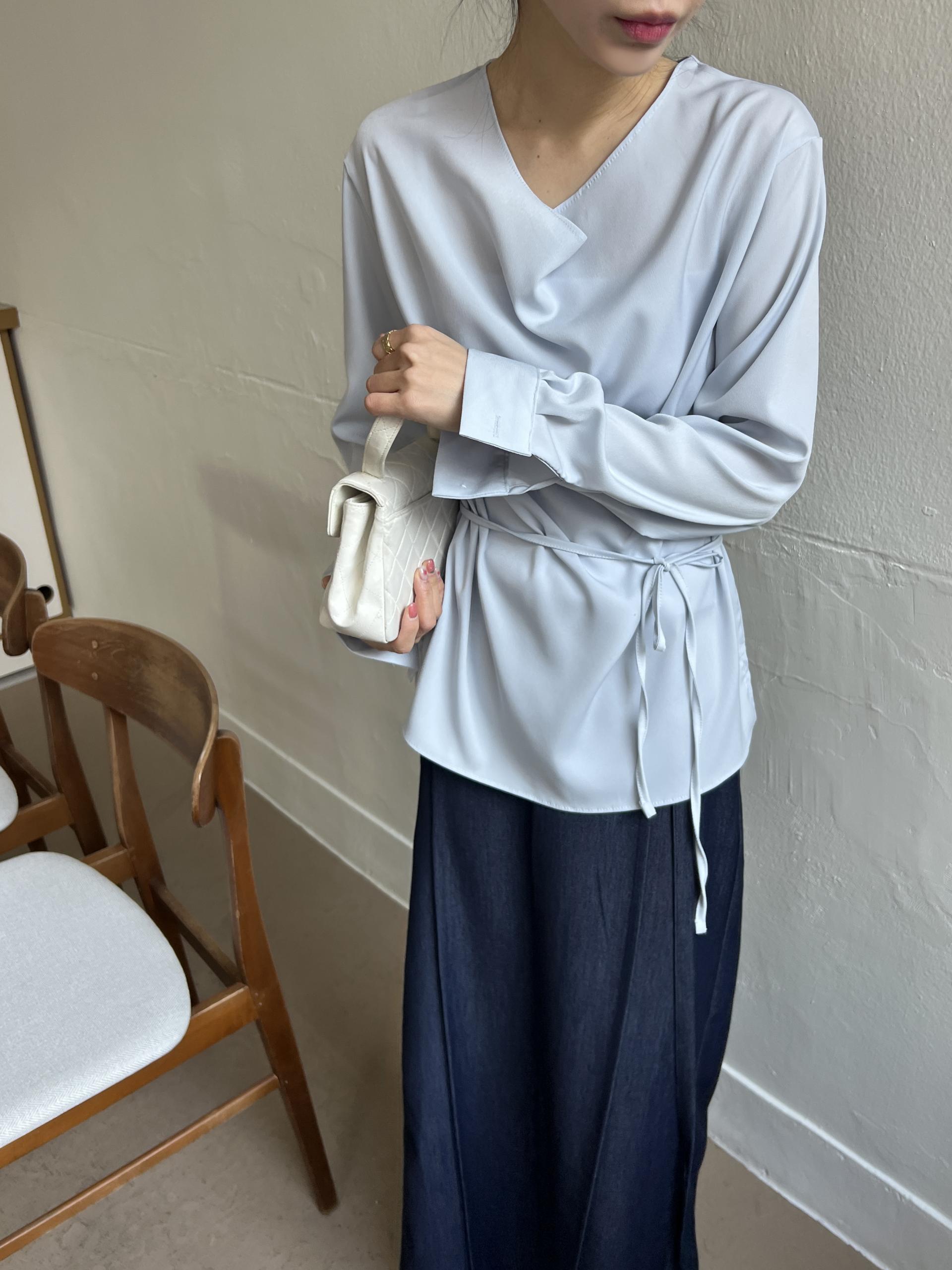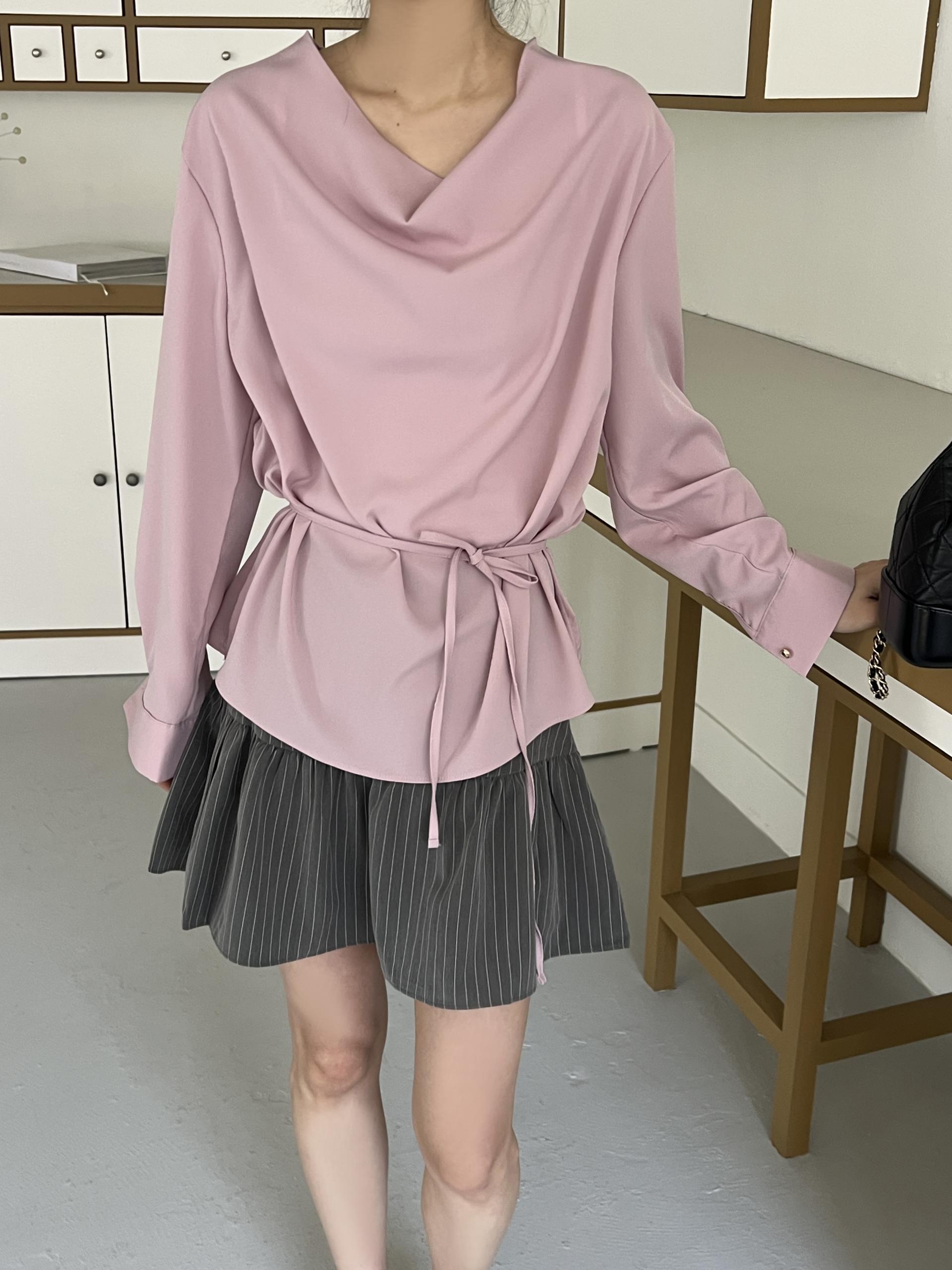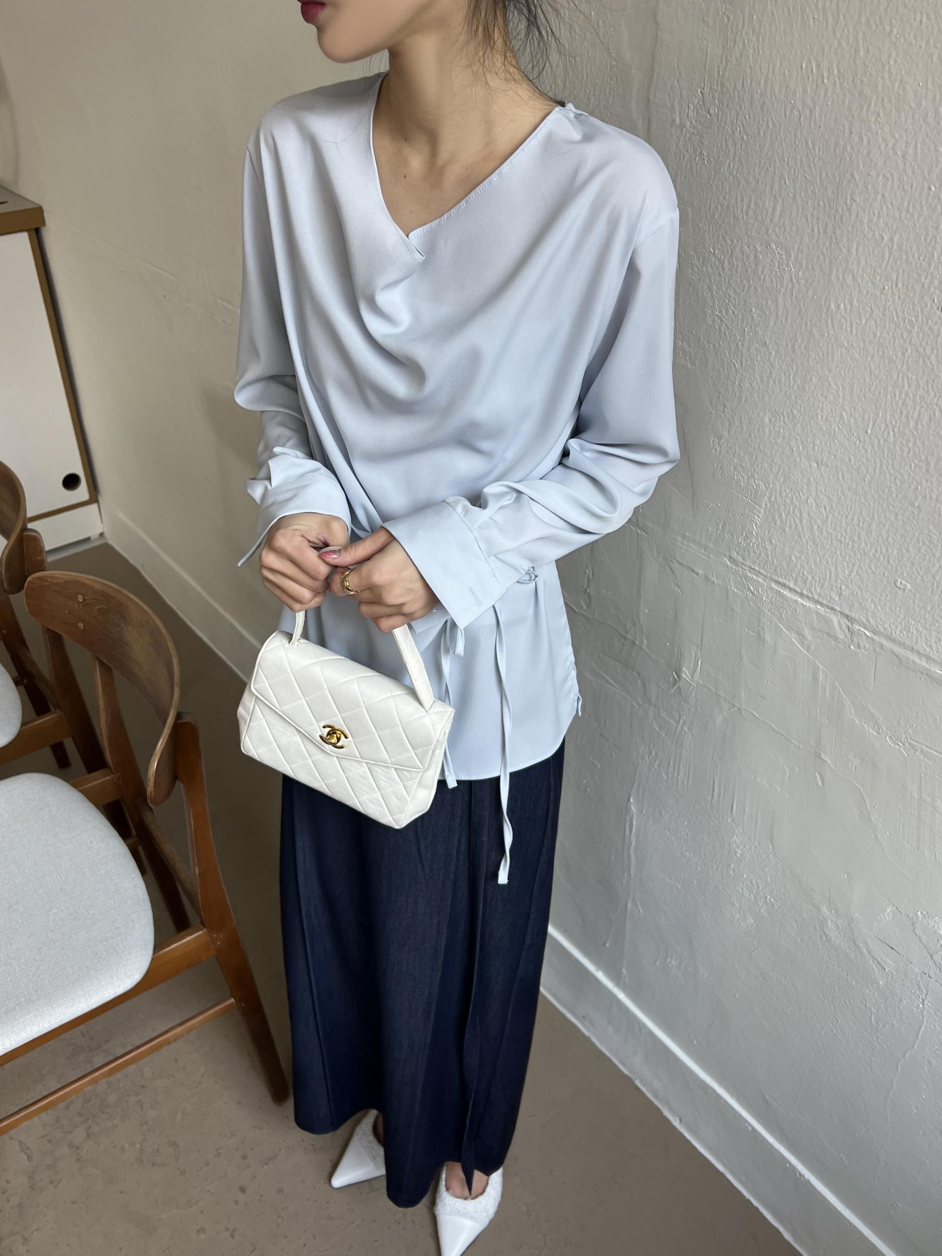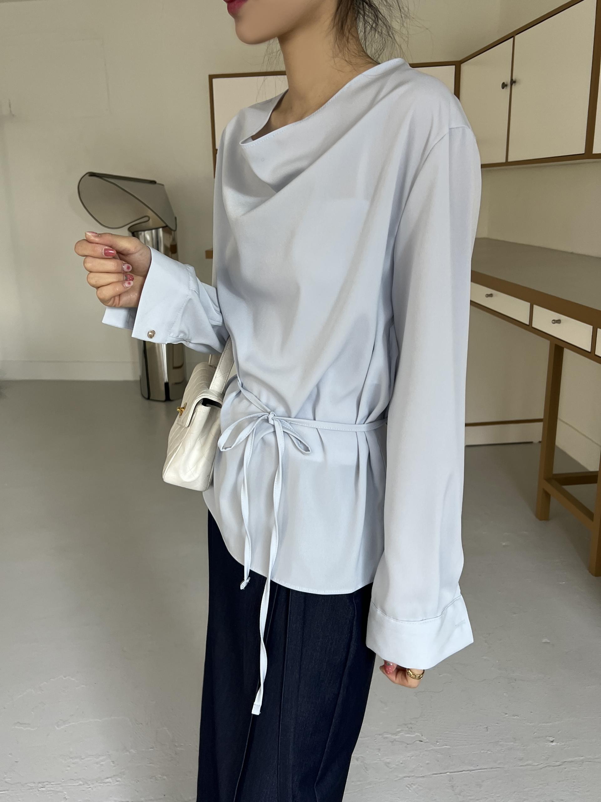 동일한 소재와 컬러의 얇은 끈은 허리에 묶어도 되고, 목에 타이처럼 두르거나 아예 빼고 착용해도 좋아 활용도 높은 블라우스입니다.