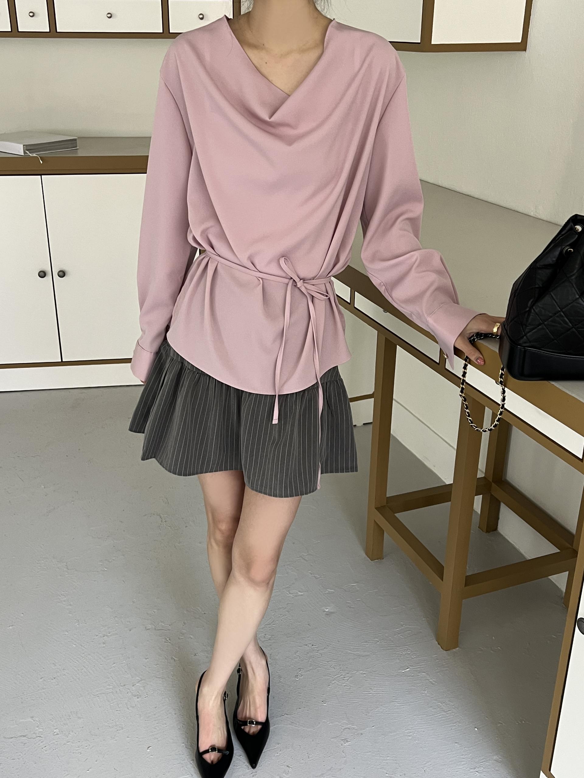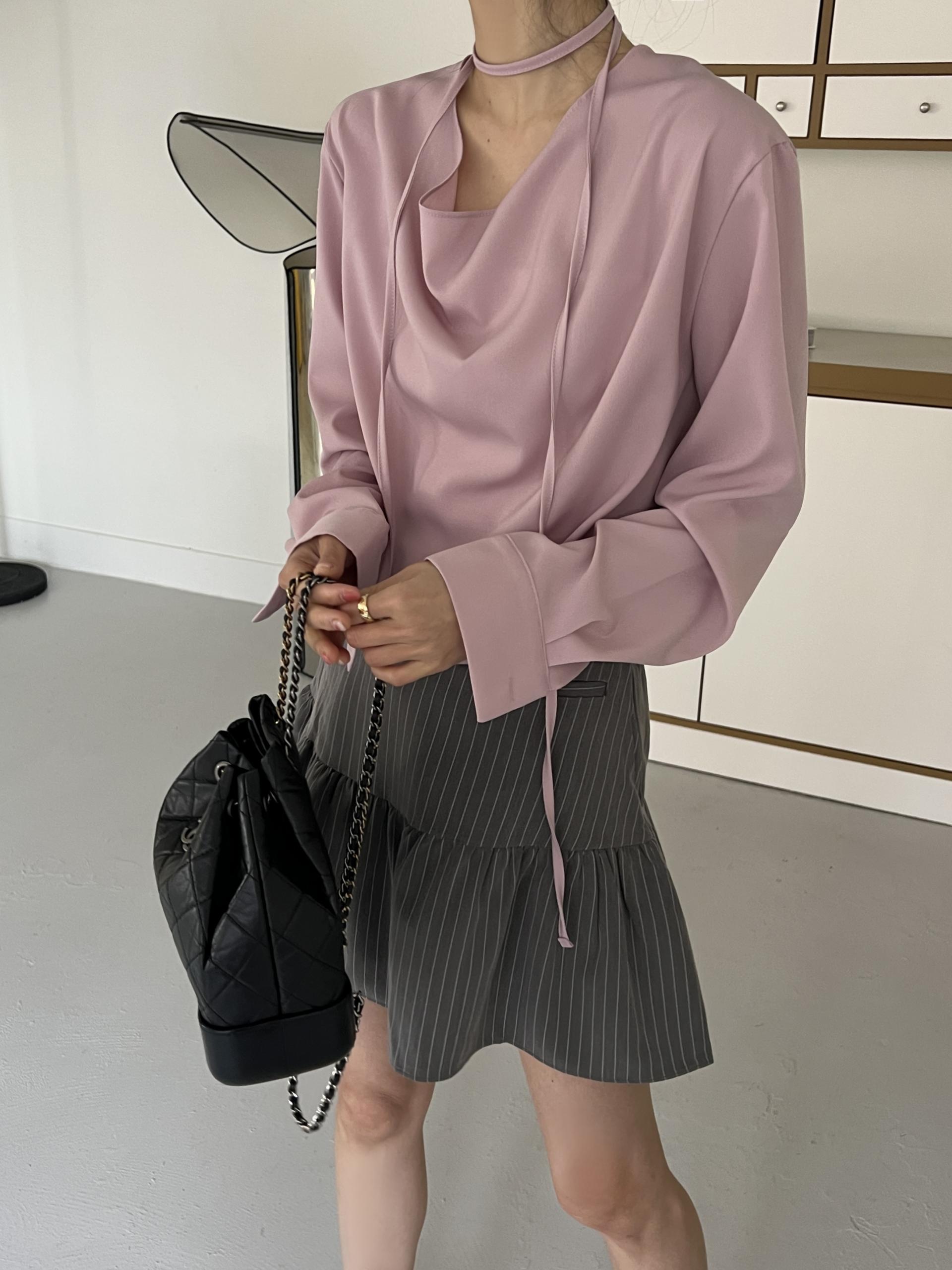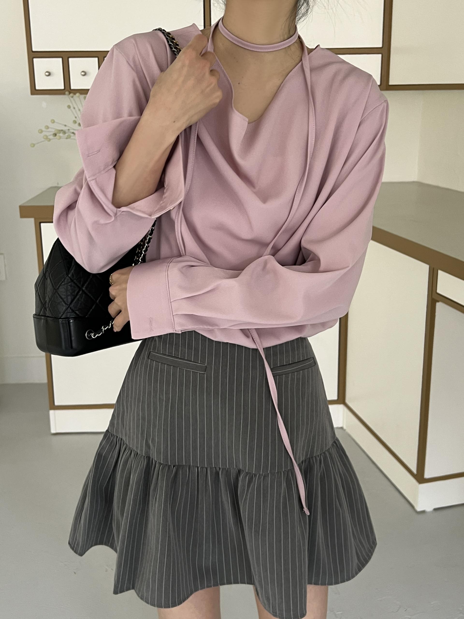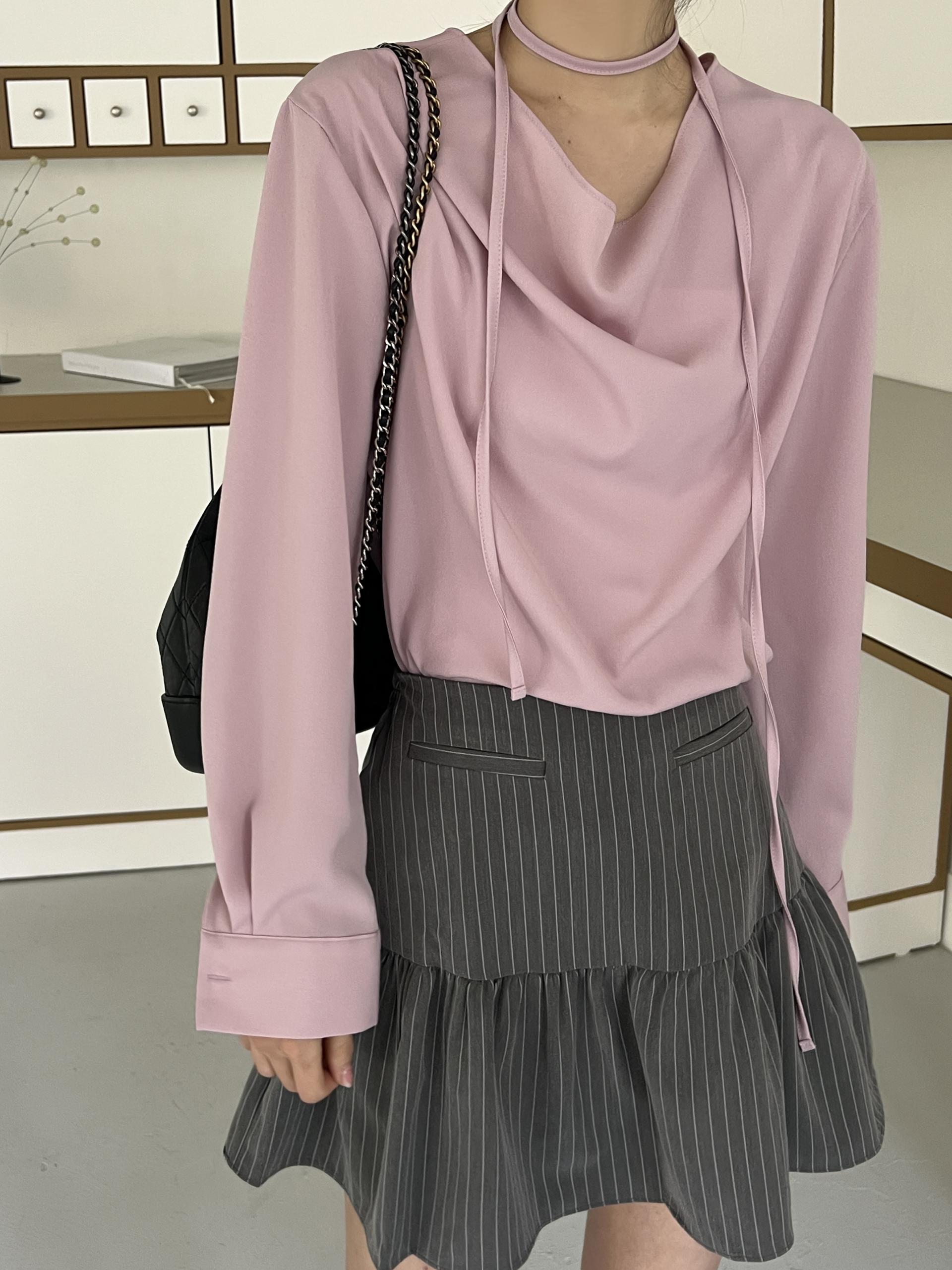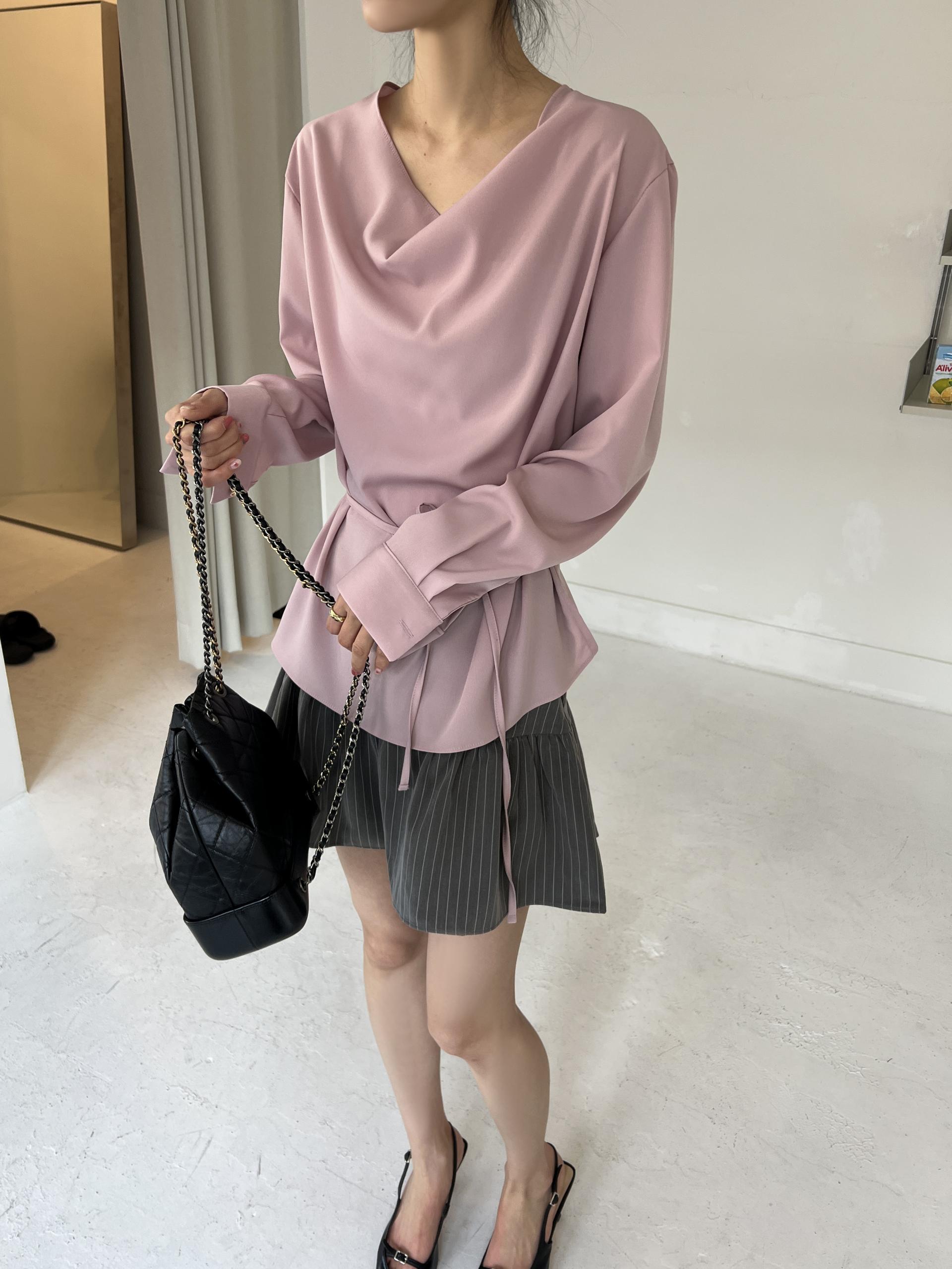 동일한 소재와 컬러의 얇은 끈은 허리에 묶어도 되고, 목에 타이처럼 두르거나 아예 빼고 착용해도 좋아 활용도 높은 블라우스입니다.