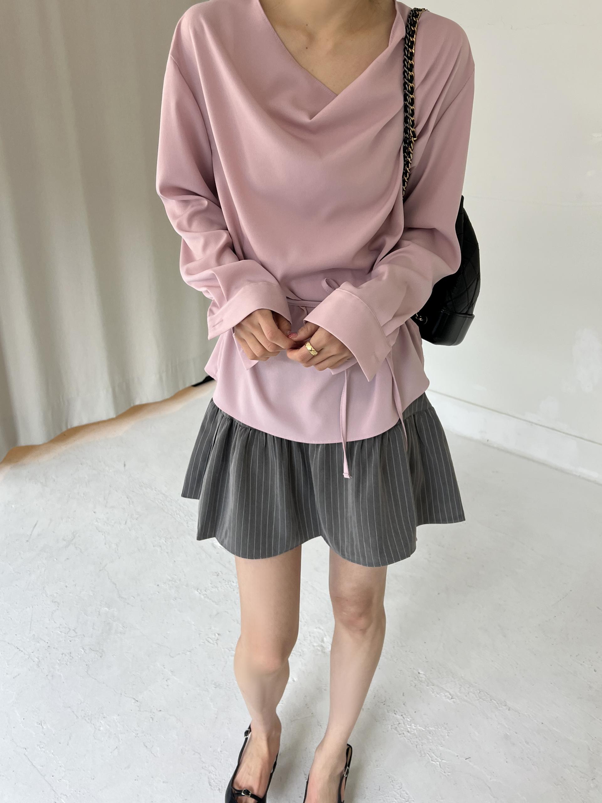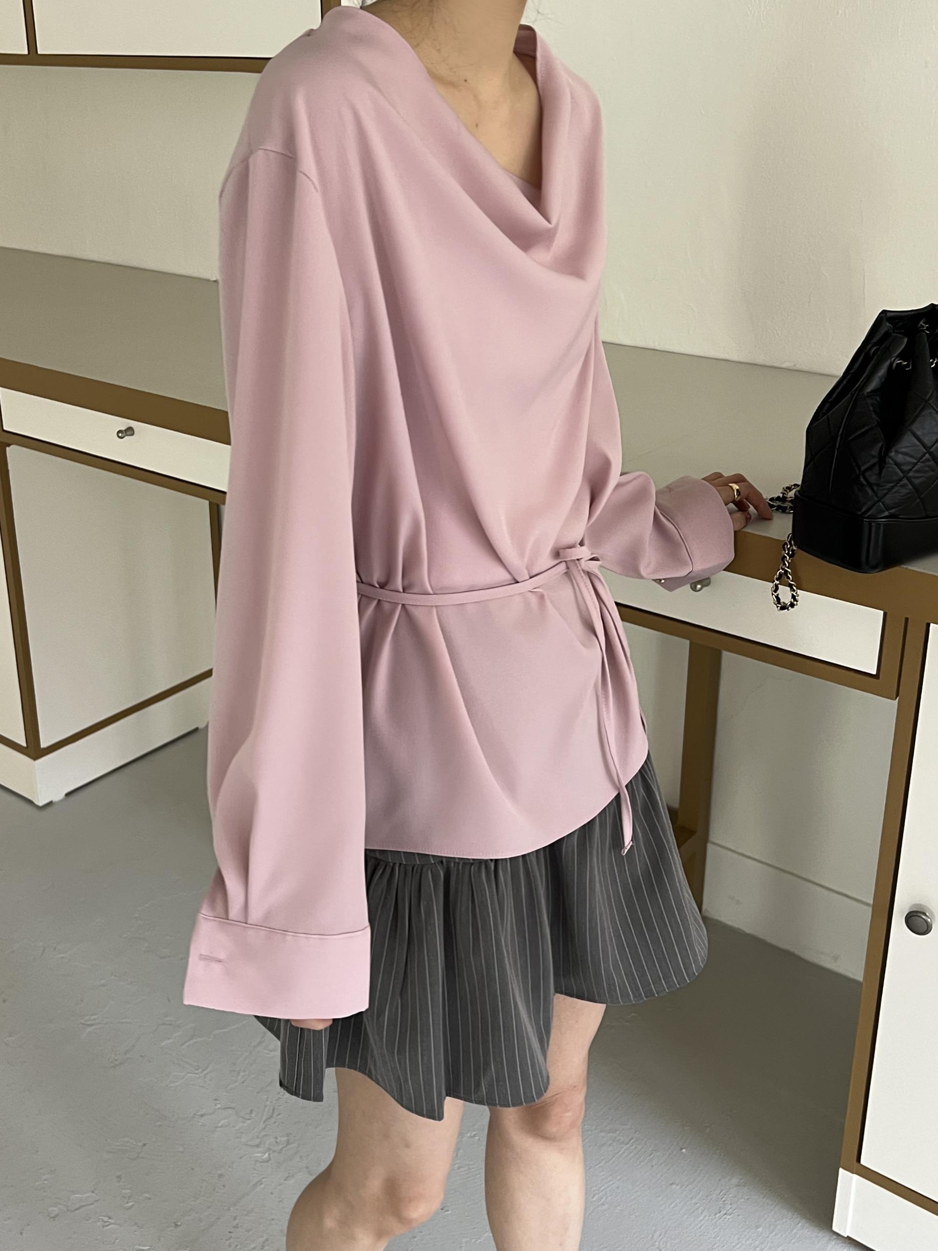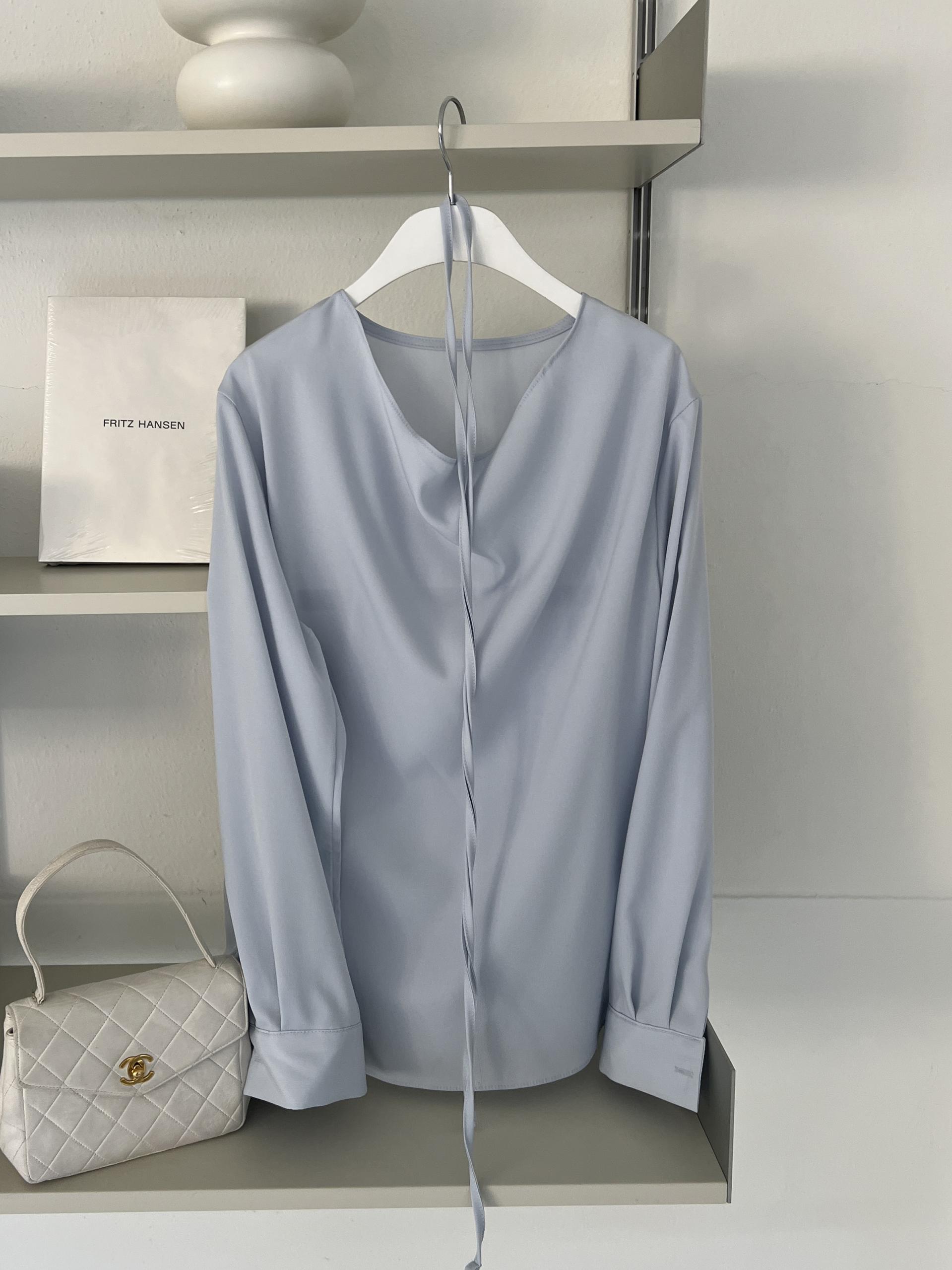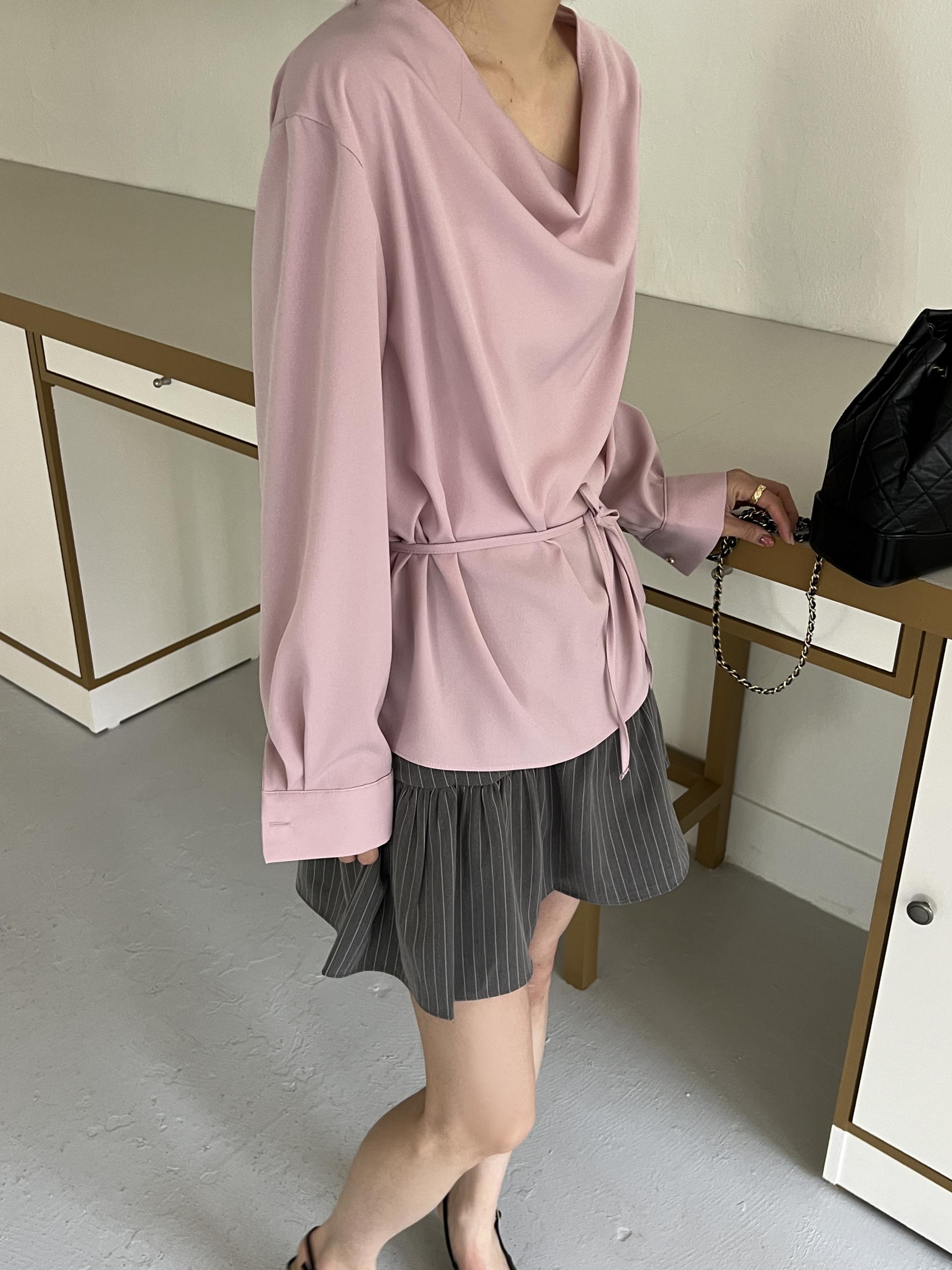 동일한 소재와 컬러의 얇은 끈은 허리에 묶어도 되고, 목에 타이처럼 두르거나 아예 빼고 착용해도 좋아 활용도 높은 블라우스입니다.