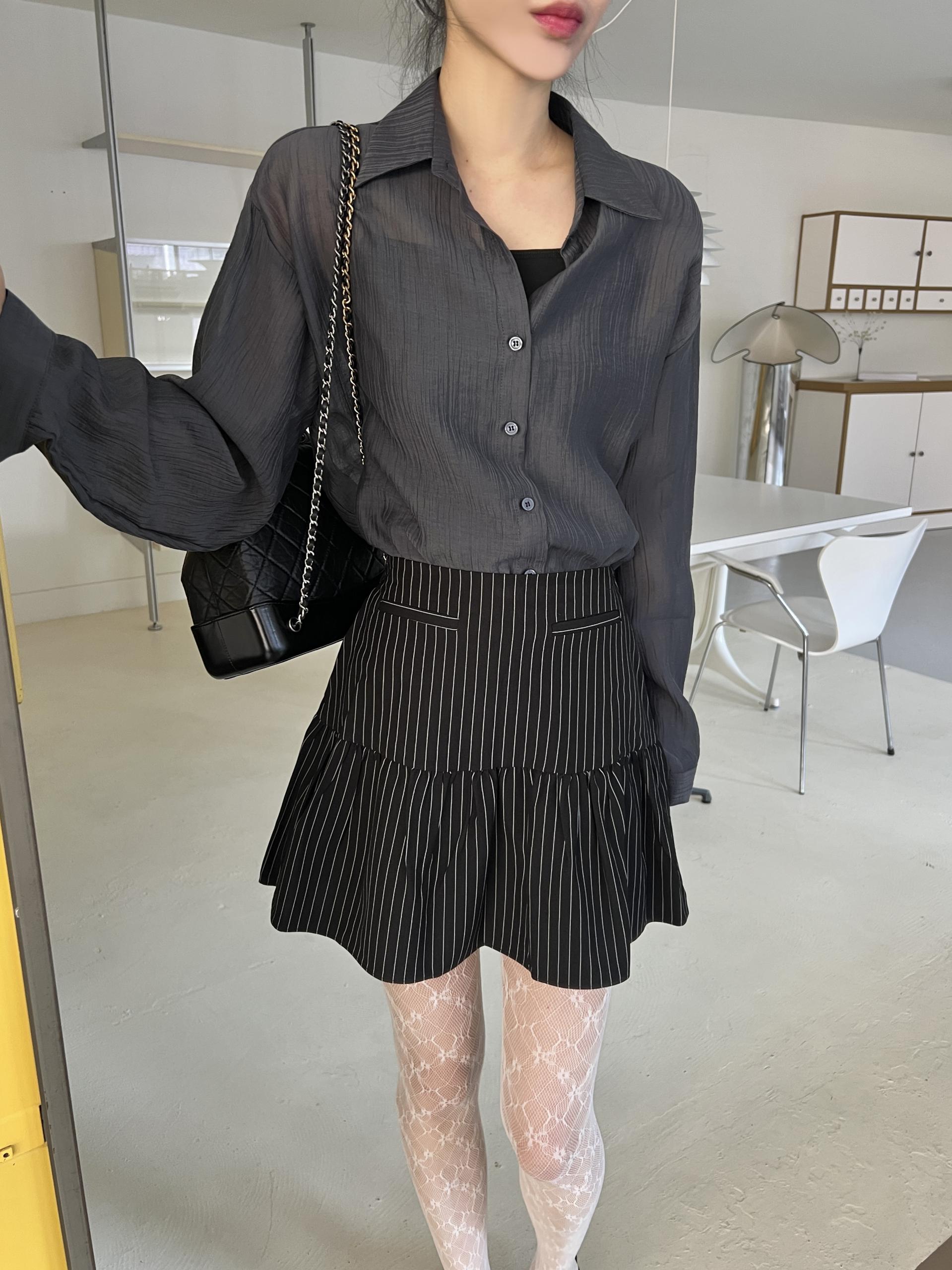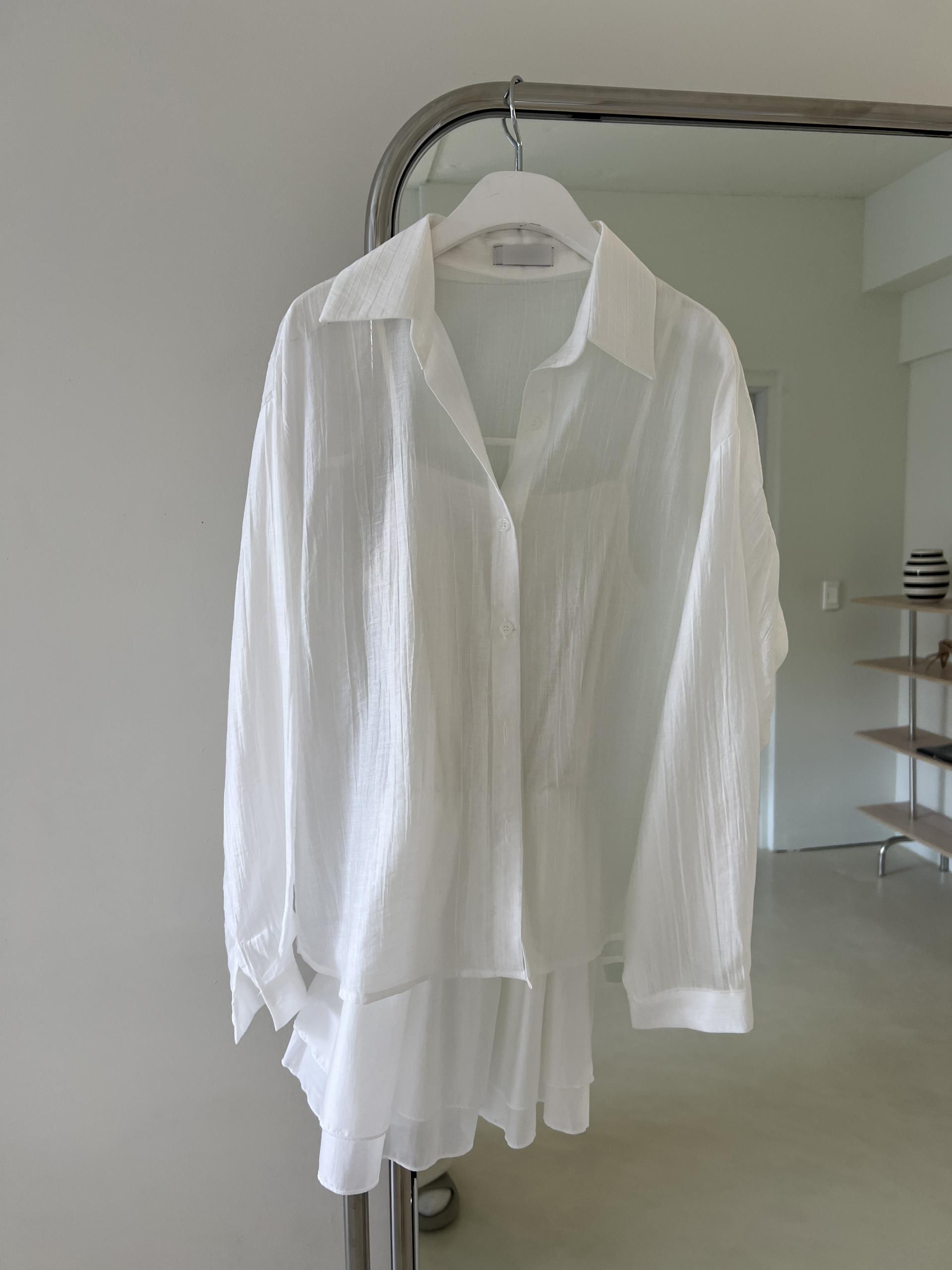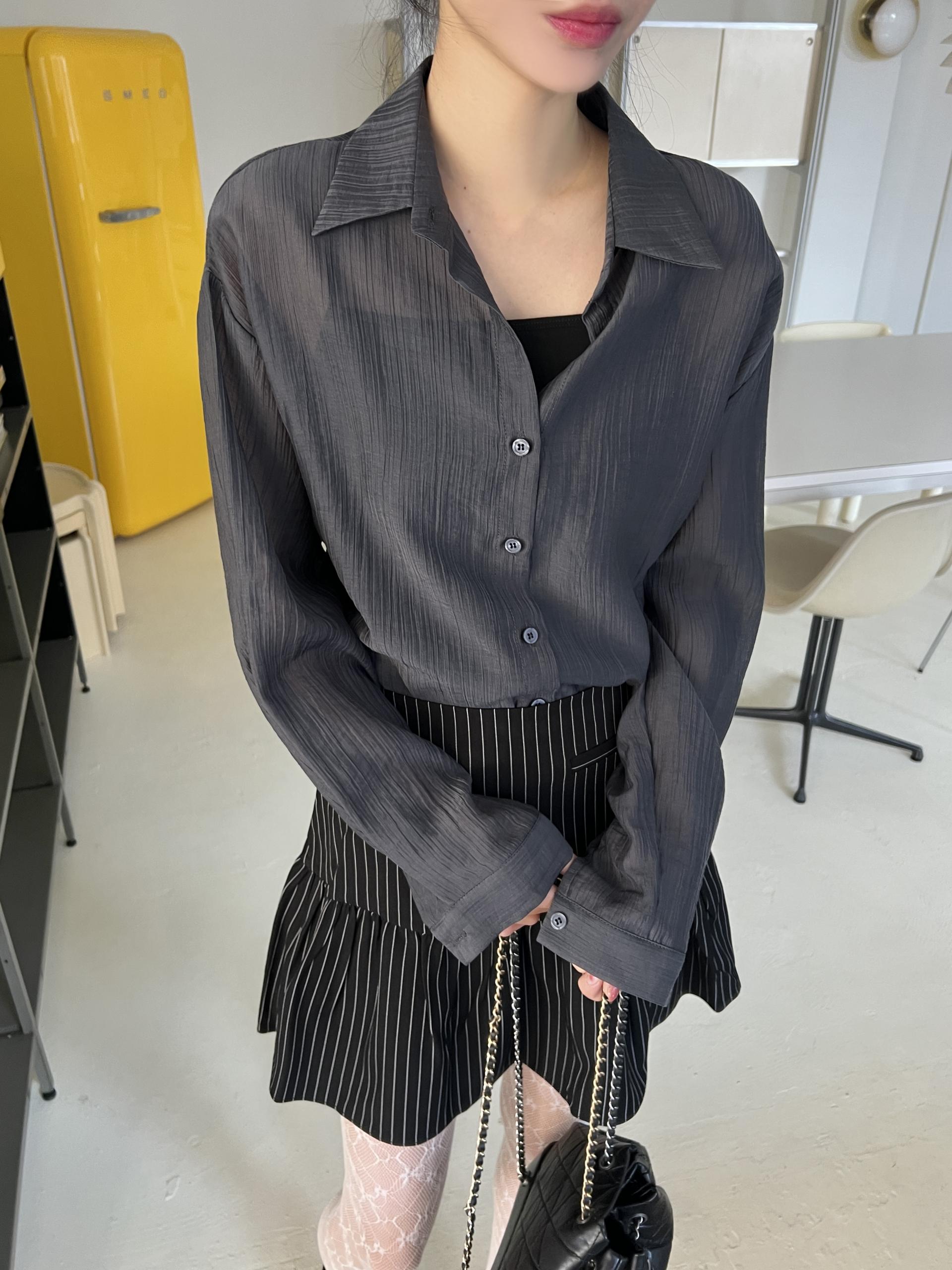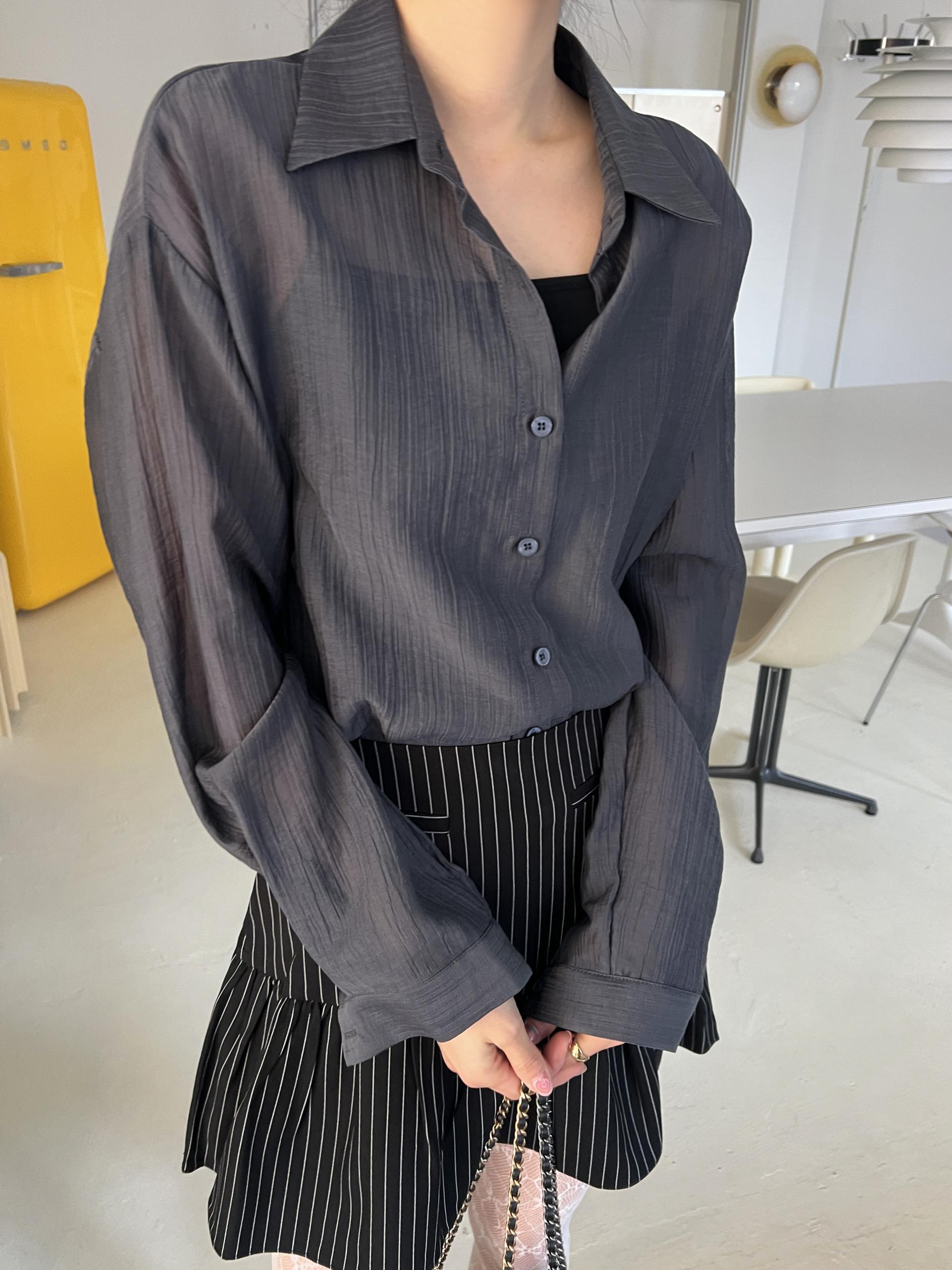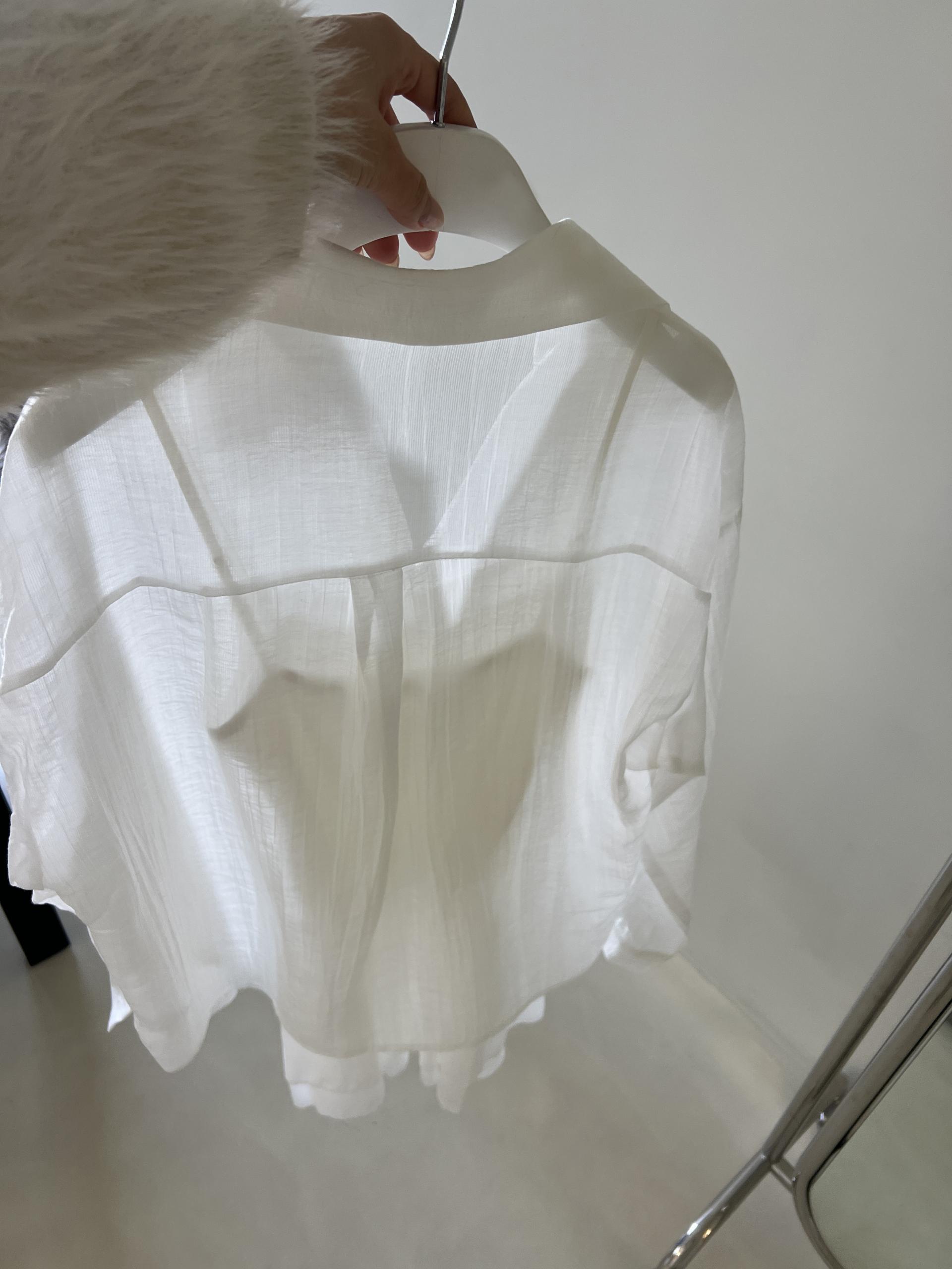 비침이 있는 시스루 소재로 여리여리한 느낌을 살려 단독 착용하셔도 좋고, 뷔스티에와 레이어드하시거나 여름 시즌에는 커버업 셔츠로 걸치듯 착용하셔도 좋아요.