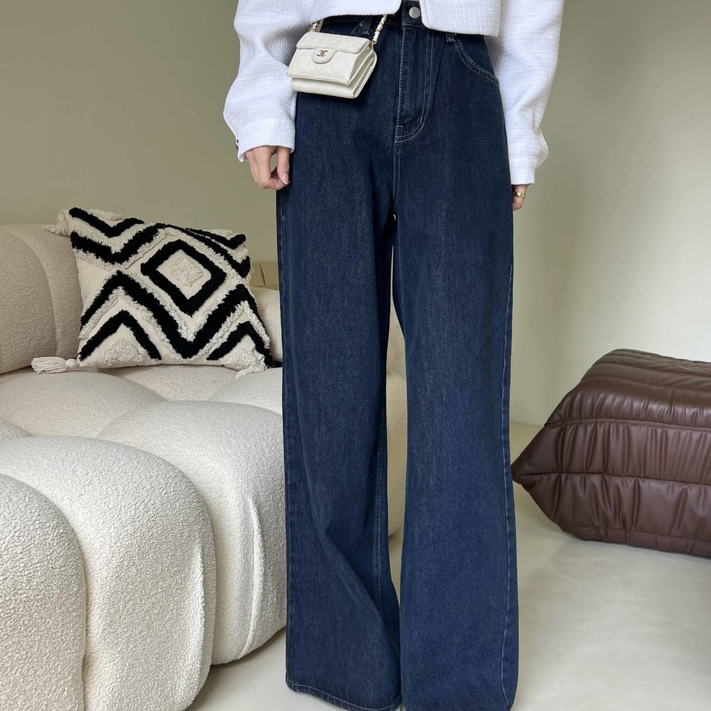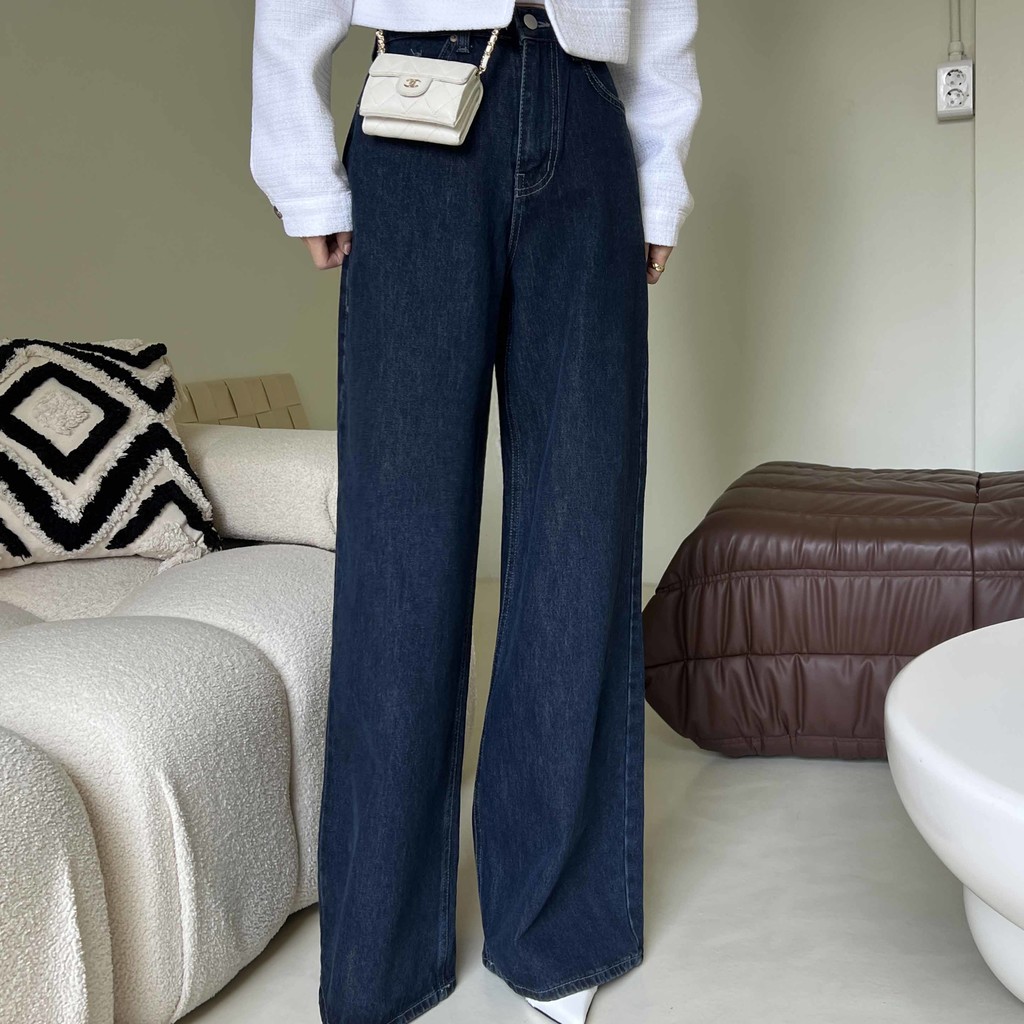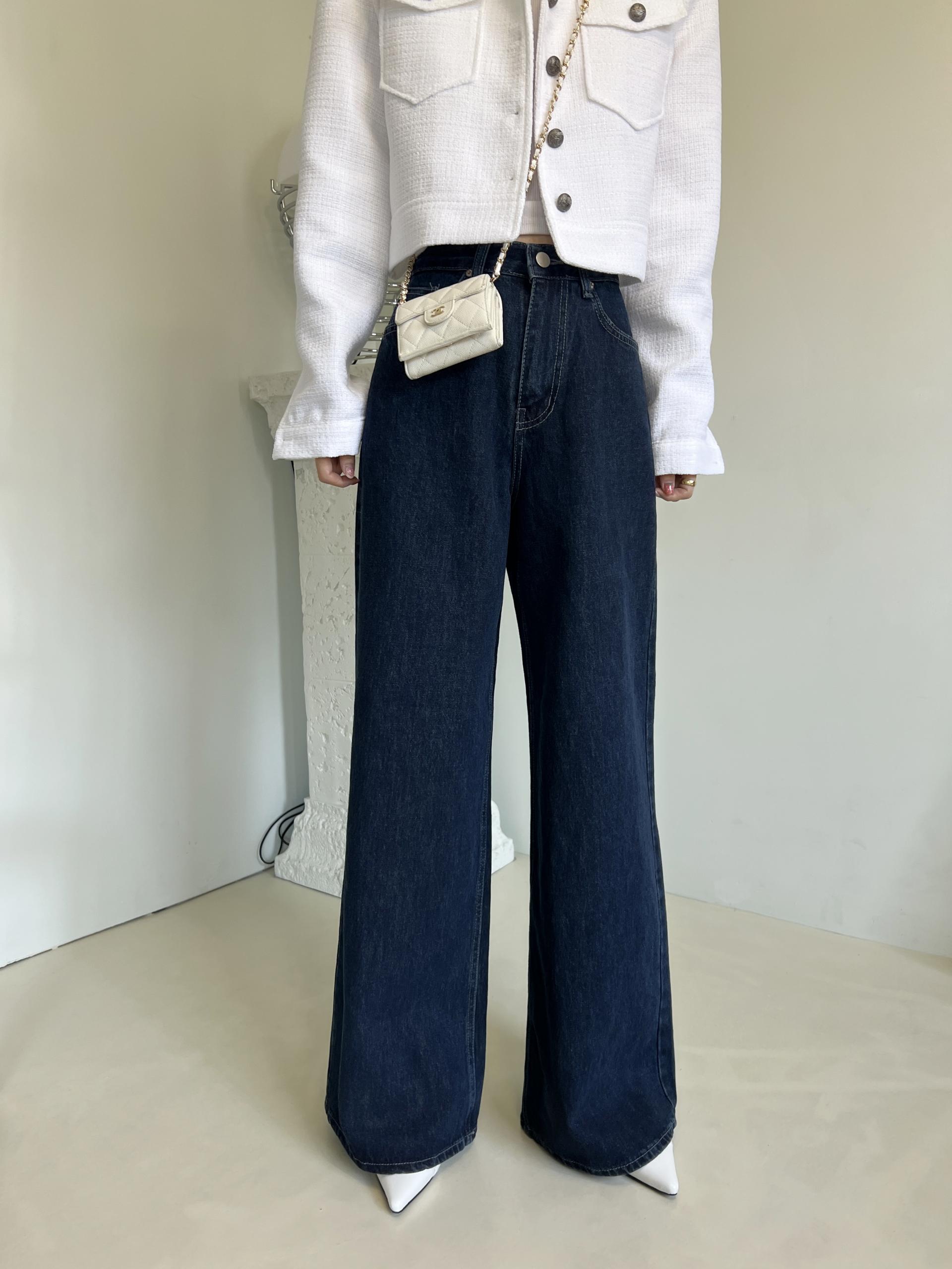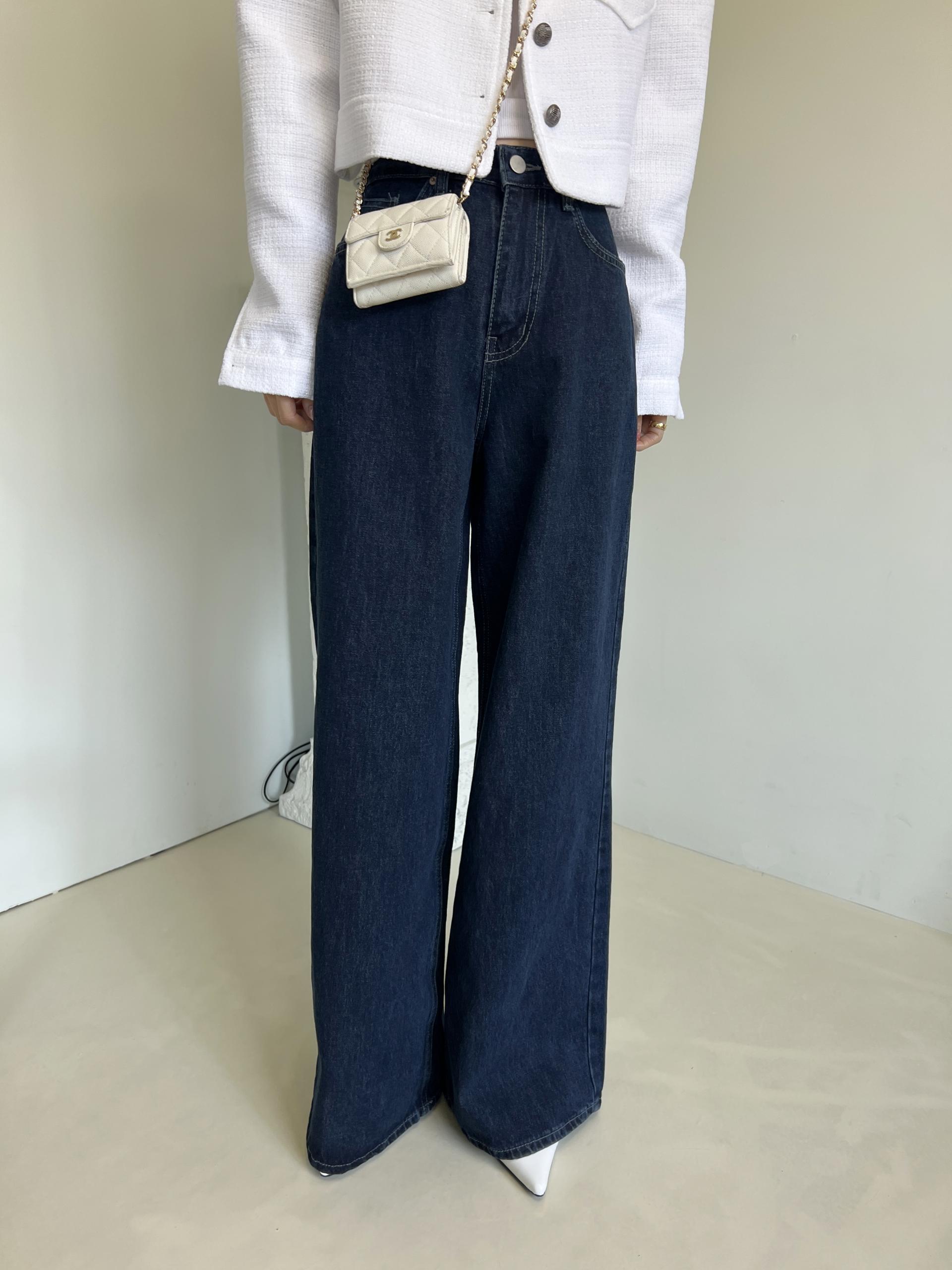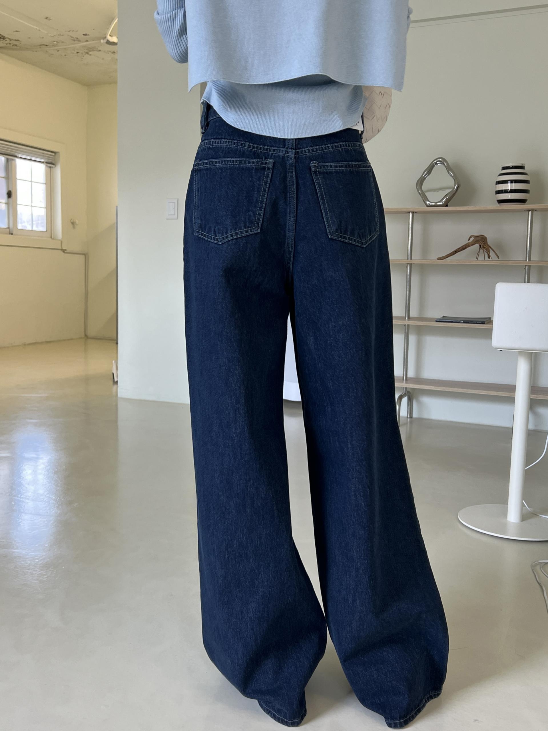하이웨스트 밑위에 넓은 통 와이드 핏으로 멋스러운 진청 팬츠입니다.