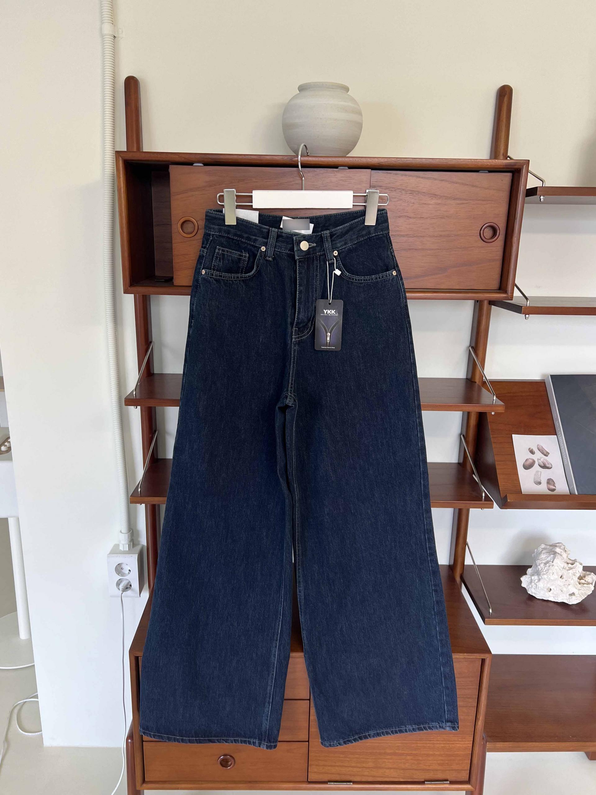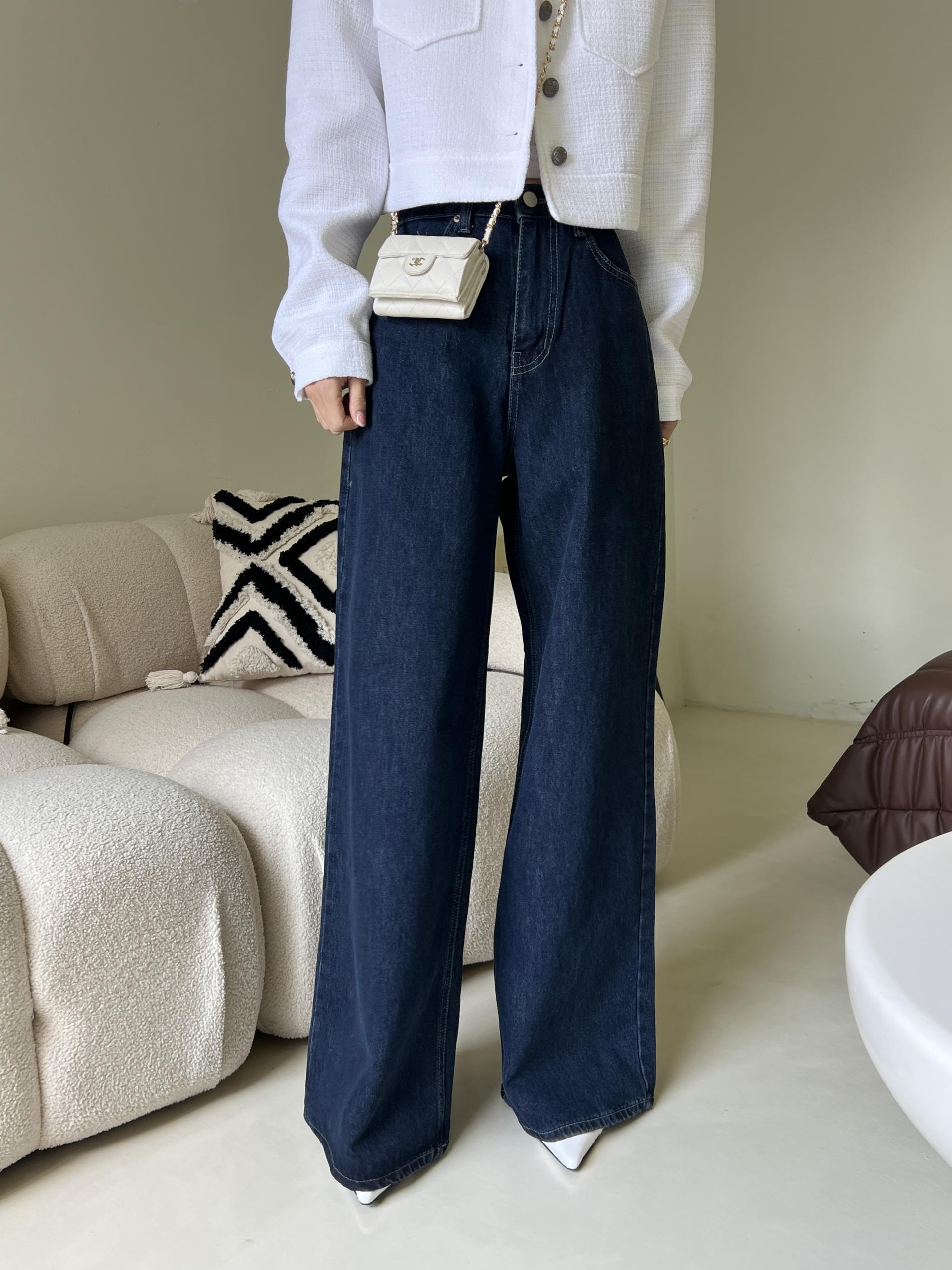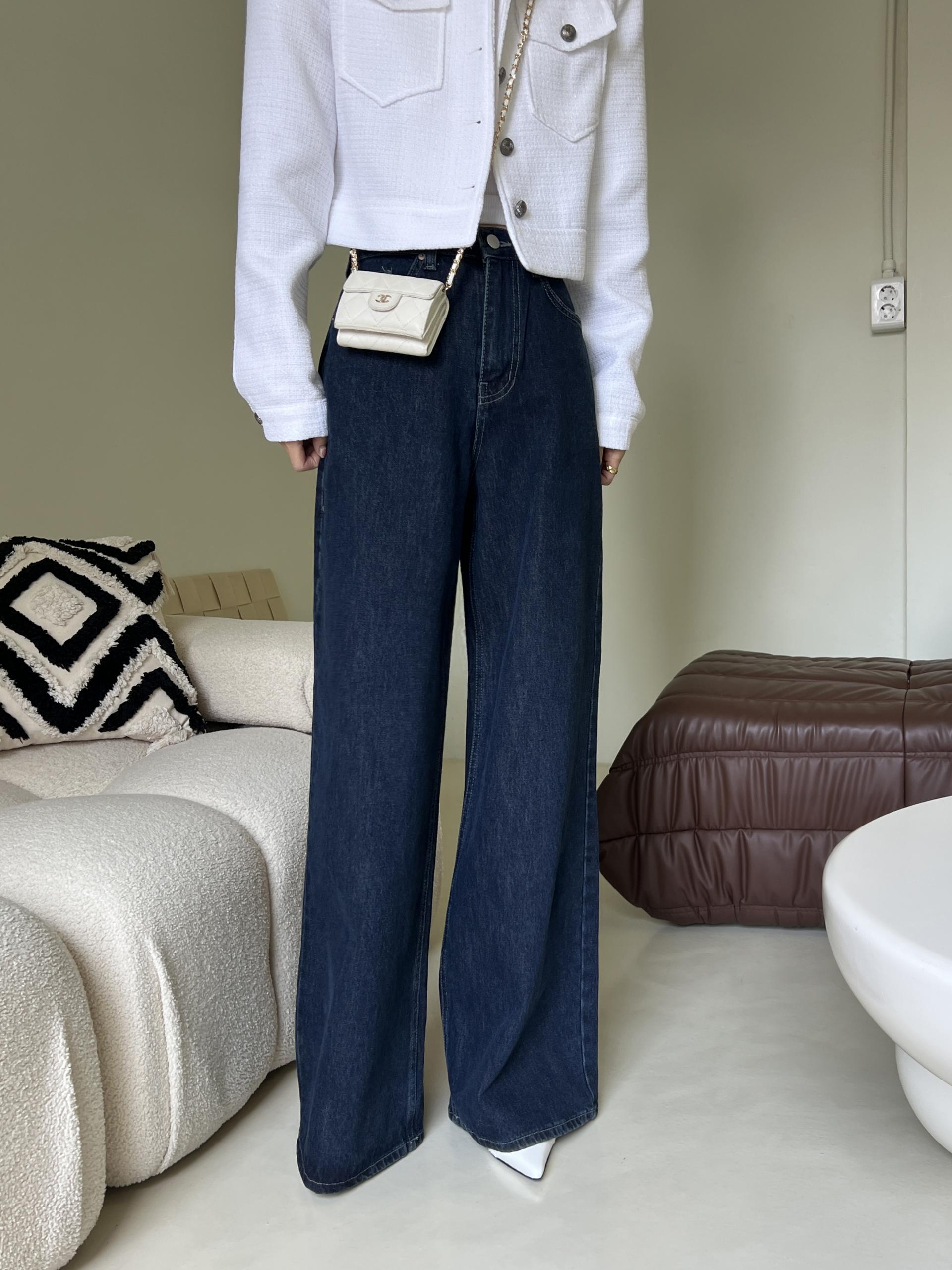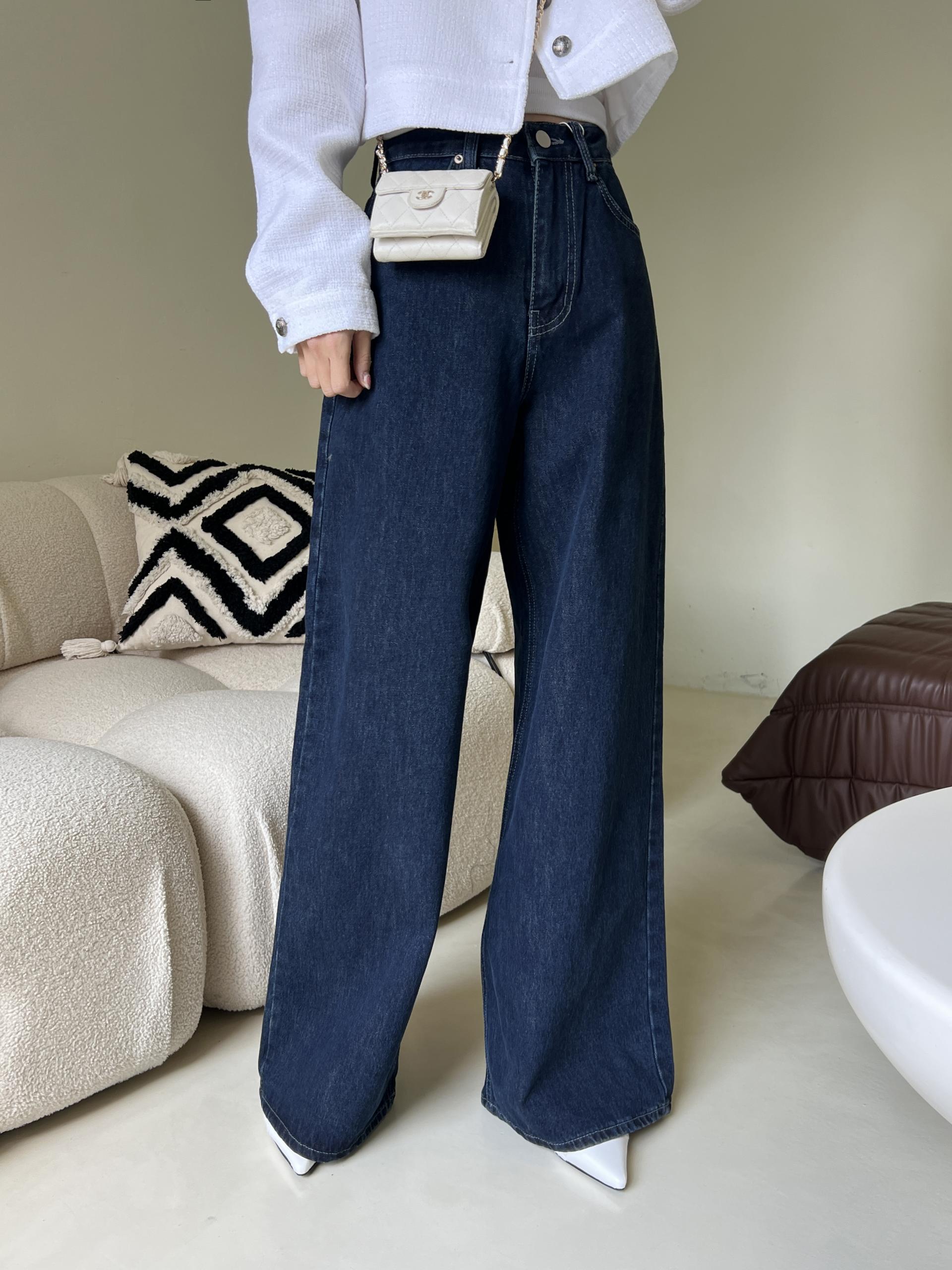 하이웨스트 밑위에 넓은 통 와이드 핏으로 멋스러운 진청 팬츠입니다.